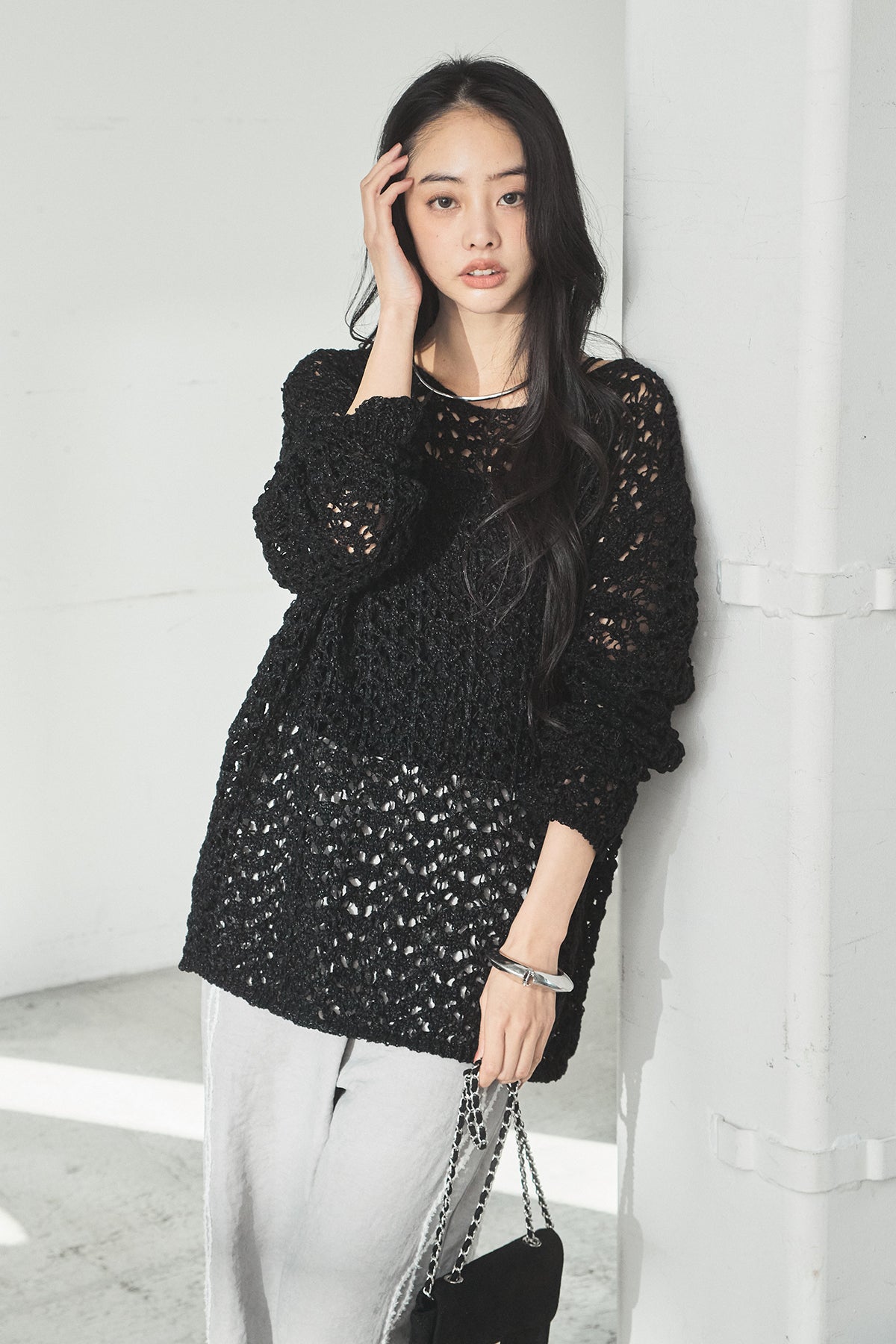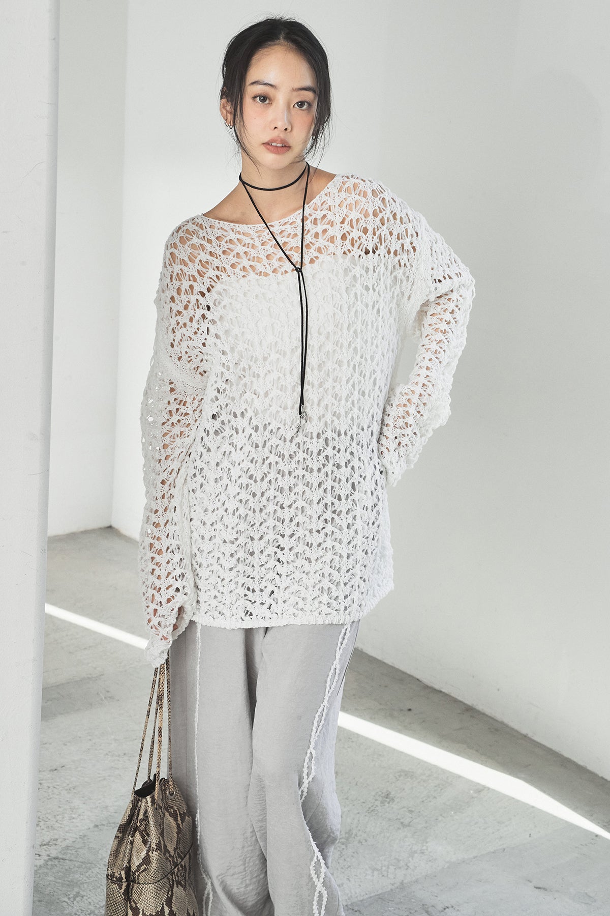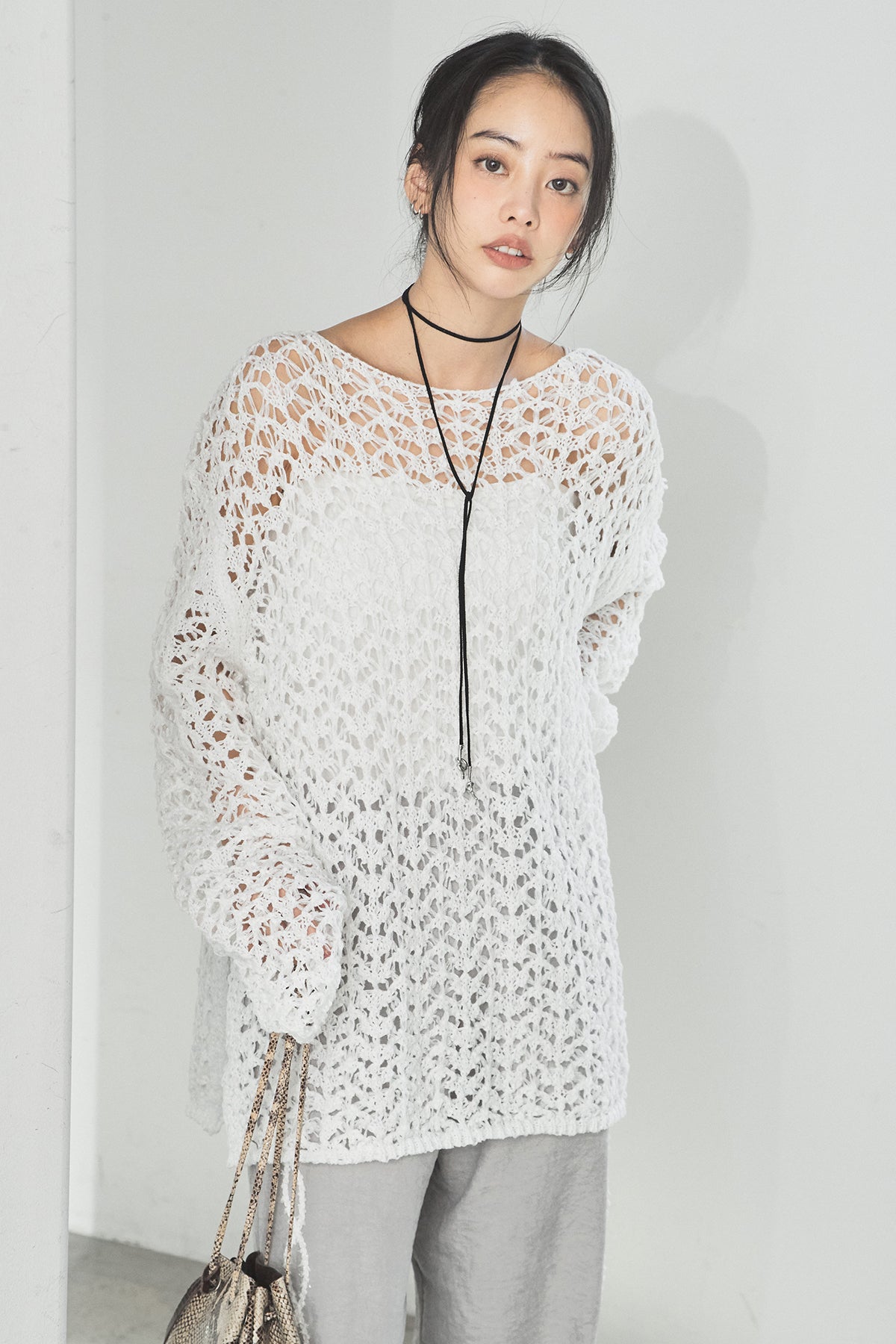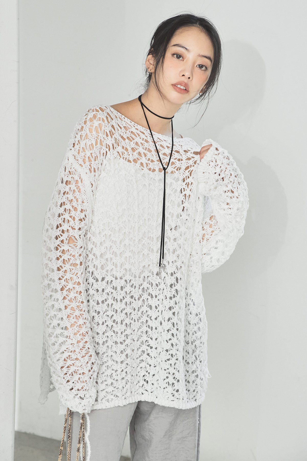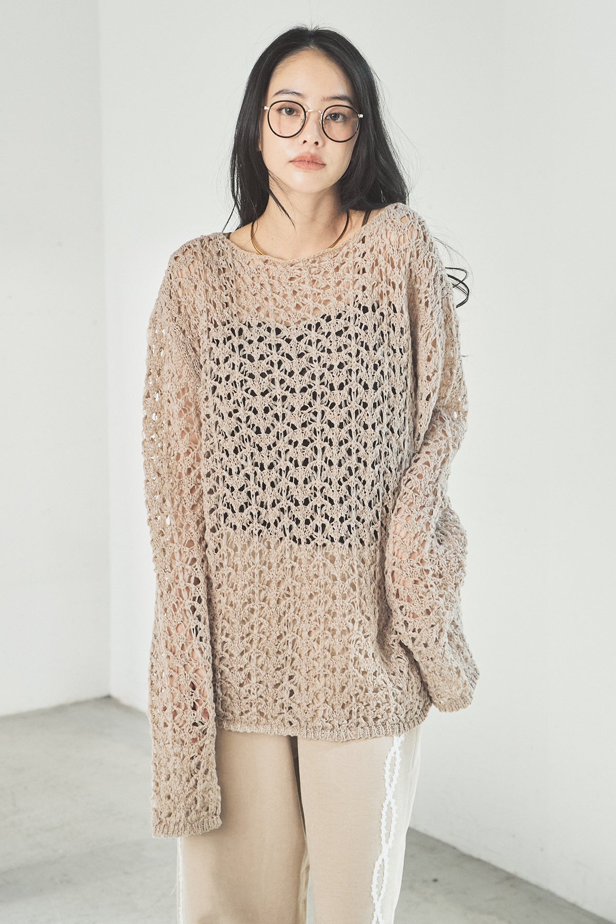 透け感のあるメッシュ編みが軽やかな印象のニットトップス。程よくラフな編み地とゆったりとしたシルエットで、リラックス感のある着心地に仕上げています。インナーとのレイヤードを楽しめるデザインで、スタイリングに抜け感と奥行きをプラス。パンツにもスカートにも合わせやすく、季節の変わり目にも活躍する一枚です。