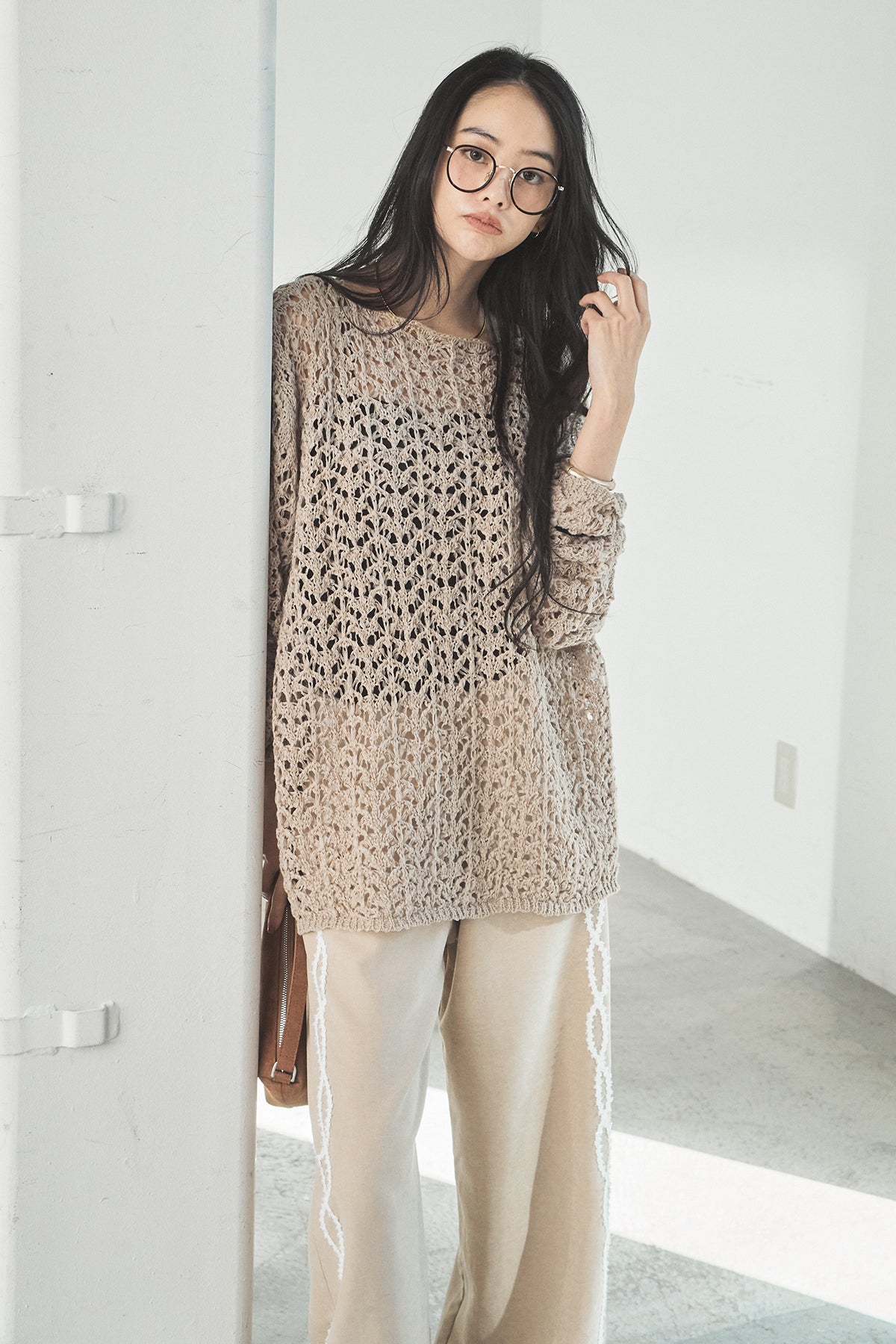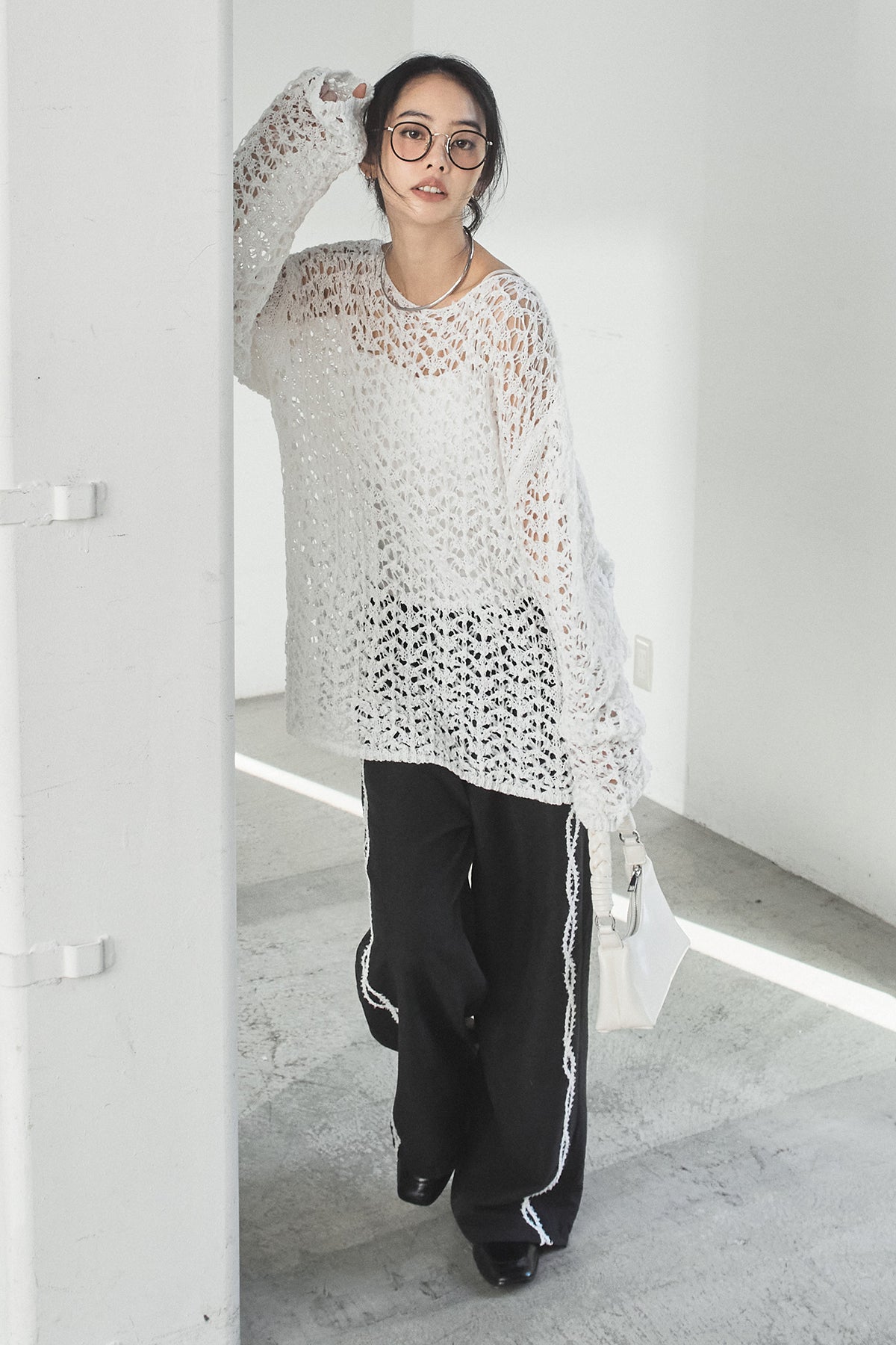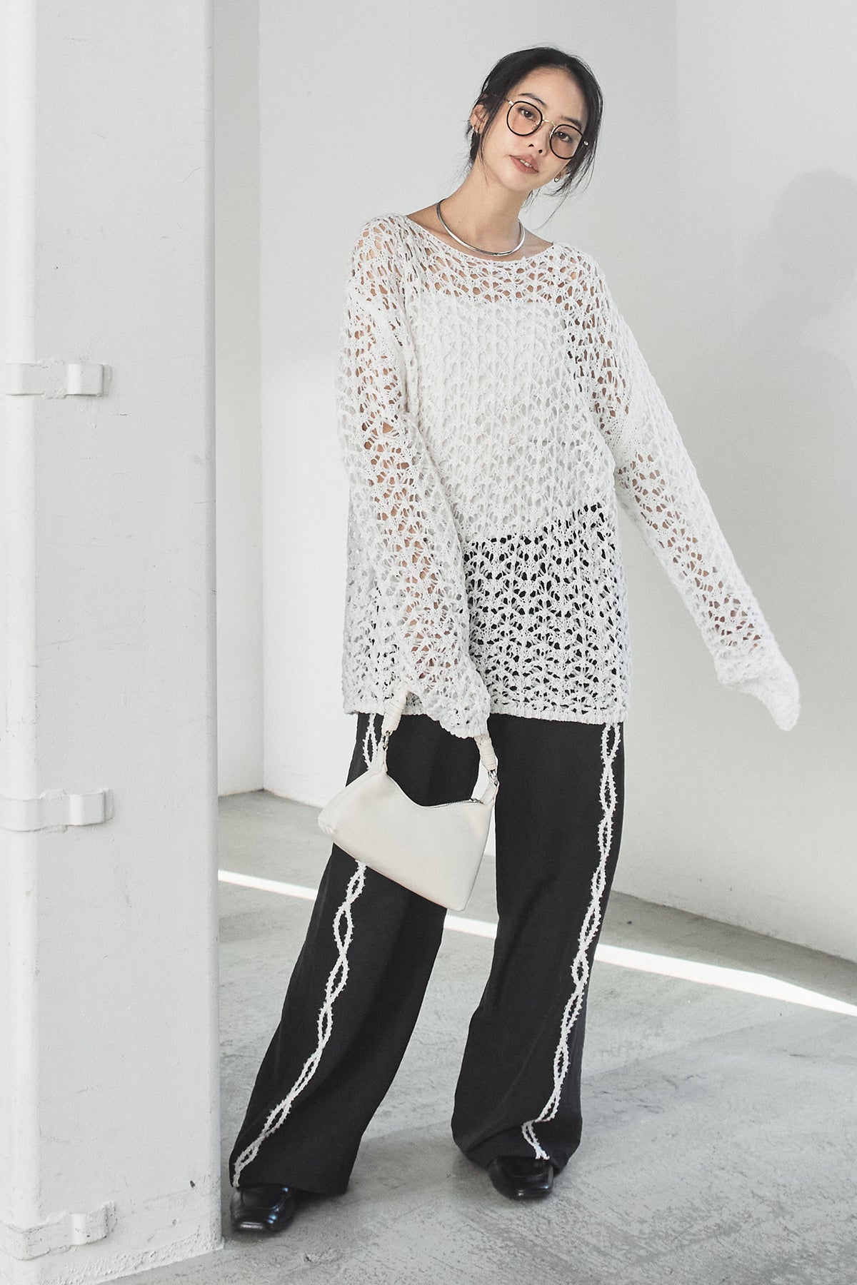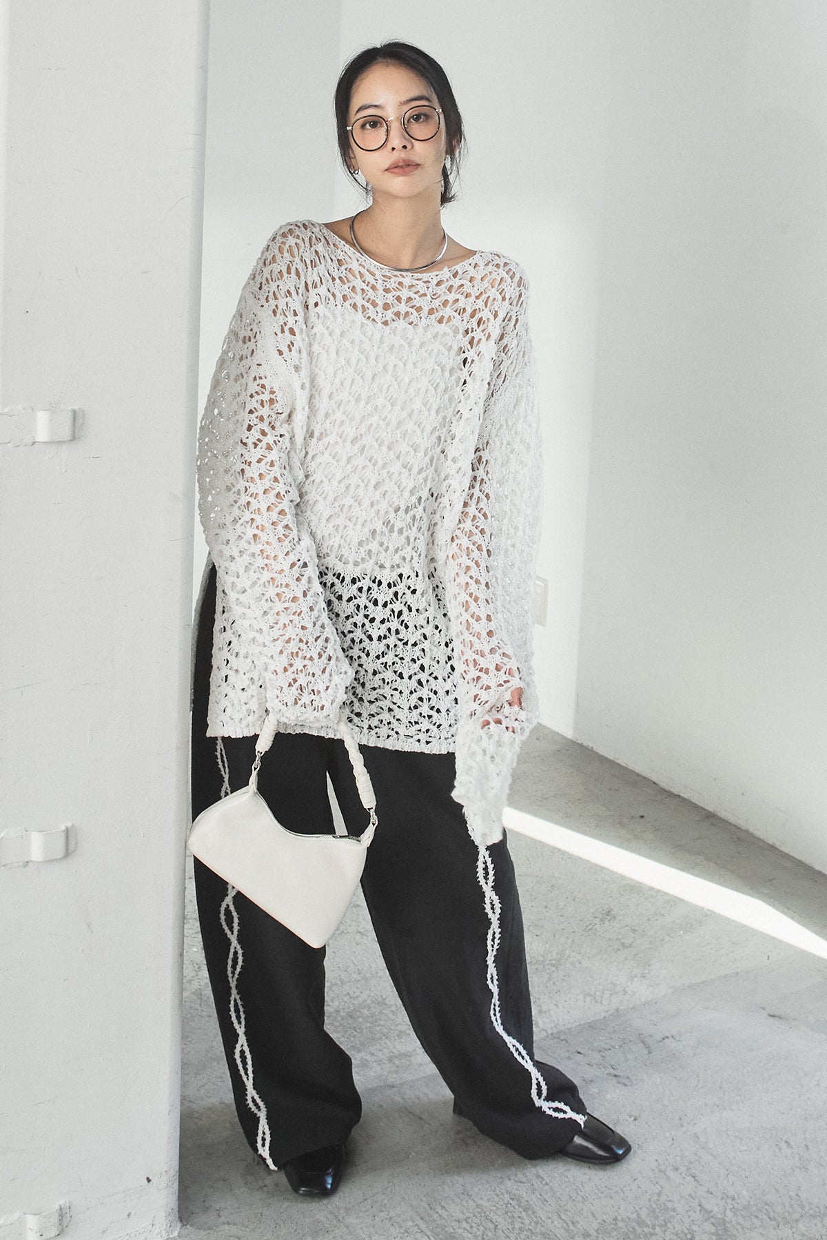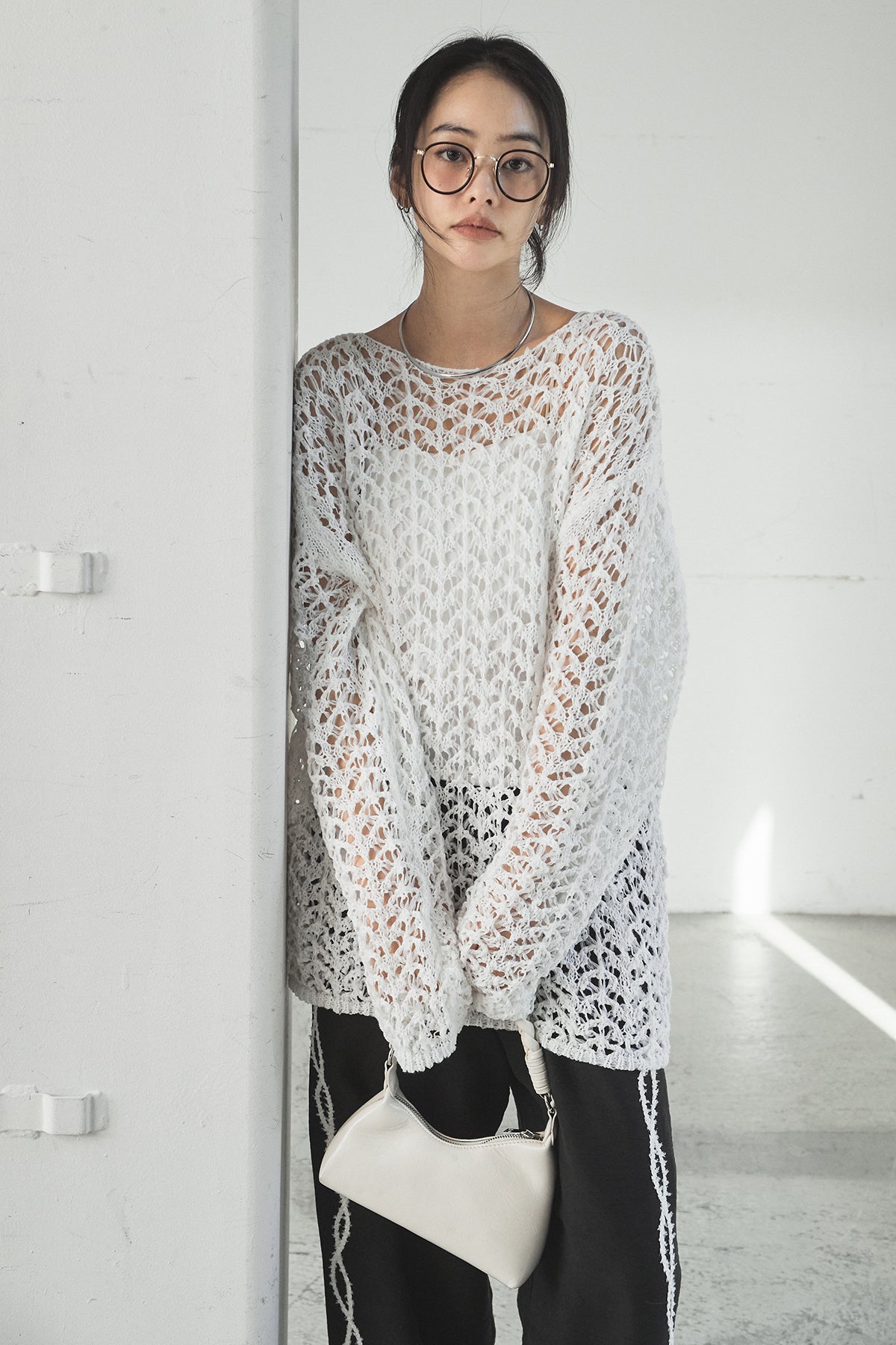 透け感のあるメッシュ編みが軽やかな印象のニットトップス。程よくラフな編み地とゆったりとしたシルエットで、リラックス感のある着心地に仕上げています。インナーとのレイヤードを楽しめるデザインで、スタイリングに抜け感と奥行きをプラス。パンツにもスカートにも合わせやすく、季節の変わり目にも活躍する一枚です。