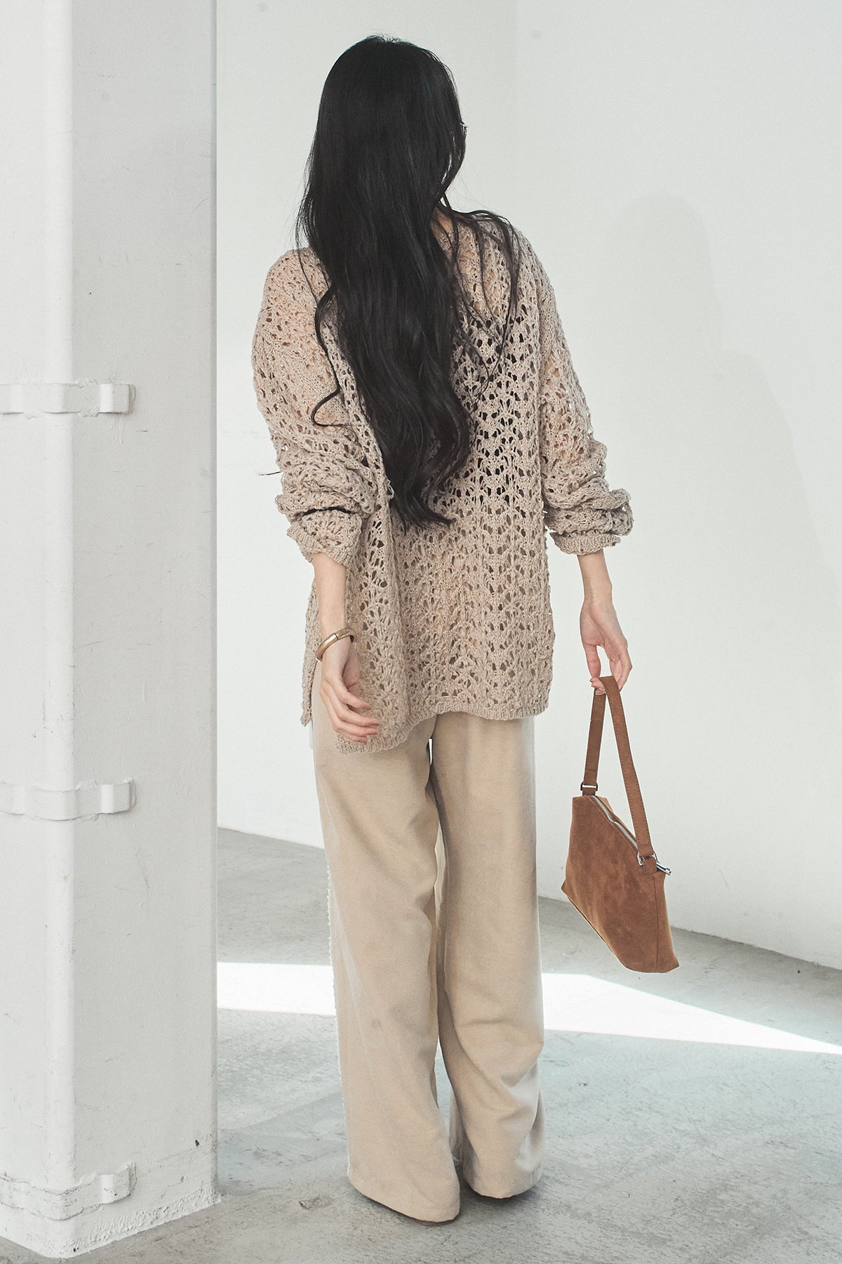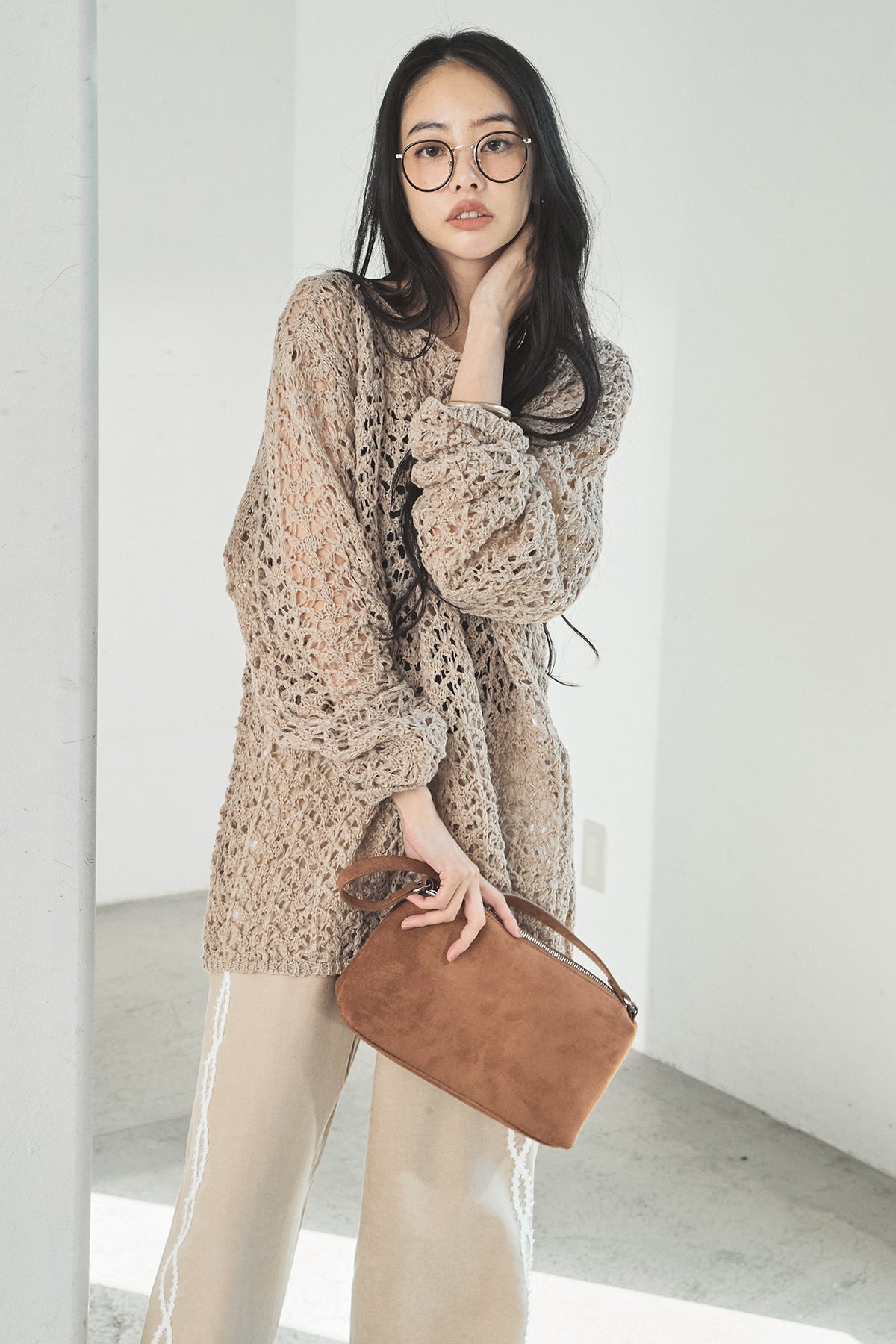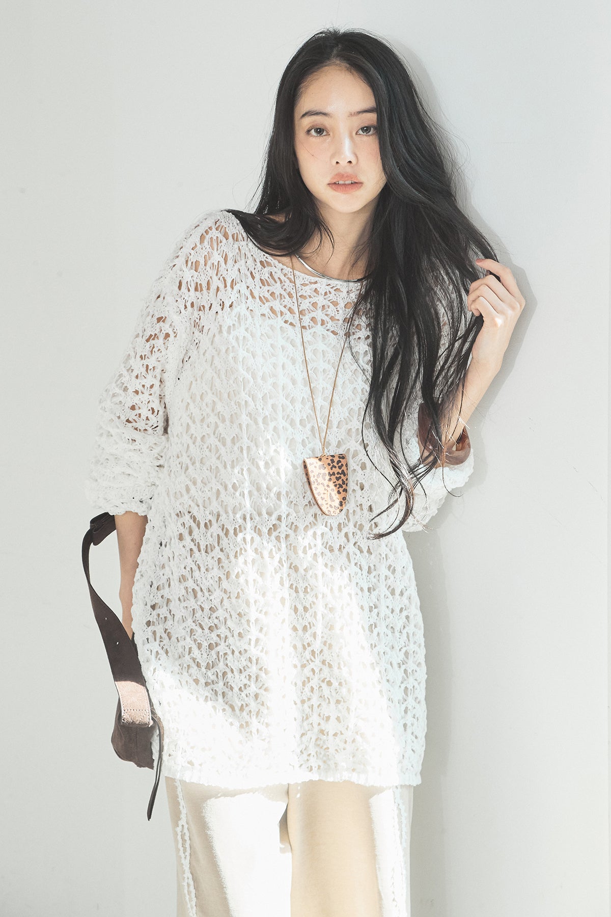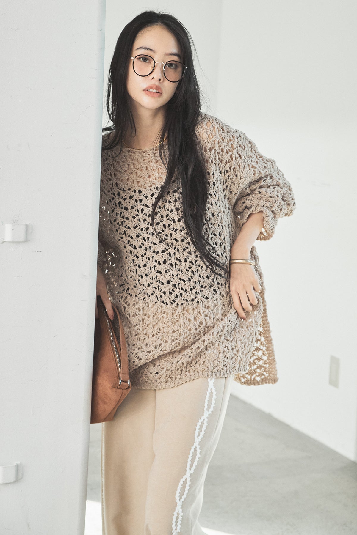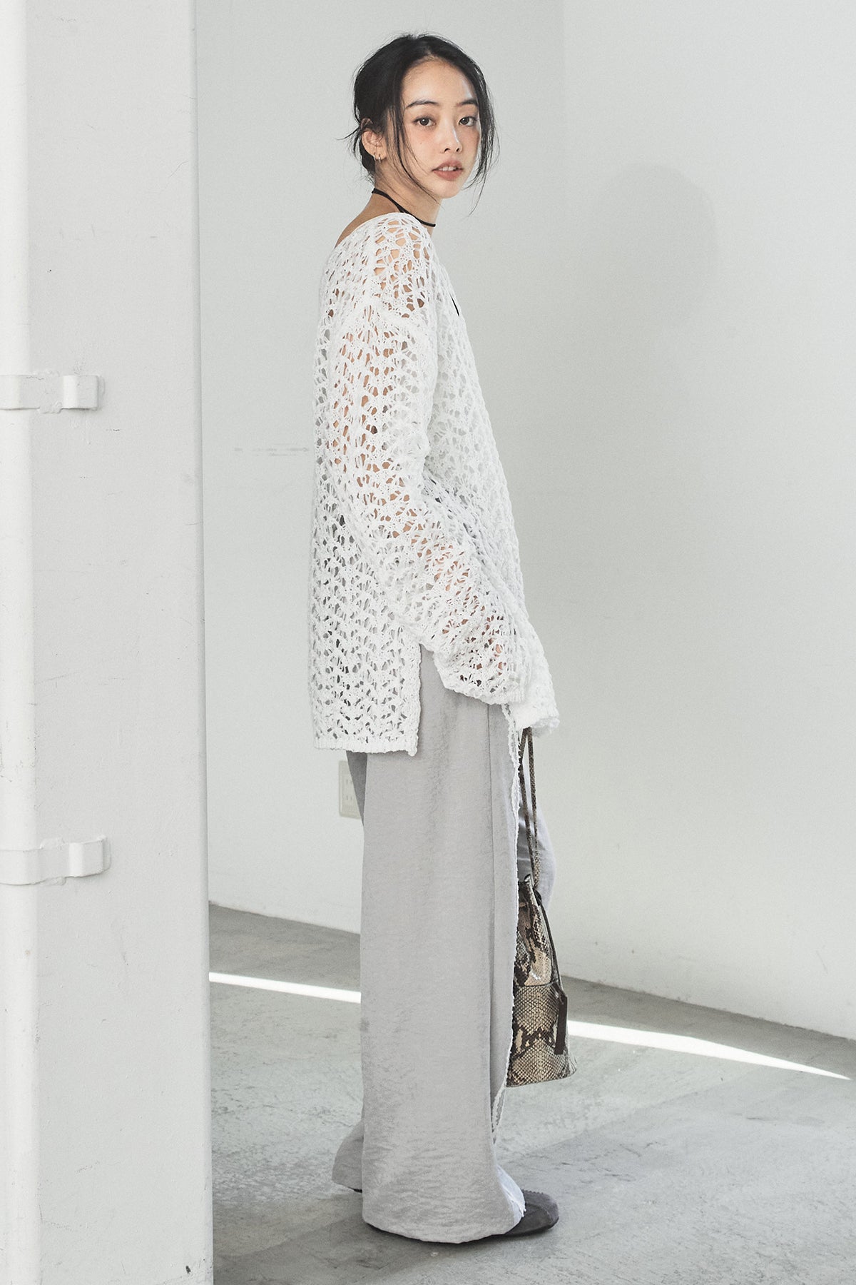 透け感のあるメッシュ編みが軽やかな印象のニットトップス。程よくラフな編み地とゆったりとしたシルエットで、リラックス感のある着心地に仕上げています。インナーとのレイヤードを楽しめるデザインで、スタイリングに抜け感と奥行きをプラス。パンツにもスカートにも合わせやすく、季節の変わり目にも活躍する一枚です。