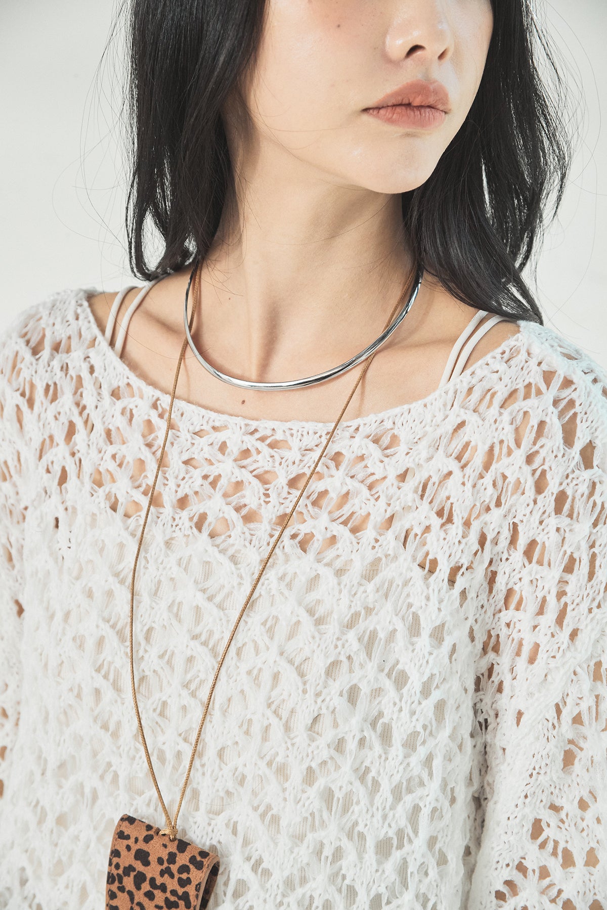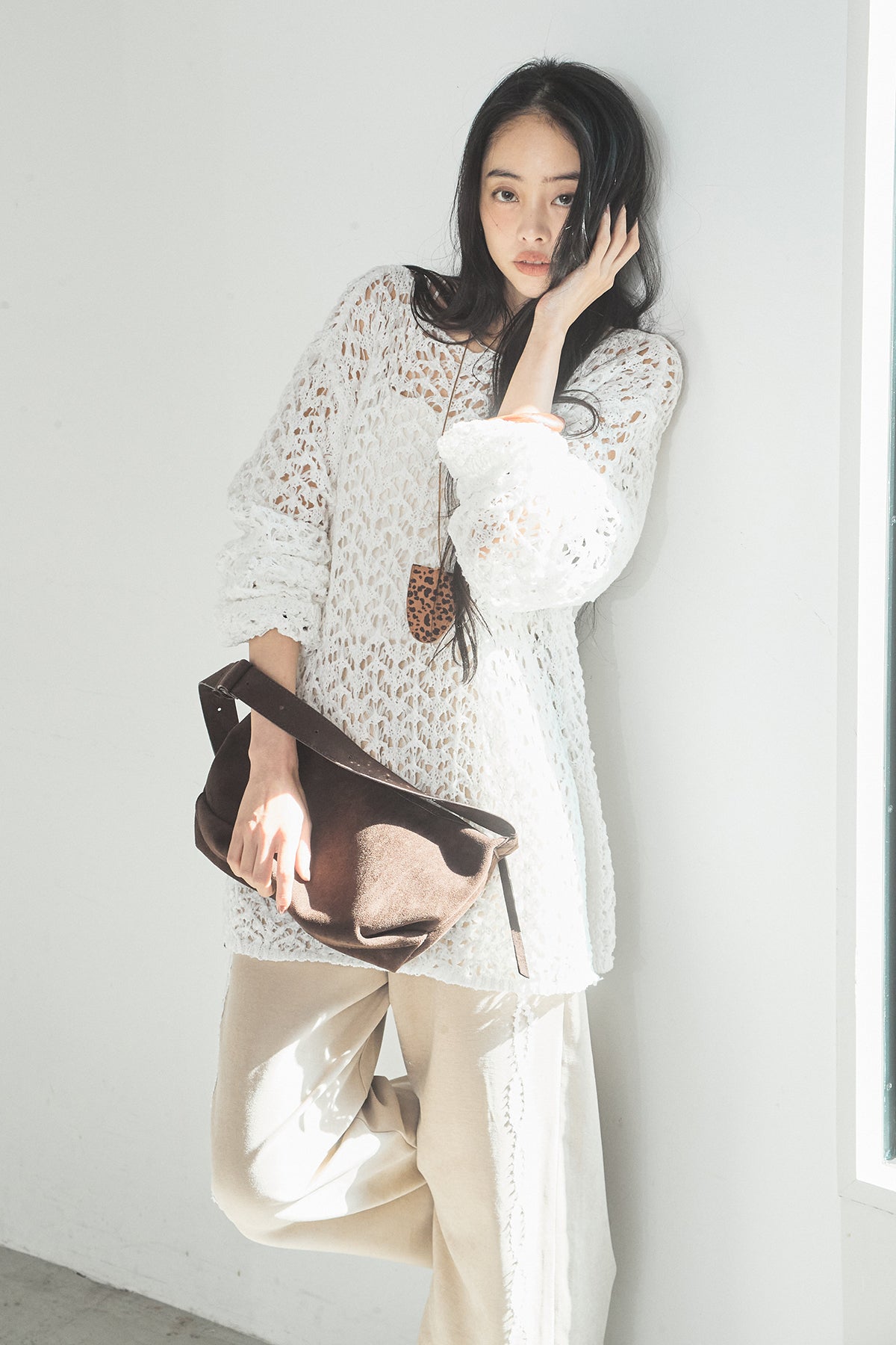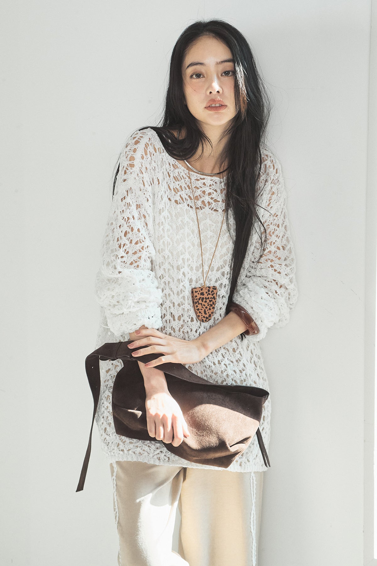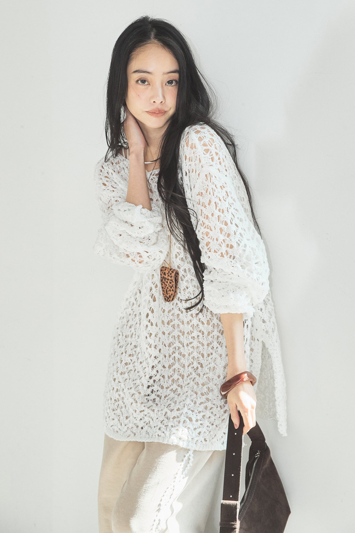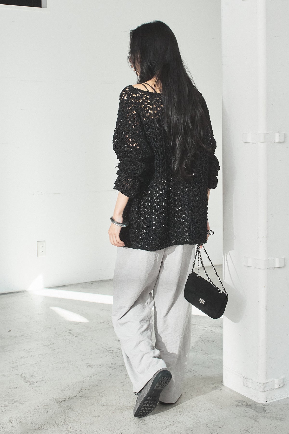 透け感のあるメッシュ編みが軽やかな印象のニットトップス。程よくラフな編み地とゆったりとしたシルエットで、リラックス感のある着心地に仕上げています。インナーとのレイヤードを楽しめるデザインで、スタイリングに抜け感と奥行きをプラス。パンツにもスカートにも合わせやすく、季節の変わり目にも活躍する一枚です。