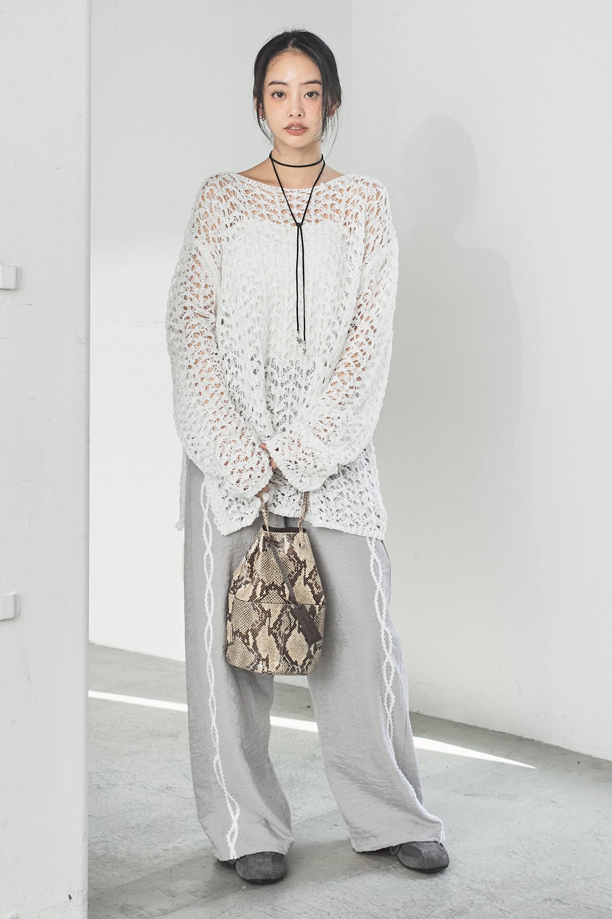 [SET]リラックスメッシュニットトップス+刺繡テープラインパンツ(2set)
