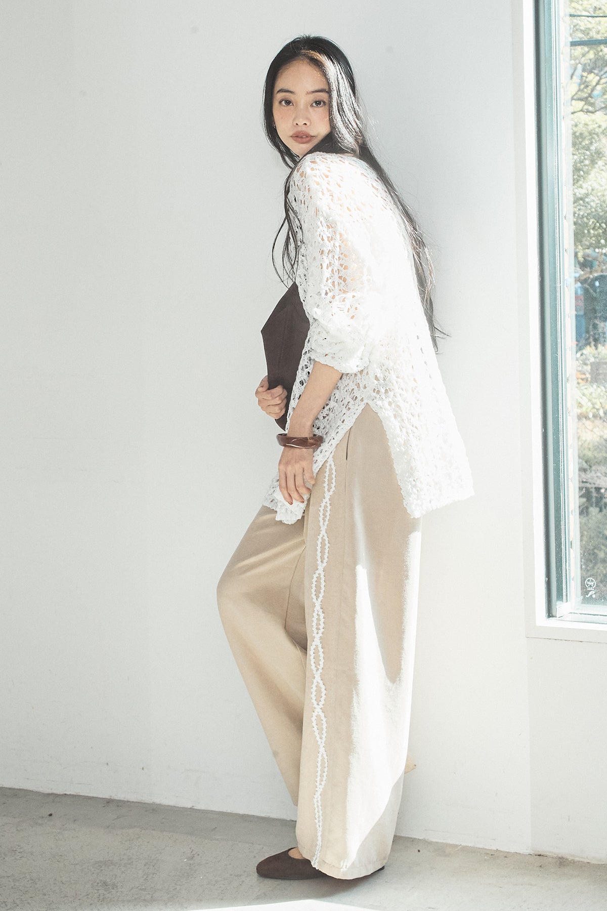 サイドに施した刺繍テープラインが印象的なワイドパンツ。シンプルなシルエットに繊細なディテールを添えることで、さりげないアクセントと縦のラインを演出しています。程よく落ち感のある素材とゆとりのある設計で、リラックスした穿き心地ながらもすっきりとした印象に。トップスを選ばず合わせやすく、コーディネートにほどよい表情をプラスしてくれる一本です。