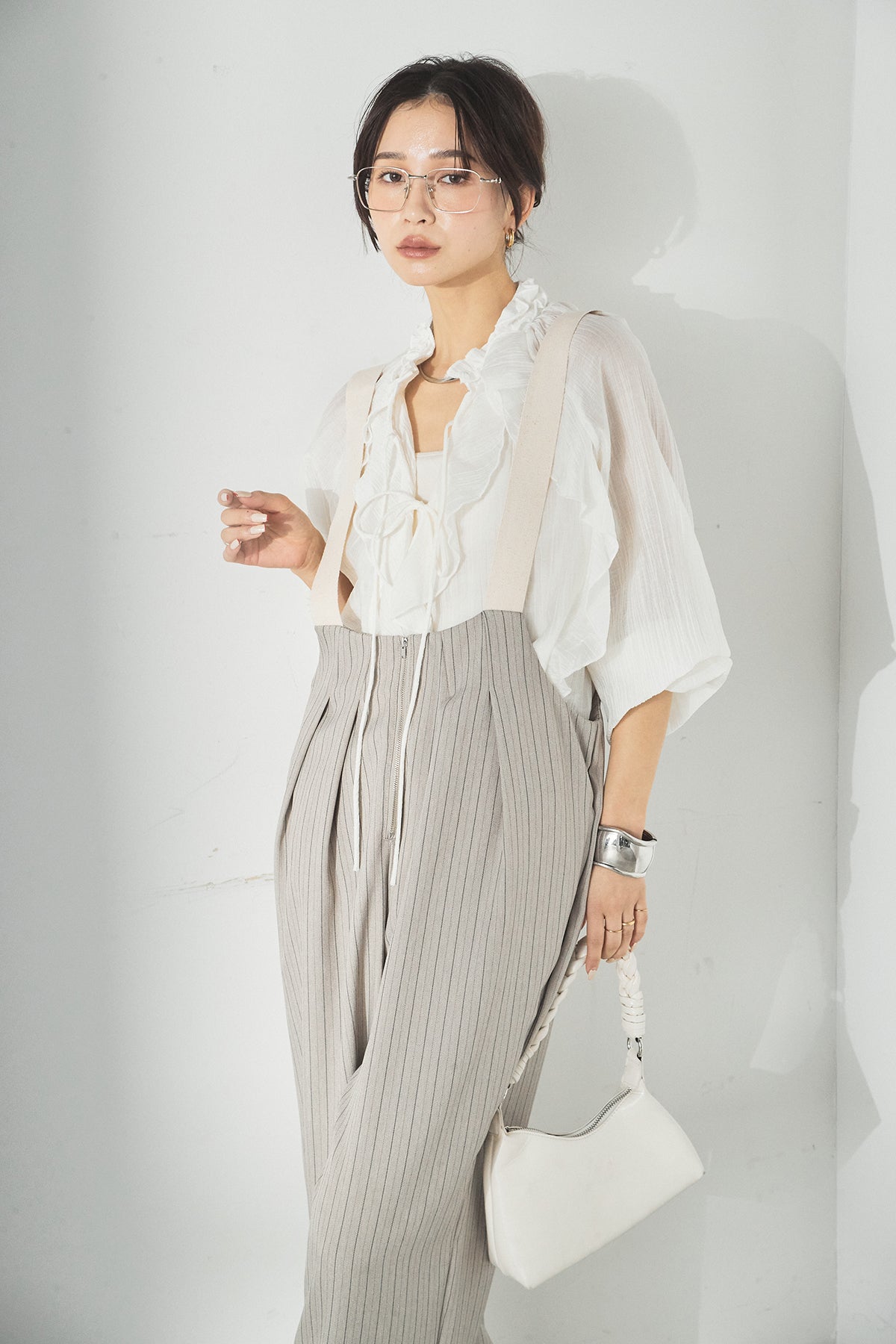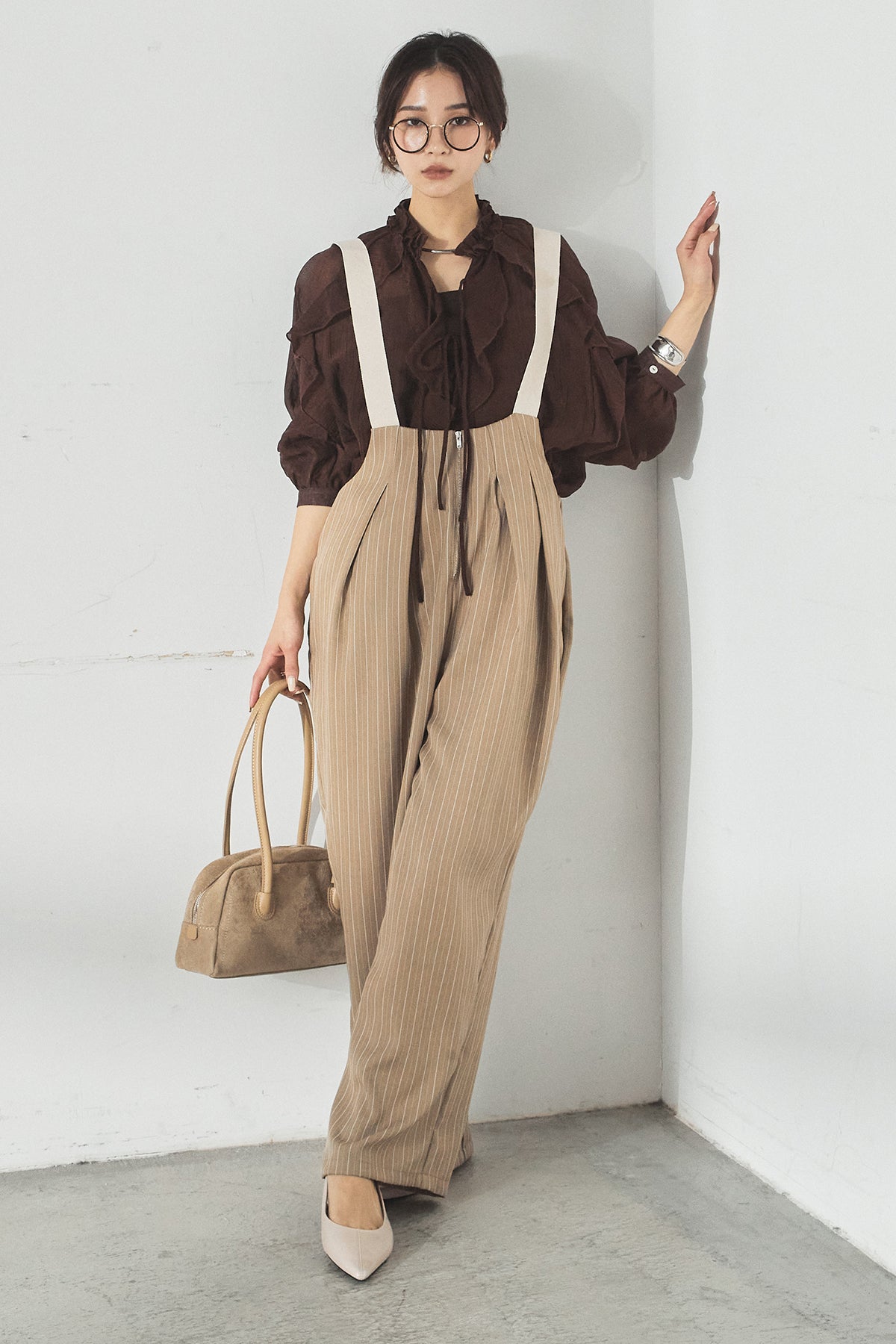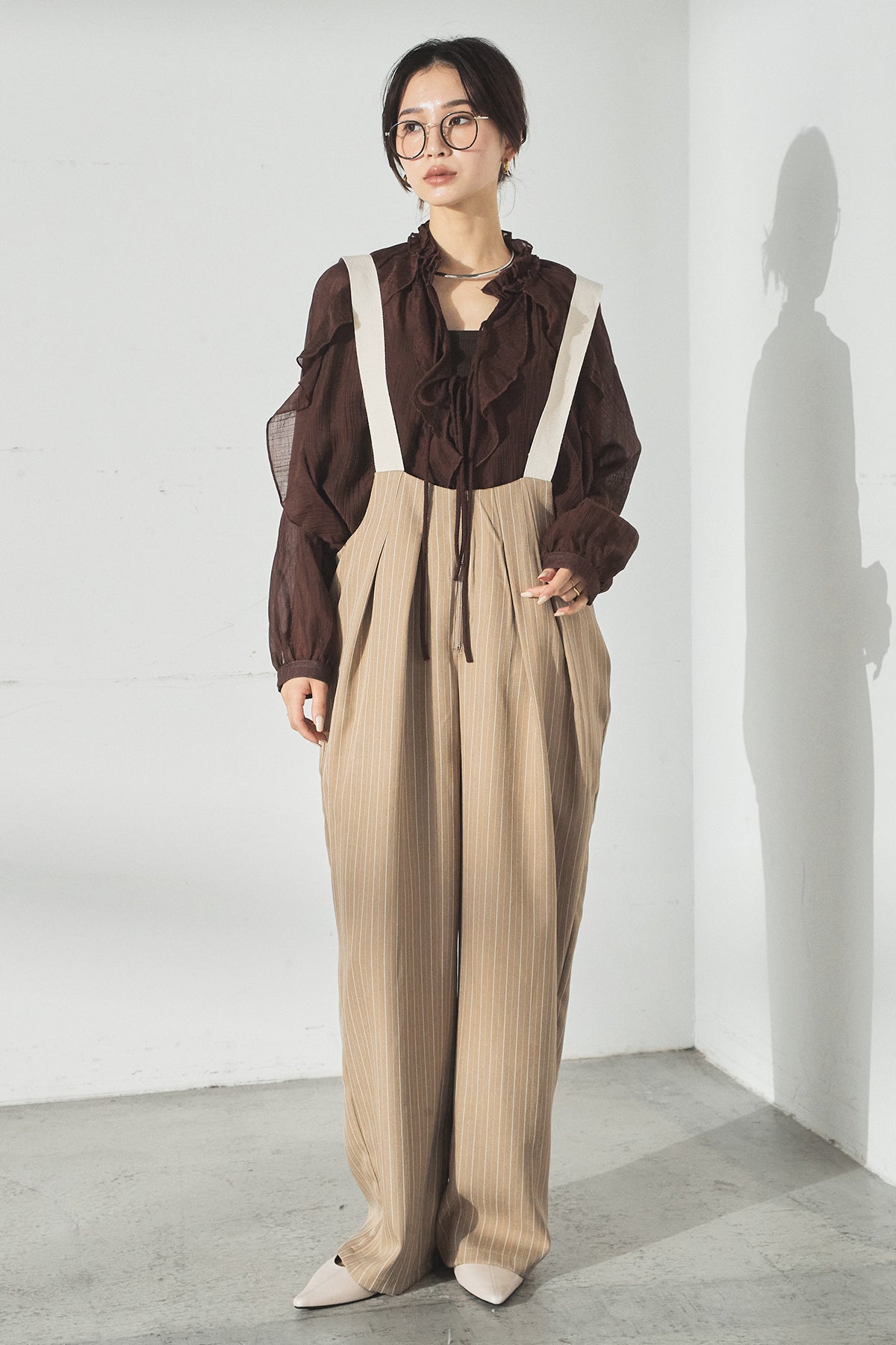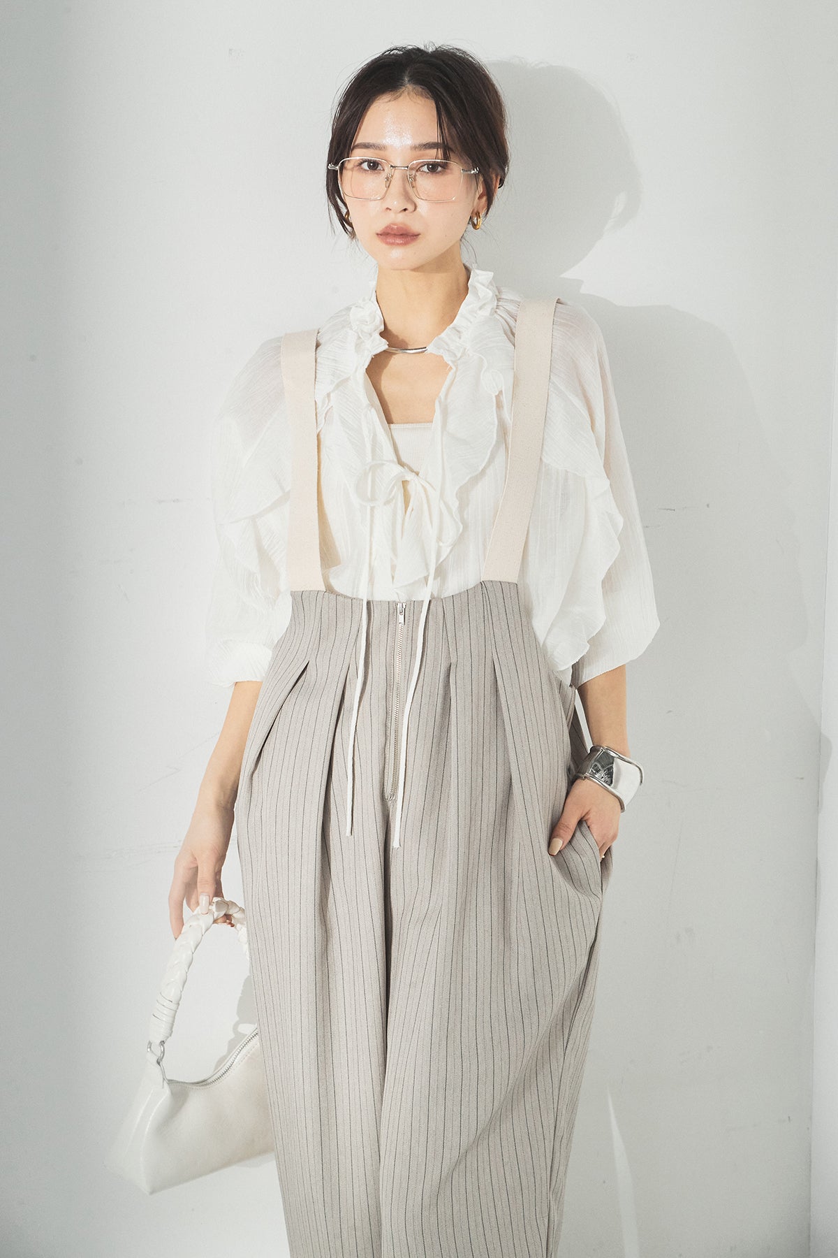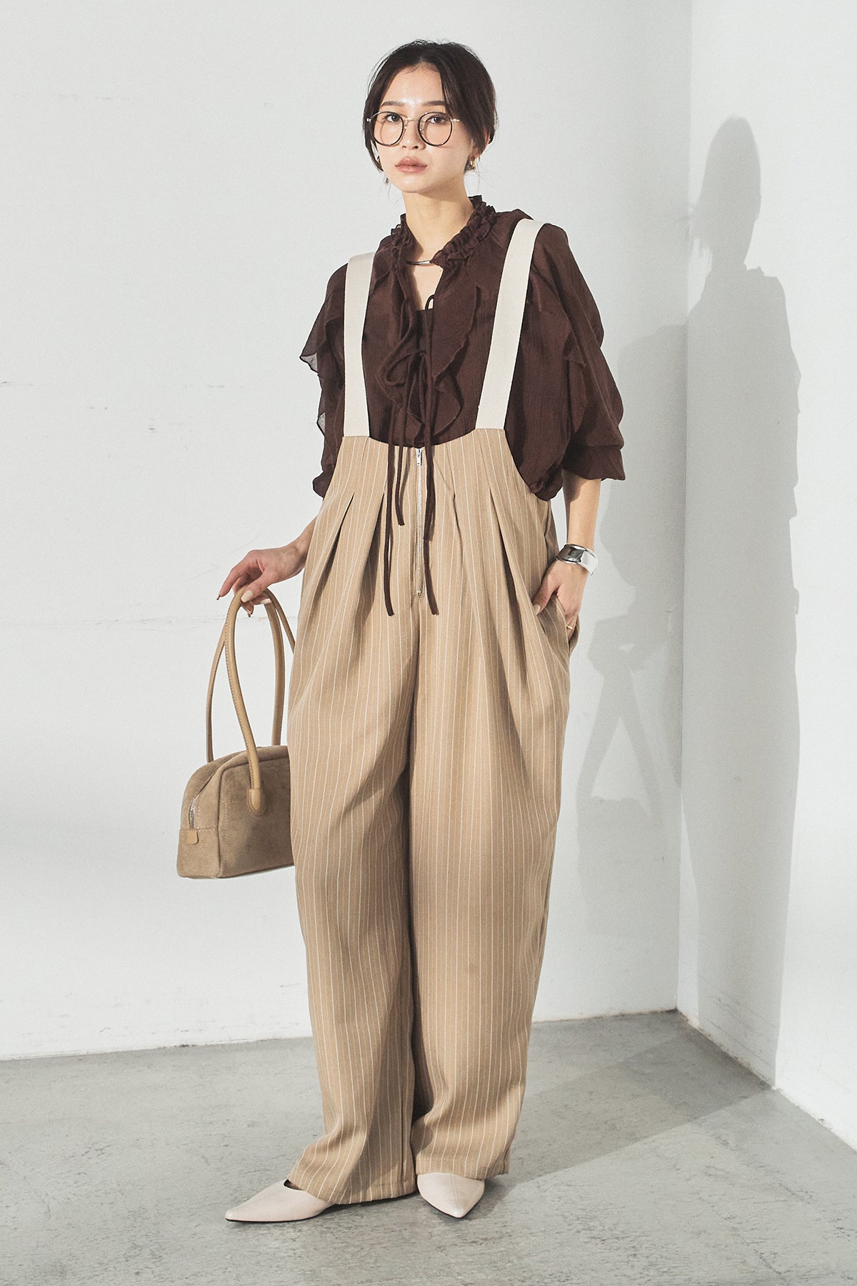 [SET]フロントリボンフリルブラウス+ピンストライプツータックサロペット(2set)