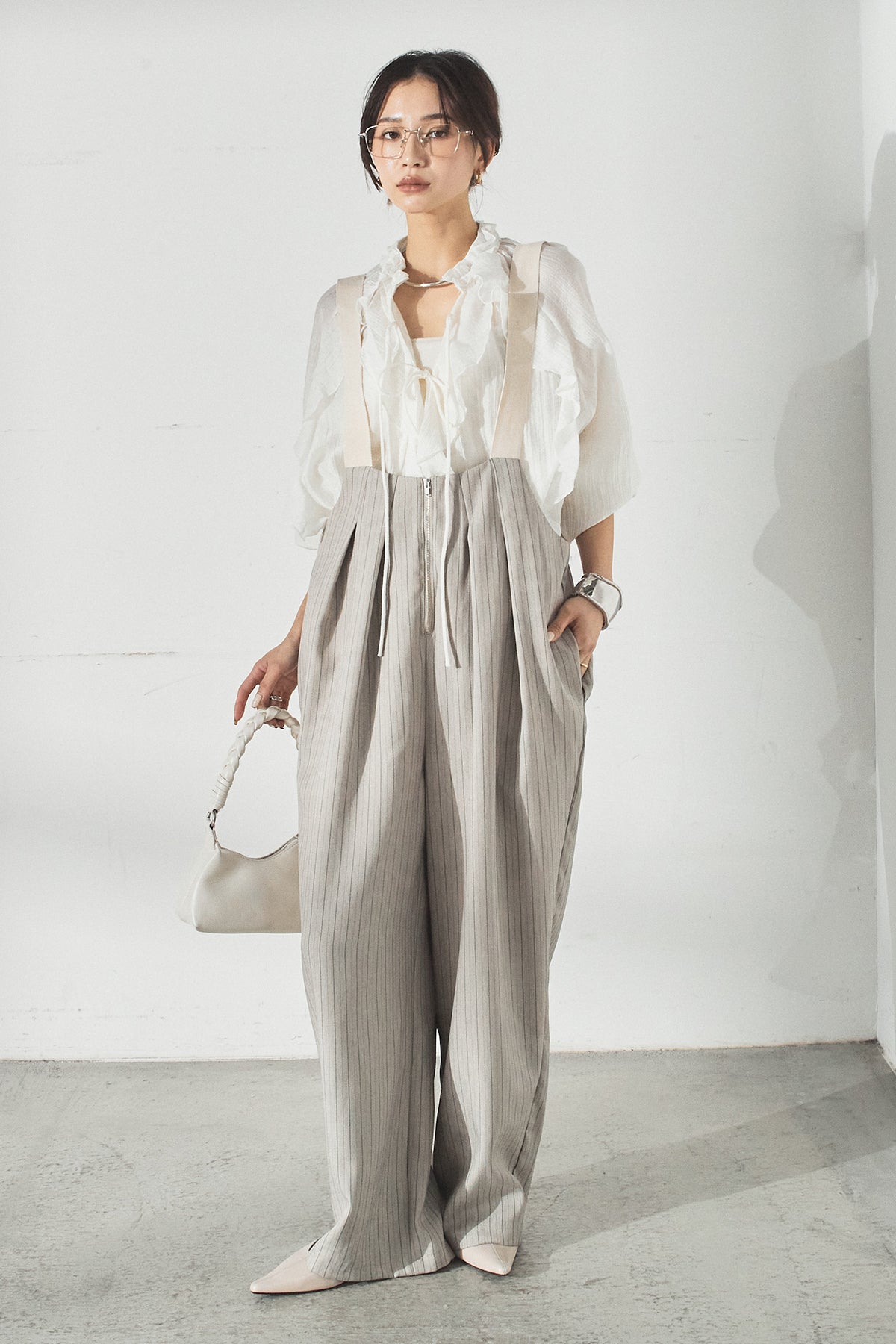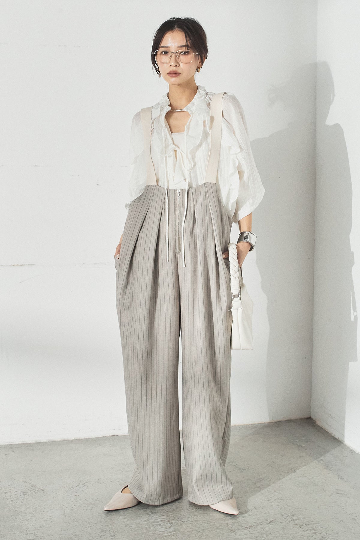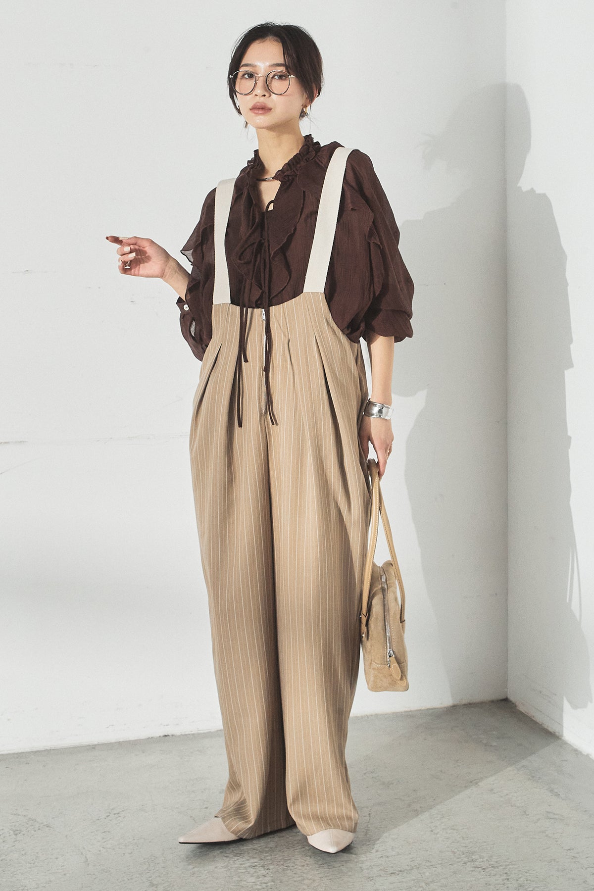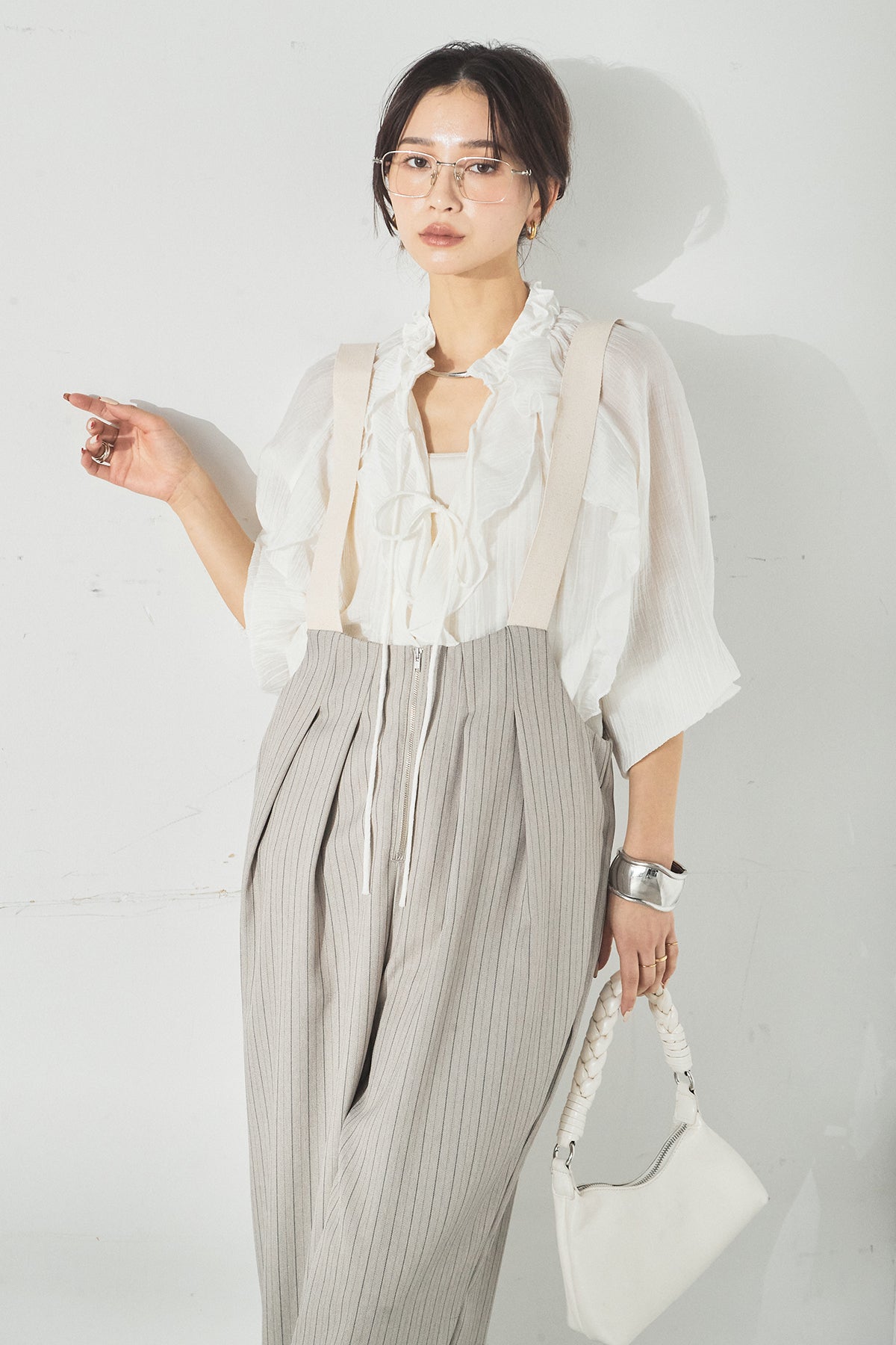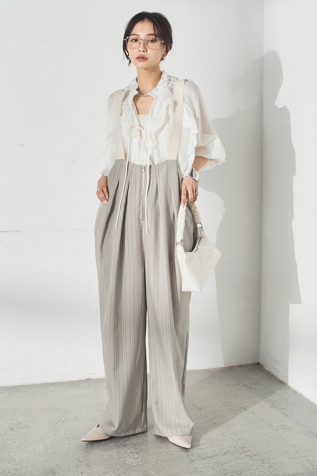 [SET]フロントリボンフリルブラウス+ピンストライプツータックサロペット(2set)