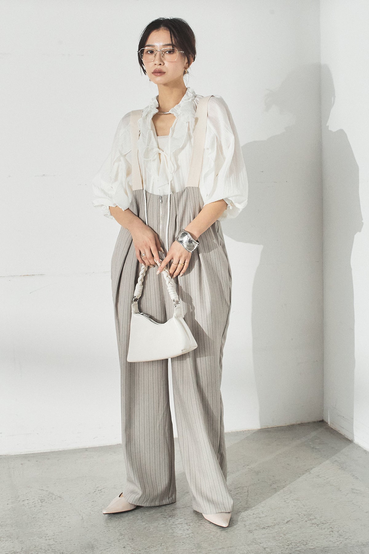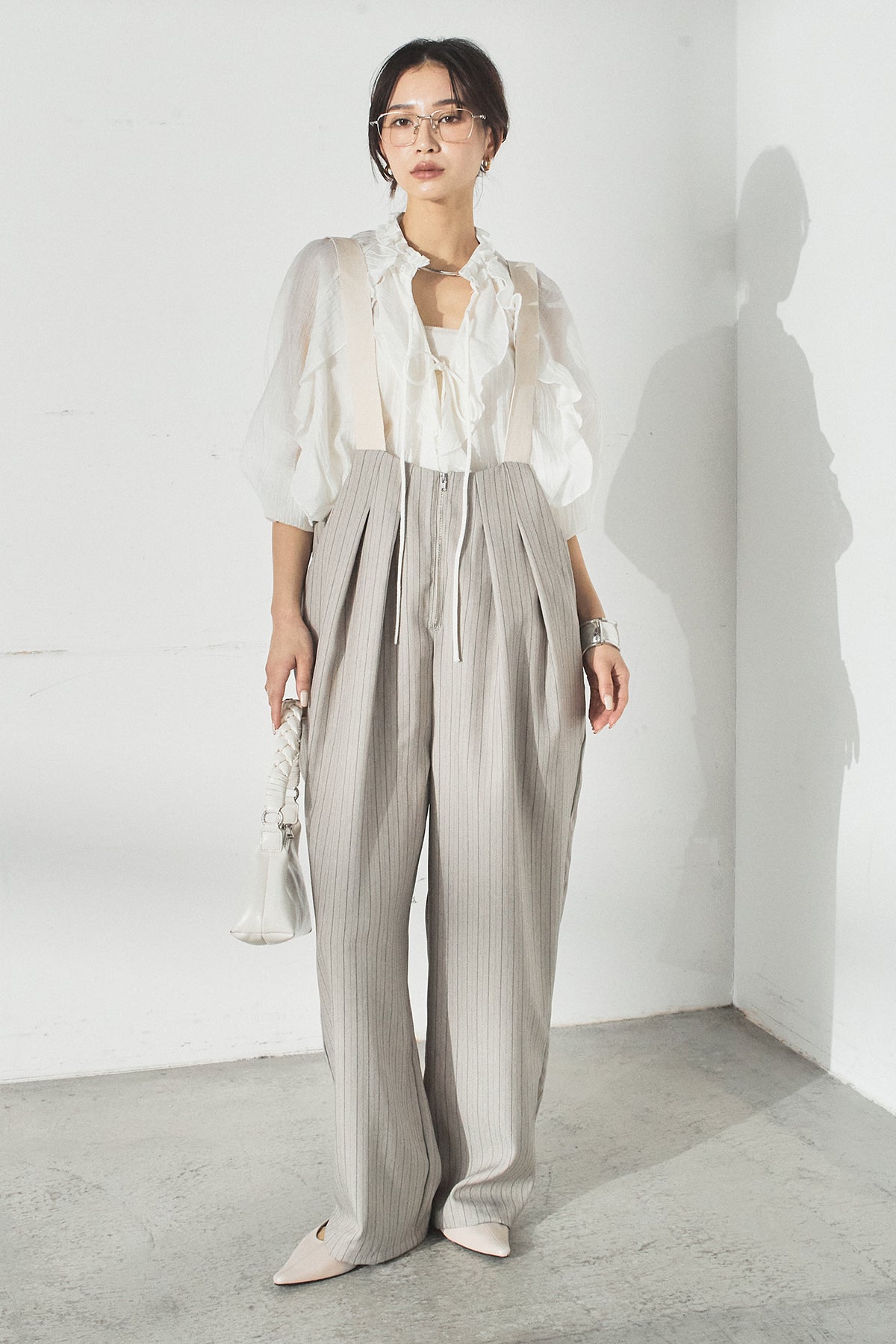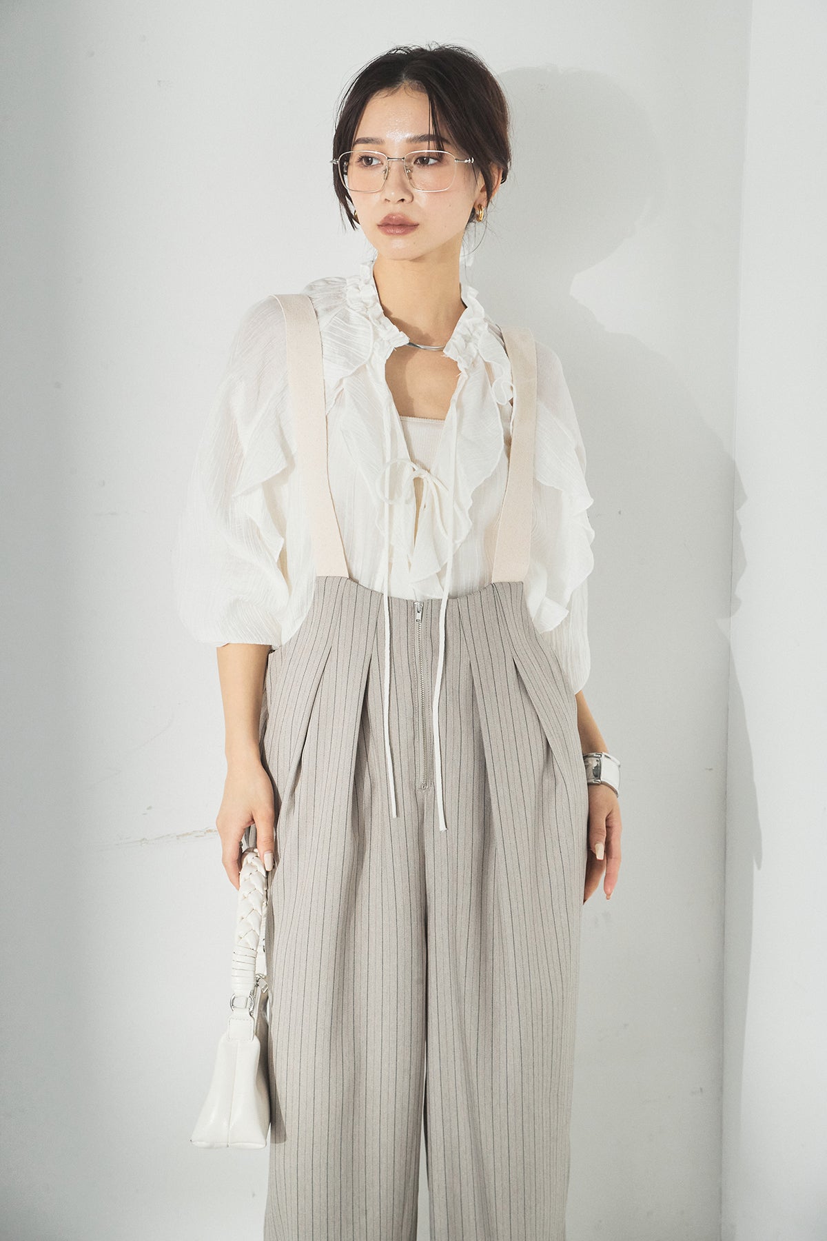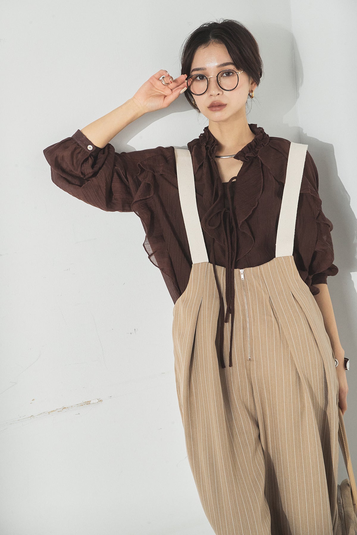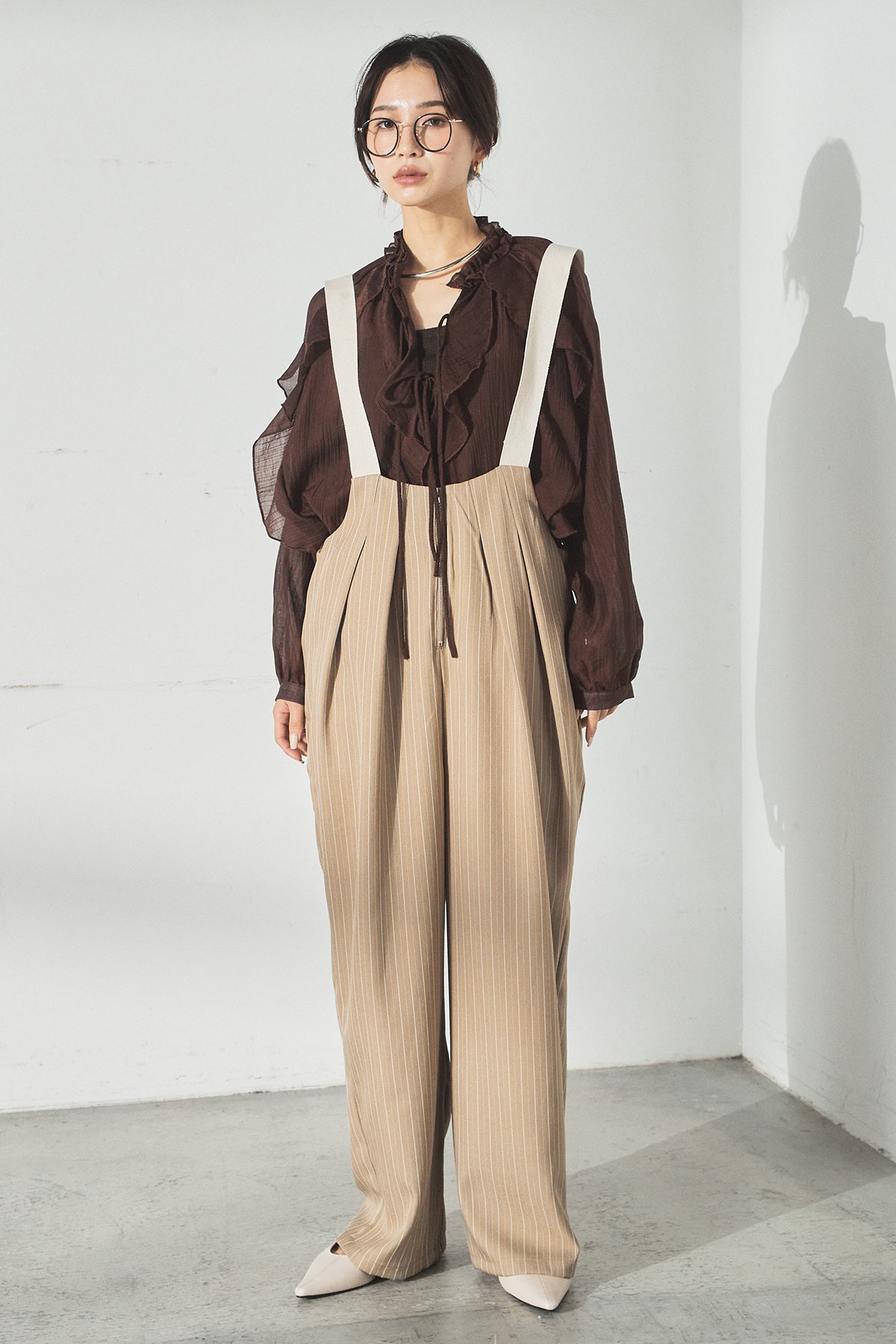 [SET]フロントリボンフリルブラウス+ピンストライプツータックサロペット(2set)