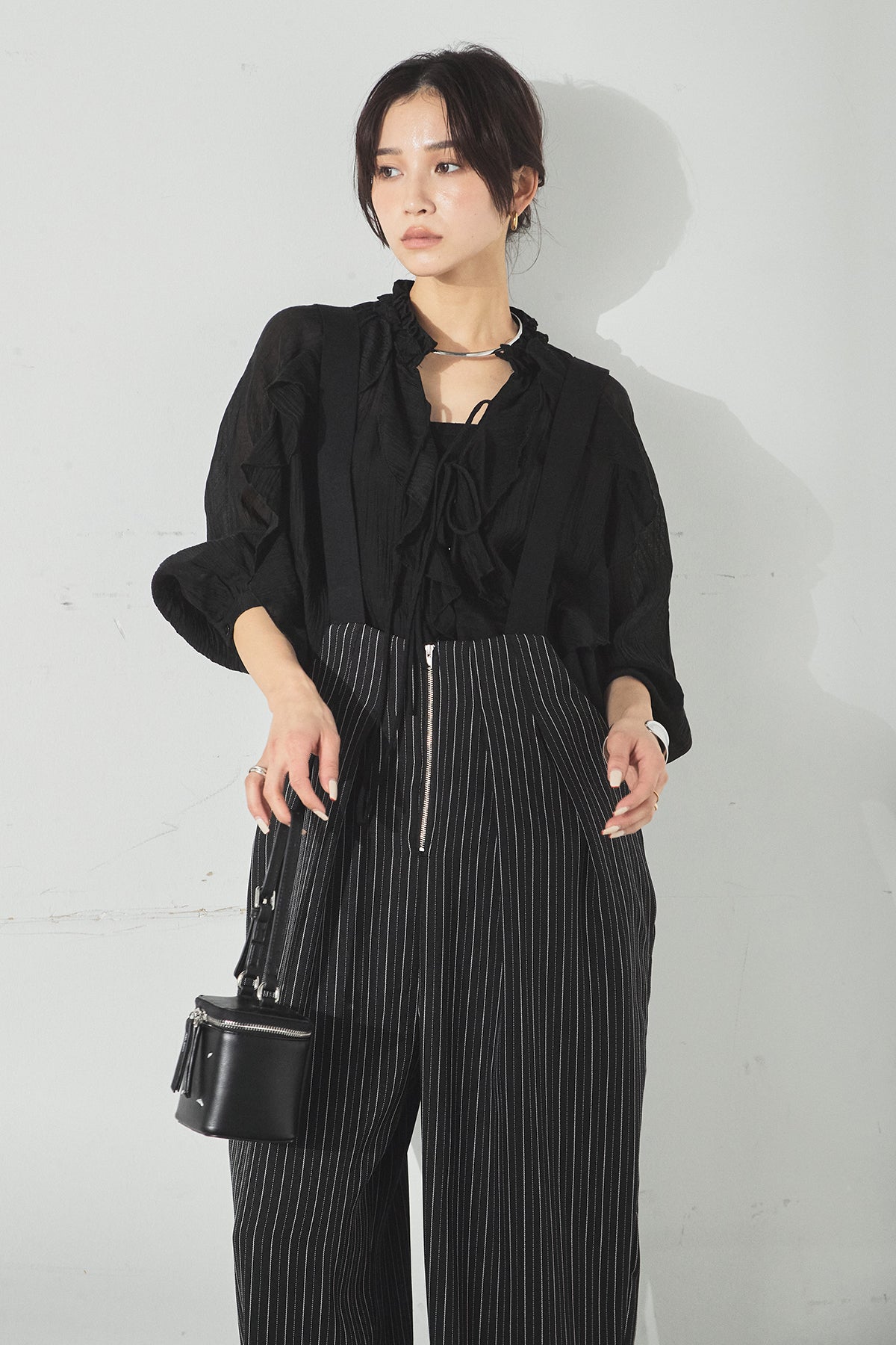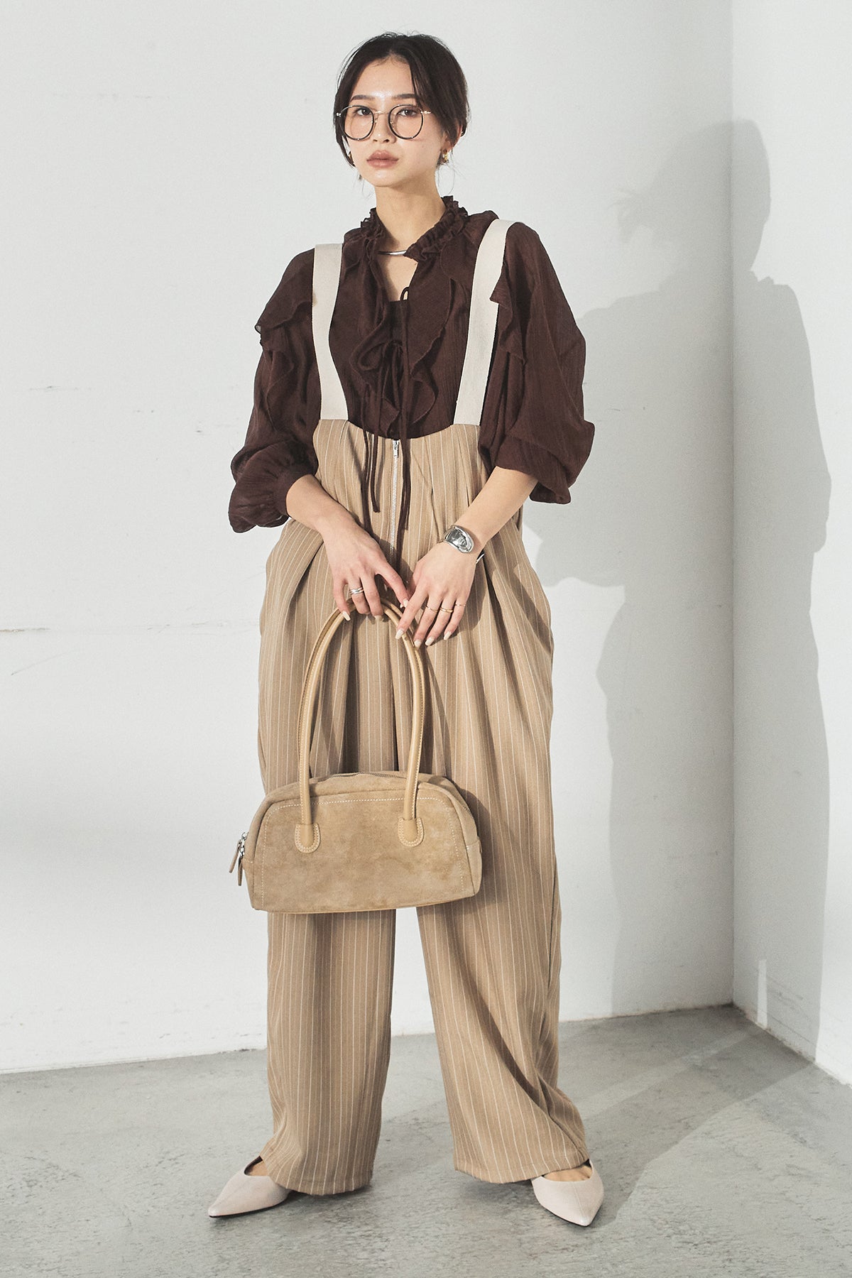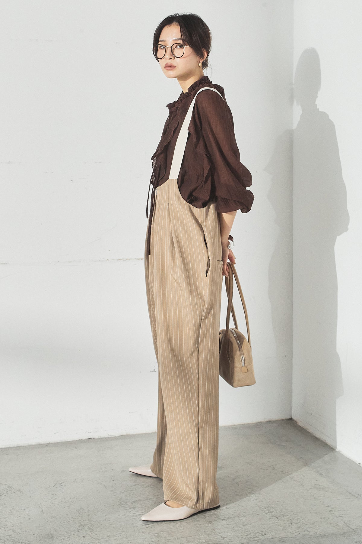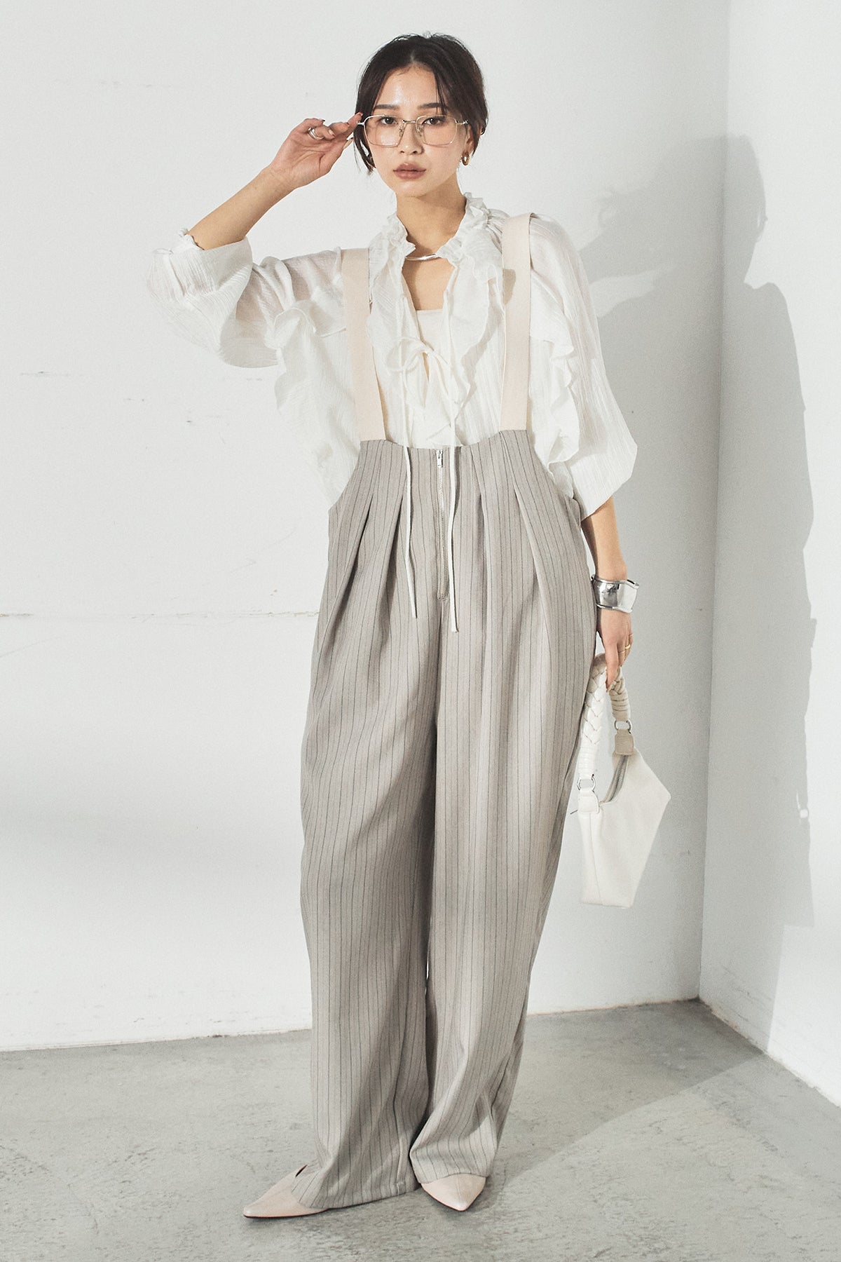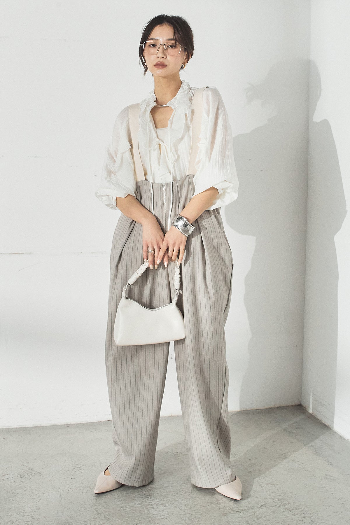 [SET]フロントリボンフリルブラウス+ピンストライプツータックサロペット(2set)