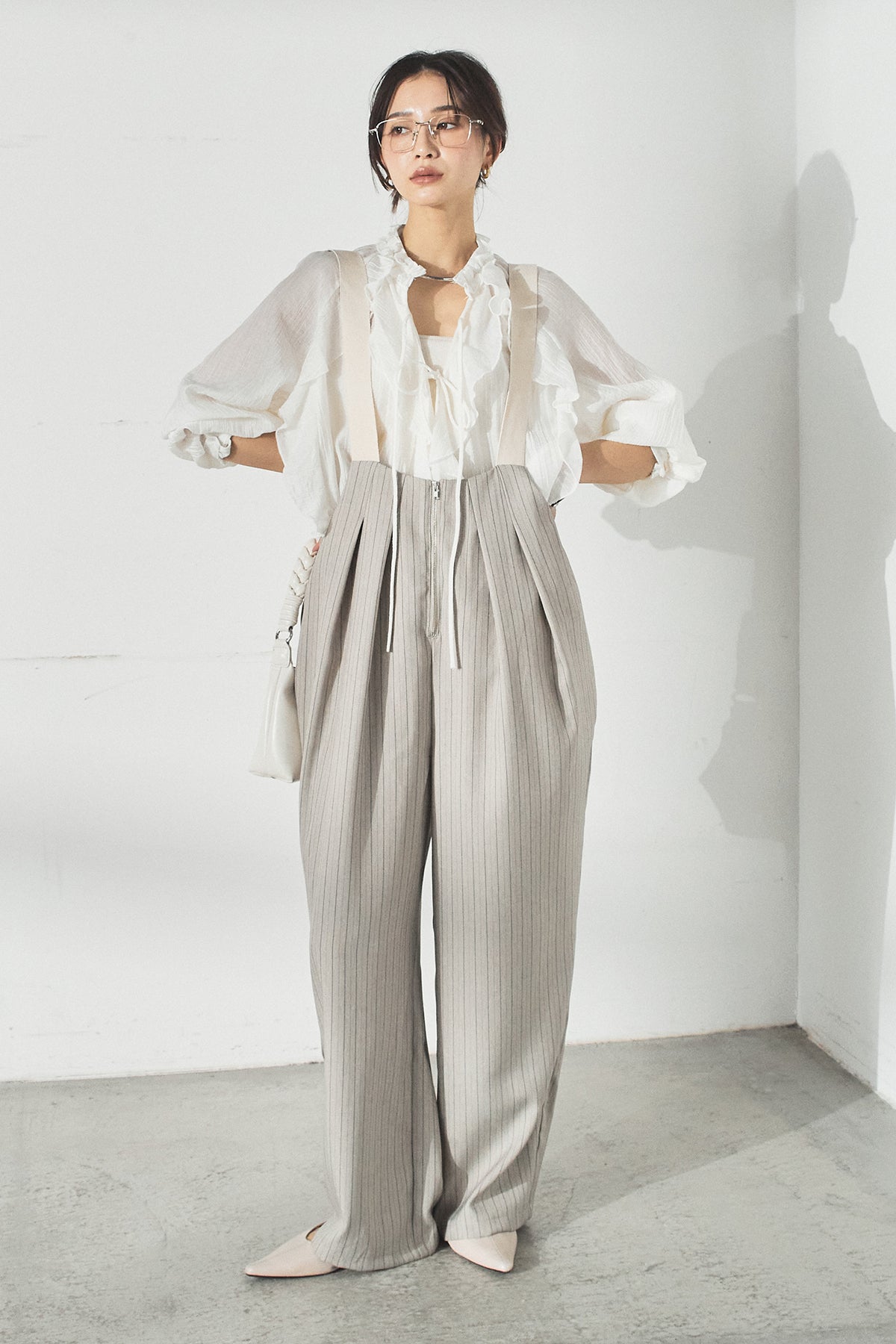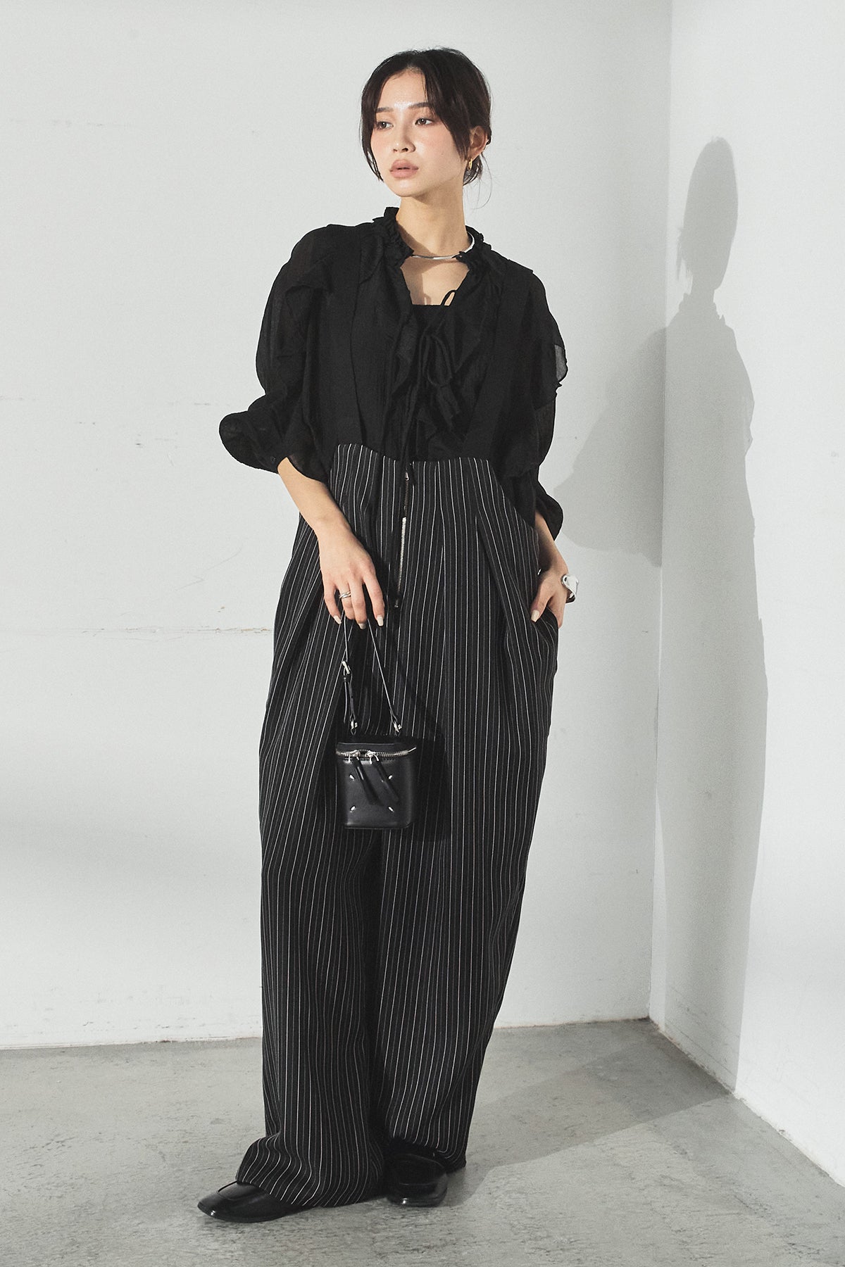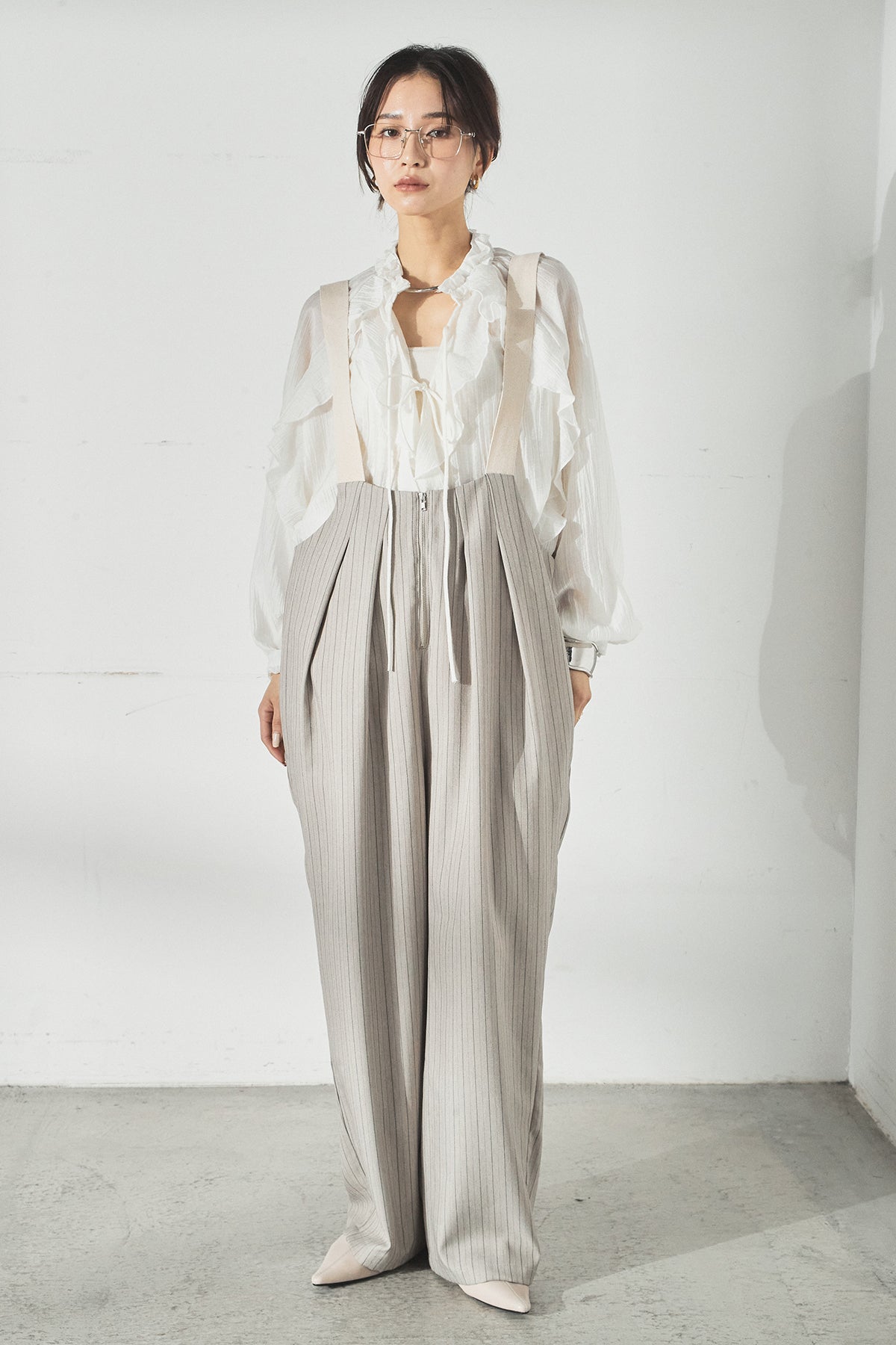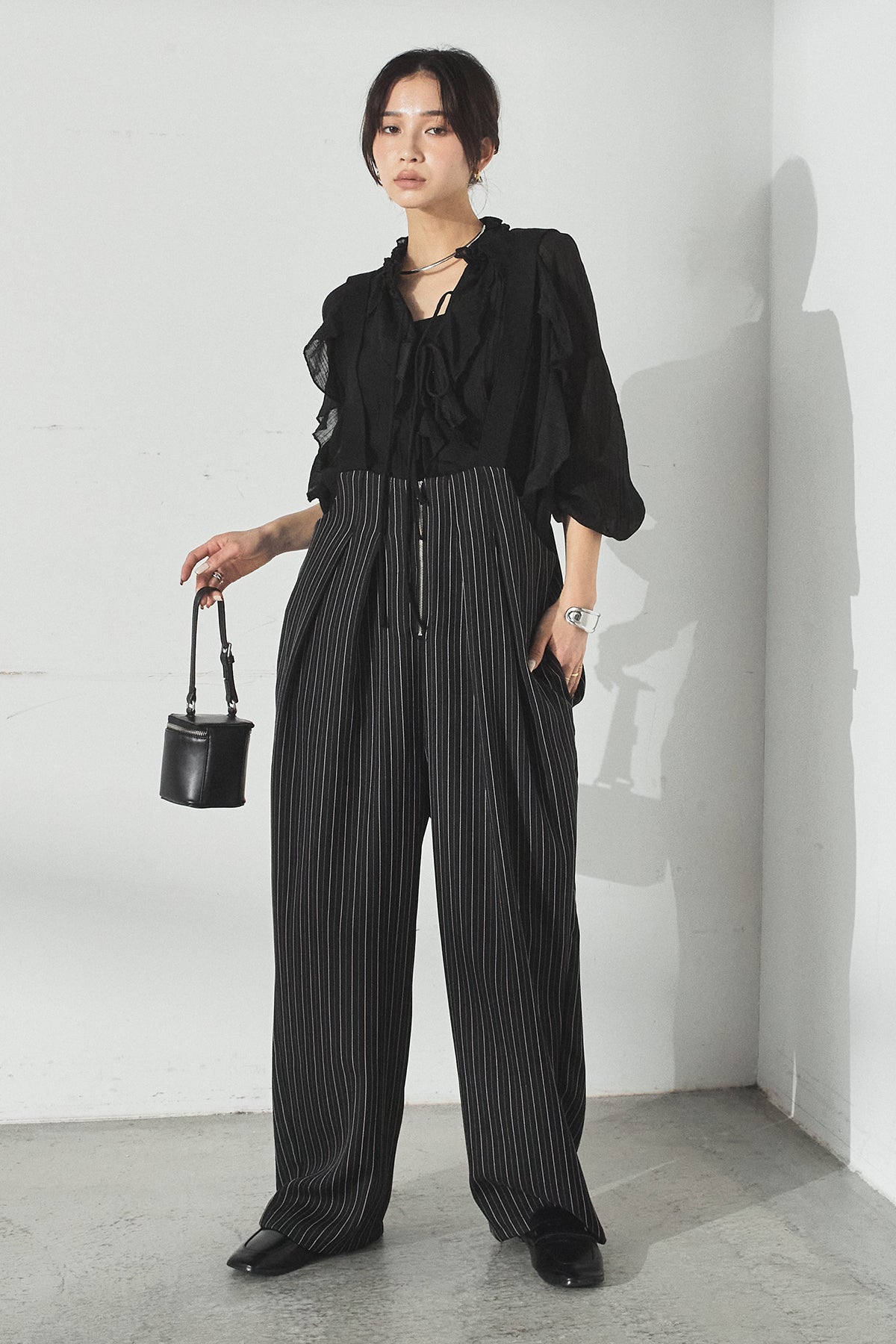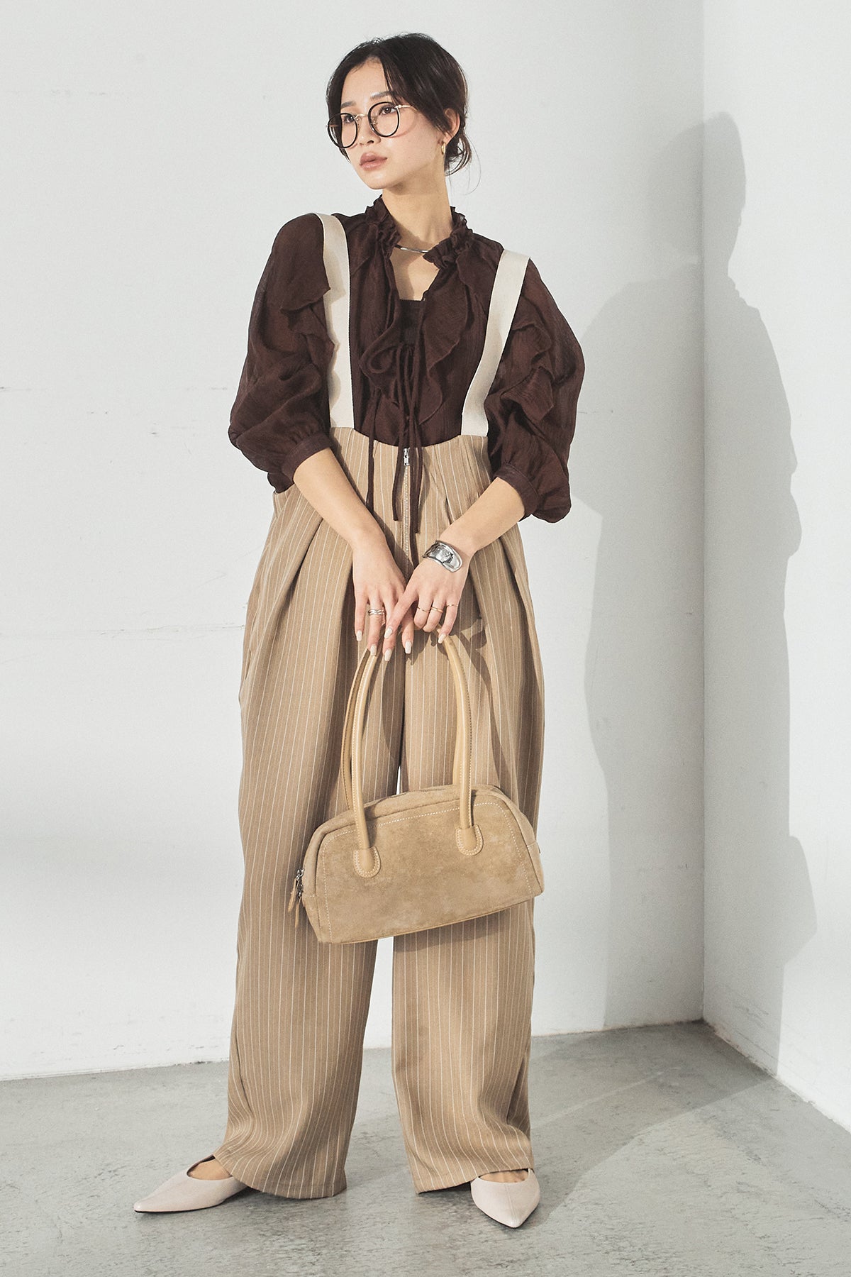 [SET]フロントリボンフリルブラウス+ピンストライプツータックサロペット(2set)