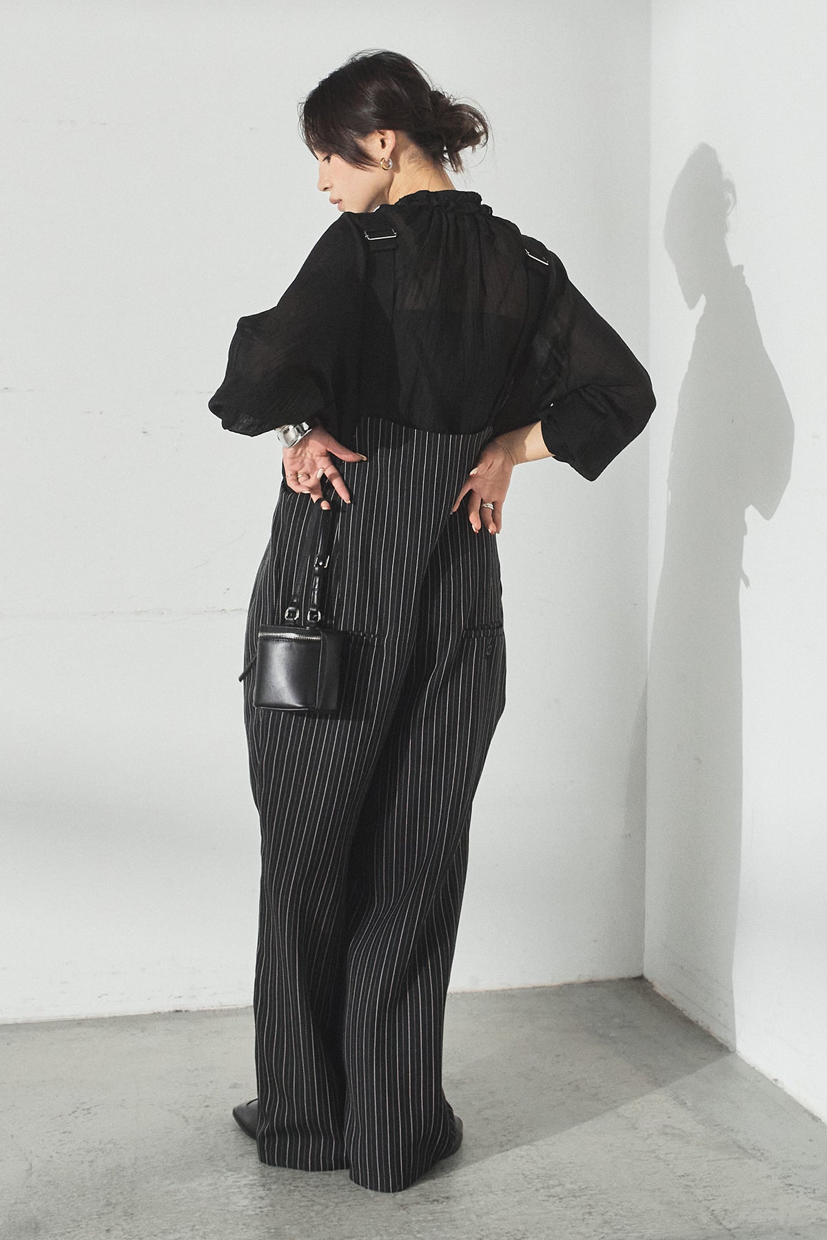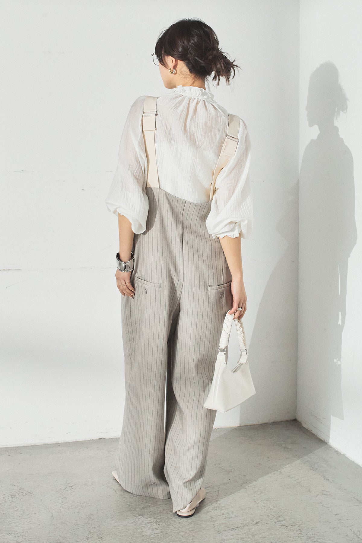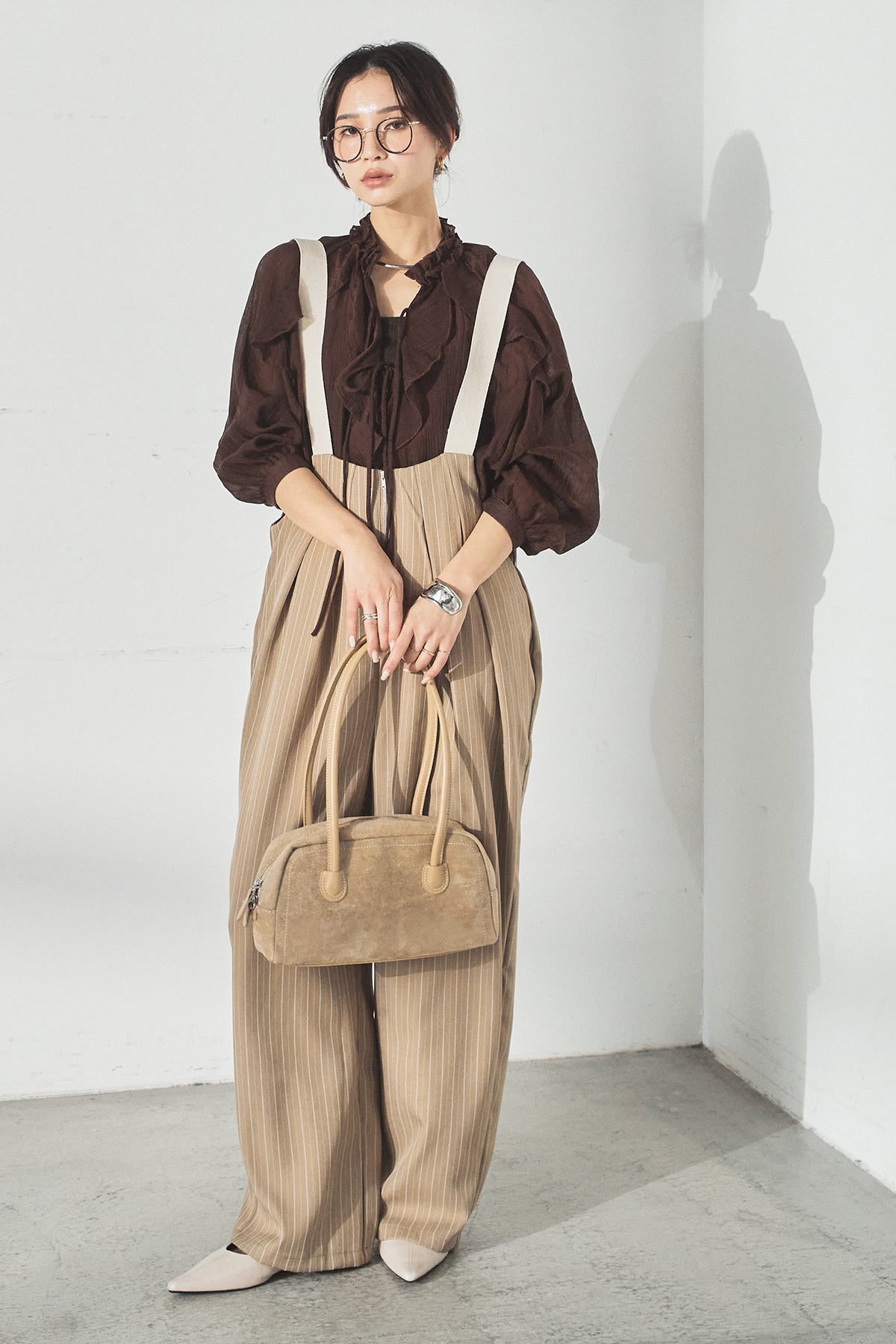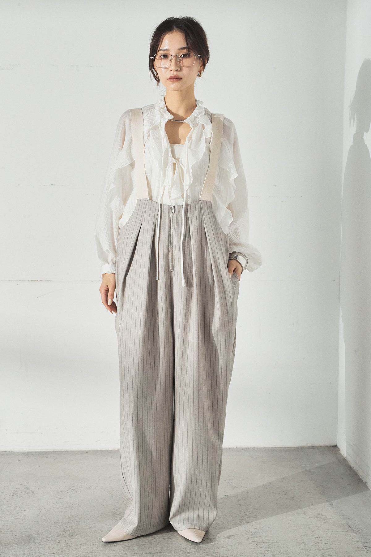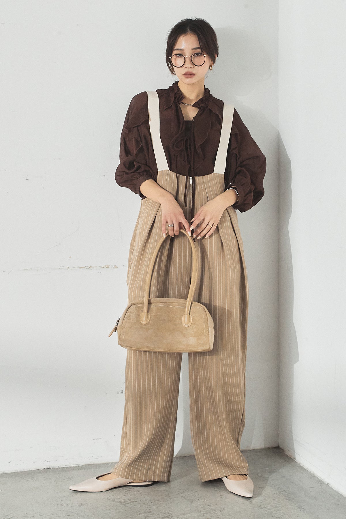 [SET]フロントリボンフリルブラウス+ピンストライプツータックサロペット(2set)