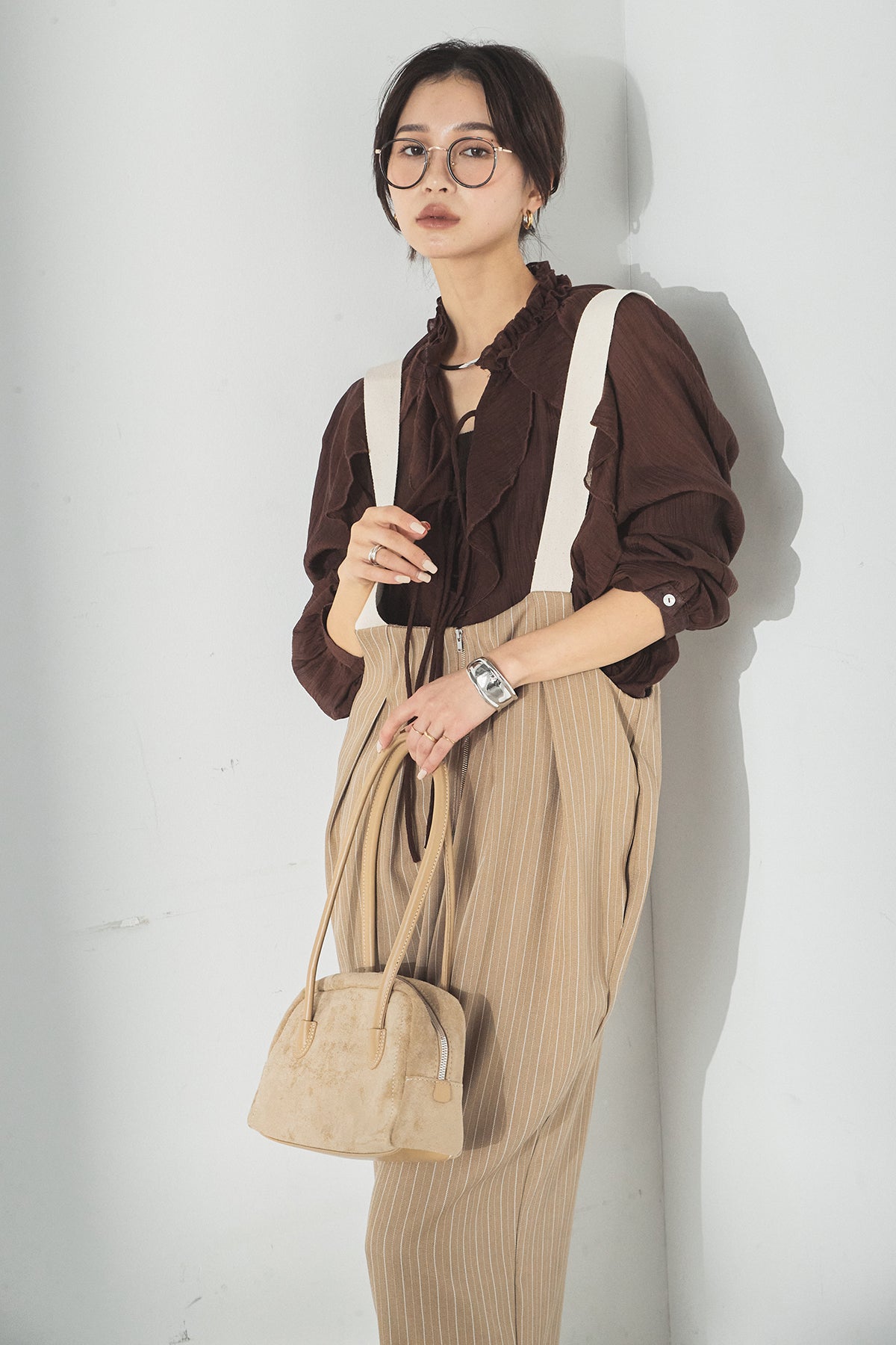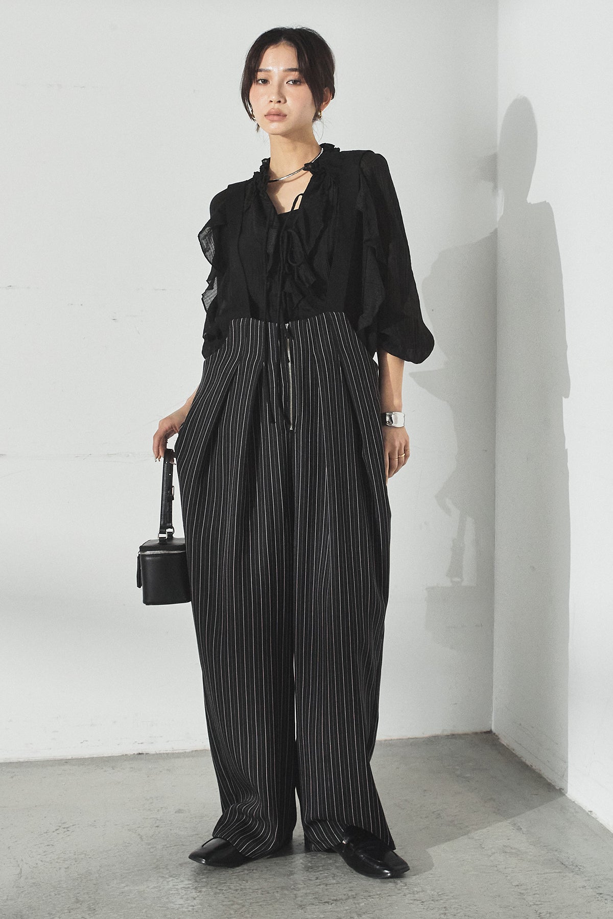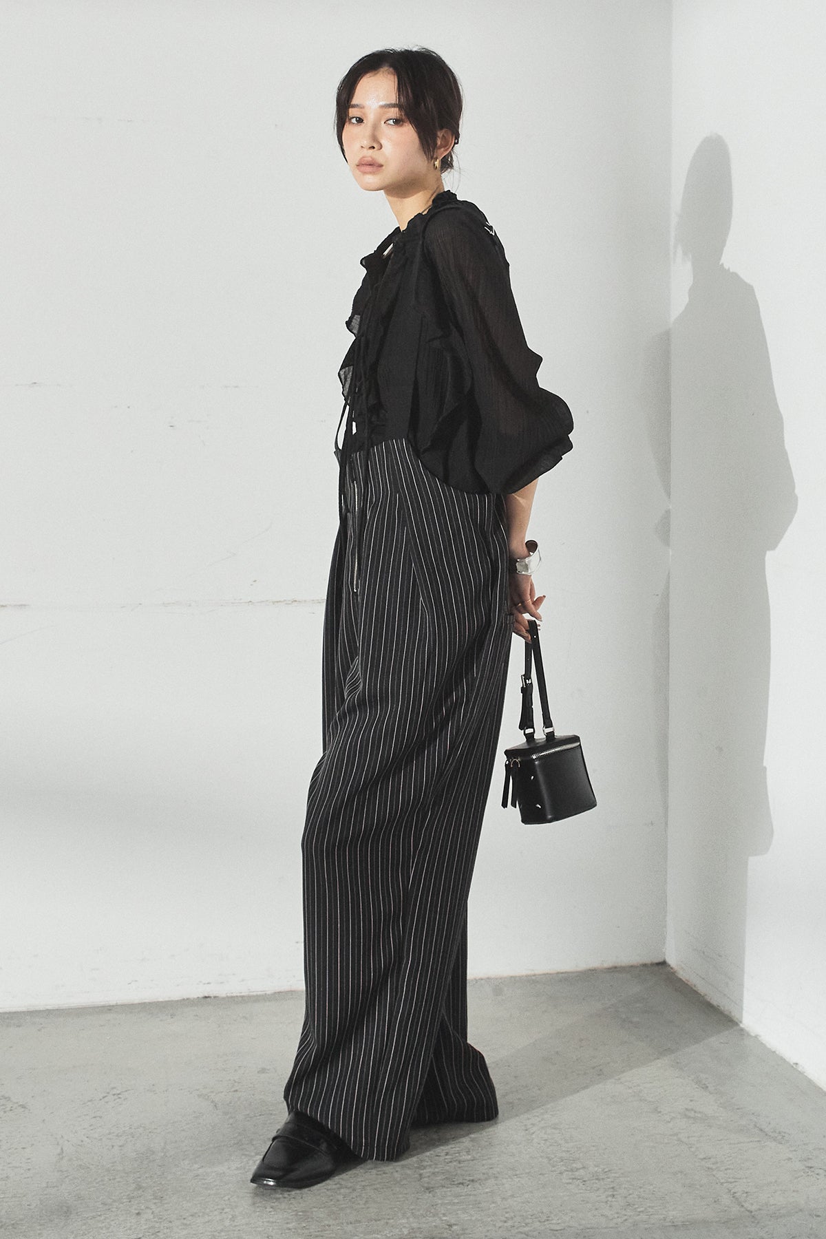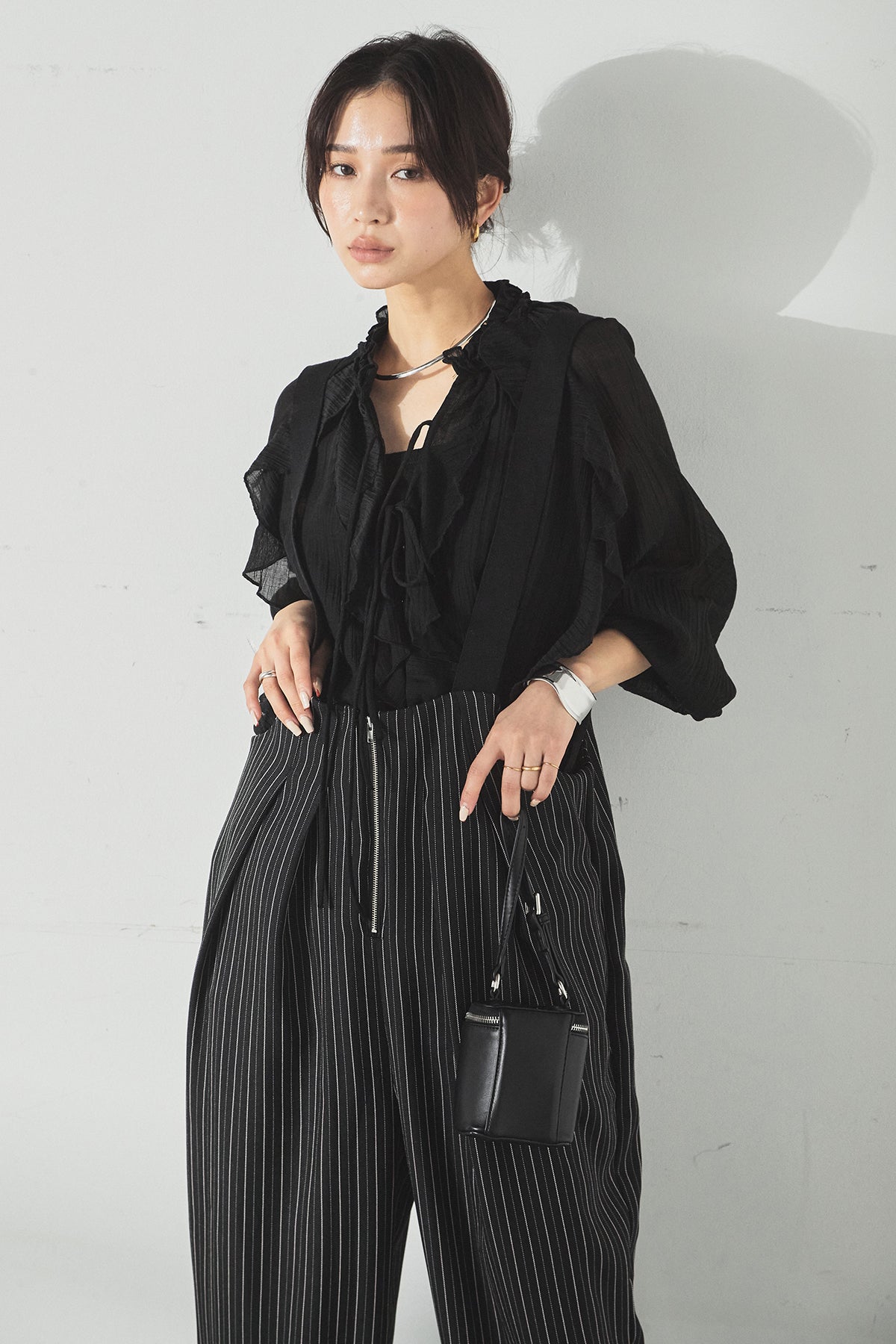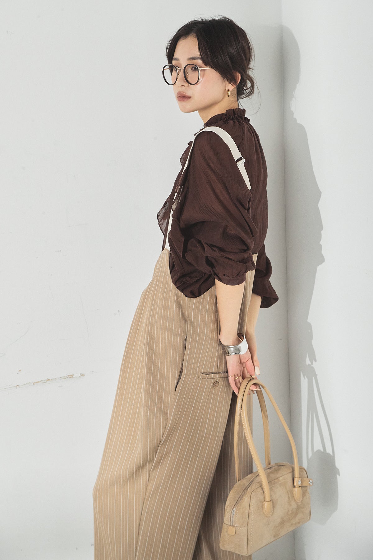 [SET]フロントリボンフリルブラウス+ピンストライプツータックサロペット(2set)