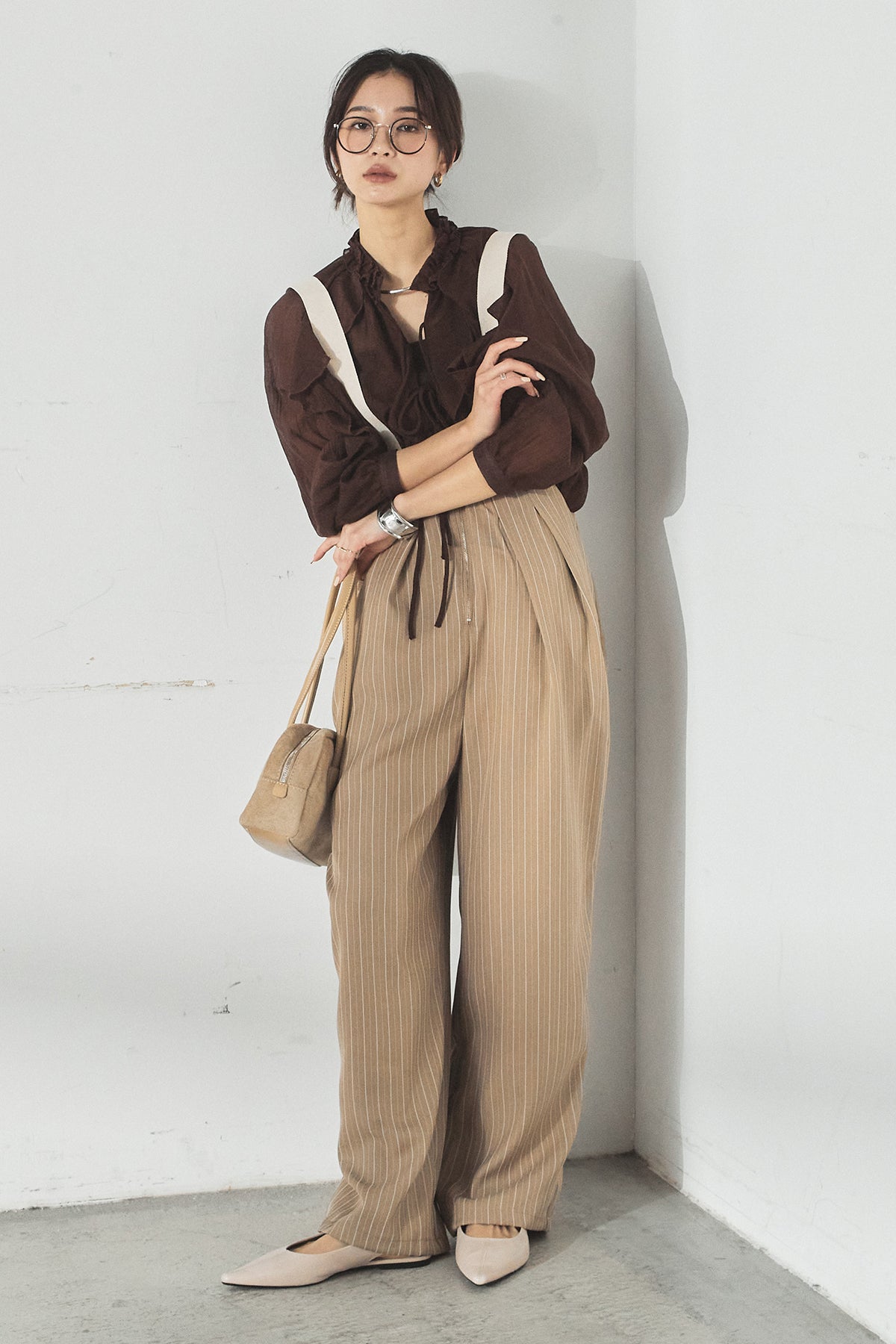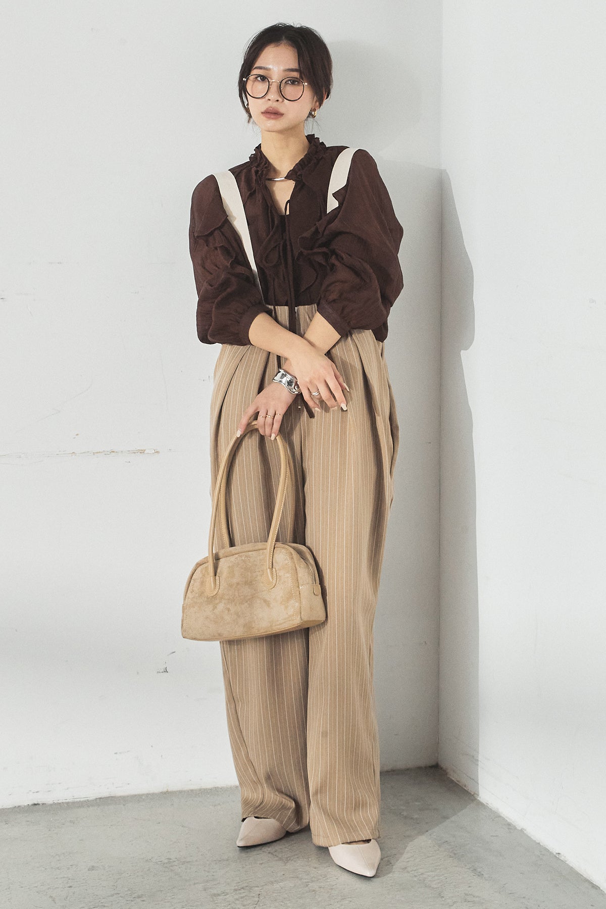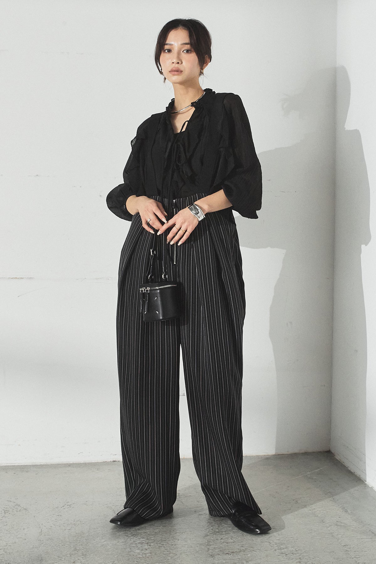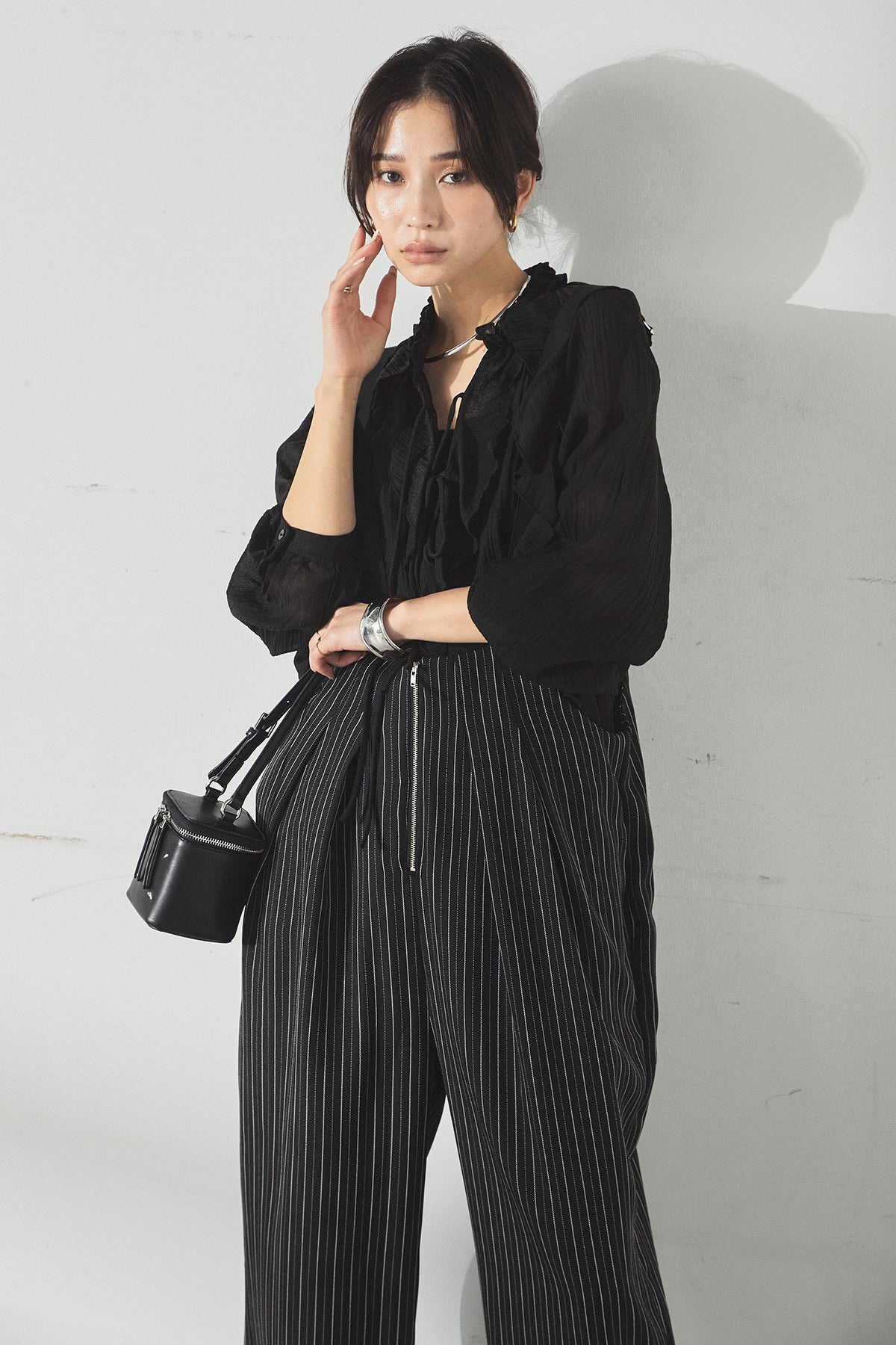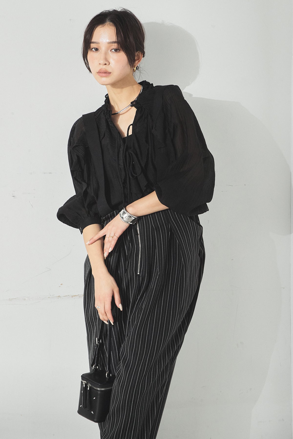 [SET]フロントリボンフリルブラウス+ピンストライプツータックサロペット(2set)