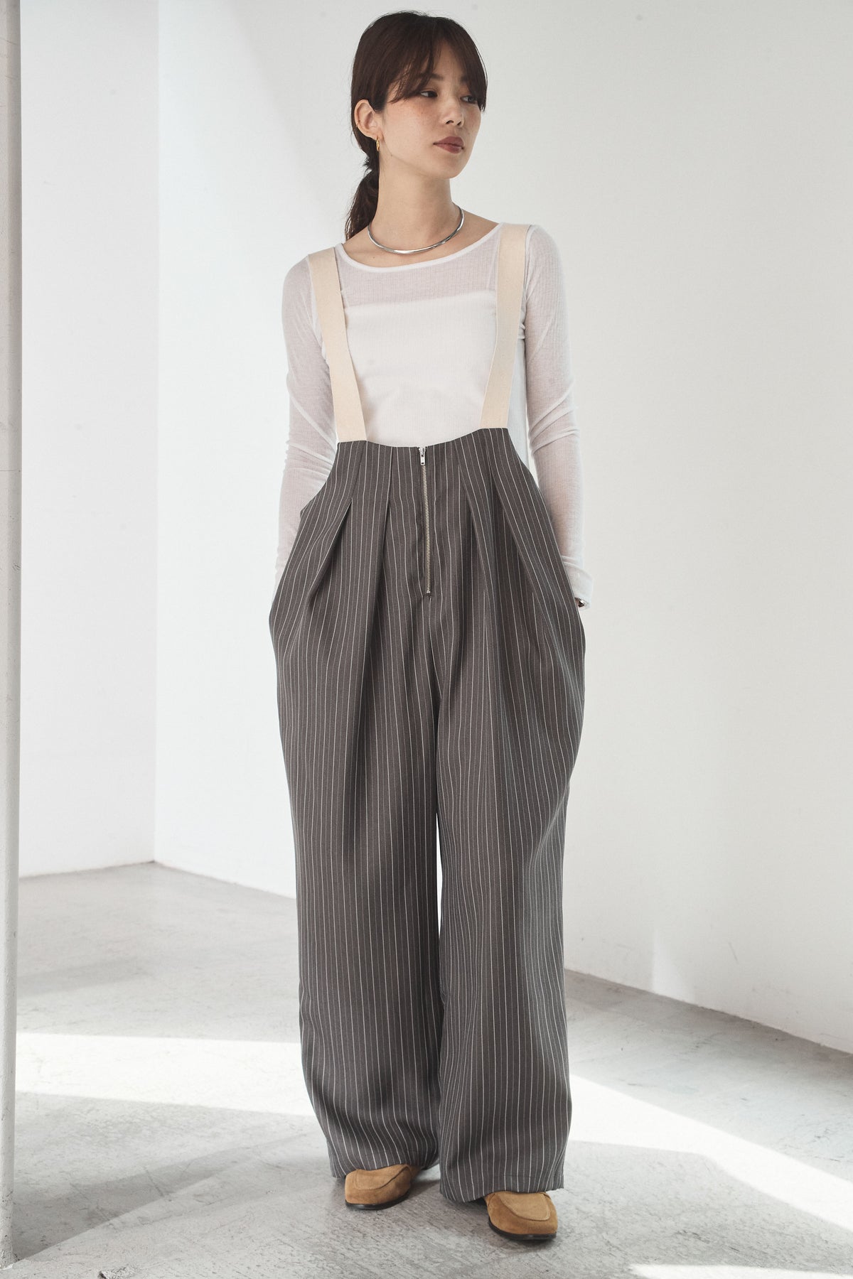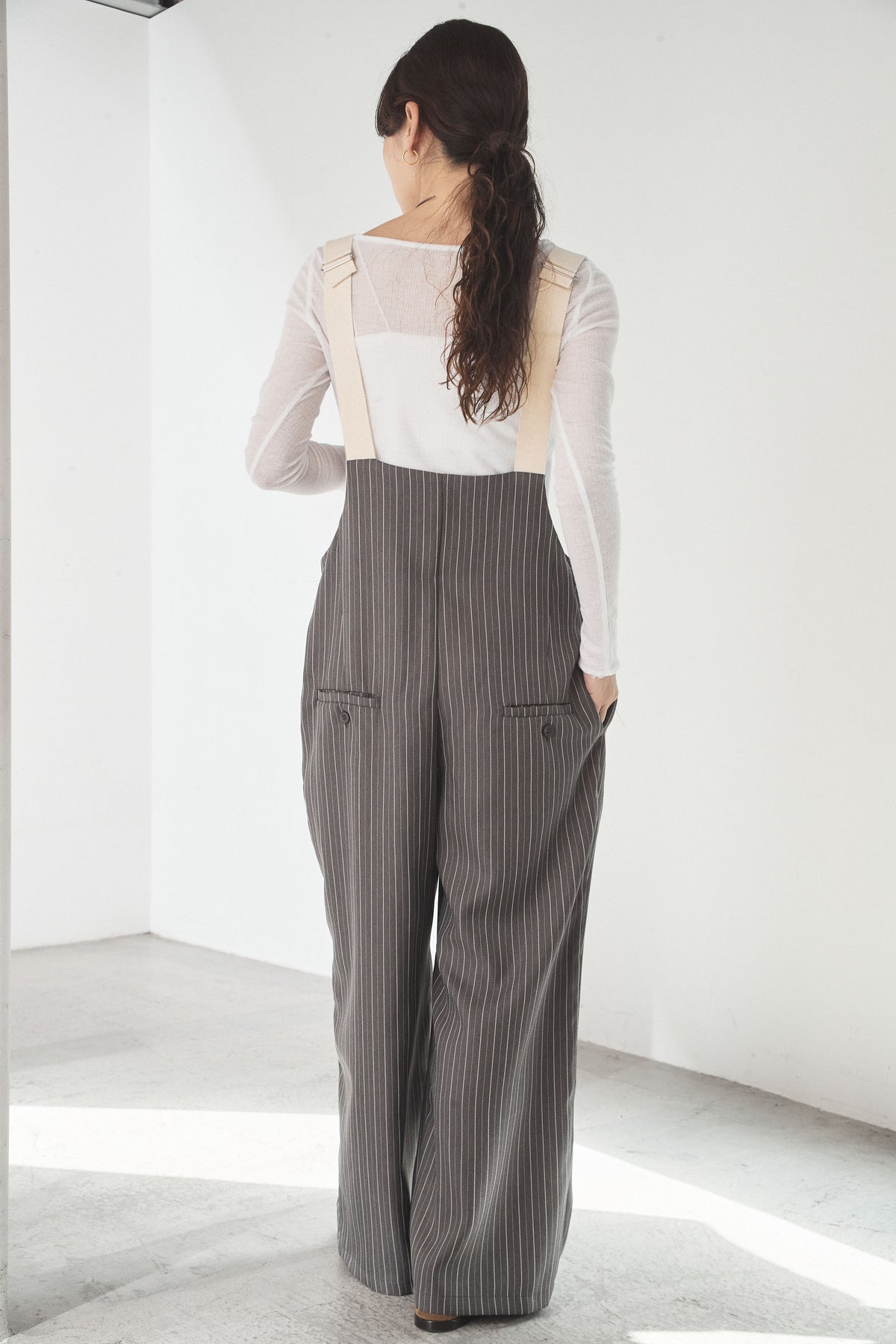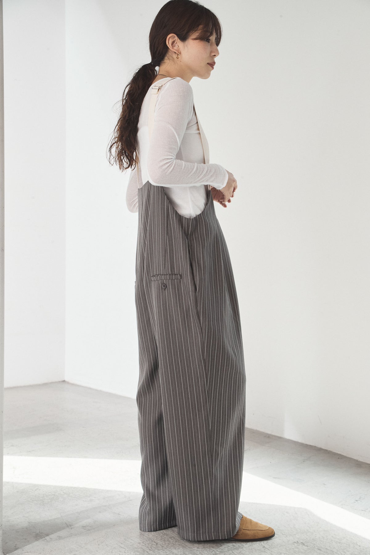ピンストライプ柄が縦のラインを強調する、ツータックデザインのサロペット。フロントに入れた深めのタックが立体感を生み、ゆったりとしたシルエットながらもすっきりとした印象に仕上げます。肩ストラップが程よいアクセントになり、インナー次第で表情を変えられるのも魅力。カジュアルにもきれいめにも合わせやすく、スタイリングの幅が広がる一着です。