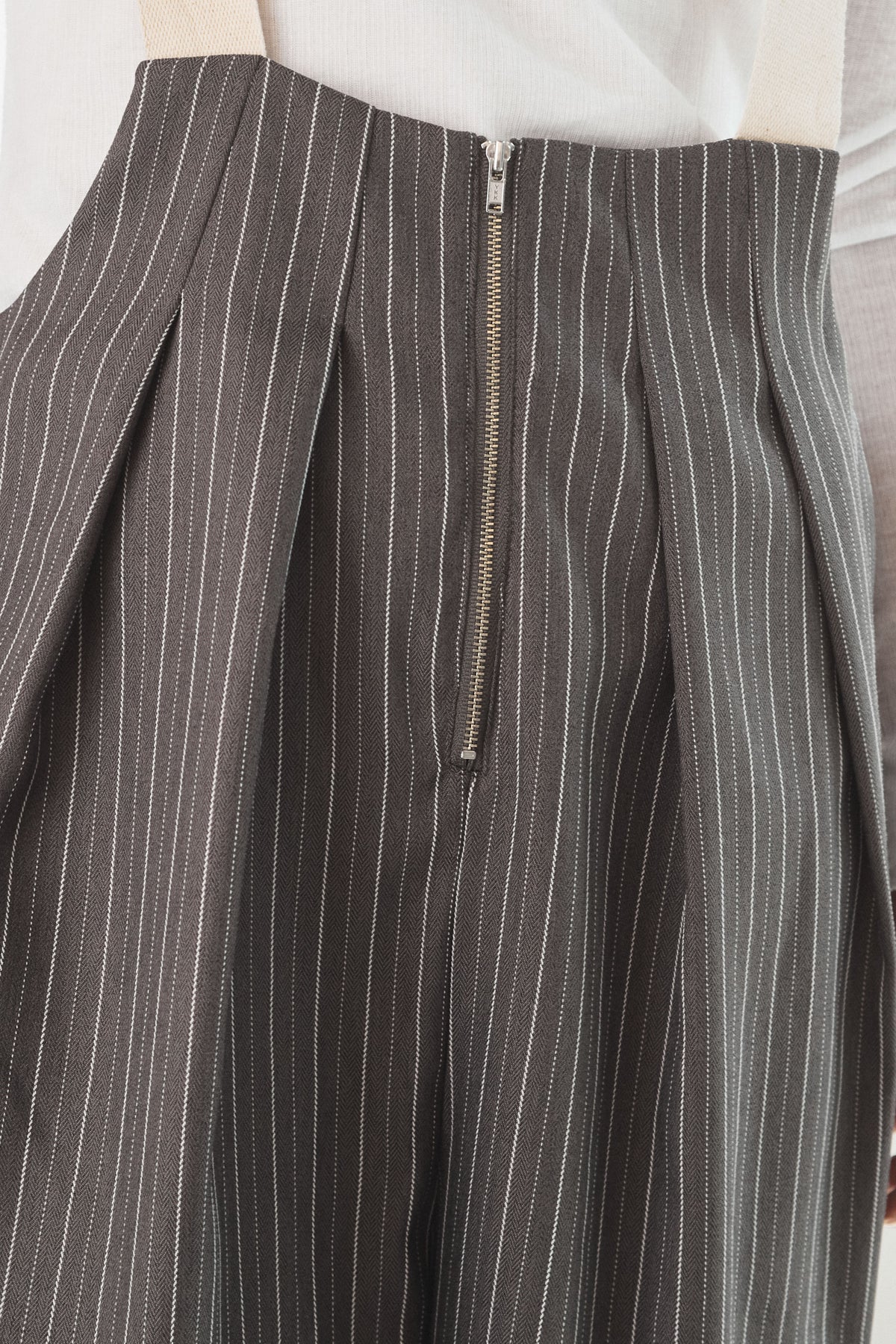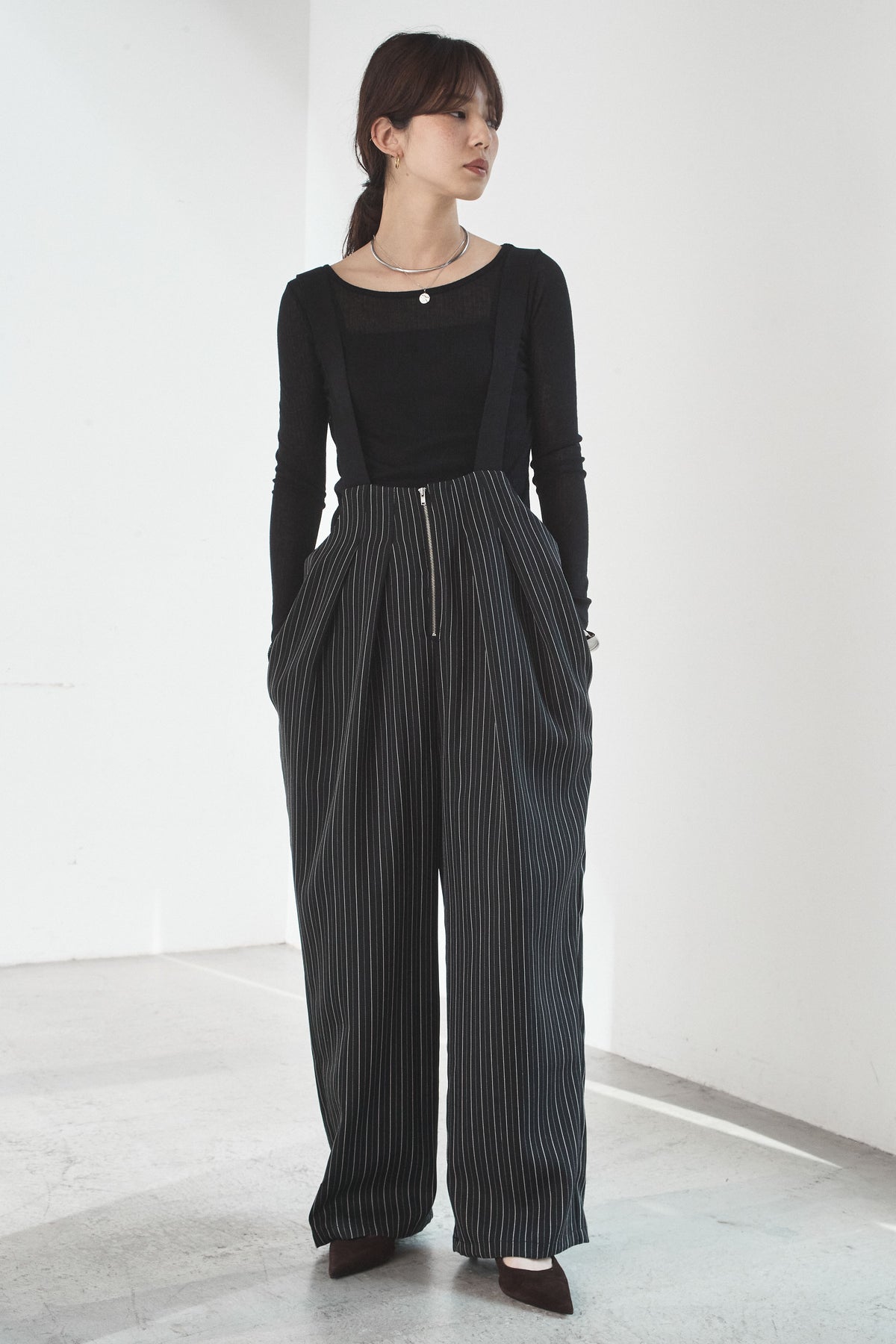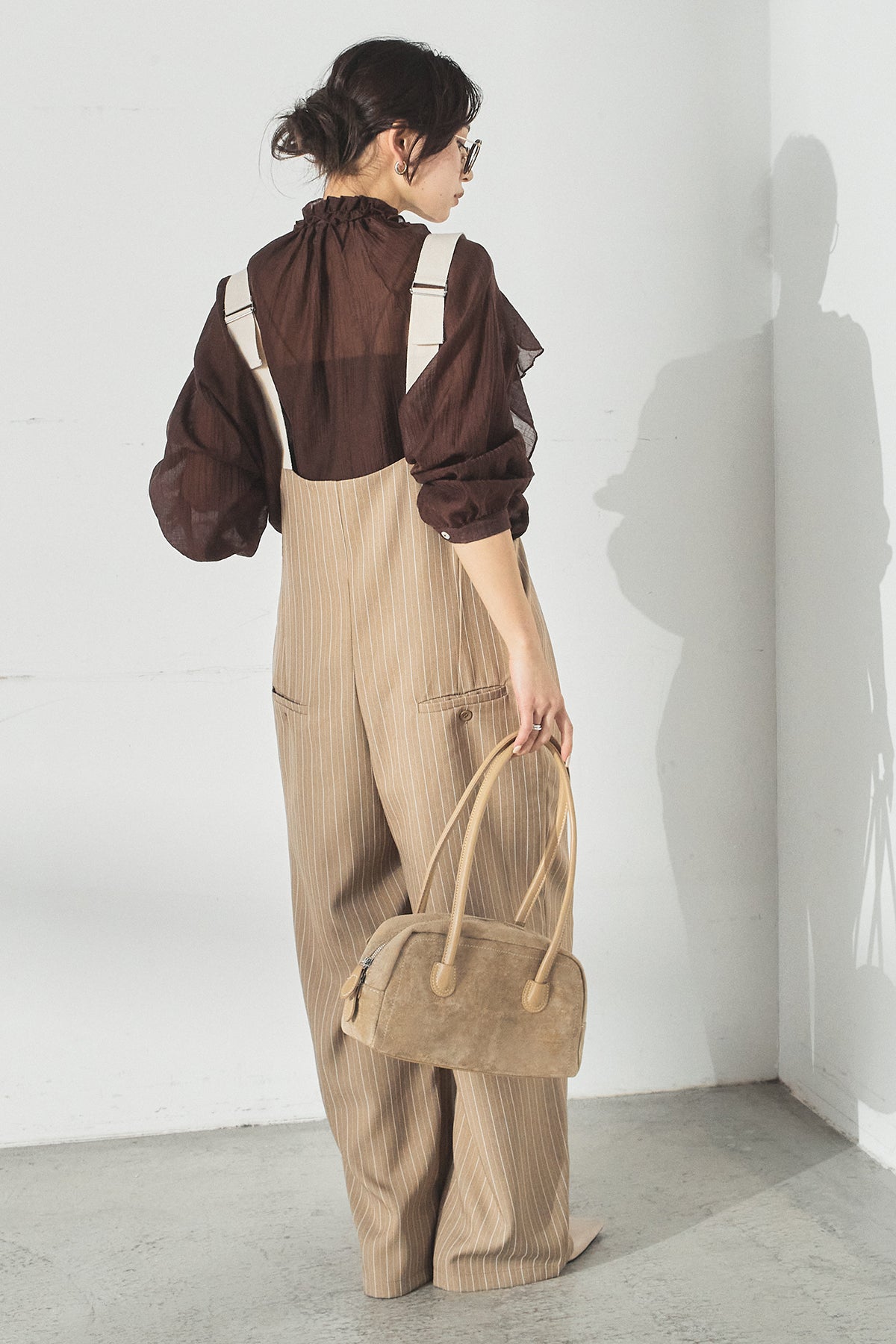 ピンストライプ柄が縦のラインを強調する、ツータックデザインのサロペット。フロントに入れた深めのタックが立体感を生み、ゆったりとしたシルエットながらもすっきりとした印象に仕上げます。肩ストラップが程よいアクセントになり、インナー次第で表情を変えられるのも魅力。カジュアルにもきれいめにも合わせやすく、スタイリングの幅が広がる一着です。