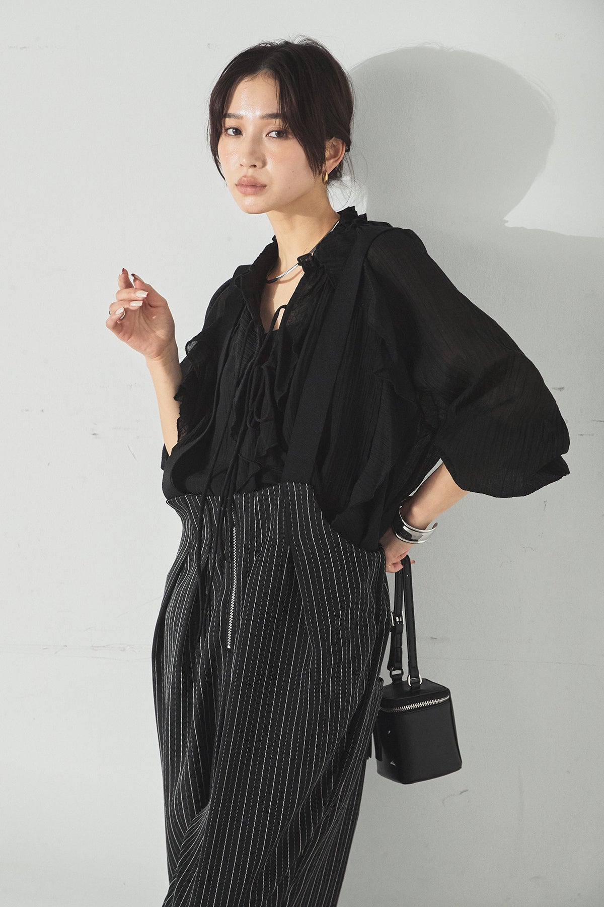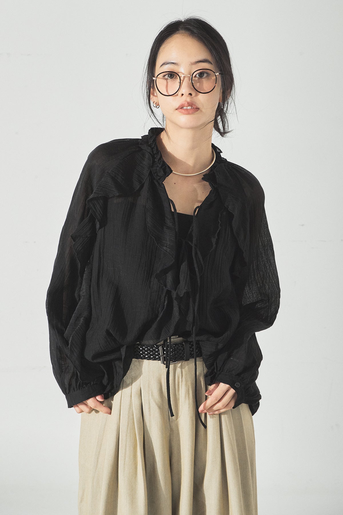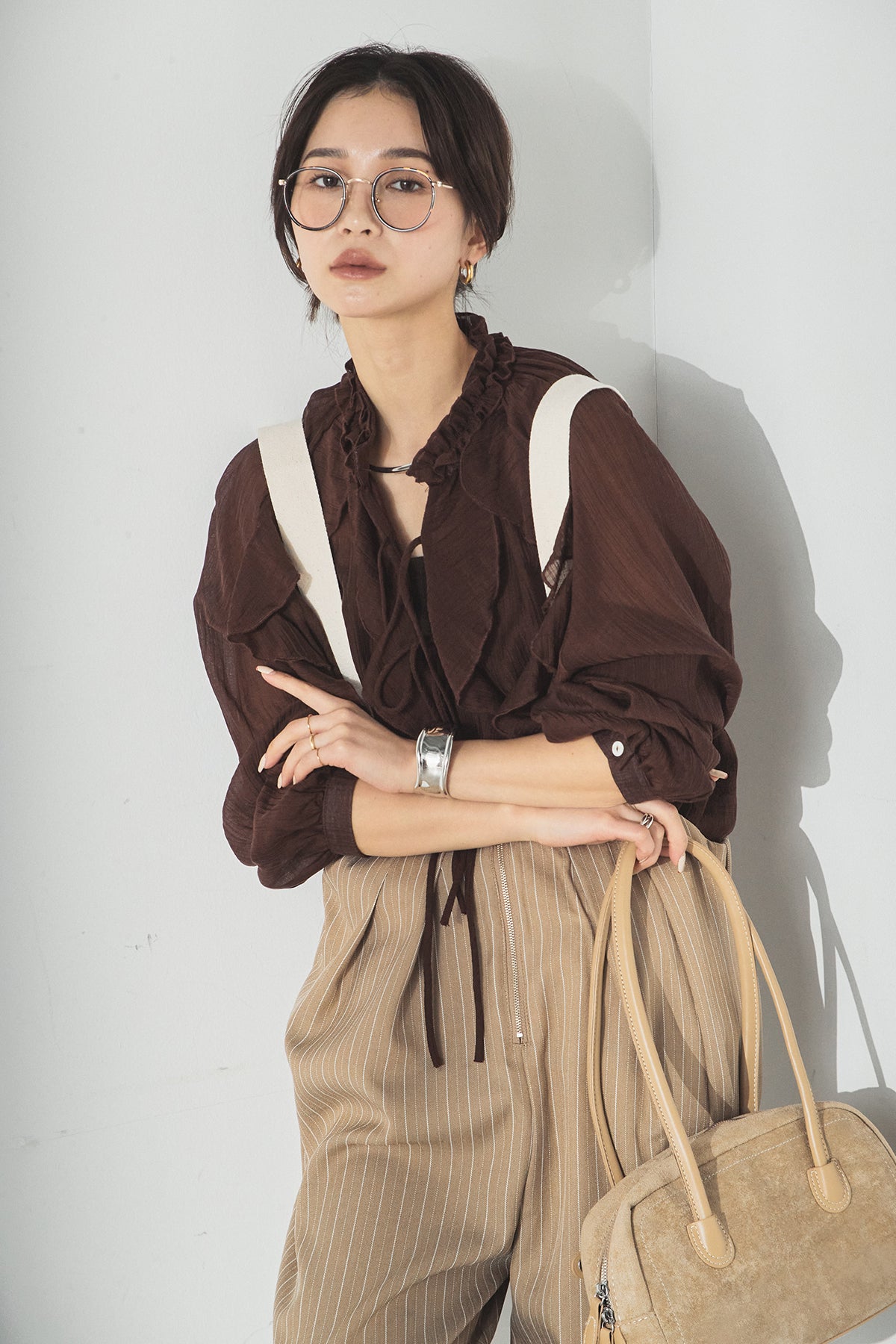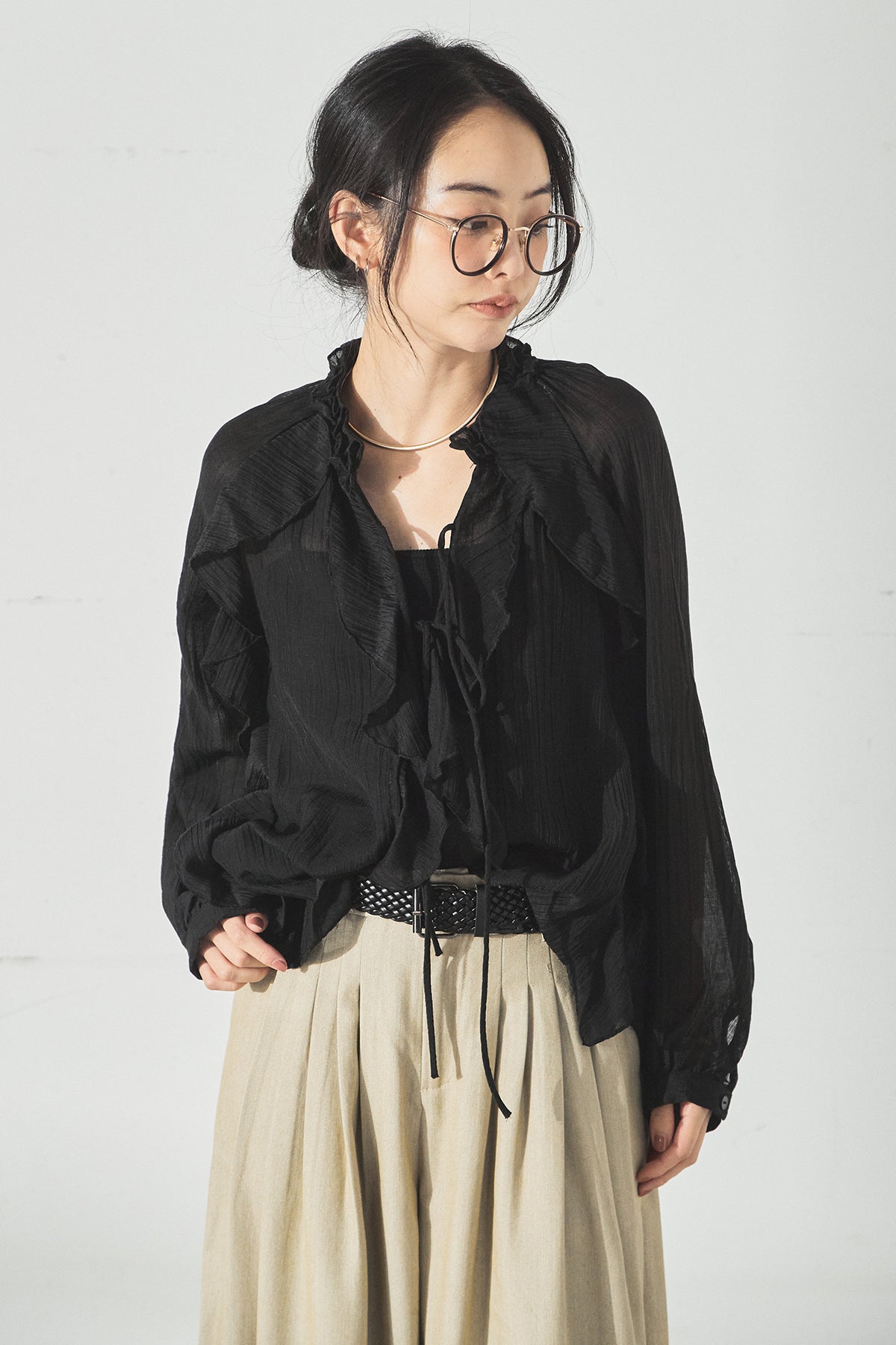 フロントにあしらったリボンとフリルが印象的なデザインブラウス。軽やかな素材感と透け感のある表情が、動くたびに柔らかなニュアンスを演出します。程よくゆとりのあるシルエットで、甘さを抑えつつ大人っぽいバランスに。シンプルなボトムと合わせるだけでスタイリングが決まり、コーディネートにさりげない華やかさを添える一枚です。