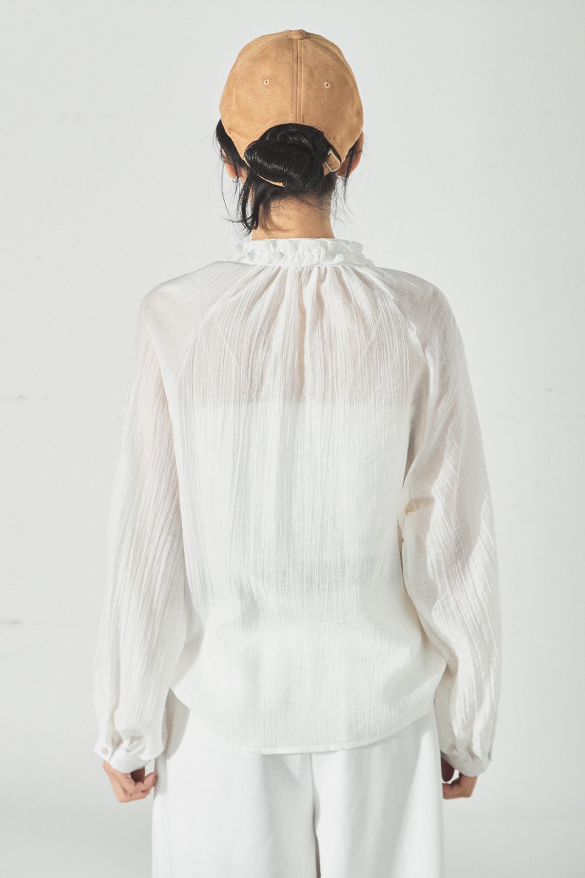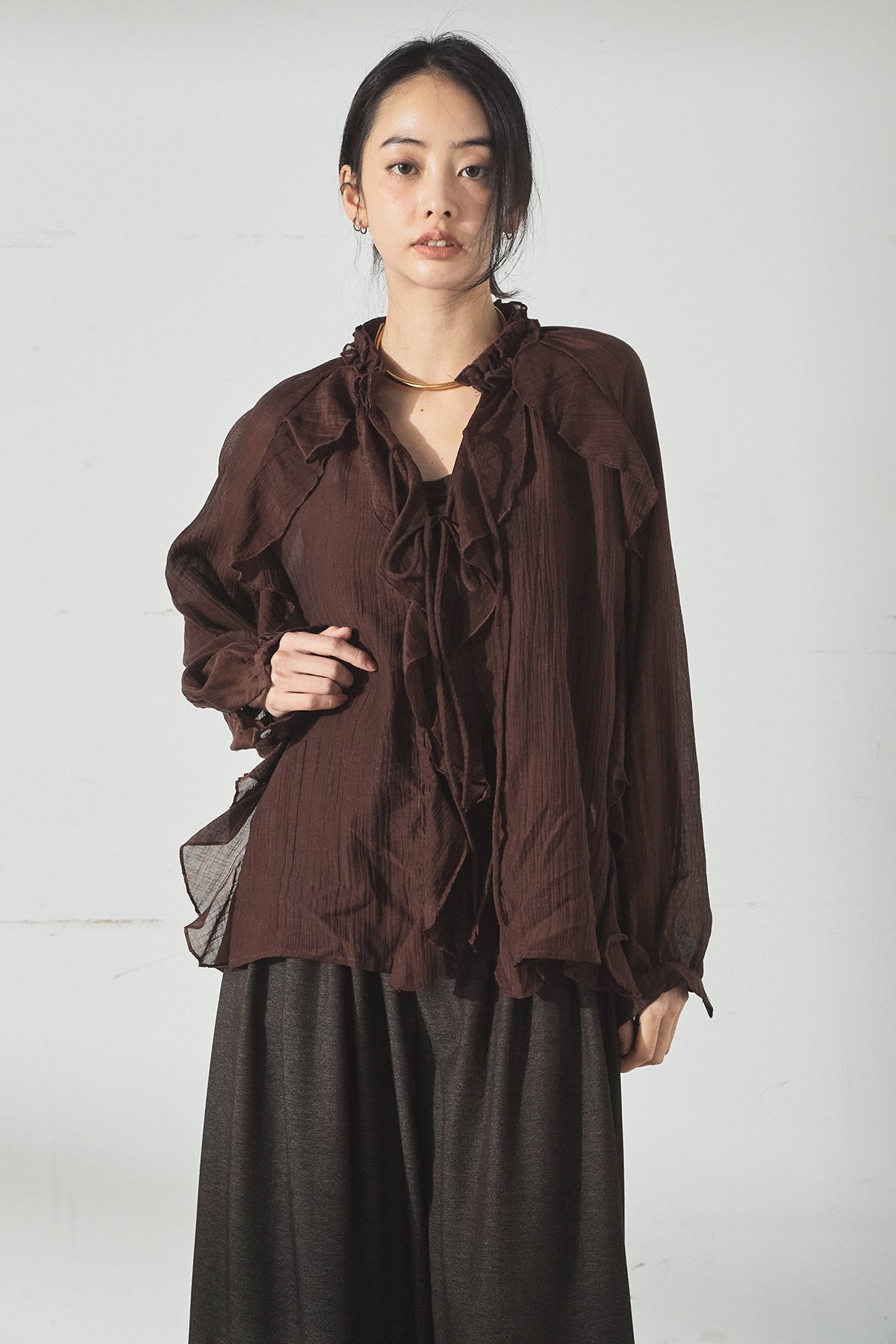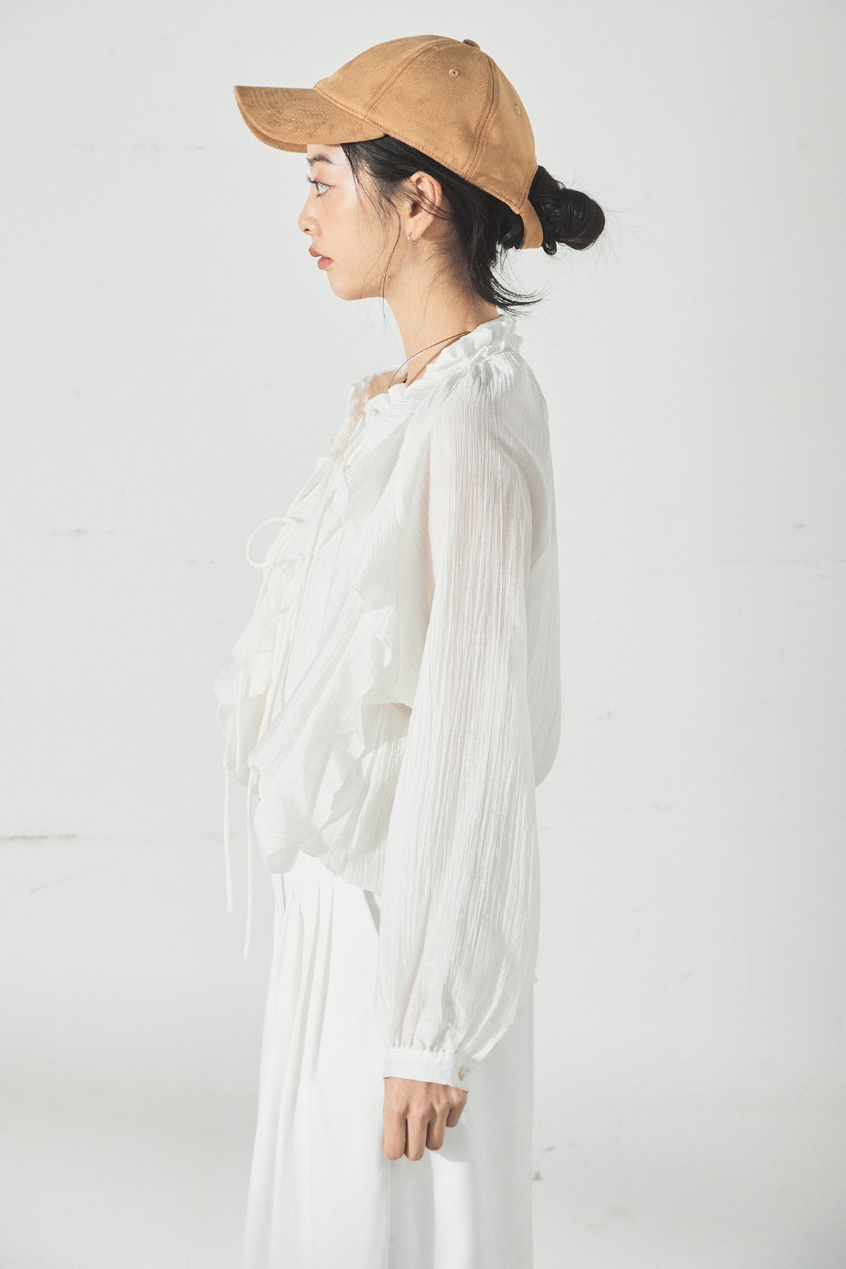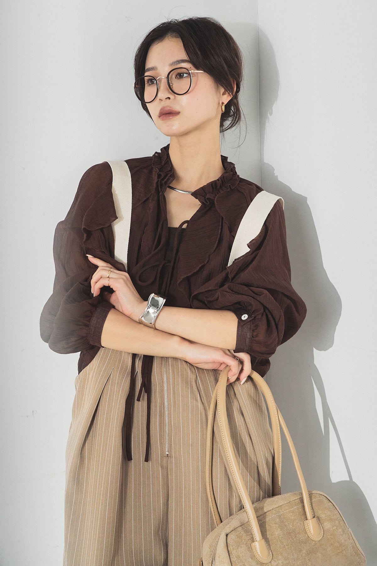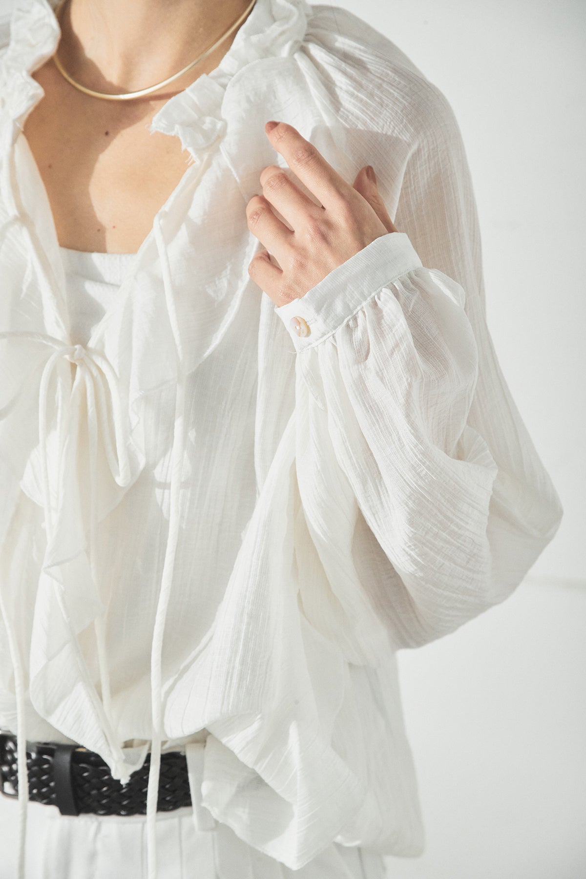 フロントにあしらったリボンとフリルが印象的なデザインブラウス。軽やかな素材感と透け感のある表情が、動くたびに柔らかなニュアンスを演出します。程よくゆとりのあるシルエットで、甘さを抑えつつ大人っぽいバランスに。シンプルなボトムと合わせるだけでスタイリングが決まり、コーディネートにさりげない華やかさを添える一枚です。