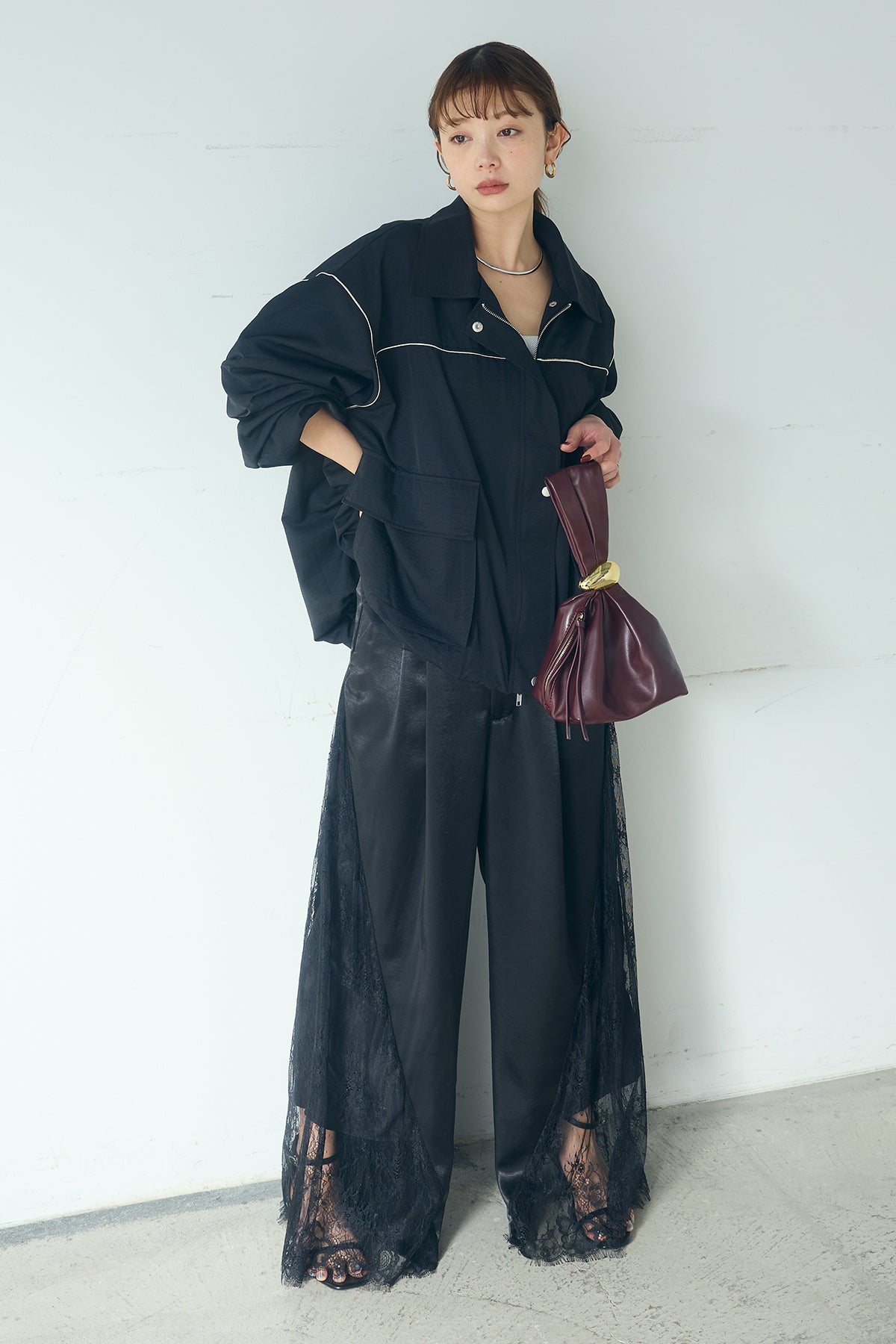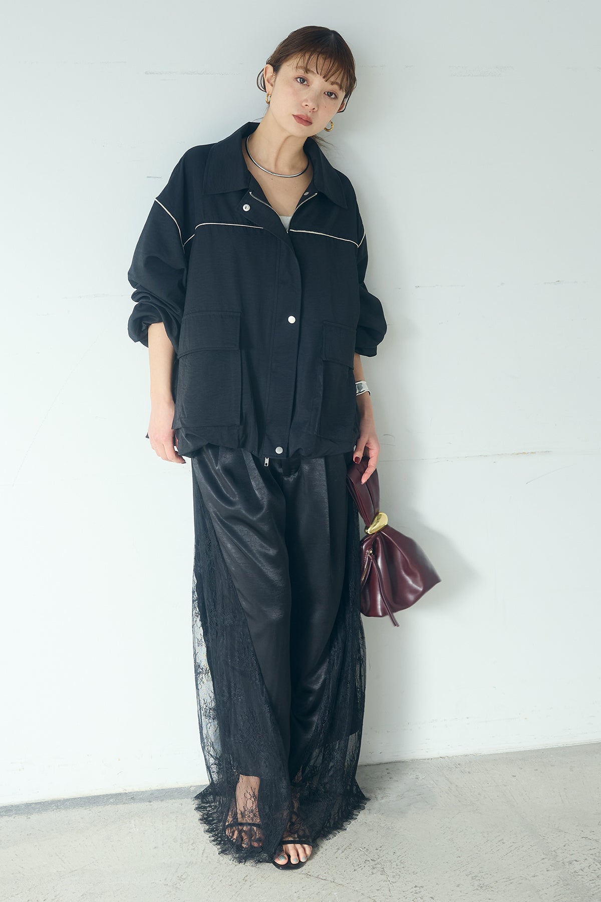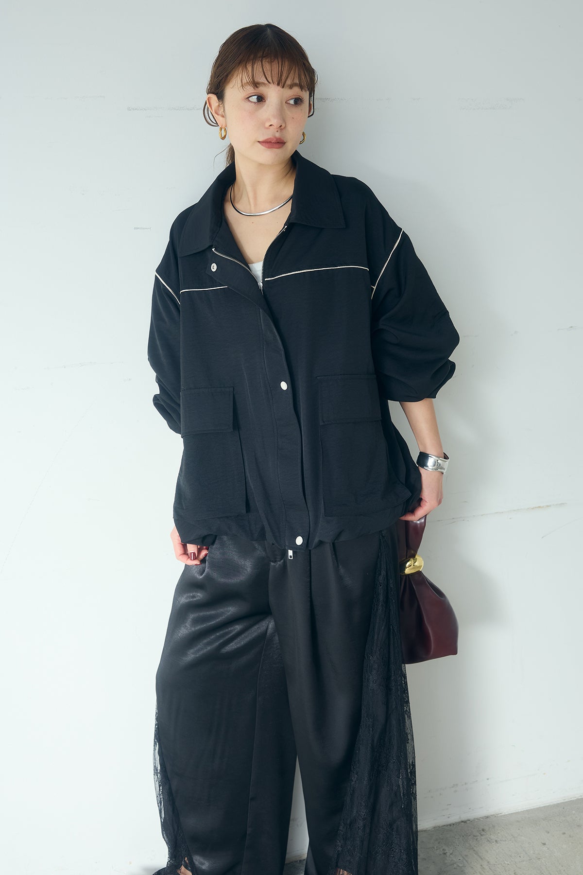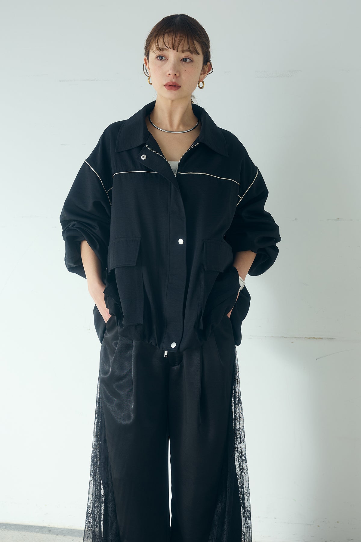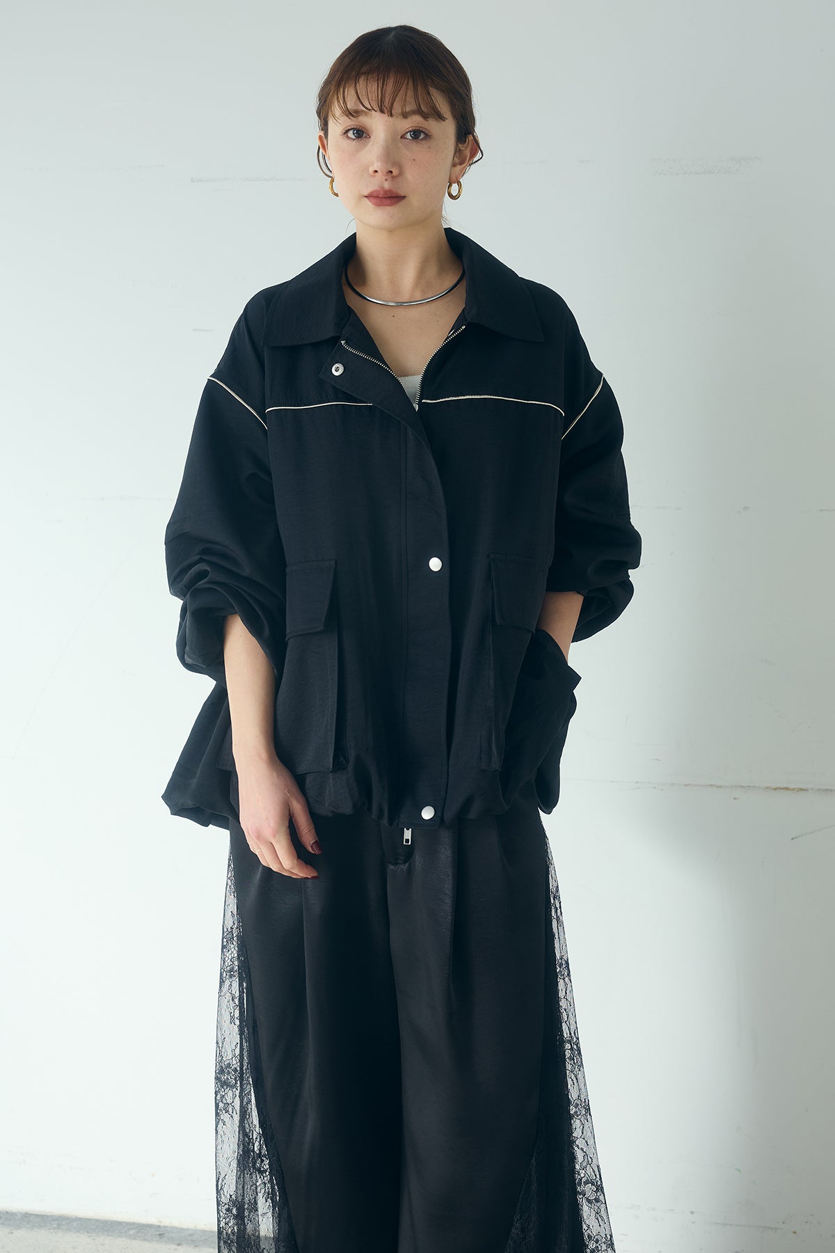 [SET]合繊ツイルバルーンジャケット+サテンレース切り替えタックパンツ(2set)