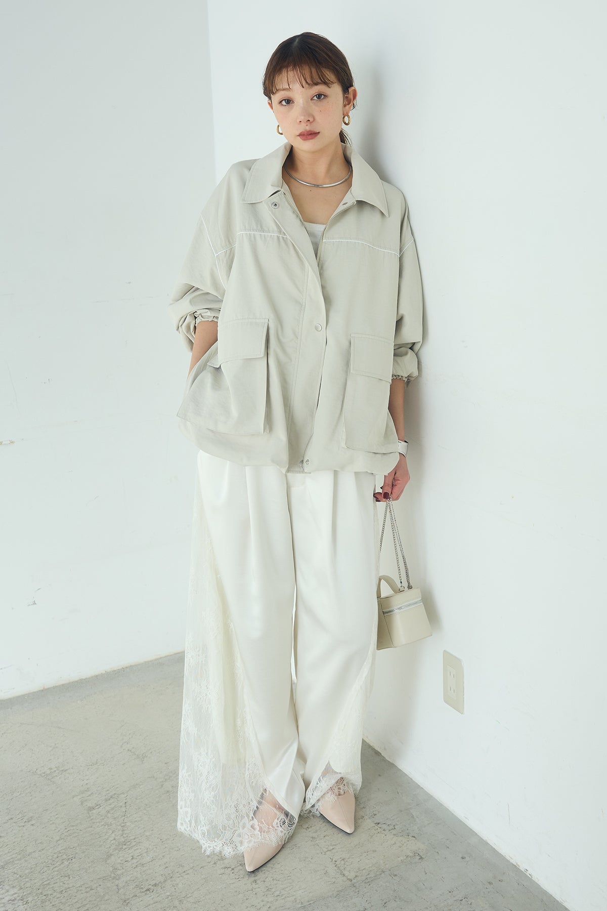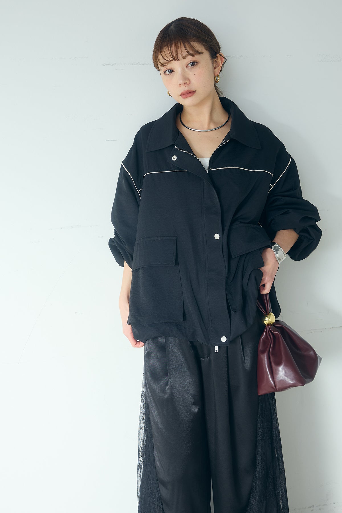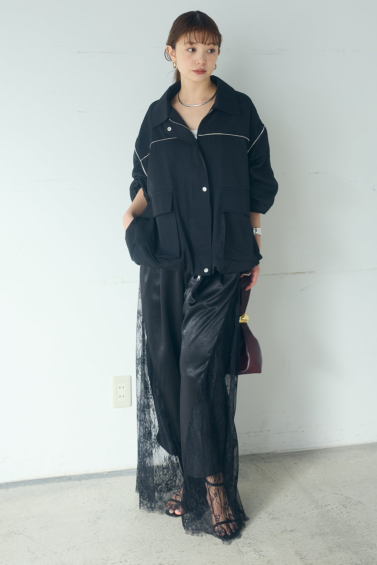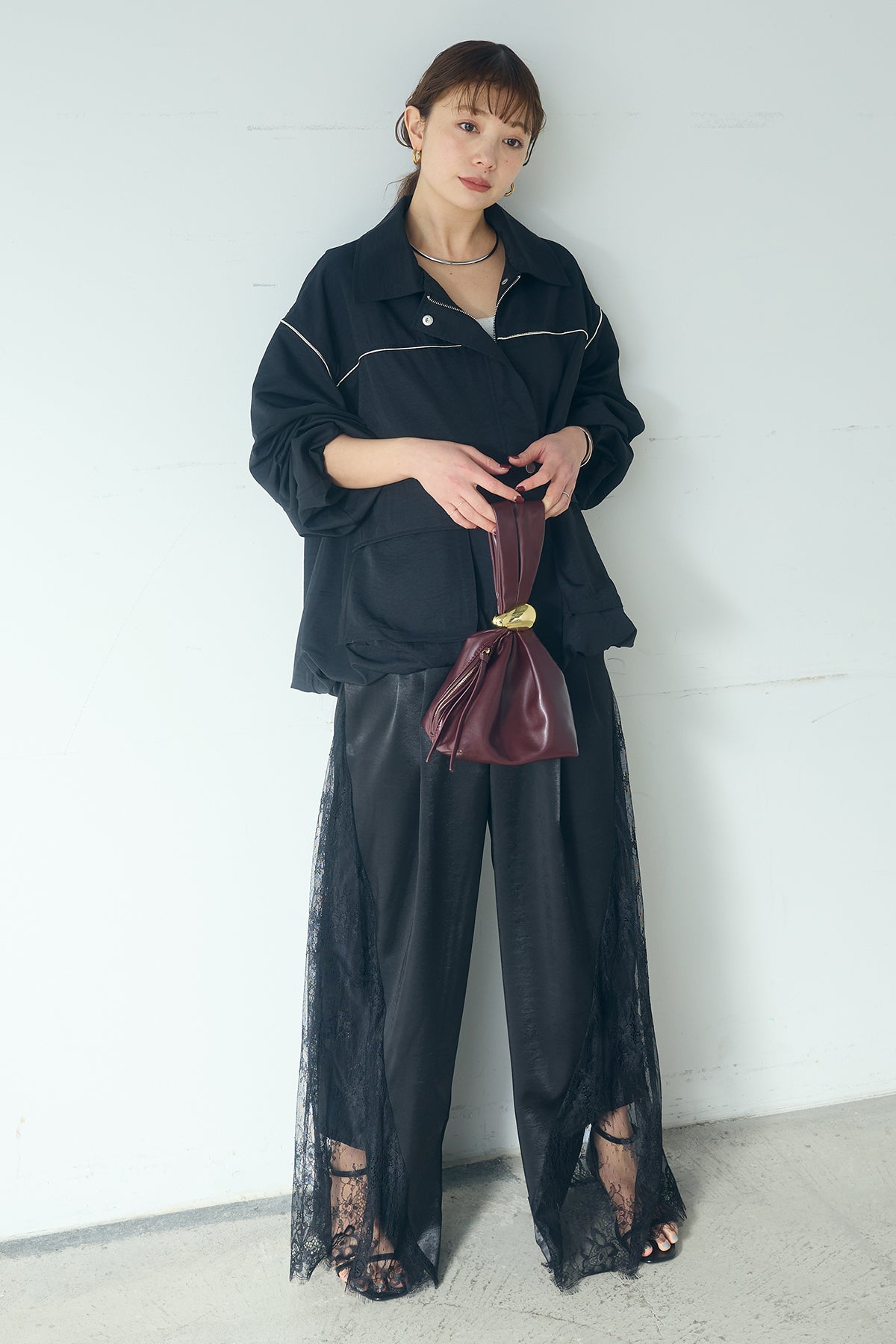 [SET]合繊ツイルバルーンジャケット+サテンレース切り替えタックパンツ(2set)