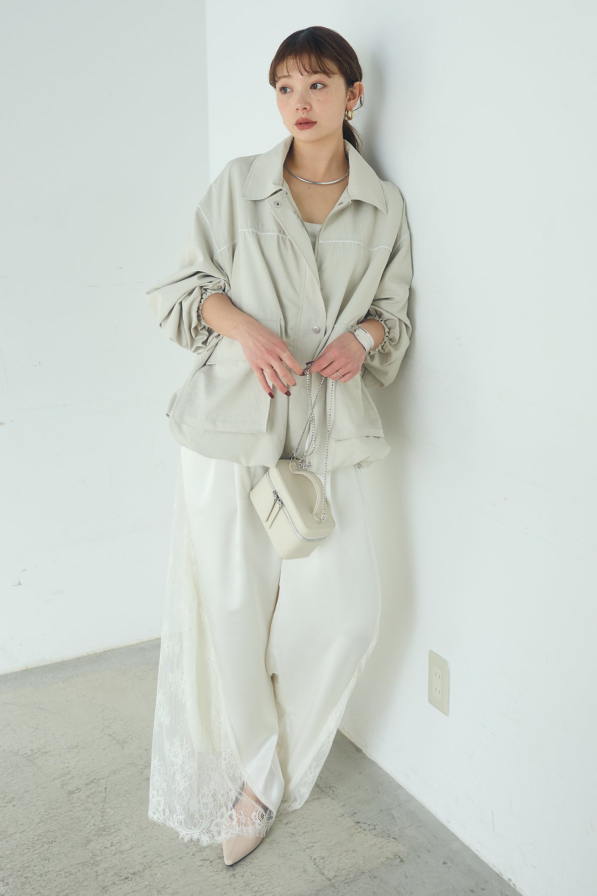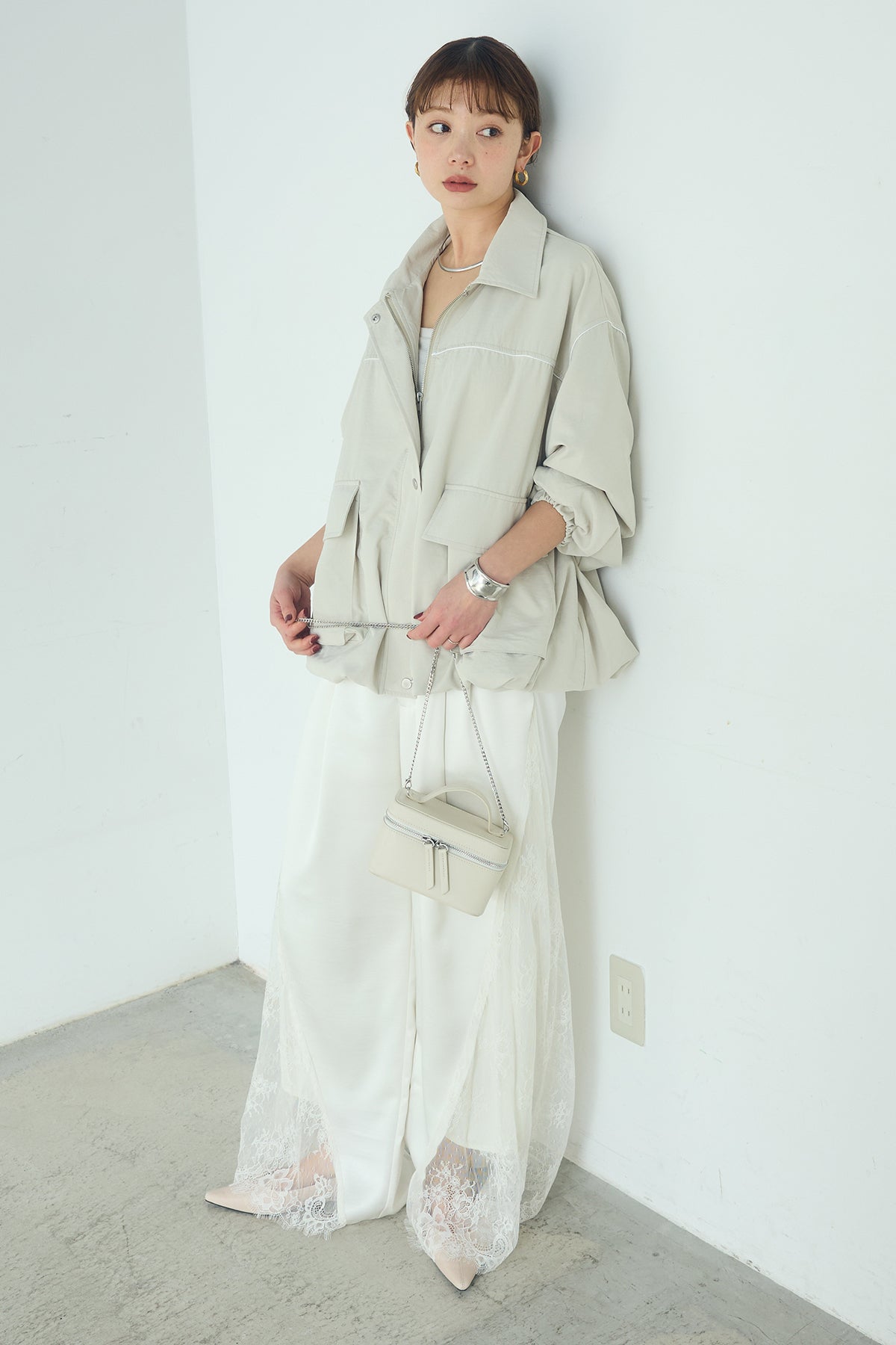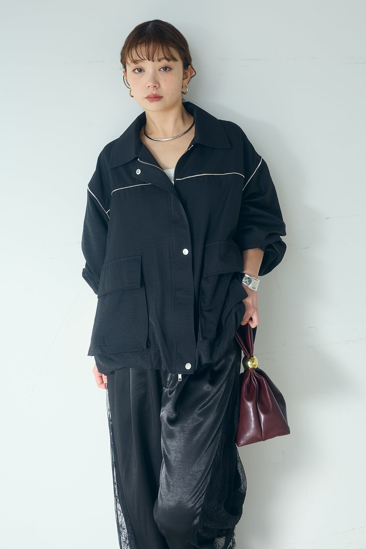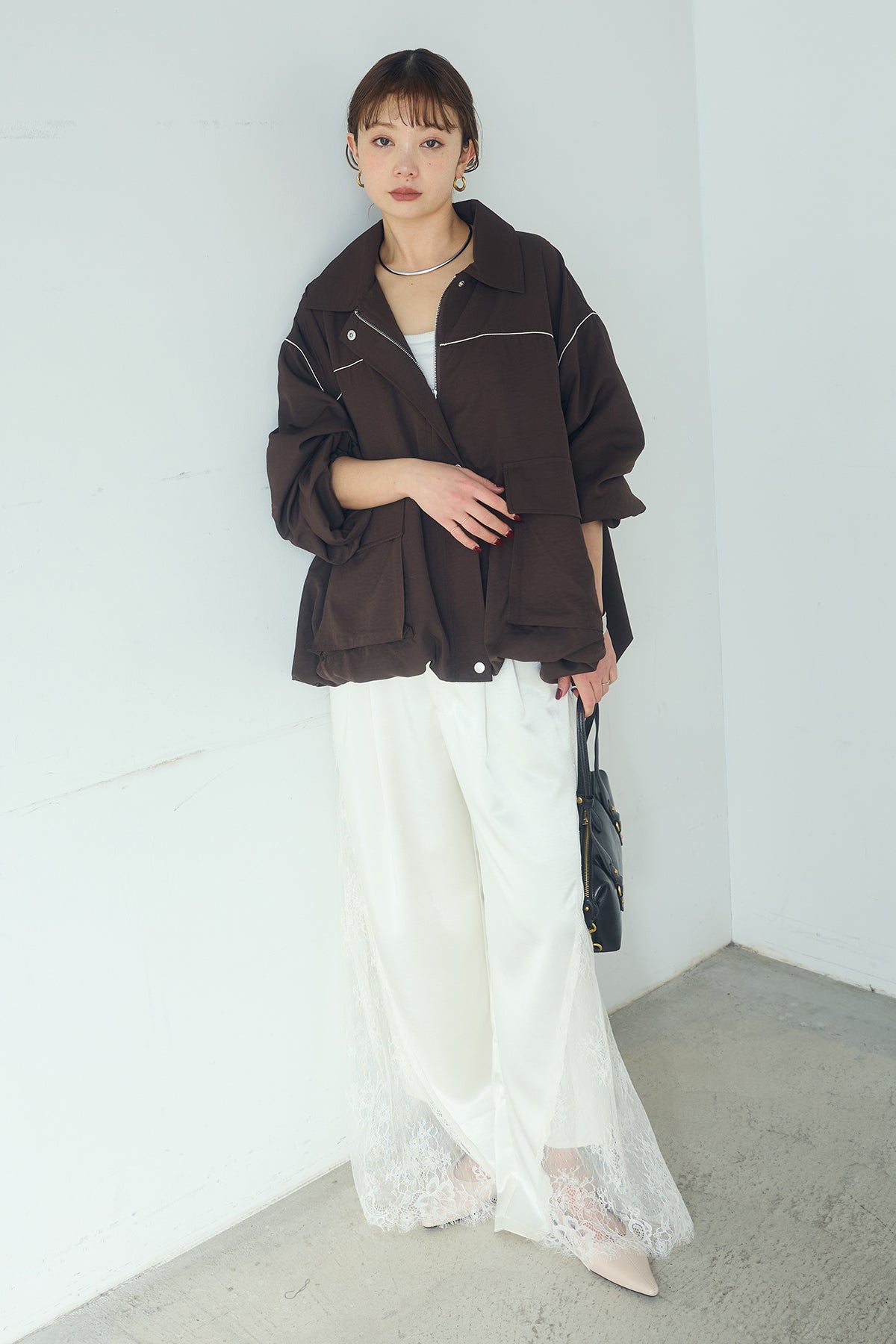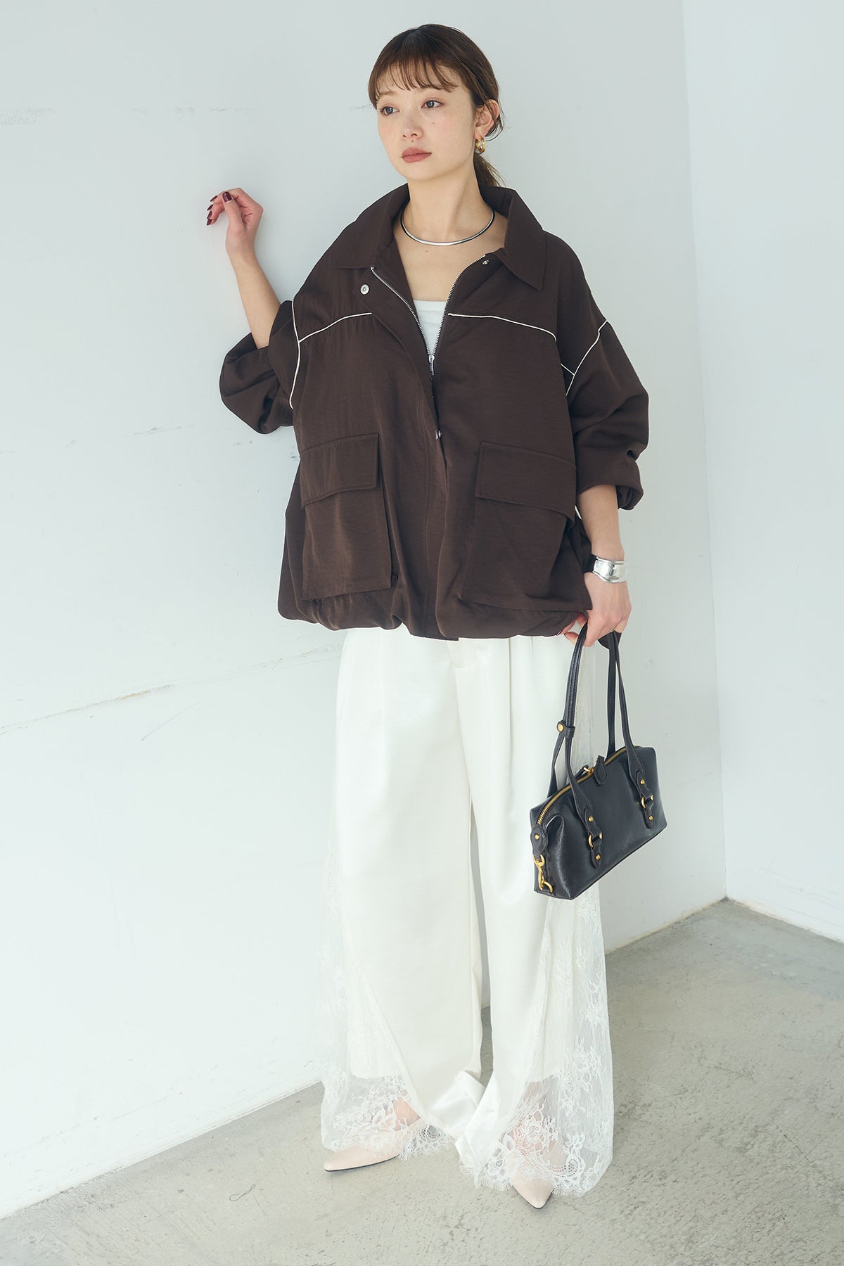 [SET]合繊ツイルバルーンジャケット+サテンレース切り替えタックパンツ(2set)