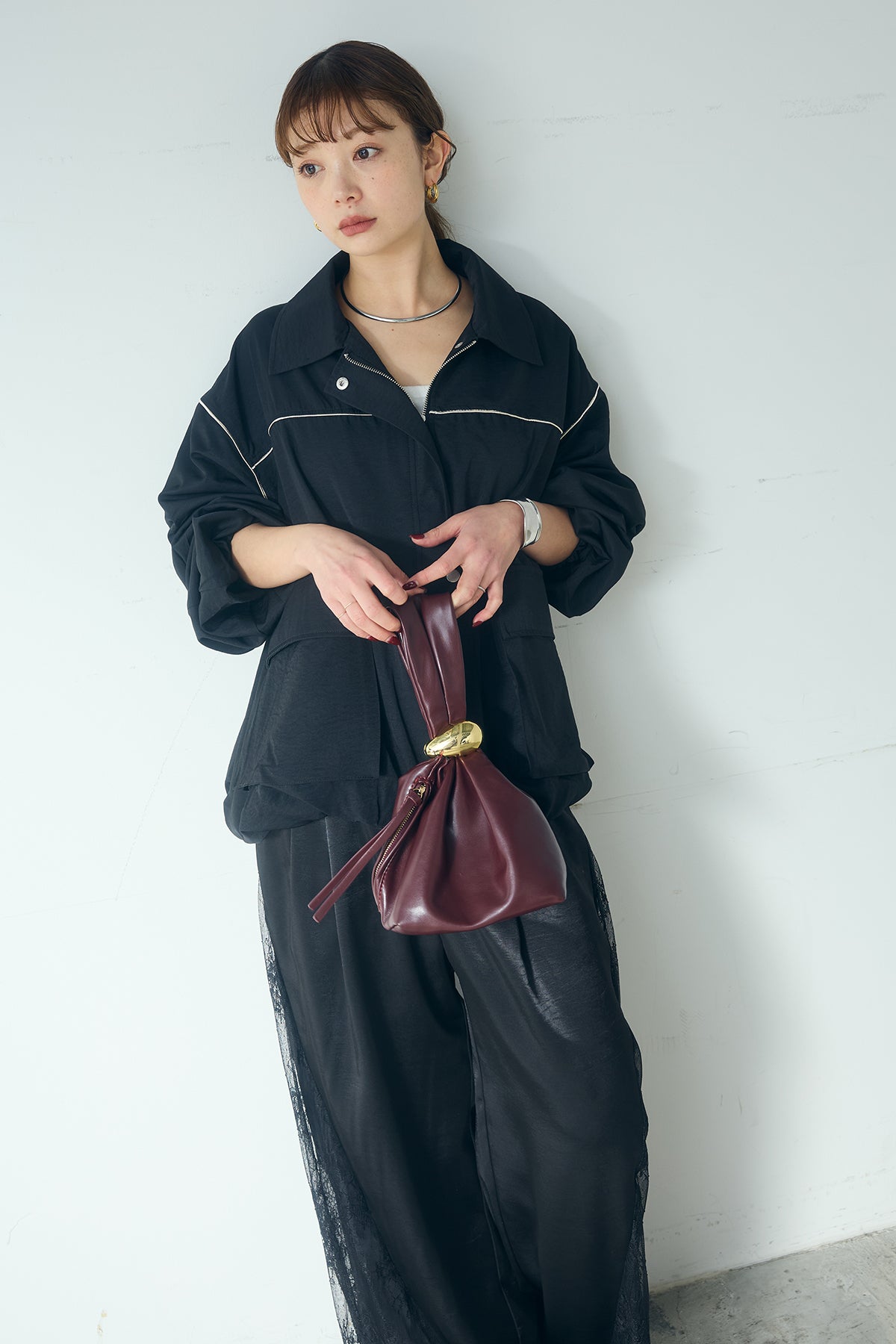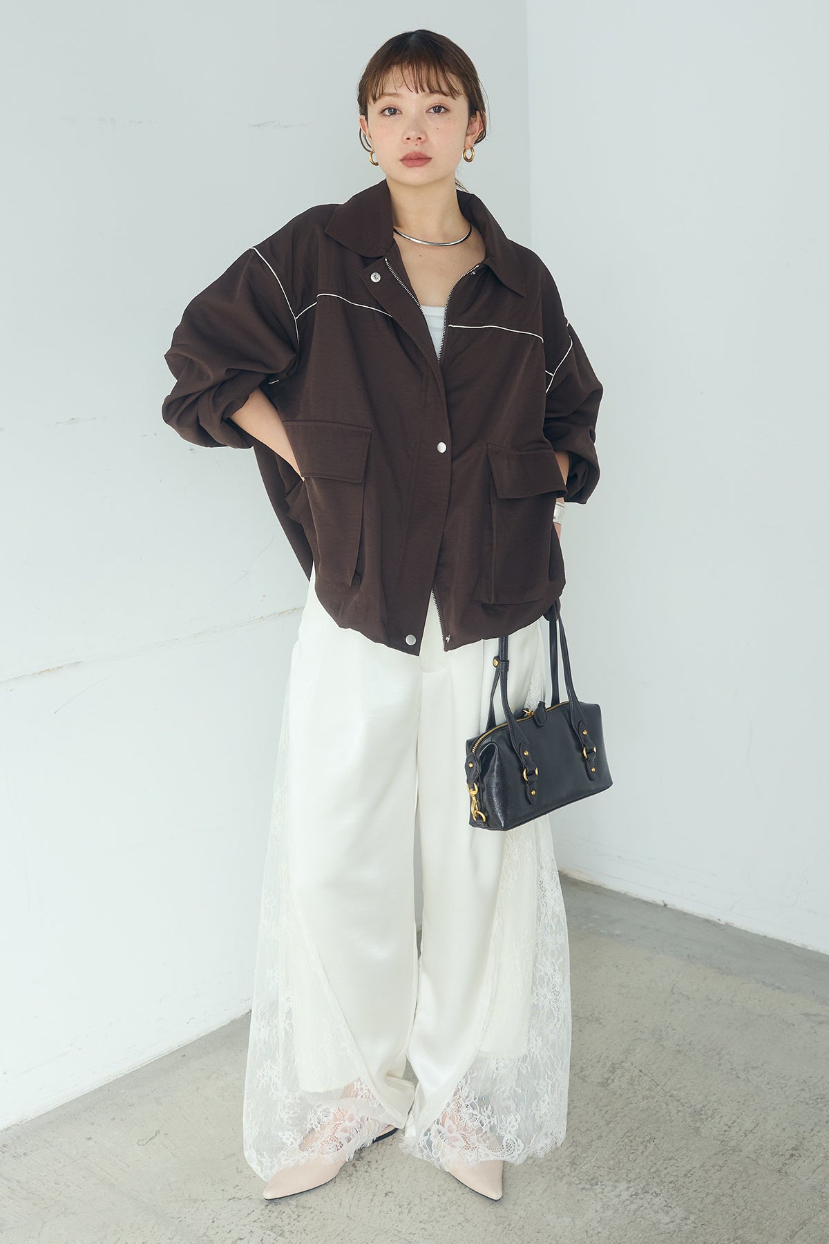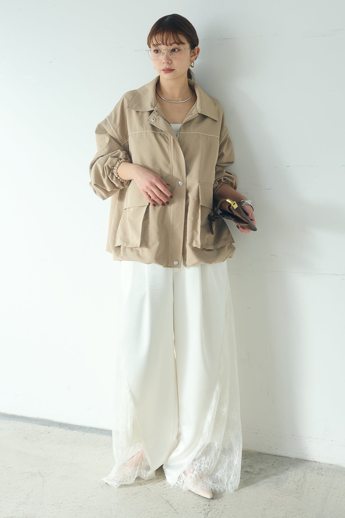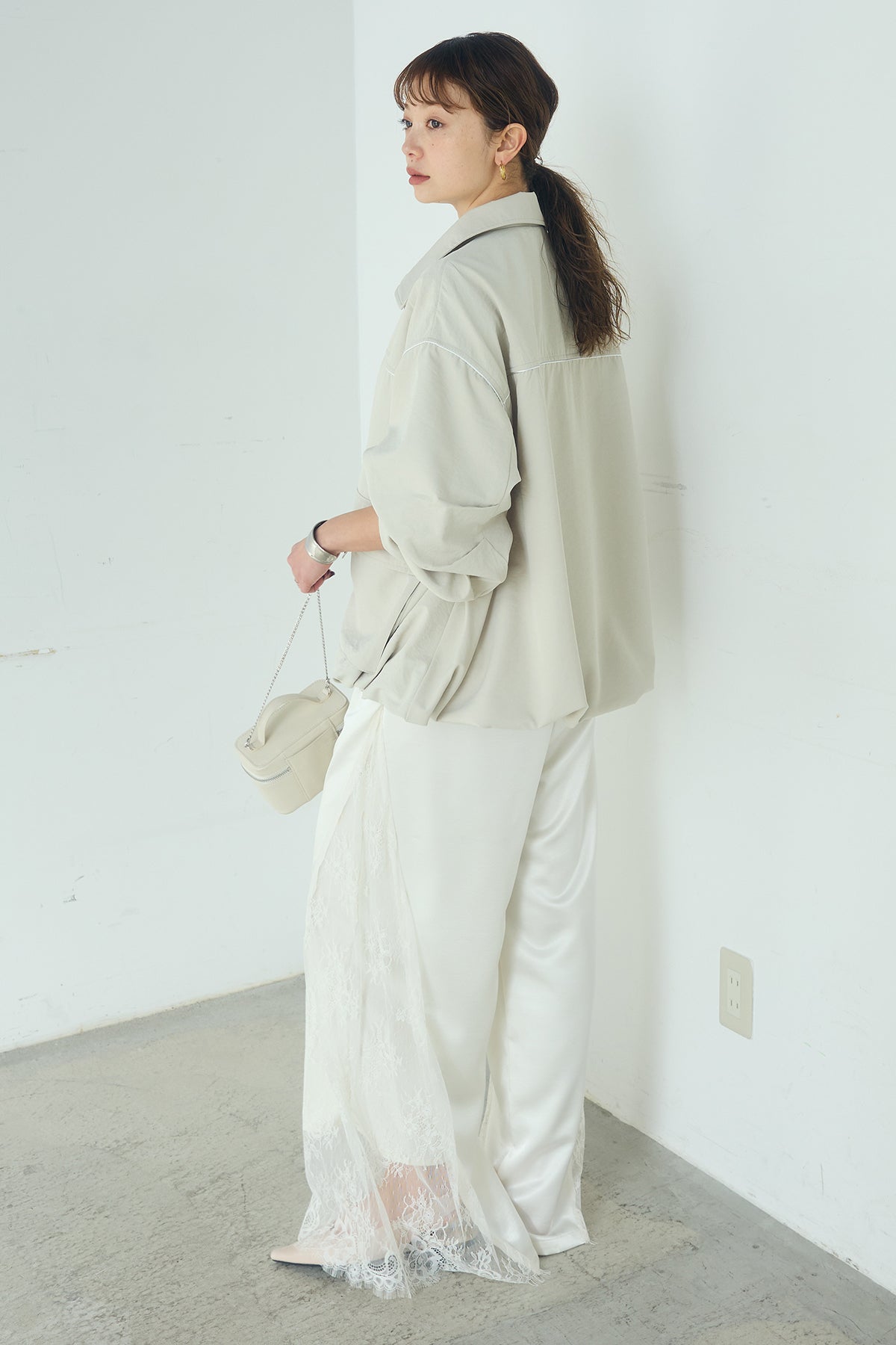 [SET]合繊ツイルバルーンジャケット+サテンレース切り替えタックパンツ(2set)
