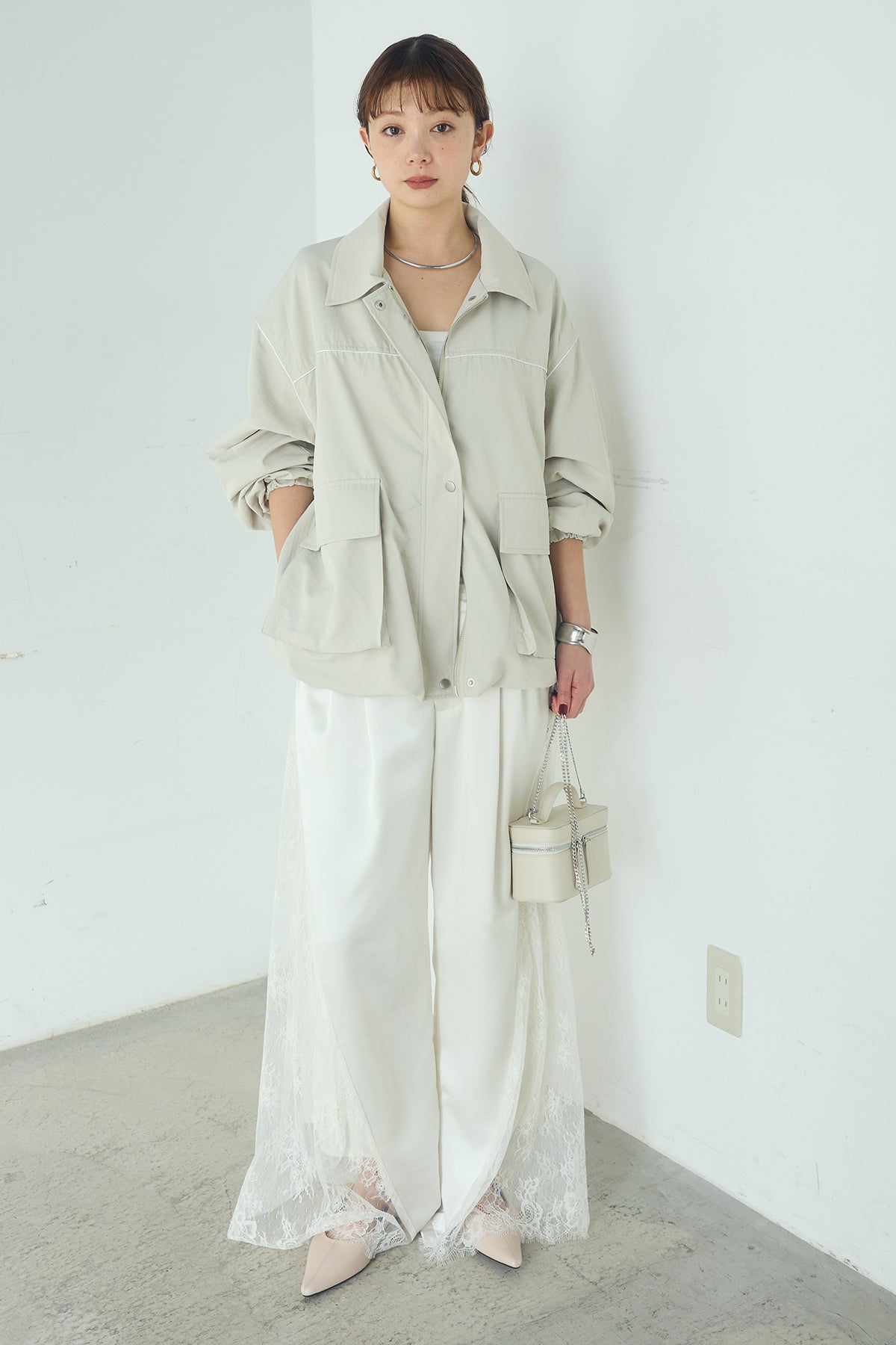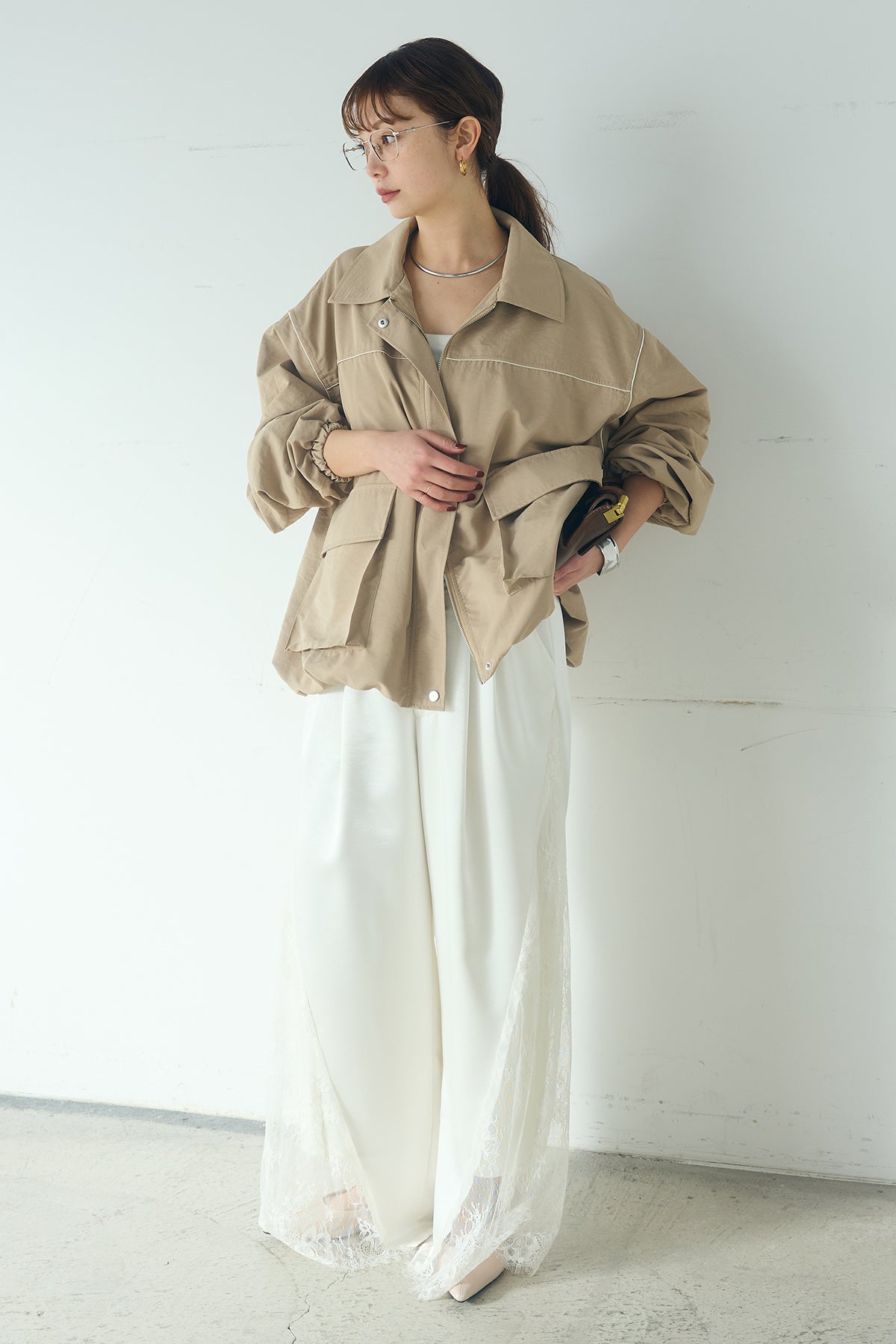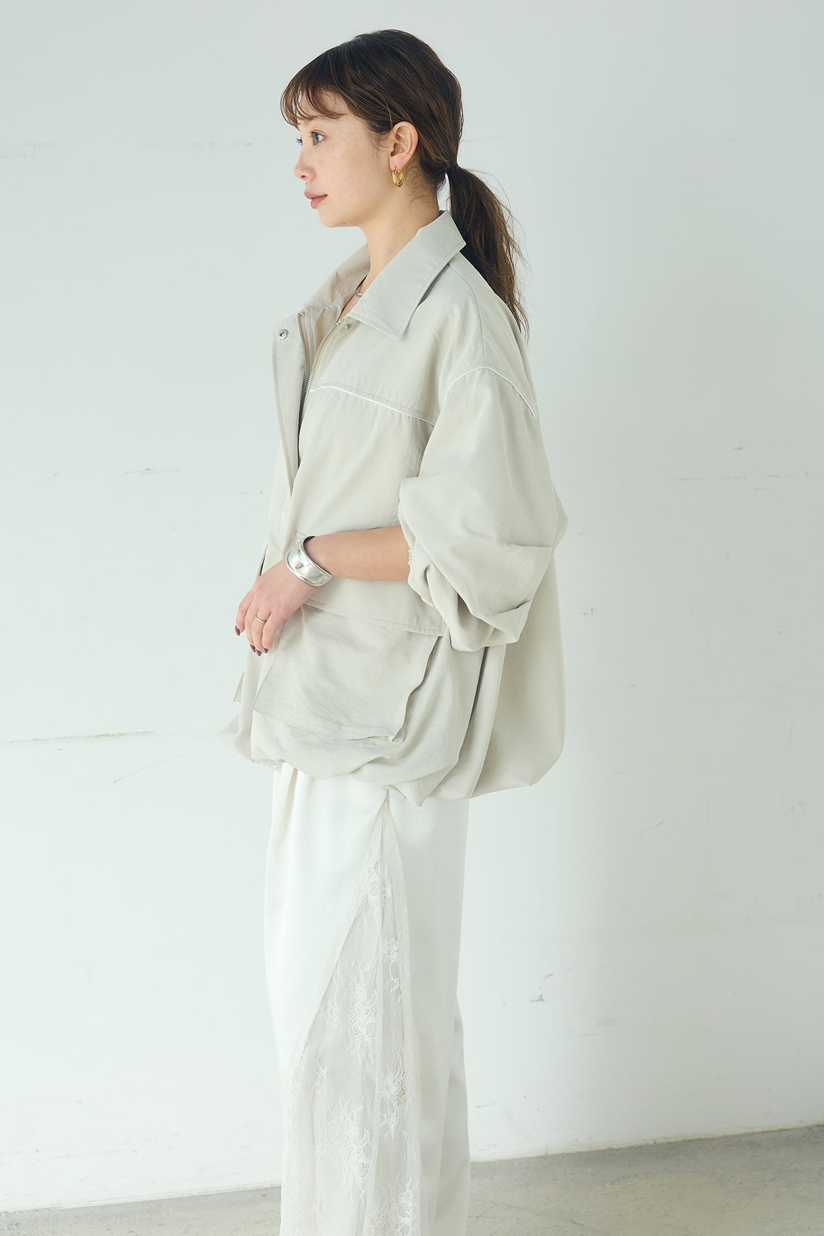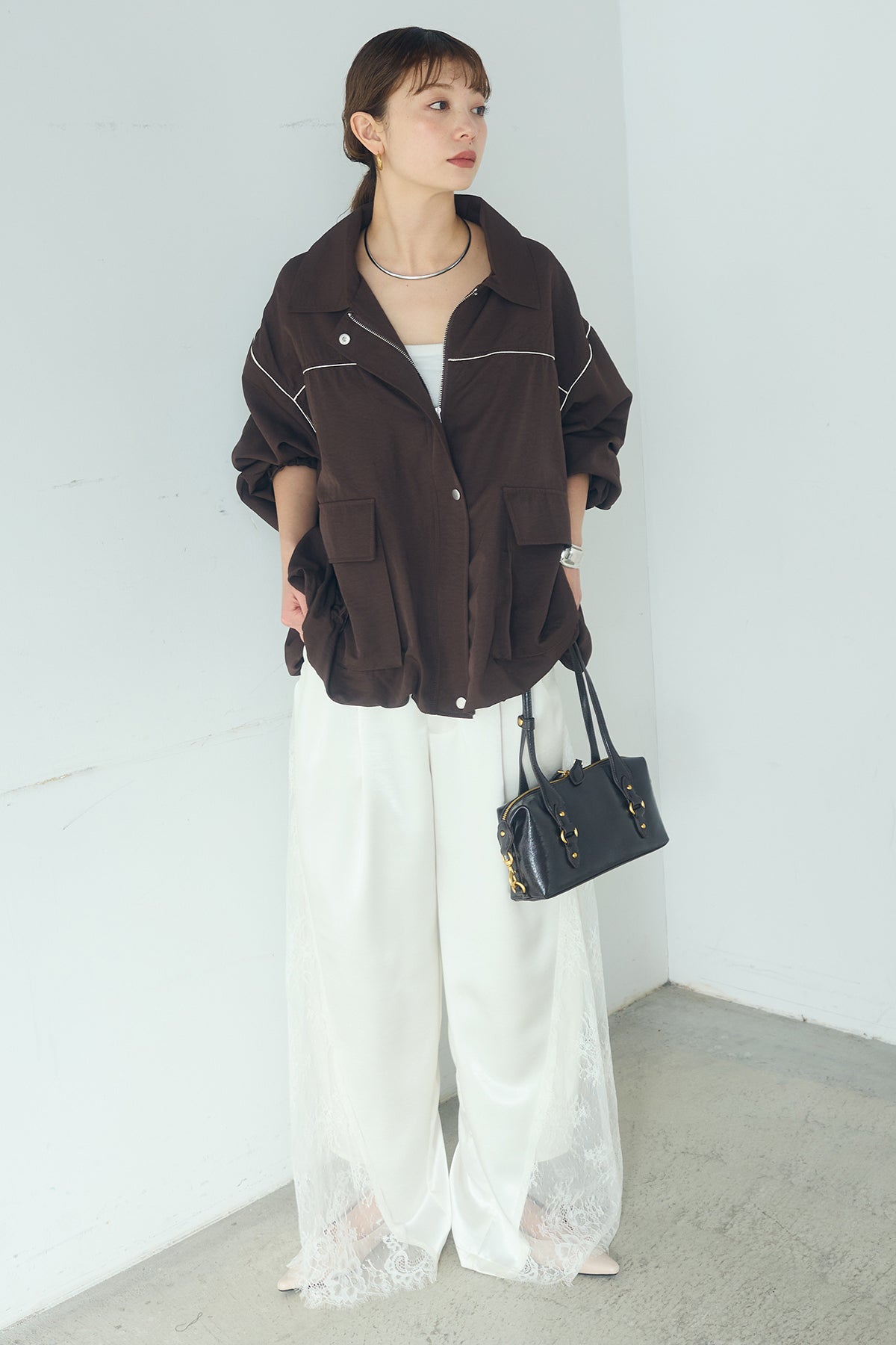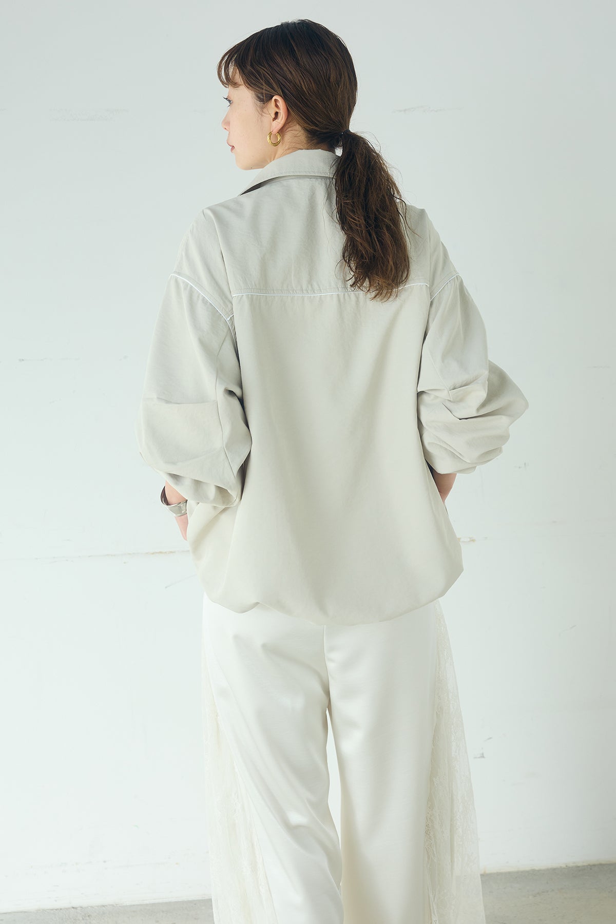 [SET]合繊ツイルバルーンジャケット+サテンレース切り替えタックパンツ(2set)