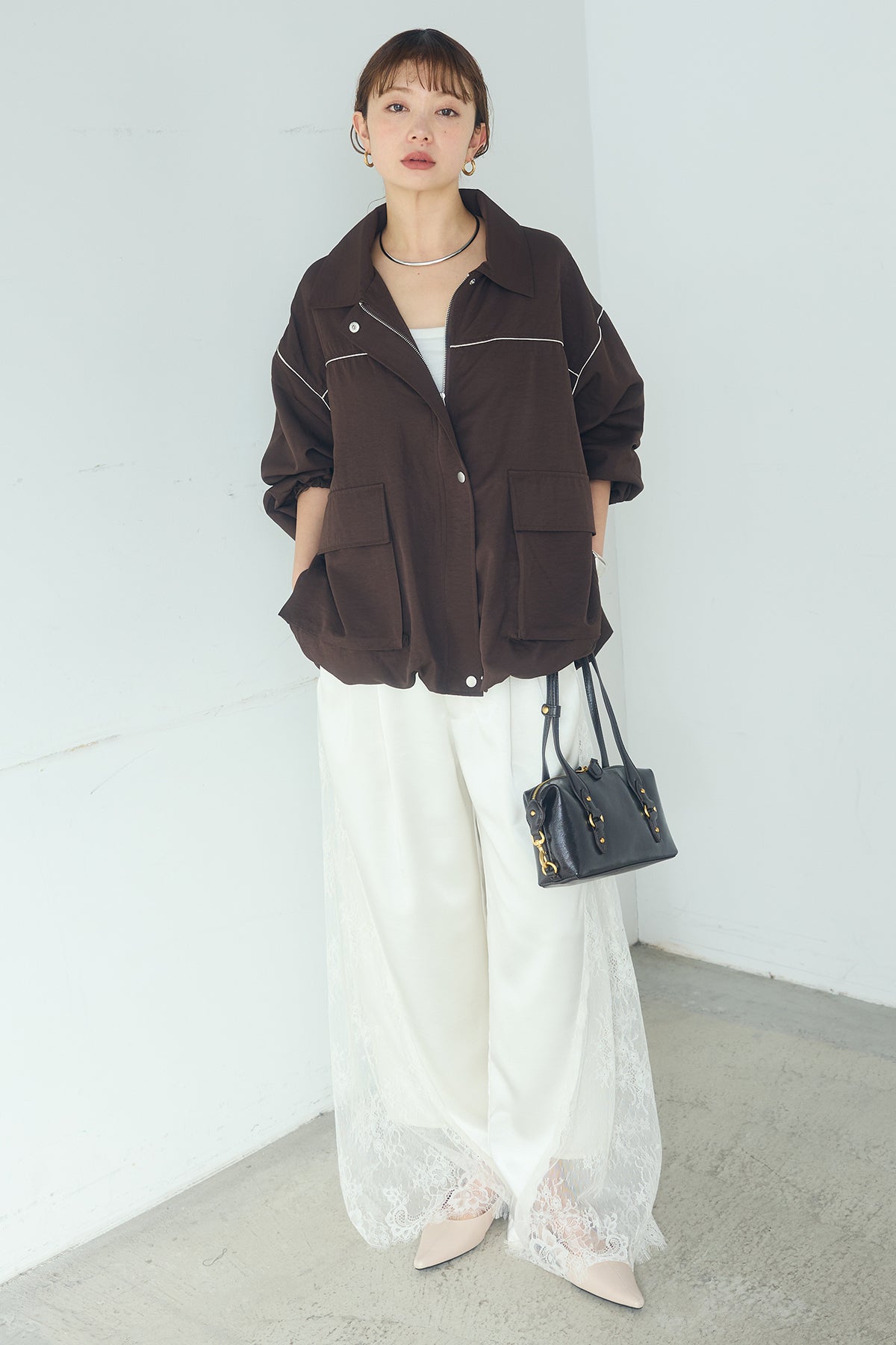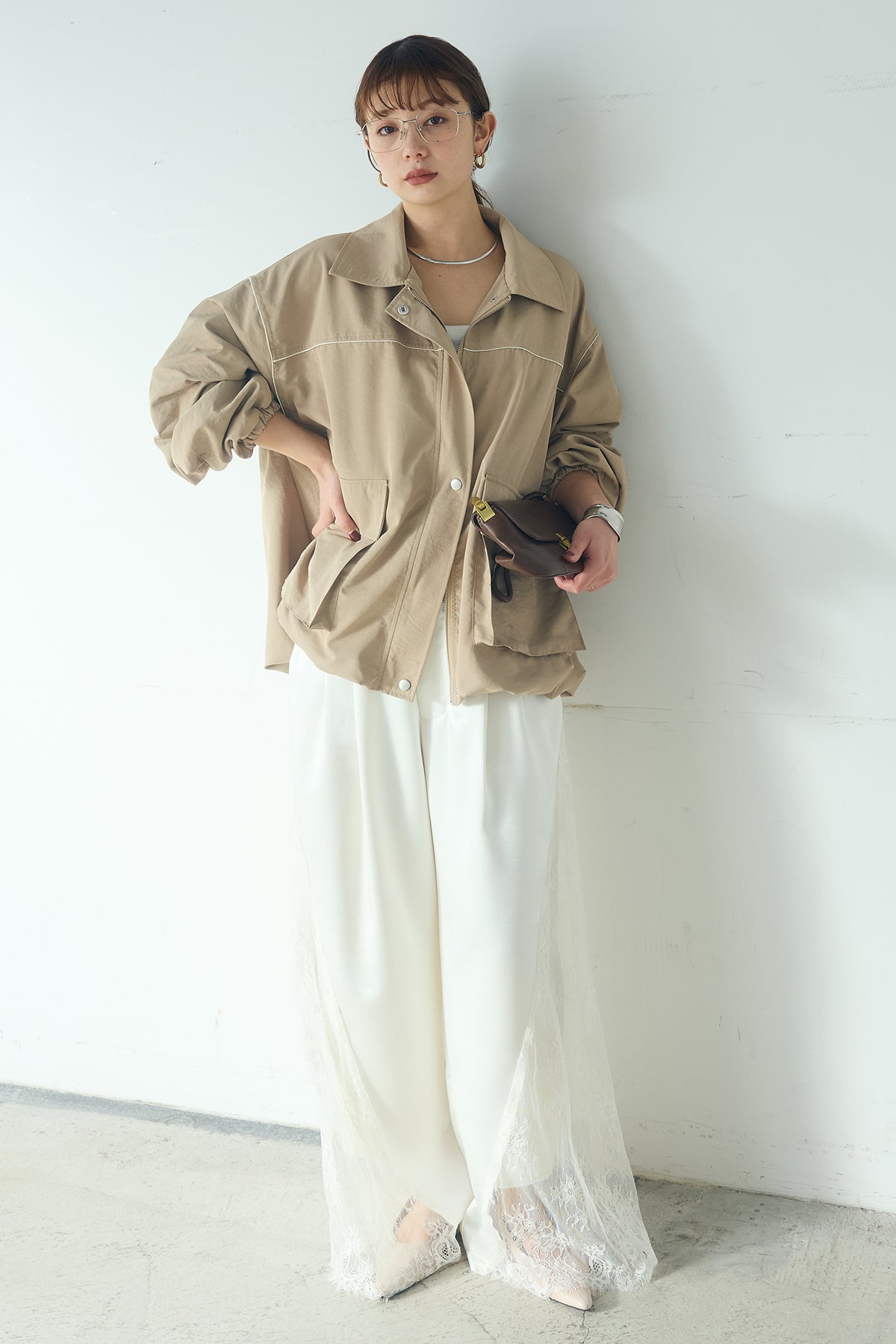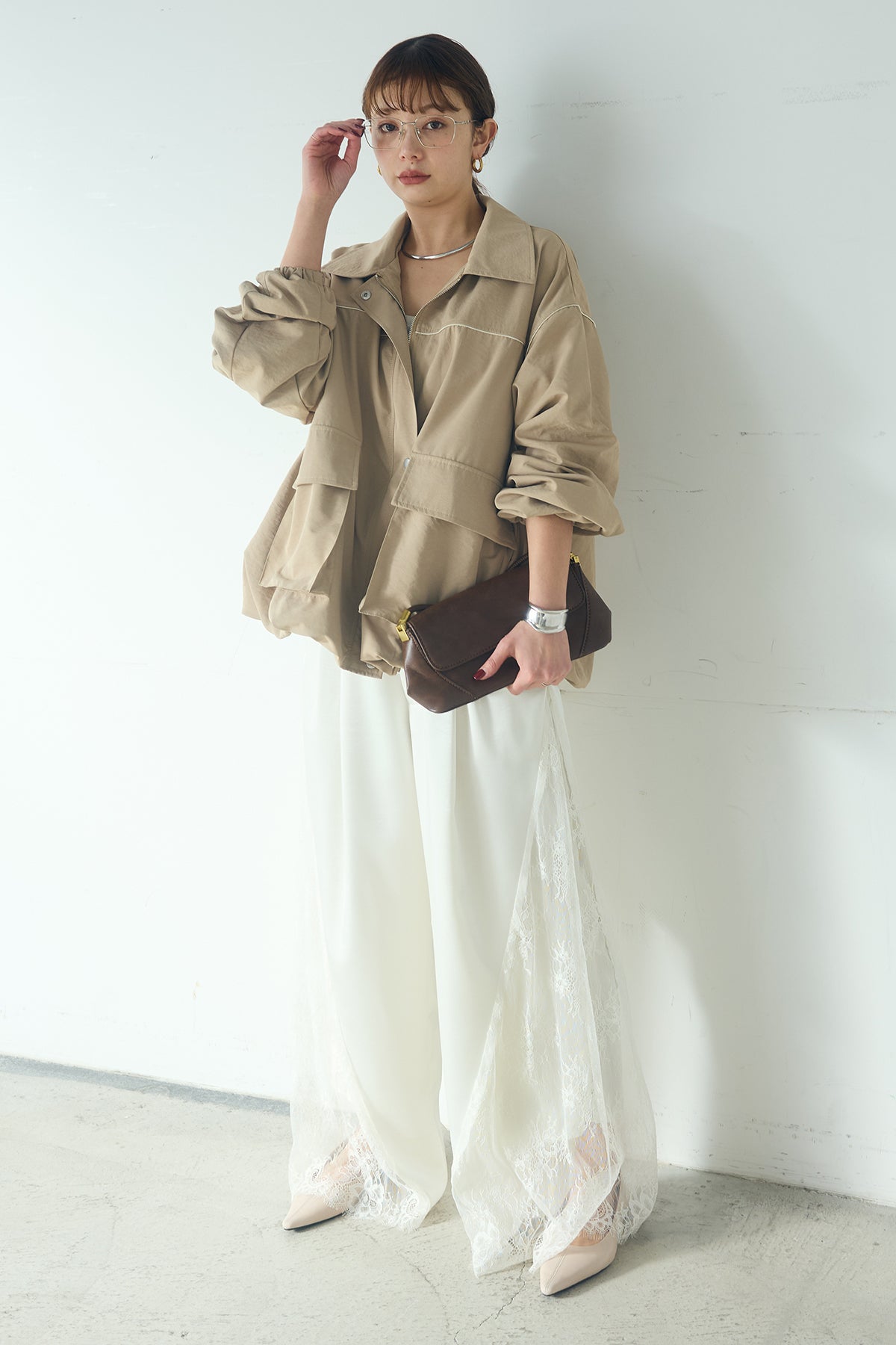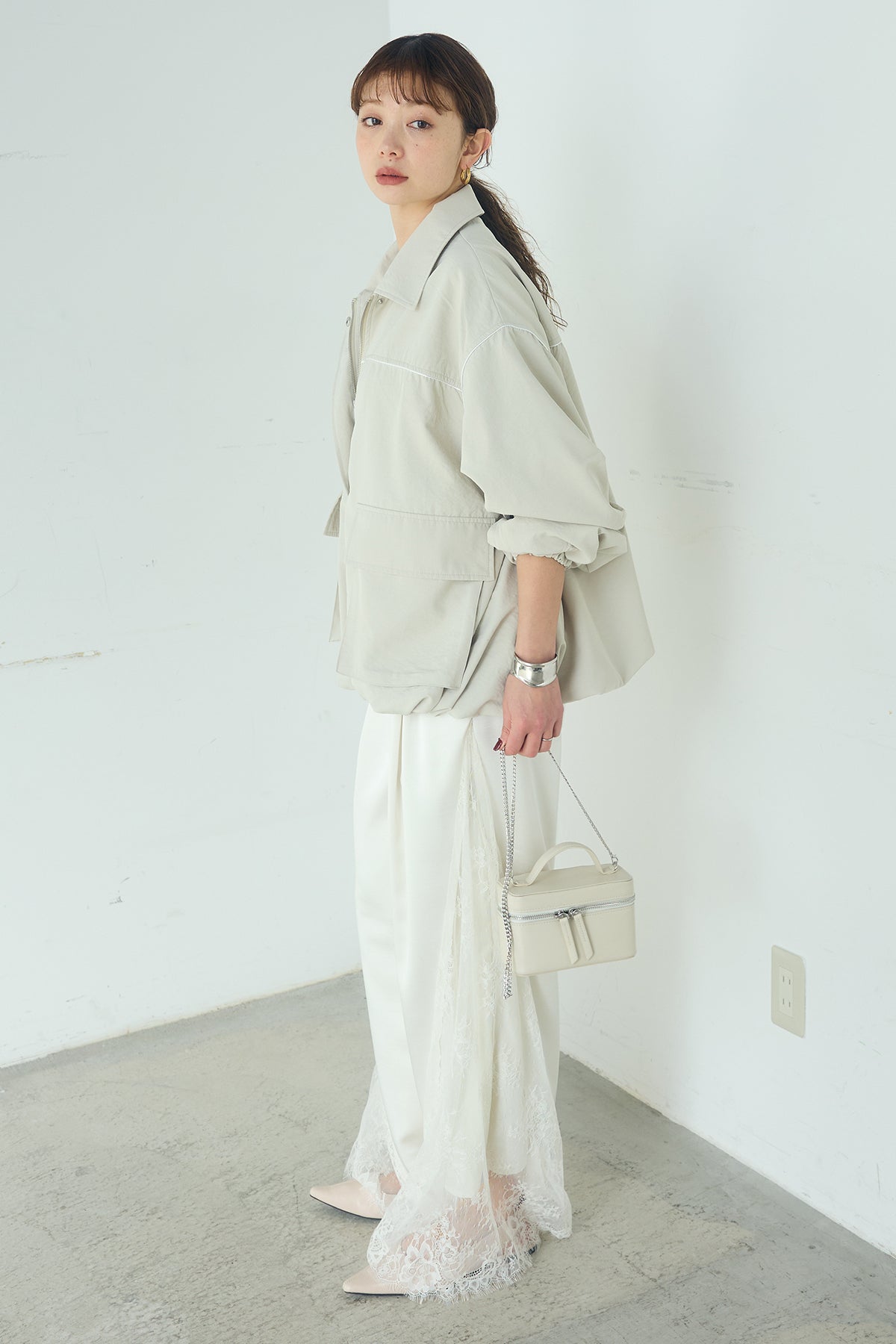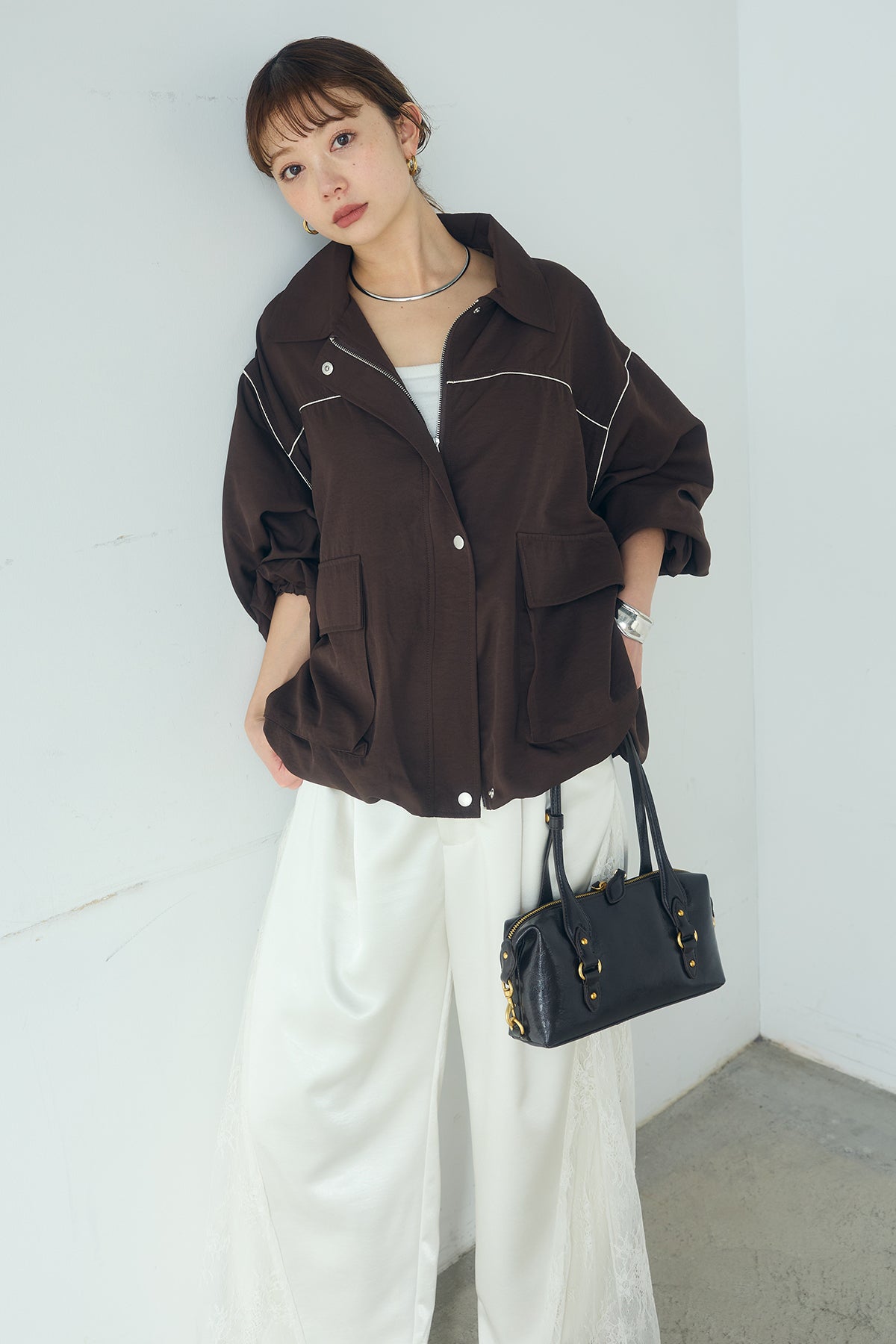 [SET]合繊ツイルバルーンジャケット+サテンレース切り替えタックパンツ(2set)