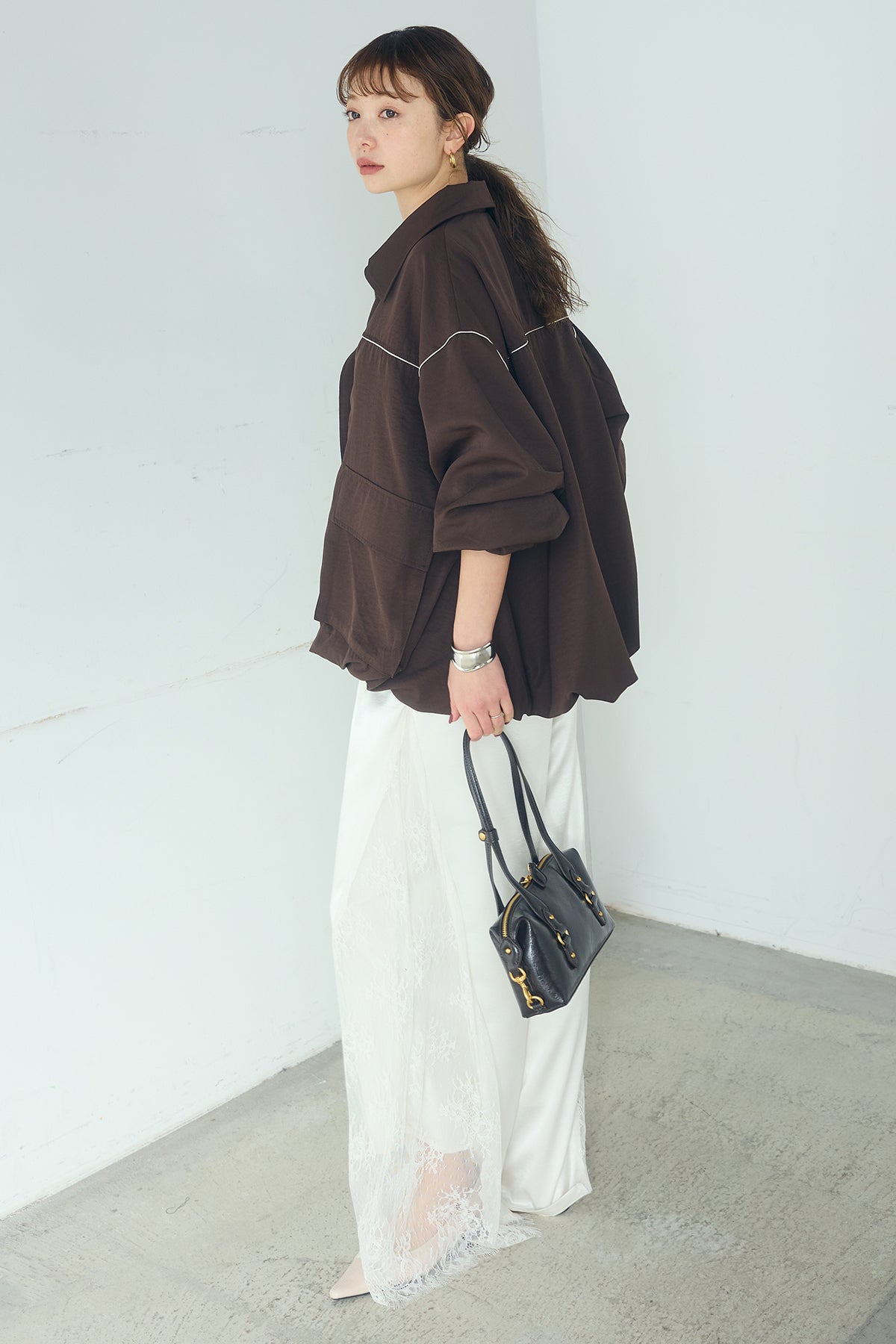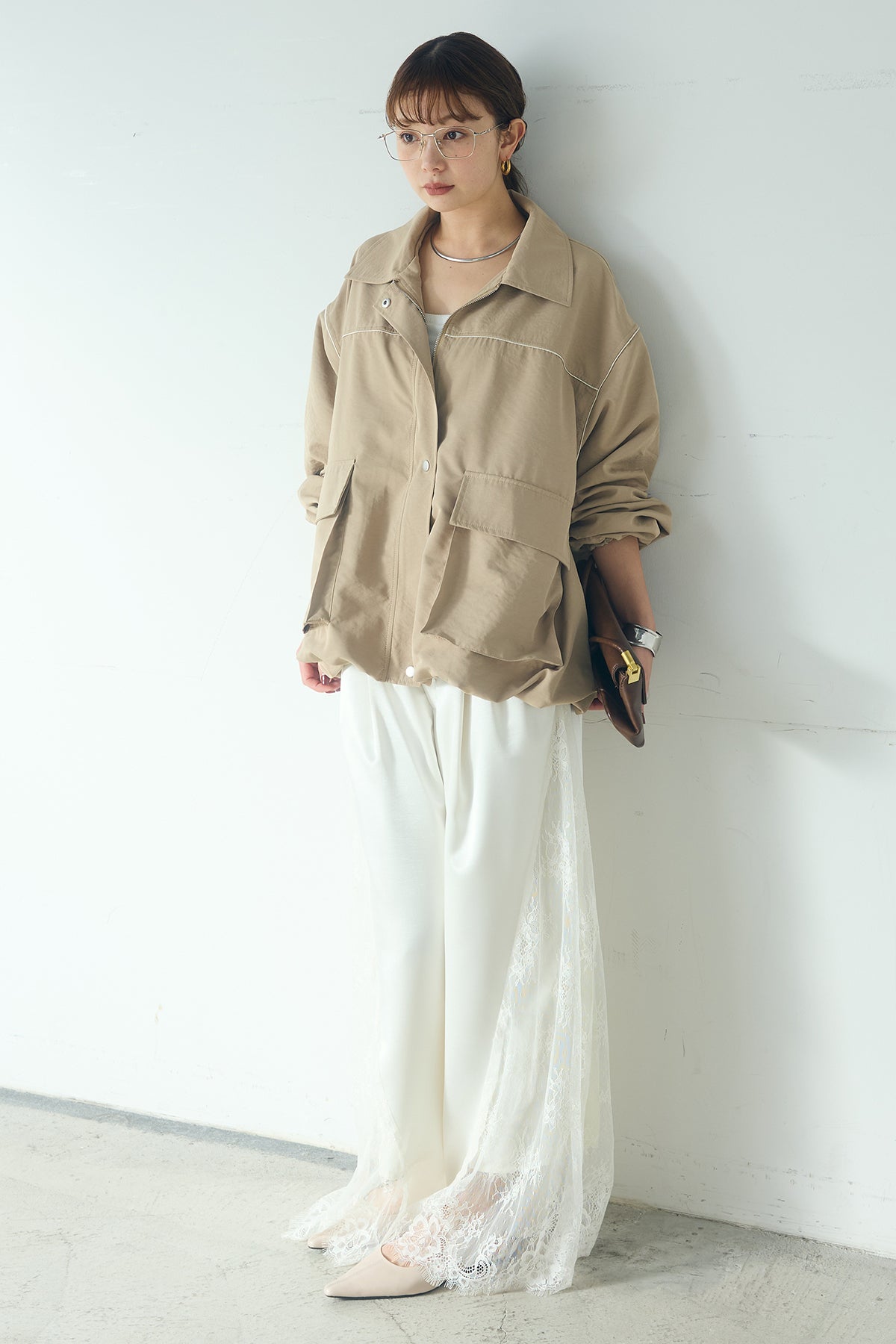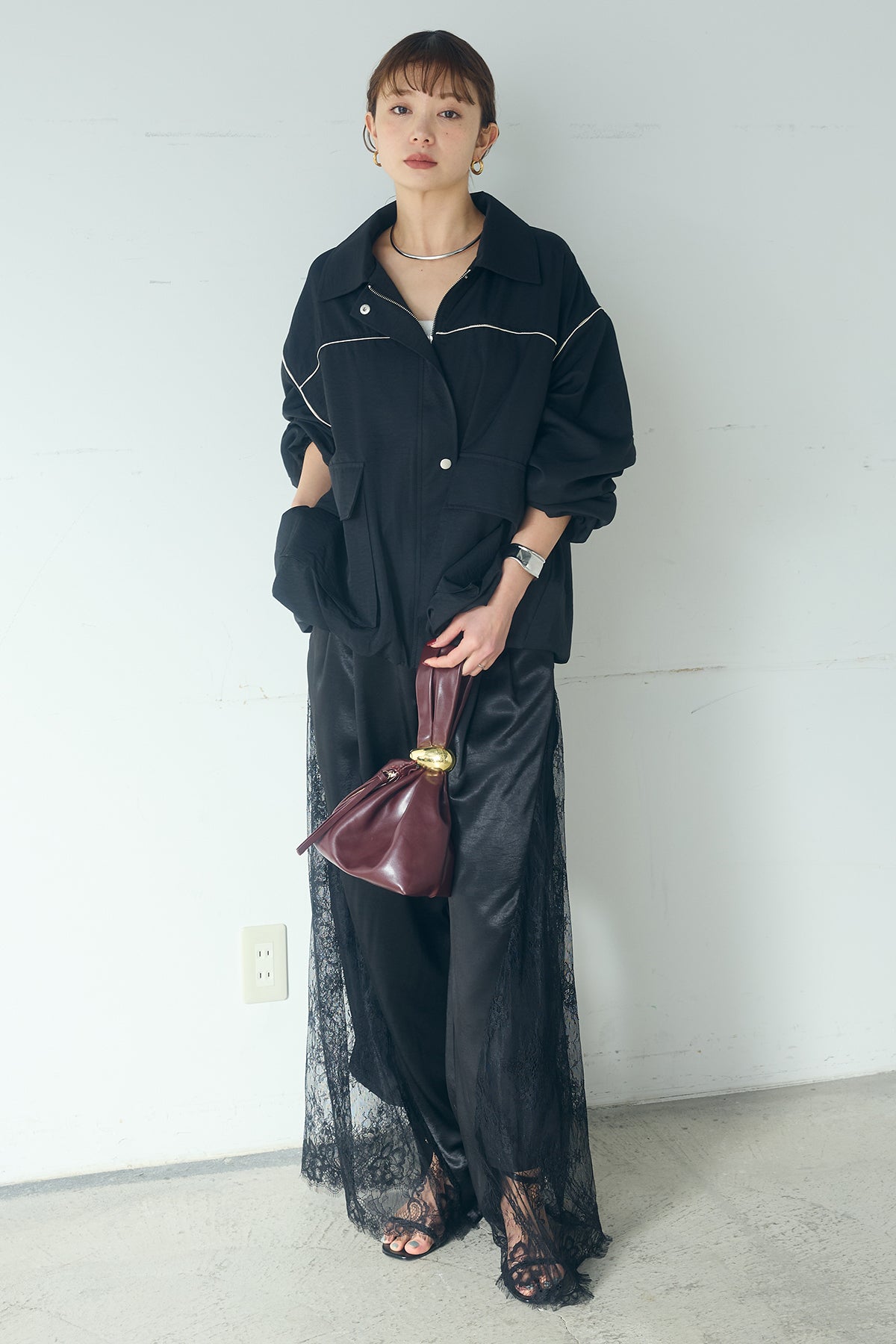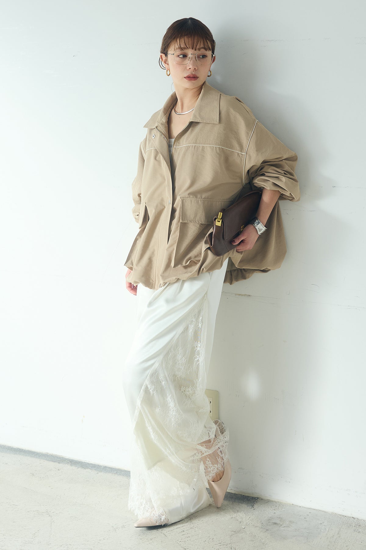 [SET]合繊ツイルバルーンジャケット+サテンレース切り替えタックパンツ(2set)