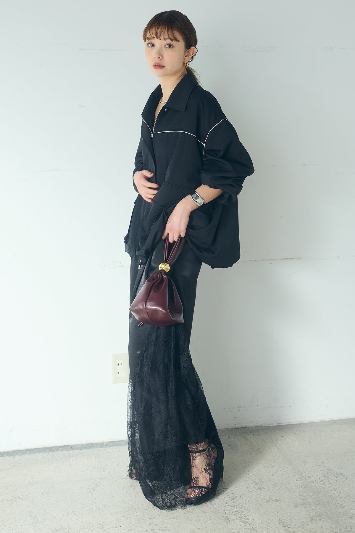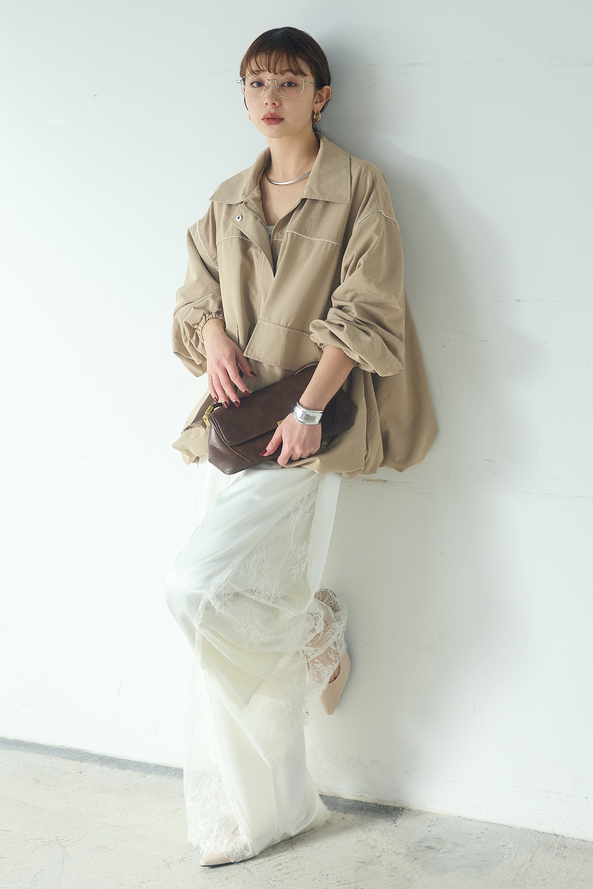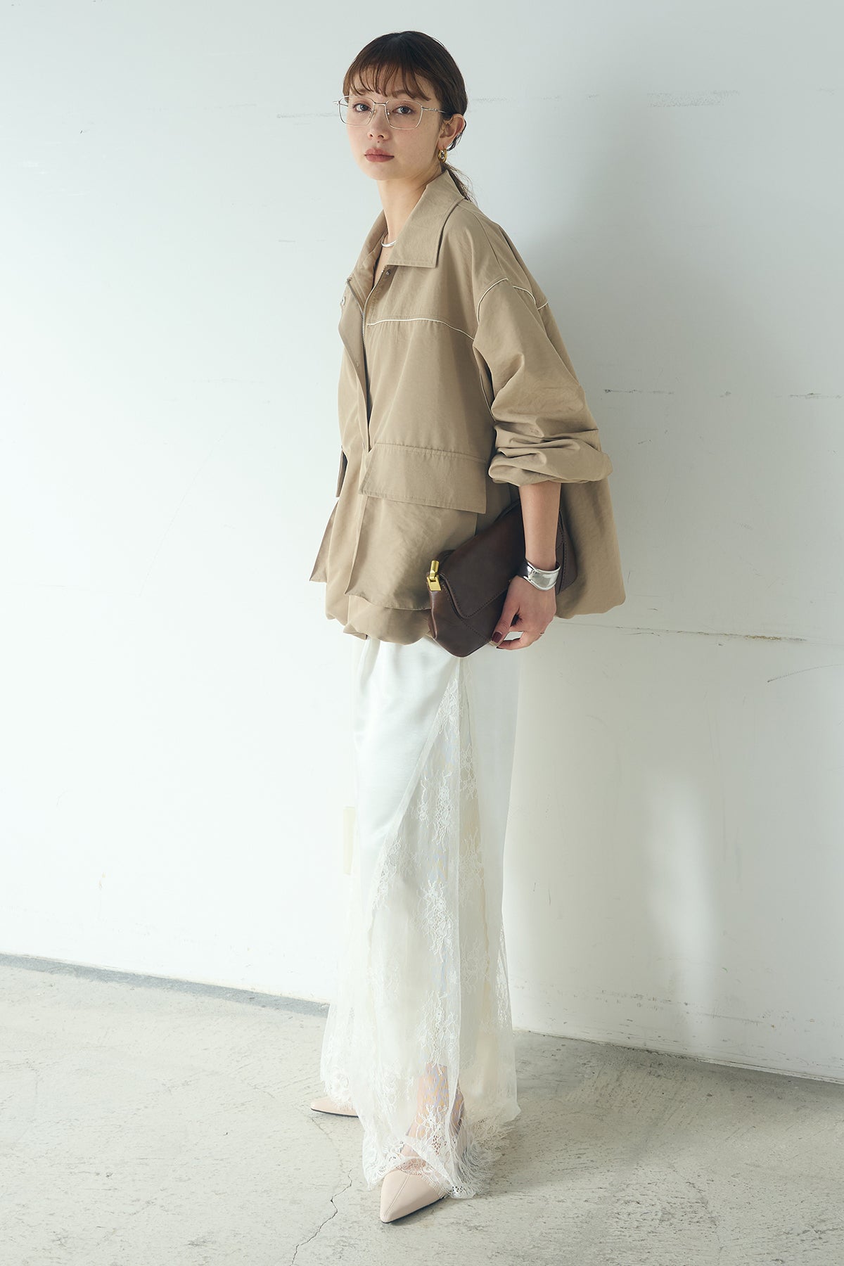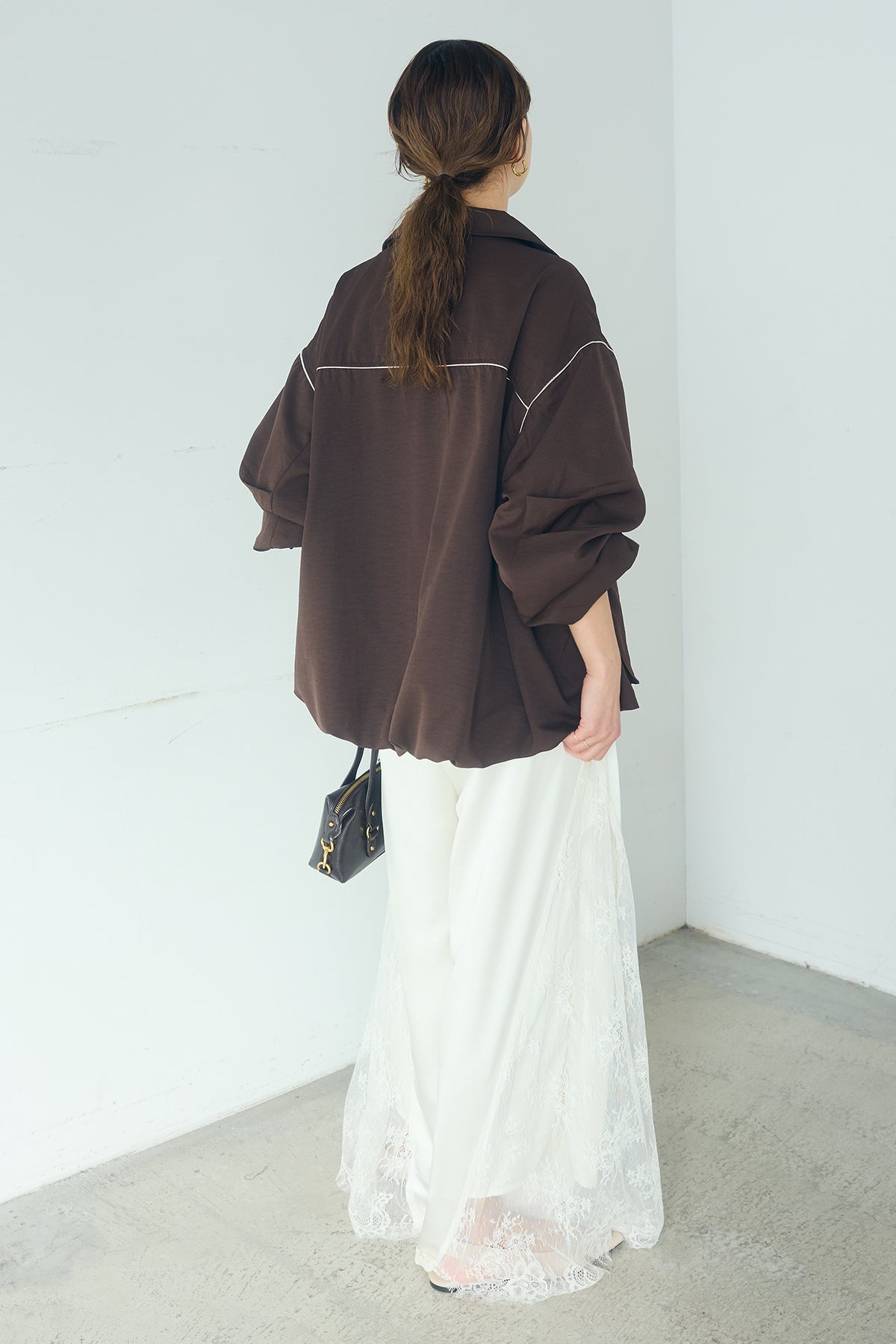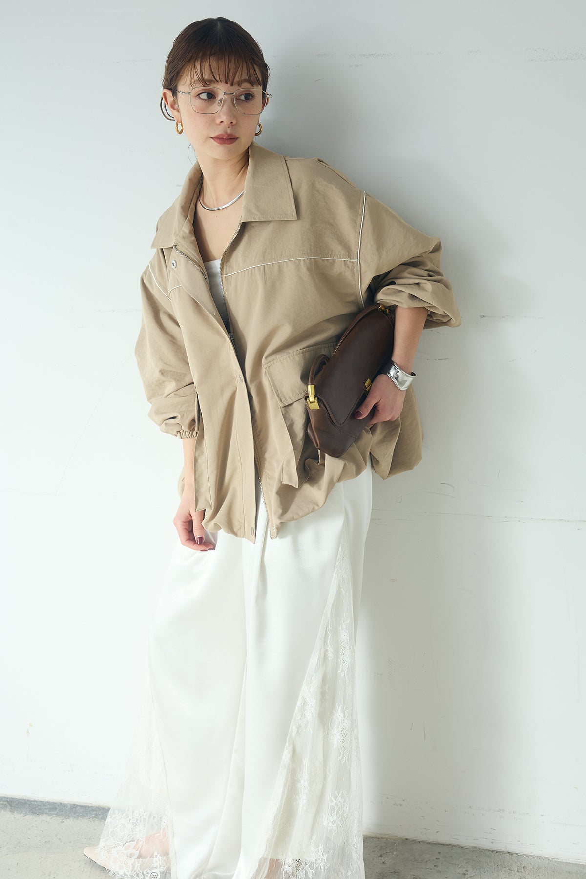 [SET]合繊ツイルバルーンジャケット+サテンレース切り替えタックパンツ(2set)