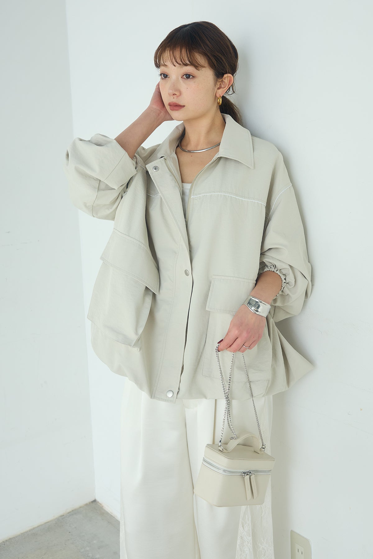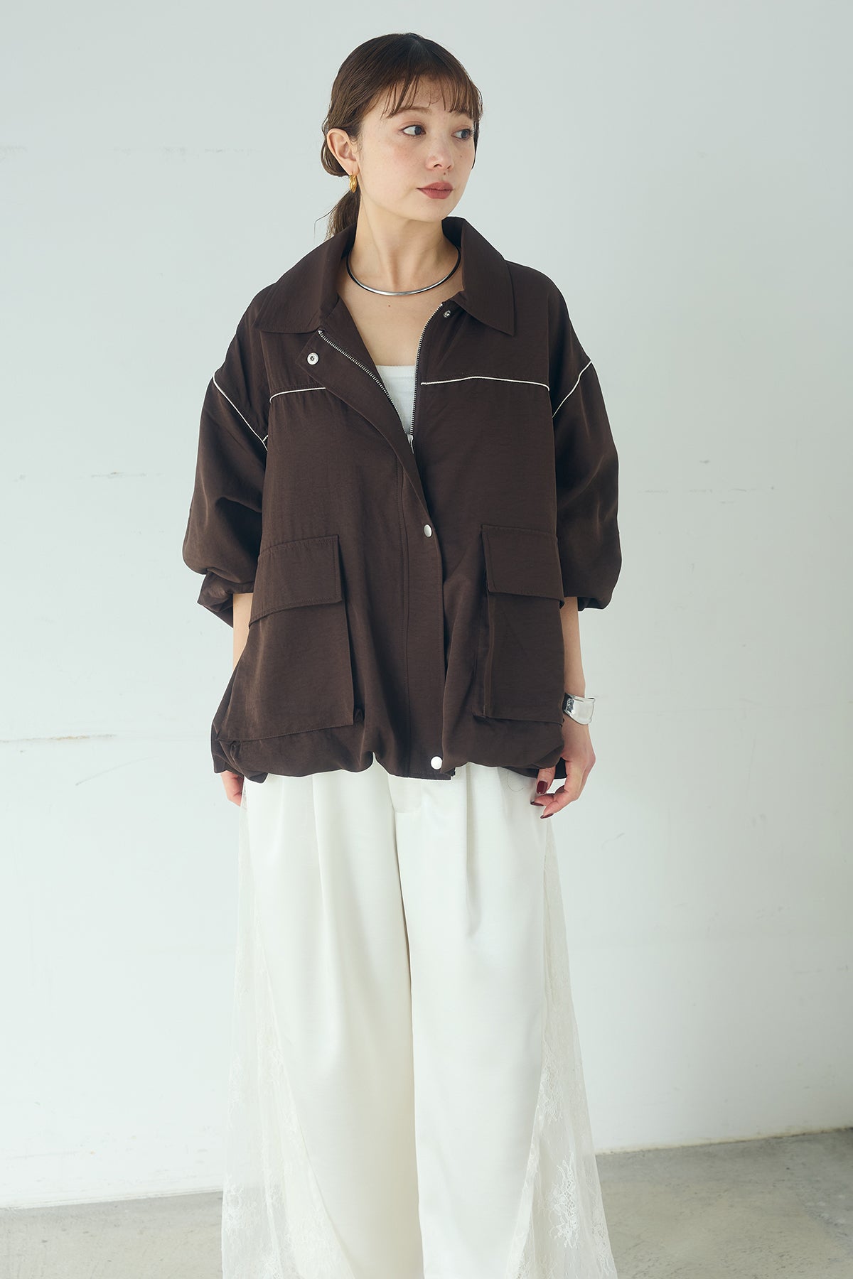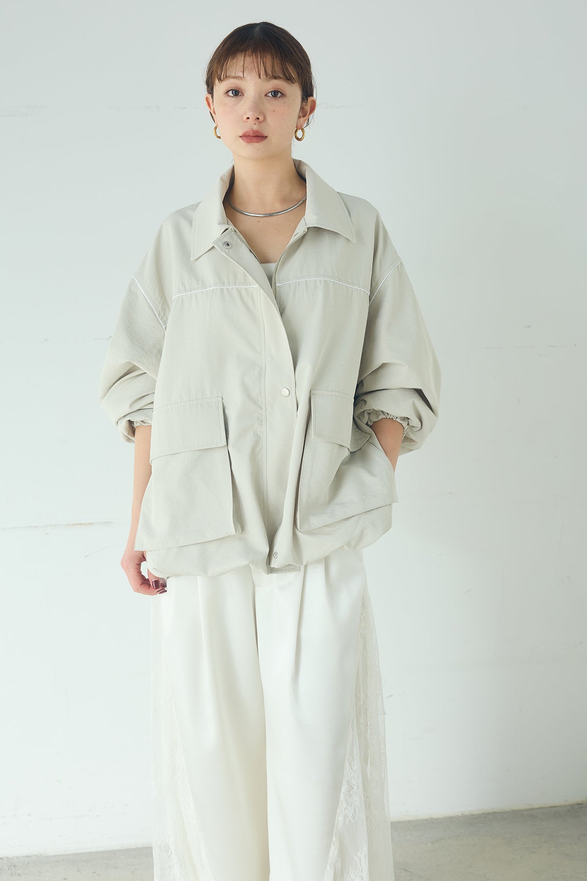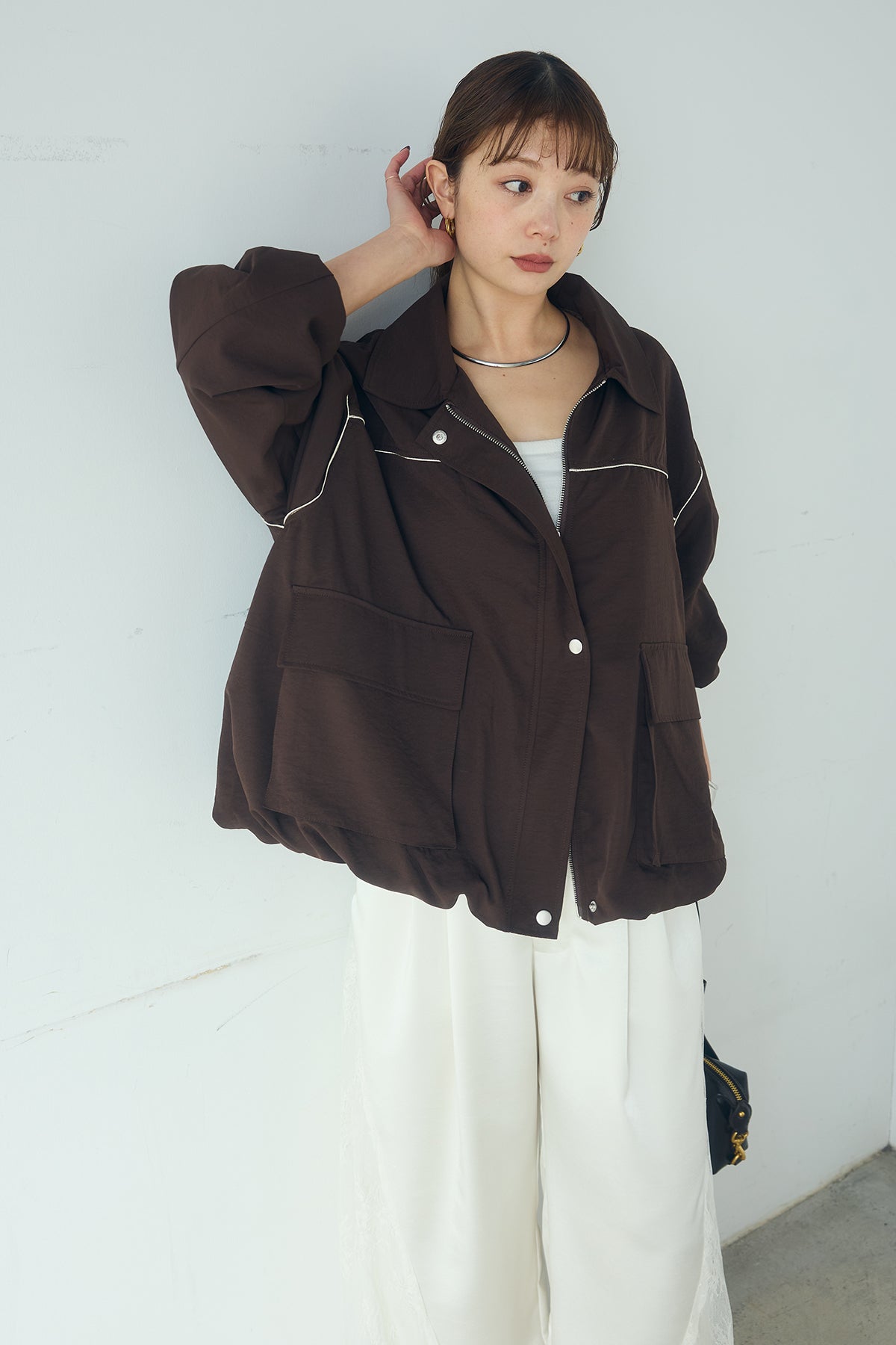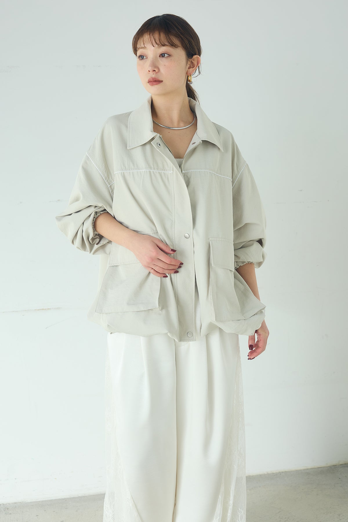合繊ツイルバルーンジャケット ほどよくハリのある合繊ツイルが立体的なバルーンシルエットを引き立てる一着。 ゆとりのあるフォルムと大きめポケットが程よいアクセントになり、シンプルな中にも奥行きのある印象に仕上がっています。軽やかな着心地で羽織りやすく、トップスの上からさっと重ねるだけでコーディネートに動きが生まれるのもポイント。きれいめにもラフにも取り入れやすい、汎用性の高いジャケットです。
