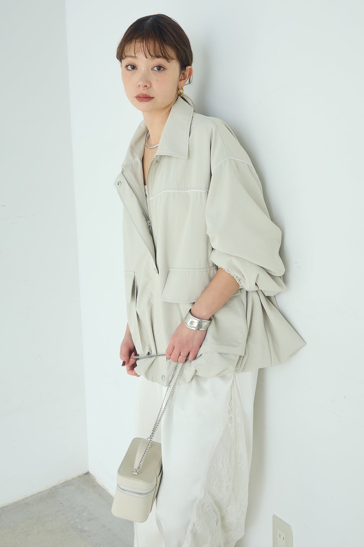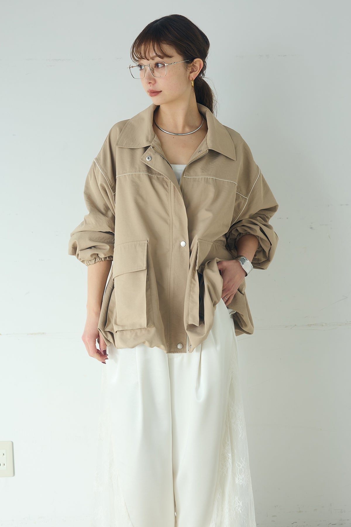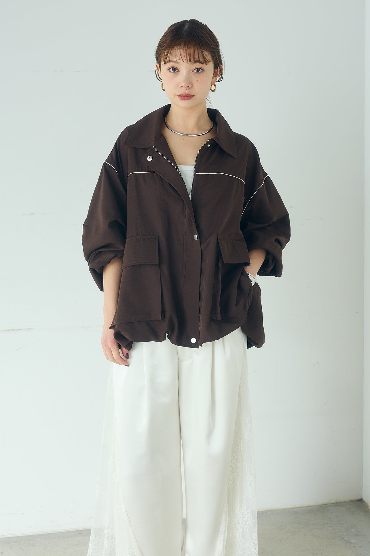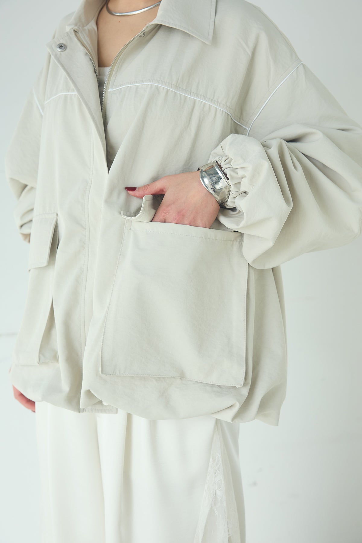 合繊ツイルバルーンジャケット ほどよくハリのある合繊ツイルが立体的なバルーンシルエットを引き立てる一着。 ゆとりのあるフォルムと大きめポケットが程よいアクセントになり、シンプルな中にも奥行きのある印象に仕上がっています。軽やかな着心地で羽織りやすく、トップスの上からさっと重ねるだけでコーディネートに動きが生まれるのもポイント。きれいめにもラフにも取り入れやすい、汎用性の高いジャケットです。