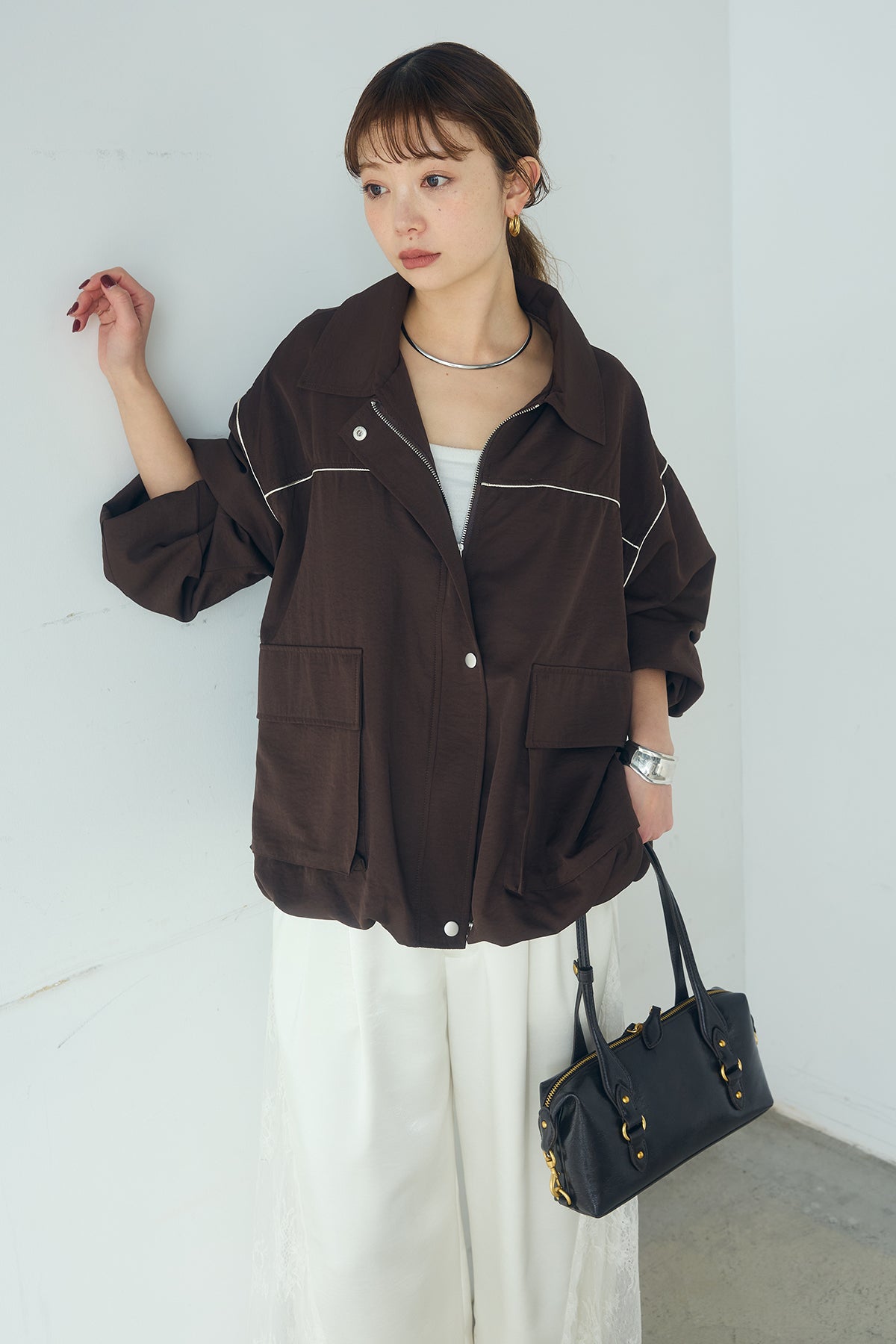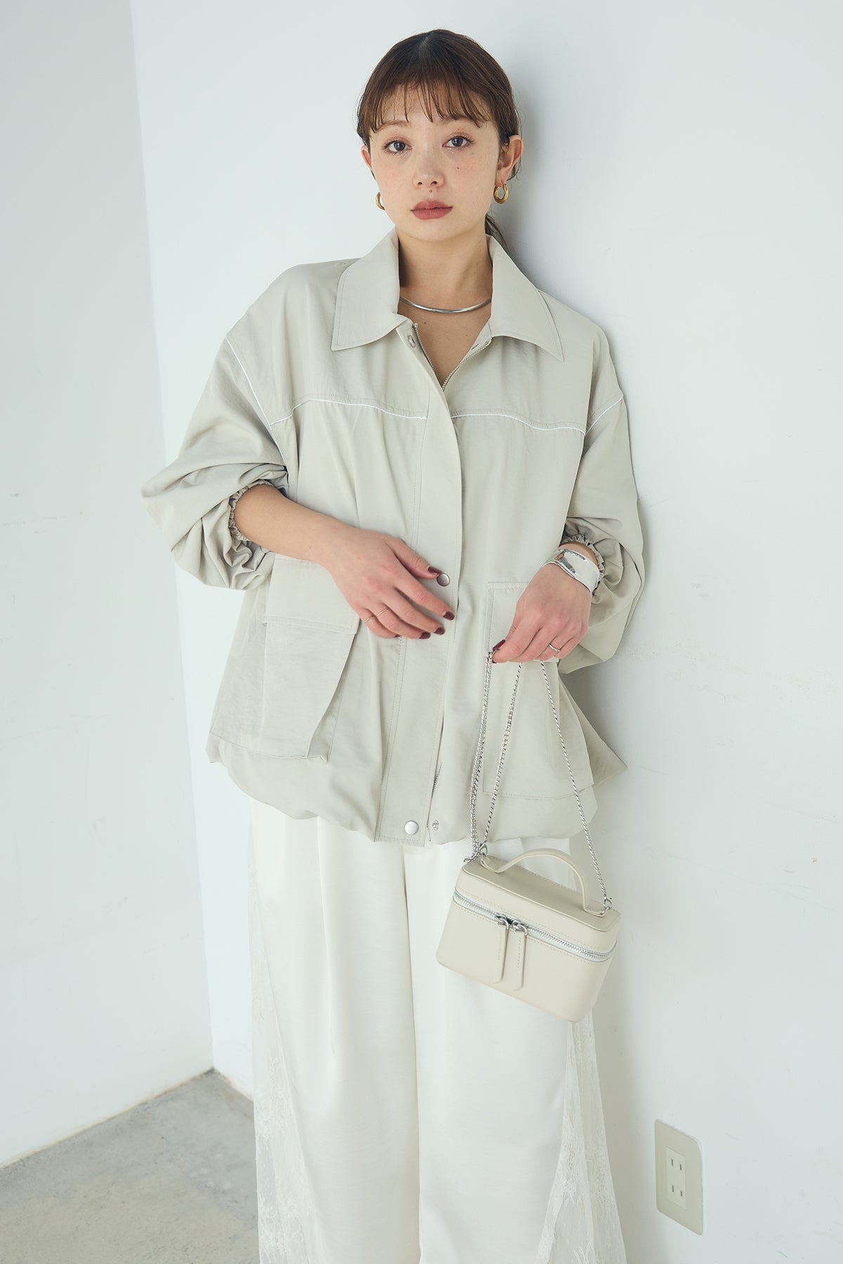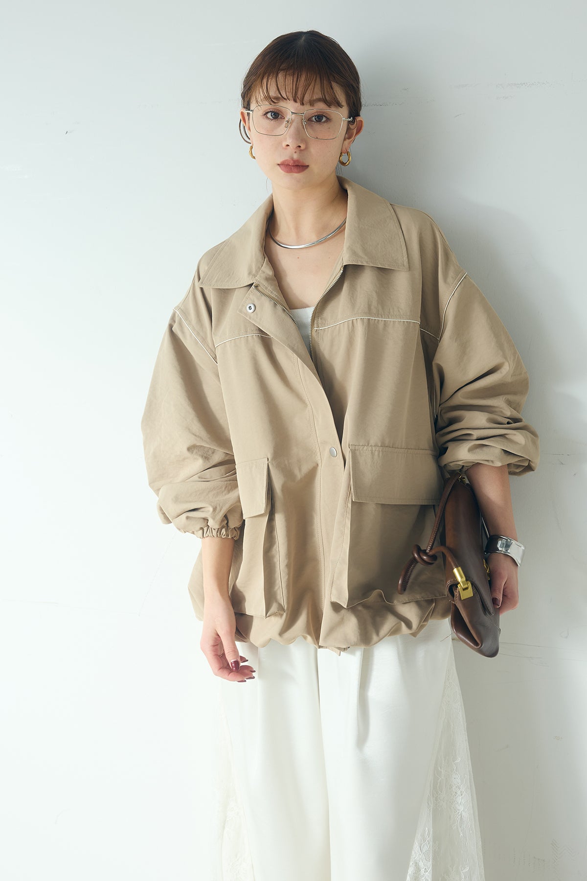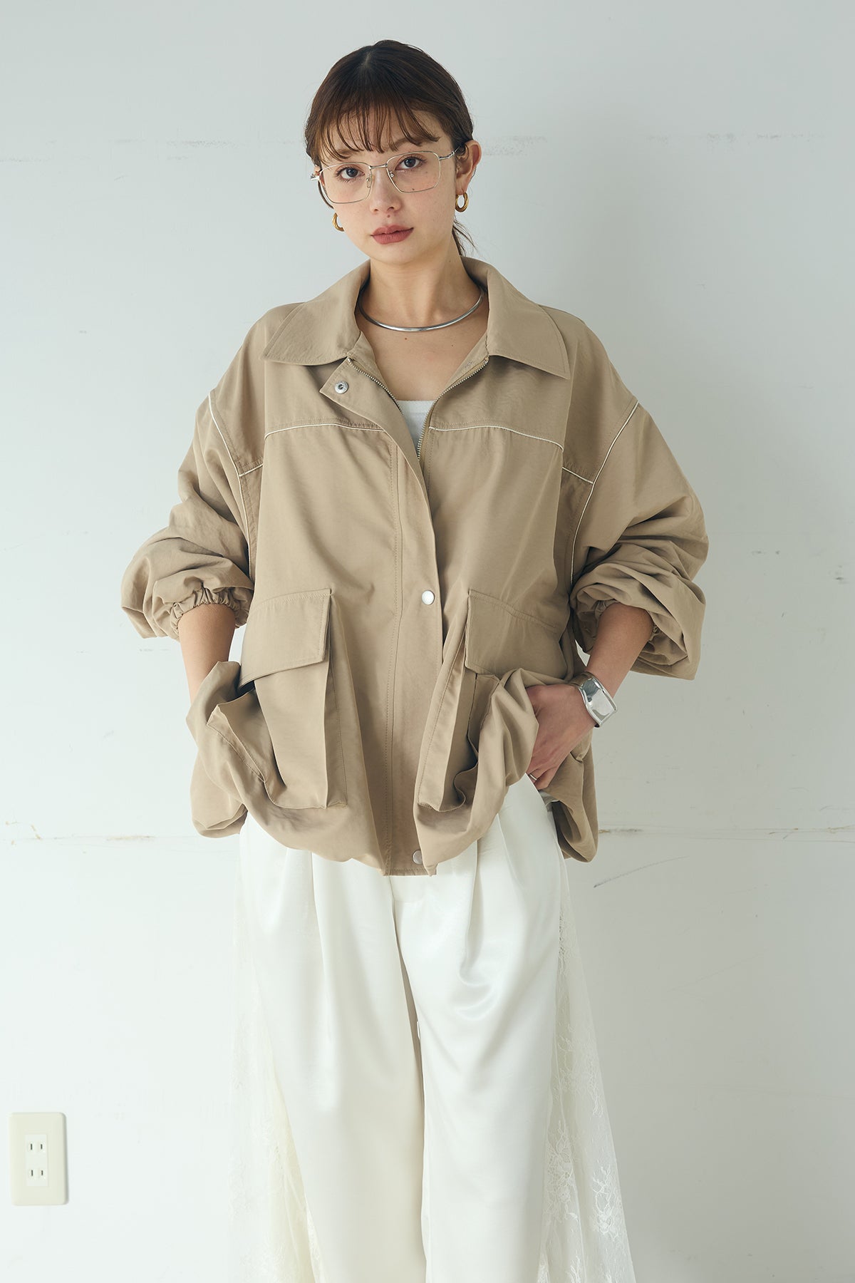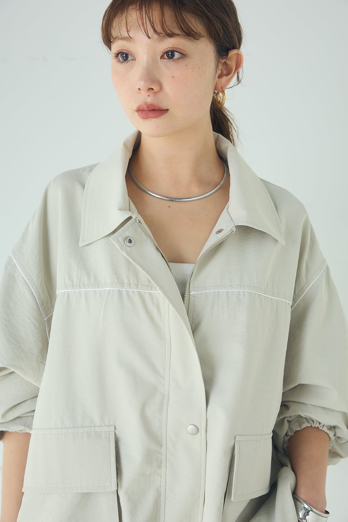 合繊ツイルバルーンジャケット ほどよくハリのある合繊ツイルが立体的なバルーンシルエットを引き立てる一着。 ゆとりのあるフォルムと大きめポケットが程よいアクセントになり、シンプルな中にも奥行きのある印象に仕上がっています。軽やかな着心地で羽織りやすく、トップスの上からさっと重ねるだけでコーディネートに動きが生まれるのもポイント。きれいめにもラフにも取り入れやすい、汎用性の高いジャケットです。