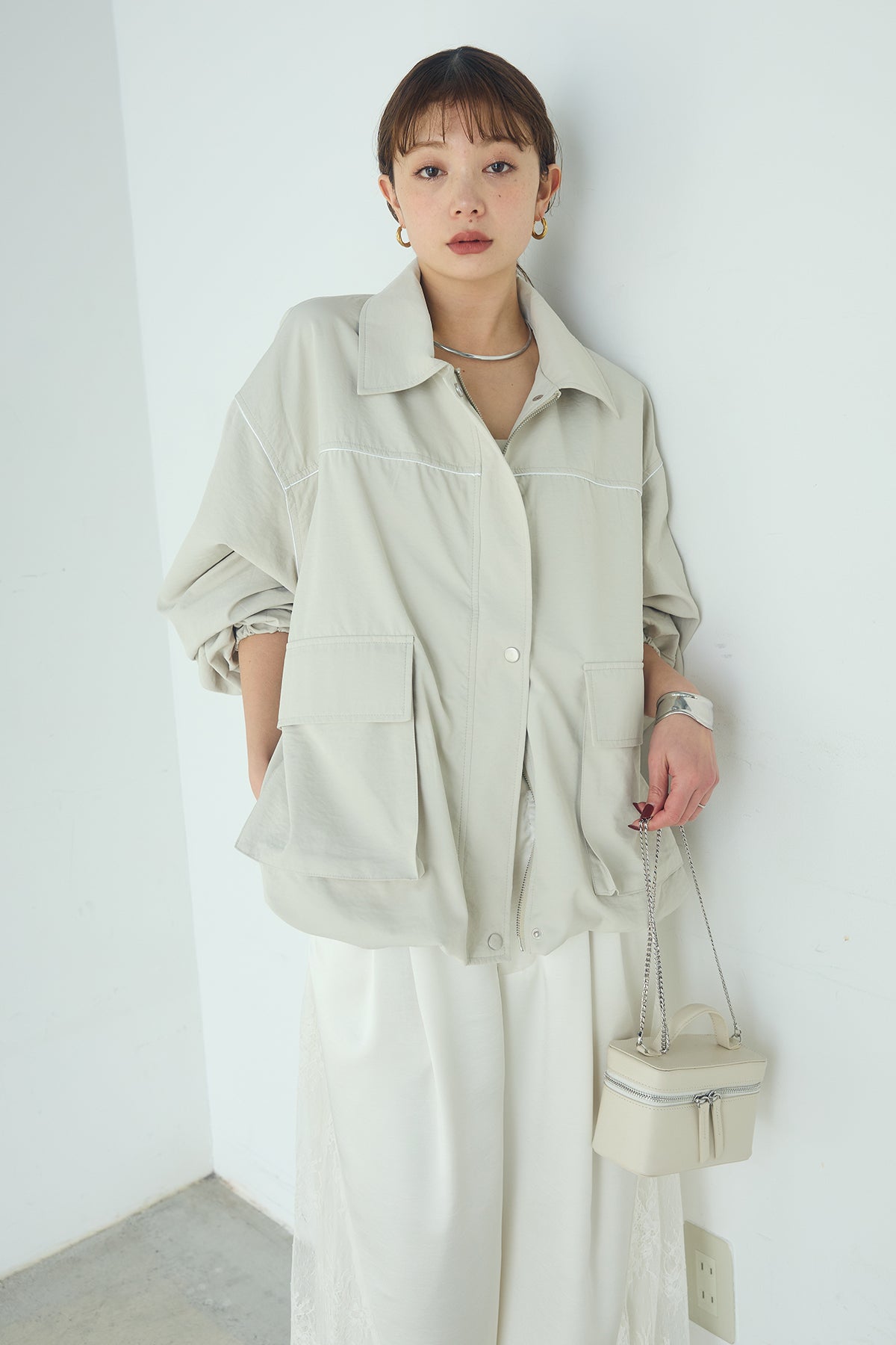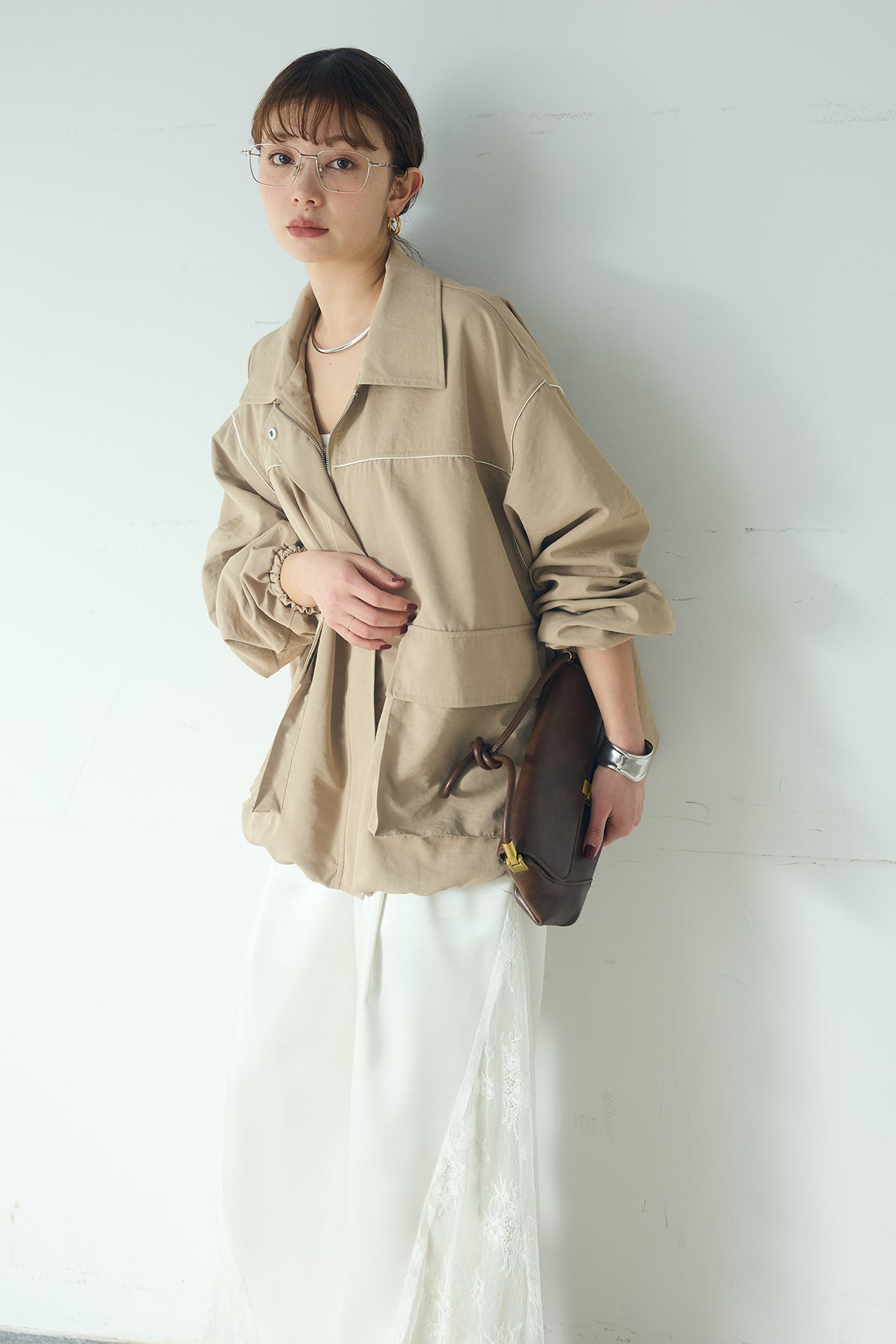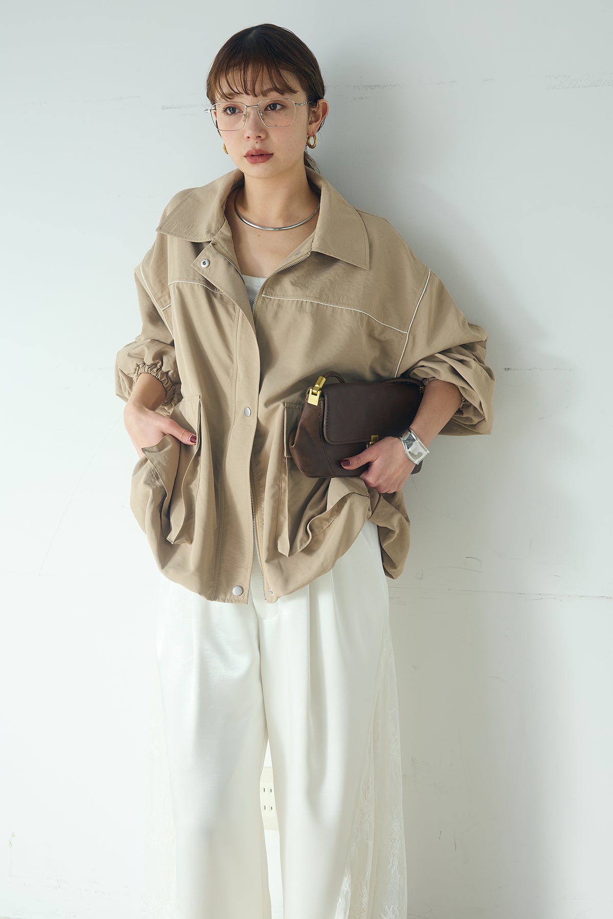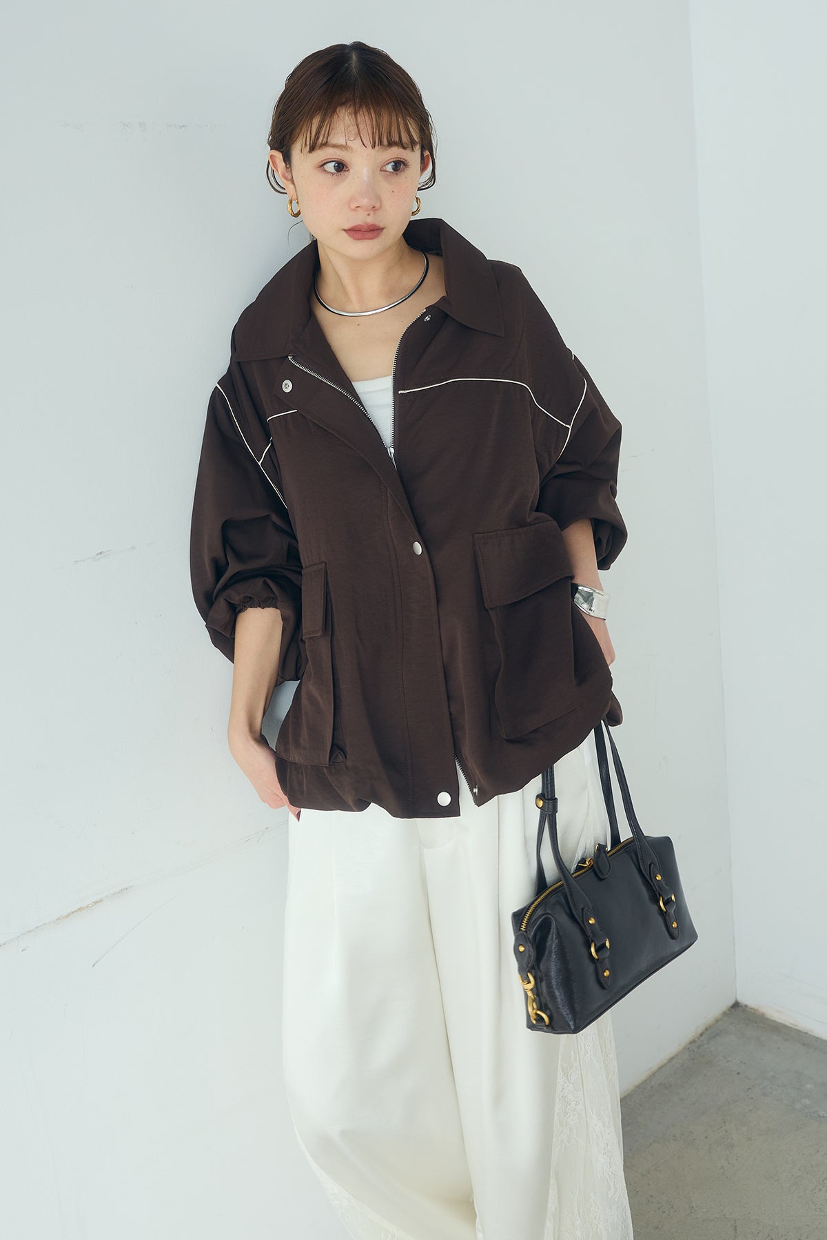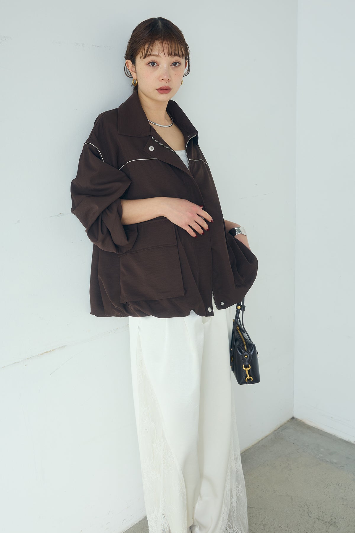 合繊ツイルバルーンジャケット ほどよくハリのある合繊ツイルが立体的なバルーンシルエットを引き立てる一着。 ゆとりのあるフォルムと大きめポケットが程よいアクセントになり、シンプルな中にも奥行きのある印象に仕上がっています。軽やかな着心地で羽織りやすく、トップスの上からさっと重ねるだけでコーディネートに動きが生まれるのもポイント。きれいめにもラフにも取り入れやすい、汎用性の高いジャケットです。