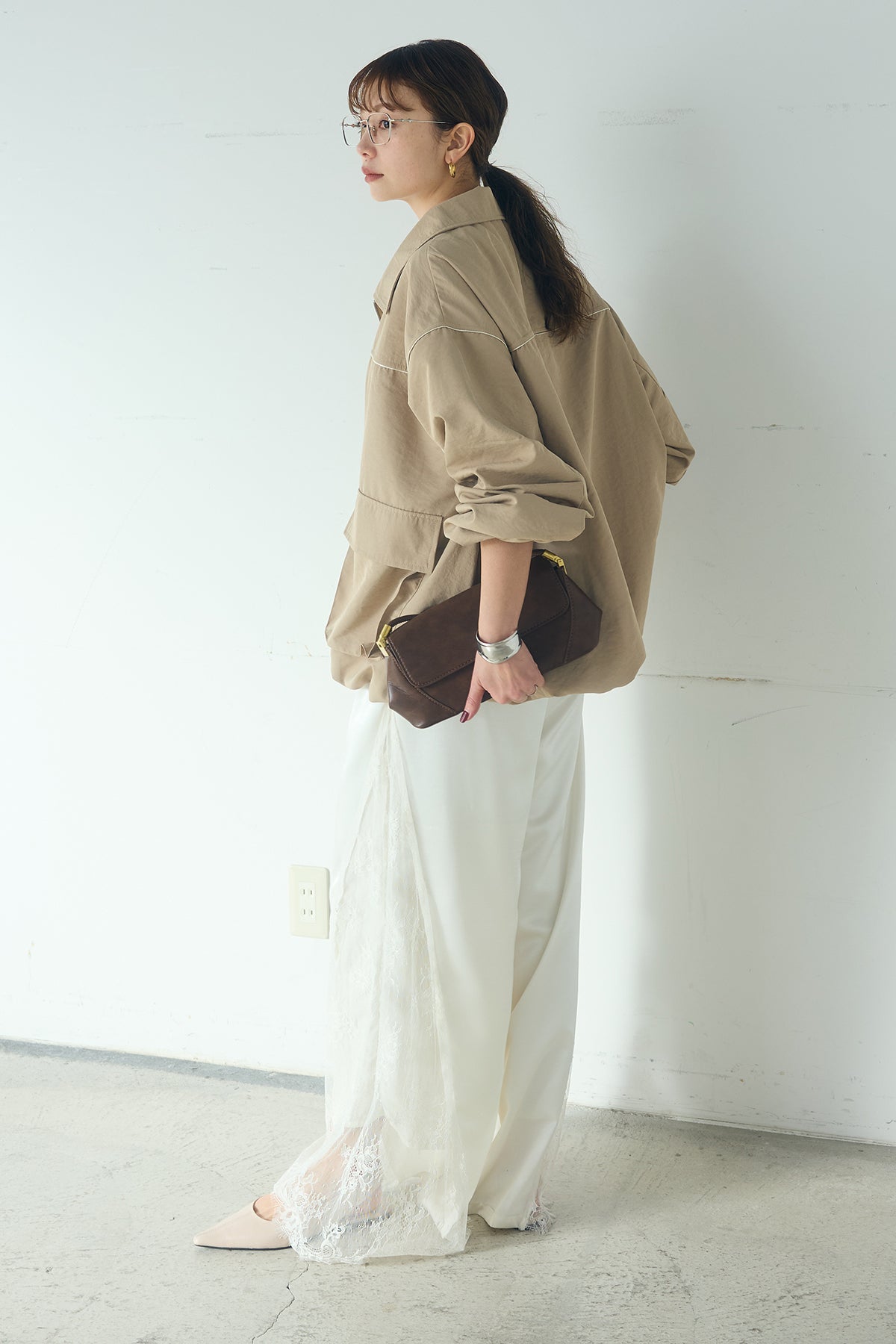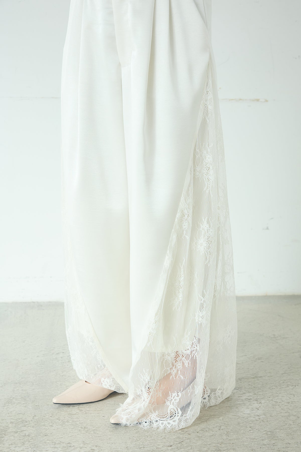 サテンレース切り替えタックパンツ しなやかなサテンの落ち感に、サイドのレース切り替えが奥行きを添えるデザイン。 タック入りのワイドシルエットが縦のラインをきれいに見せ、足元まで流れるようなバランスに仕上がっています。動くたびにレースの表情がさりげなく変化し、シンプルなトップスと合わせても印象に残るスタイリングに。上品さと程よい抜け感を兼ね備え、幅広いコーディネートに取り入れやすい一本です。