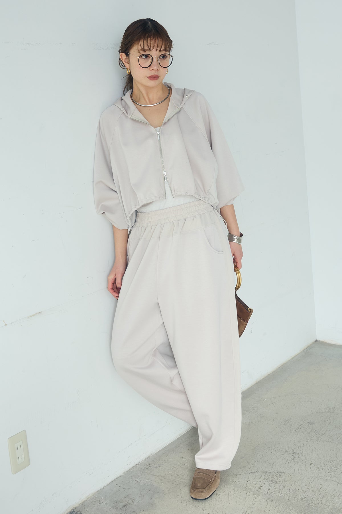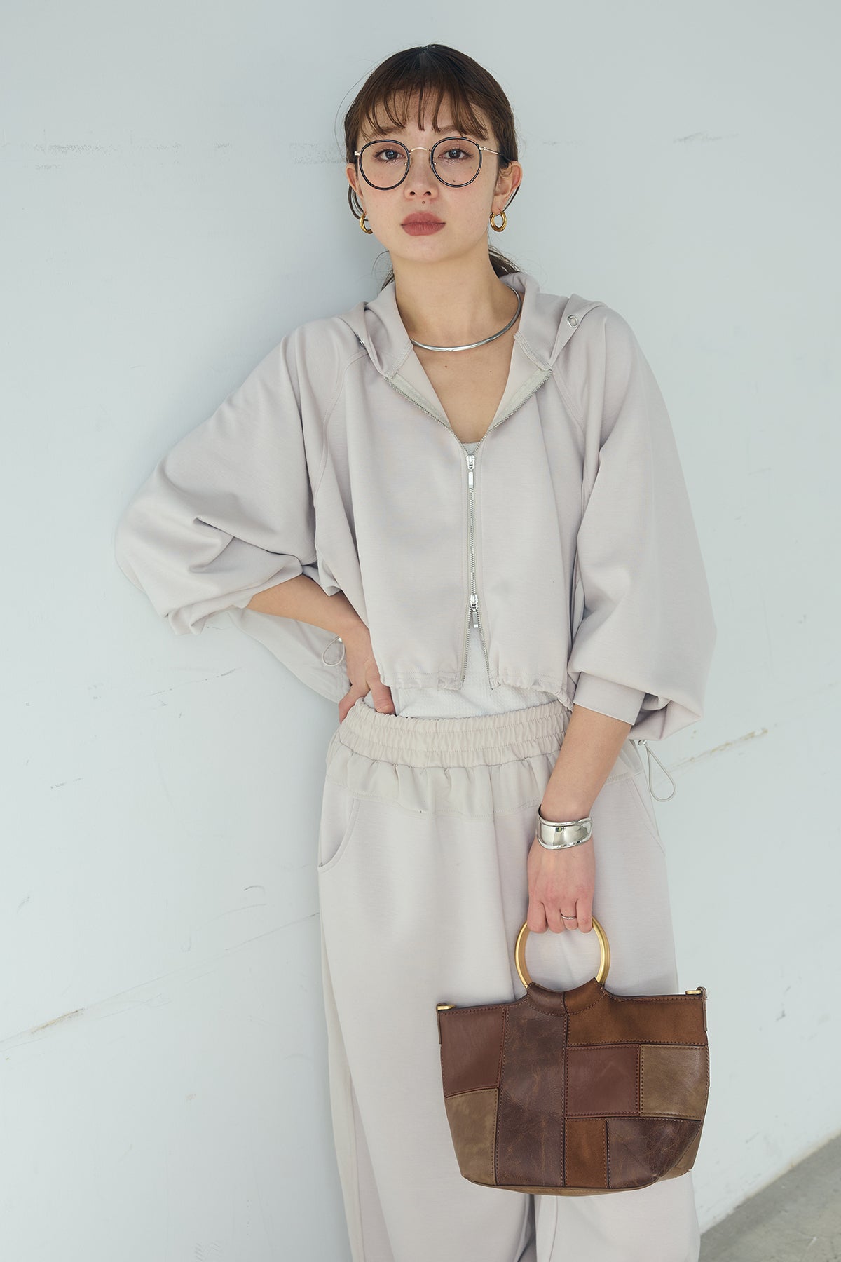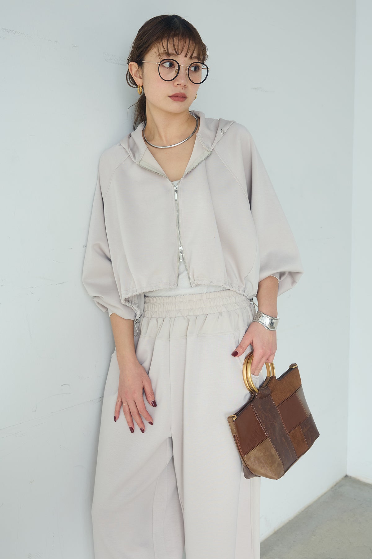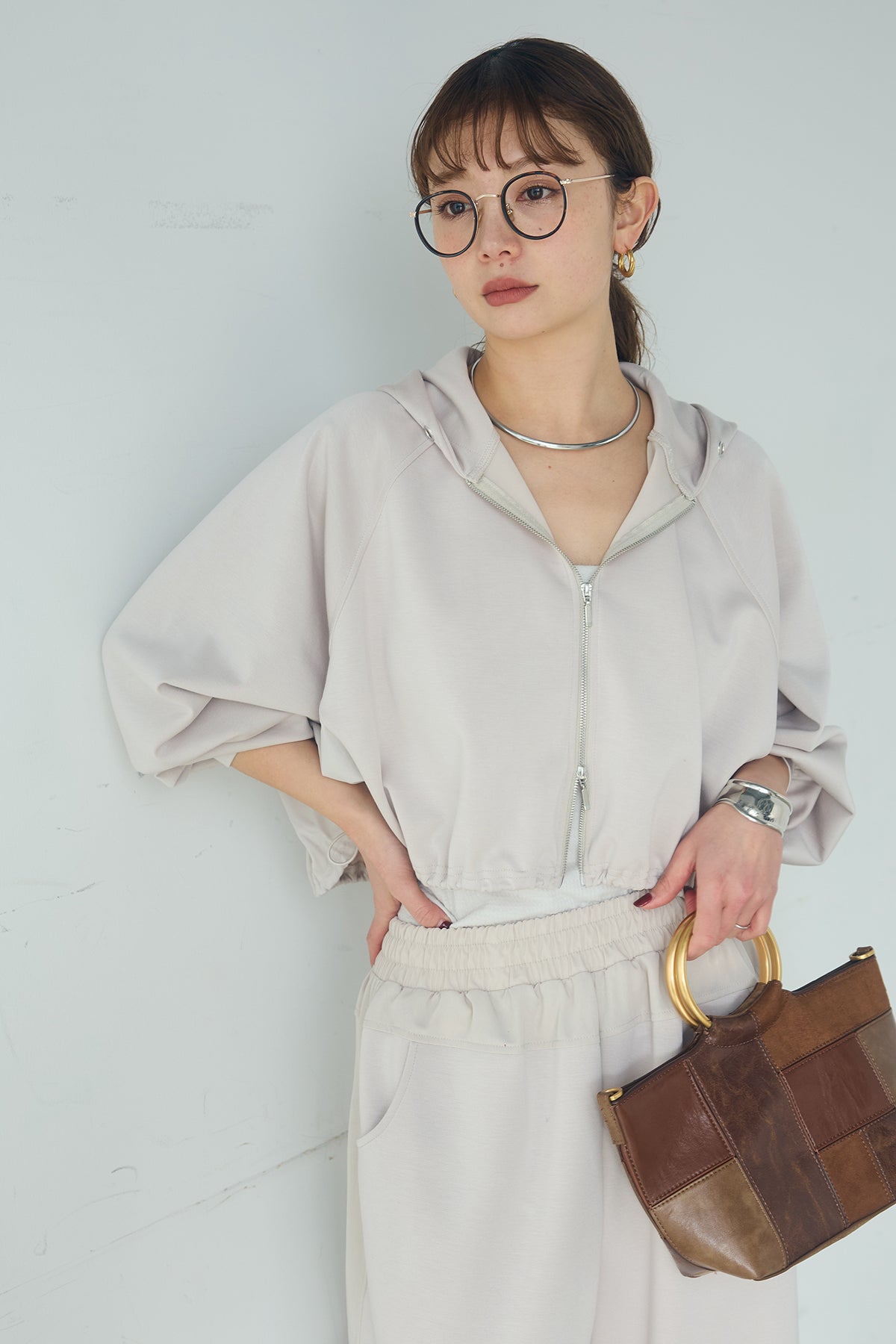 コンパクトな丈感とドルマンスリーブのバランスが、軽やかな印象をつくるフーディー。 ジップ仕様で開け閉めしやすく、インナーとのレイヤードも楽しめるデザインです。 身頃にほどよいゆとりがありつつ、裾はすっきりとまとまるシルエットで、ワイドパンツやスカートとも好相性。 アウター感覚でも使いやすく、日常のスタイリングに取り入れやすい一枚です。