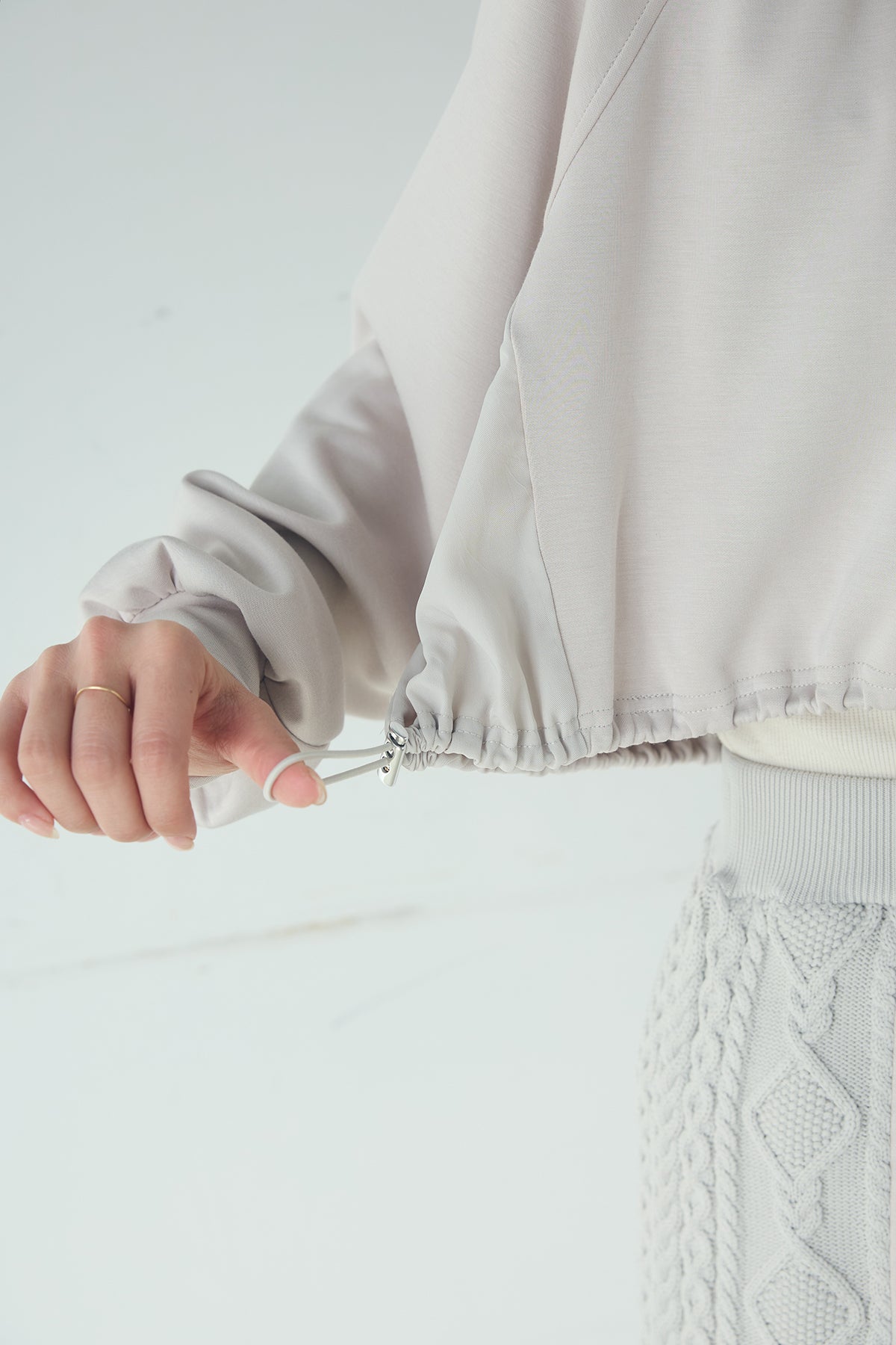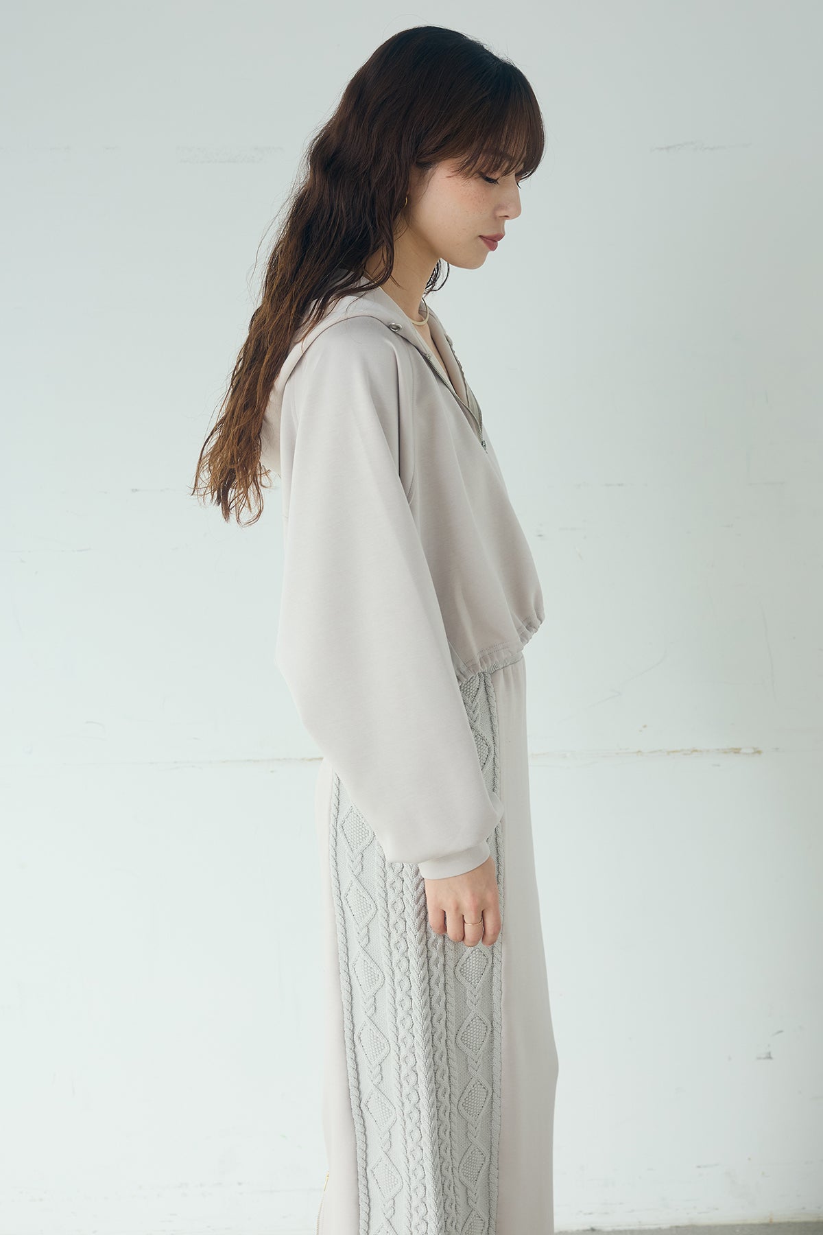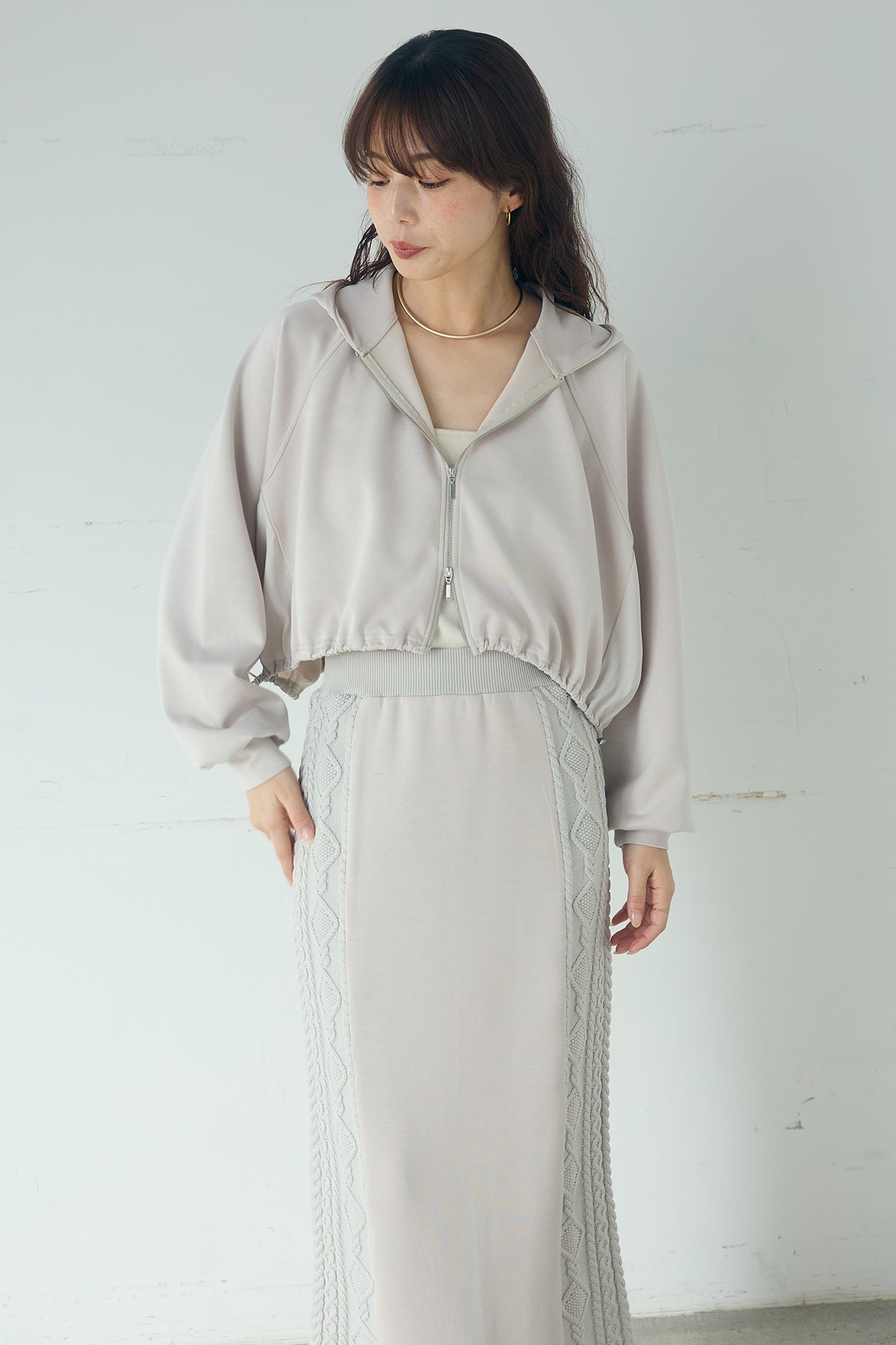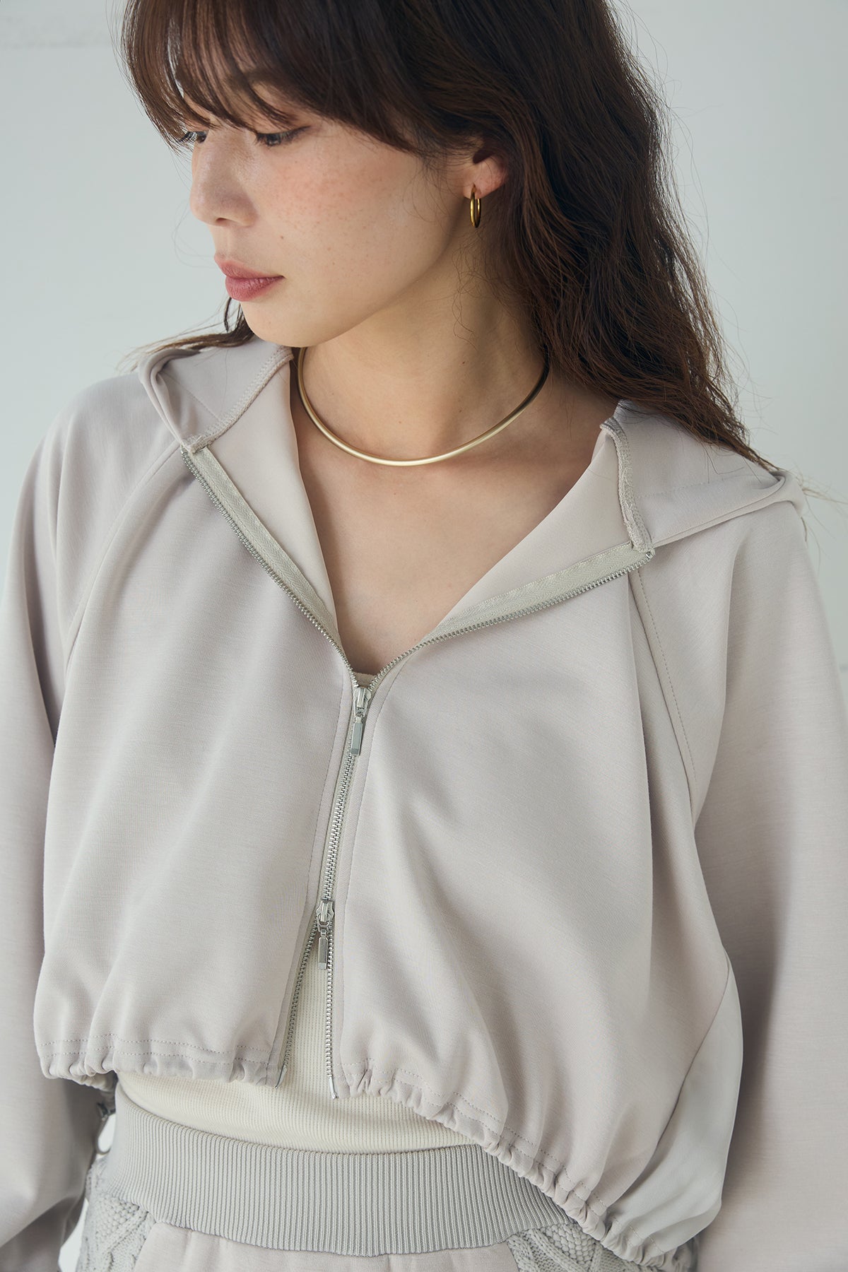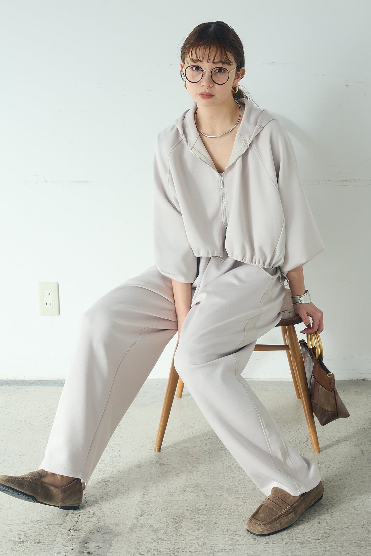 コンパクトな丈感とドルマンスリーブのバランスが、軽やかな印象をつくるフーディー。 ジップ仕様で開け閉めしやすく、インナーとのレイヤードも楽しめるデザインです。 身頃にほどよいゆとりがありつつ、裾はすっきりとまとまるシルエットで、ワイドパンツやスカートとも好相性。 アウター感覚でも使いやすく、日常のスタイリングに取り入れやすい一枚です。
