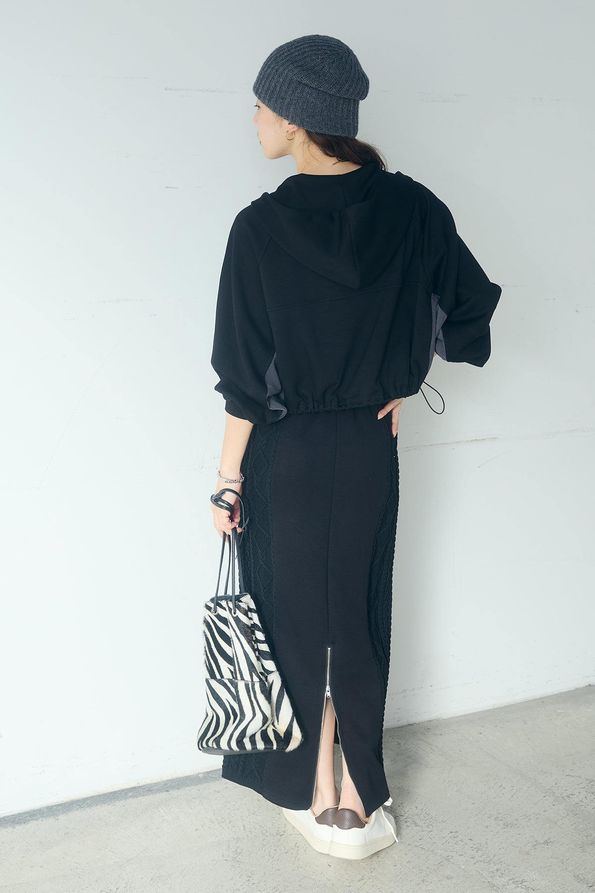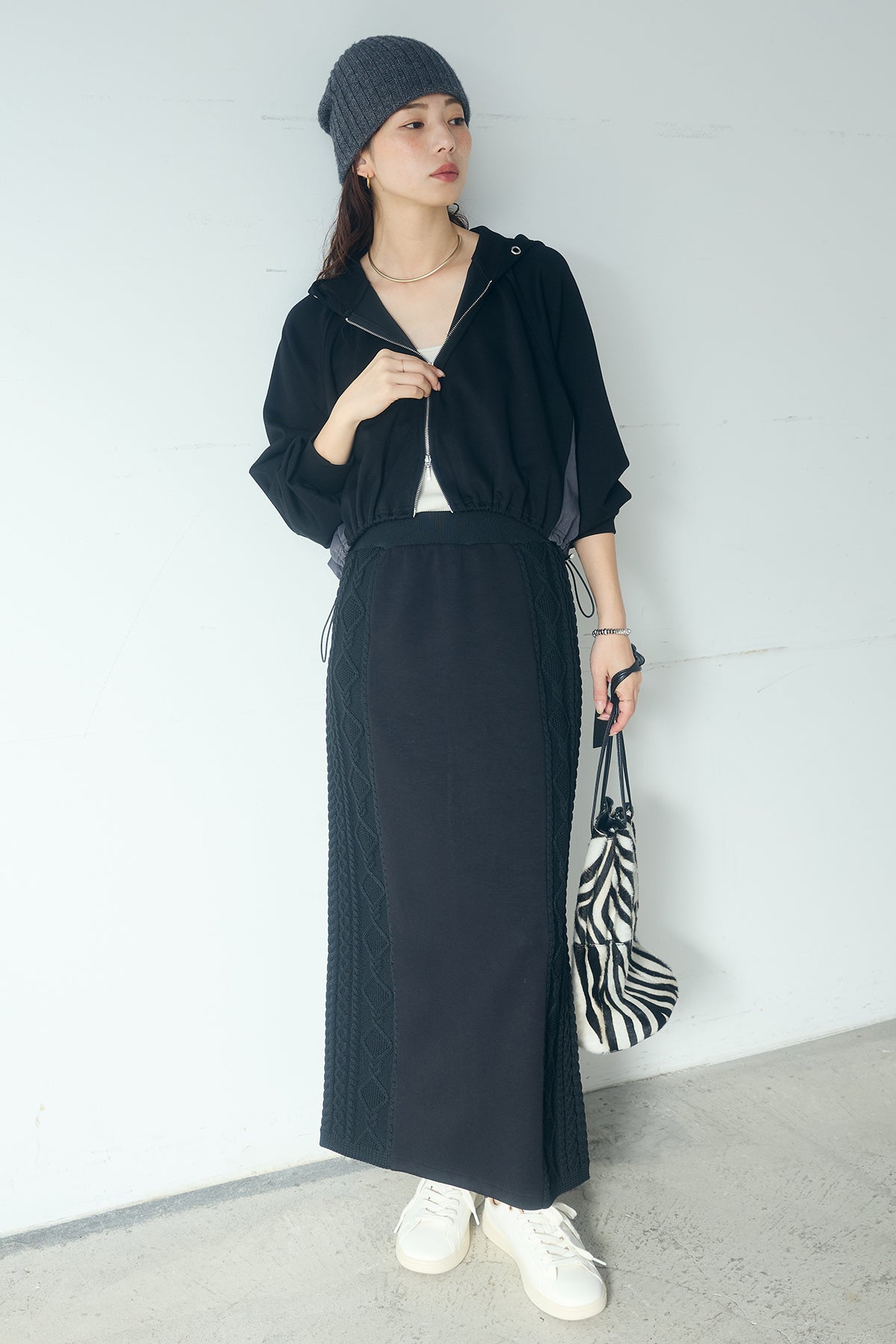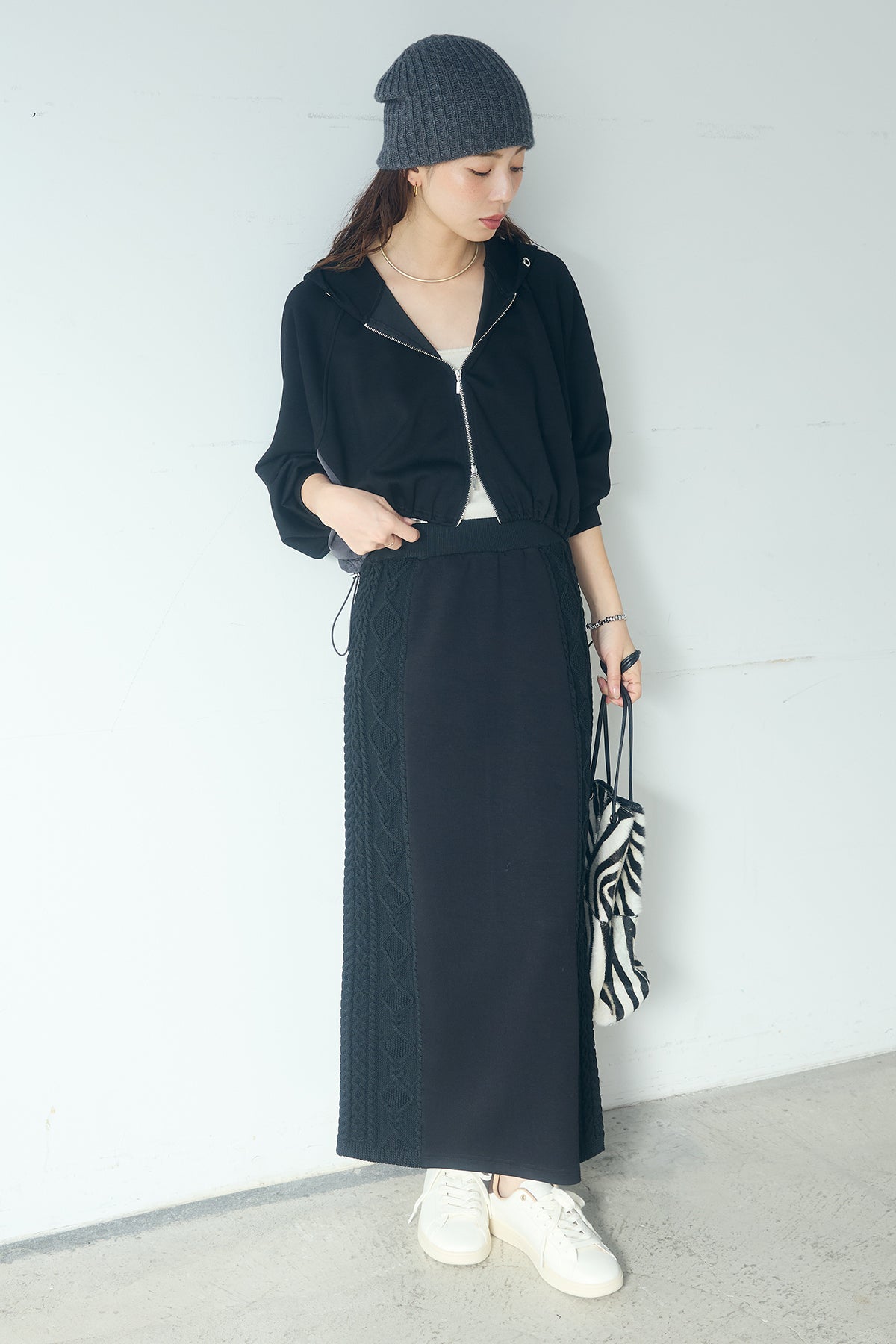 [SET]ドルマンショートフーディー+異素材ドッキングケーブルニットスカート(2set)