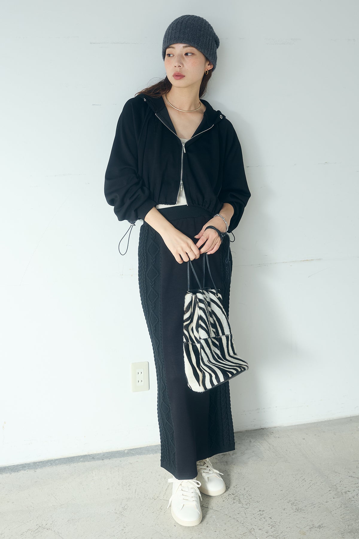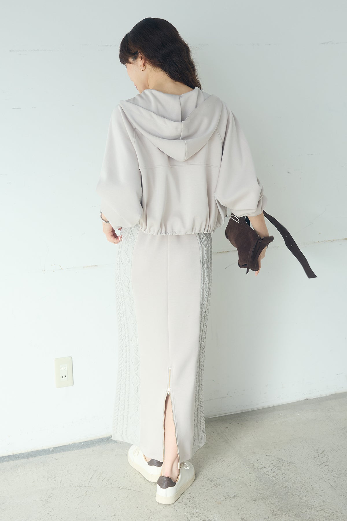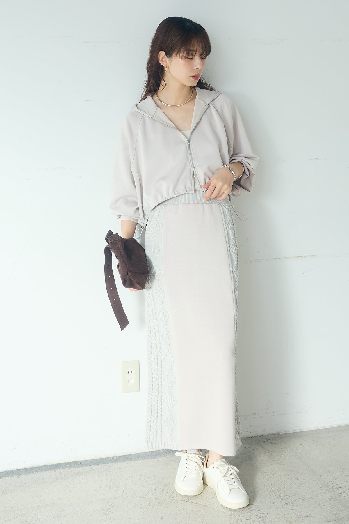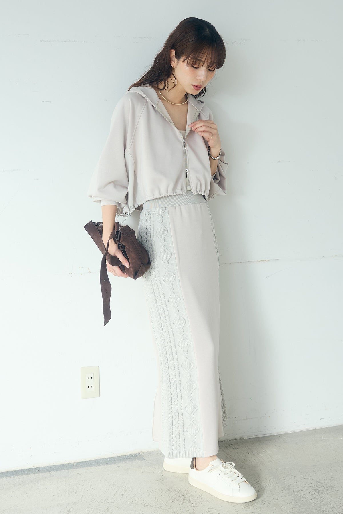 [SET]ドルマンショートフーディー+異素材ドッキングケーブルニットスカート(2set)
