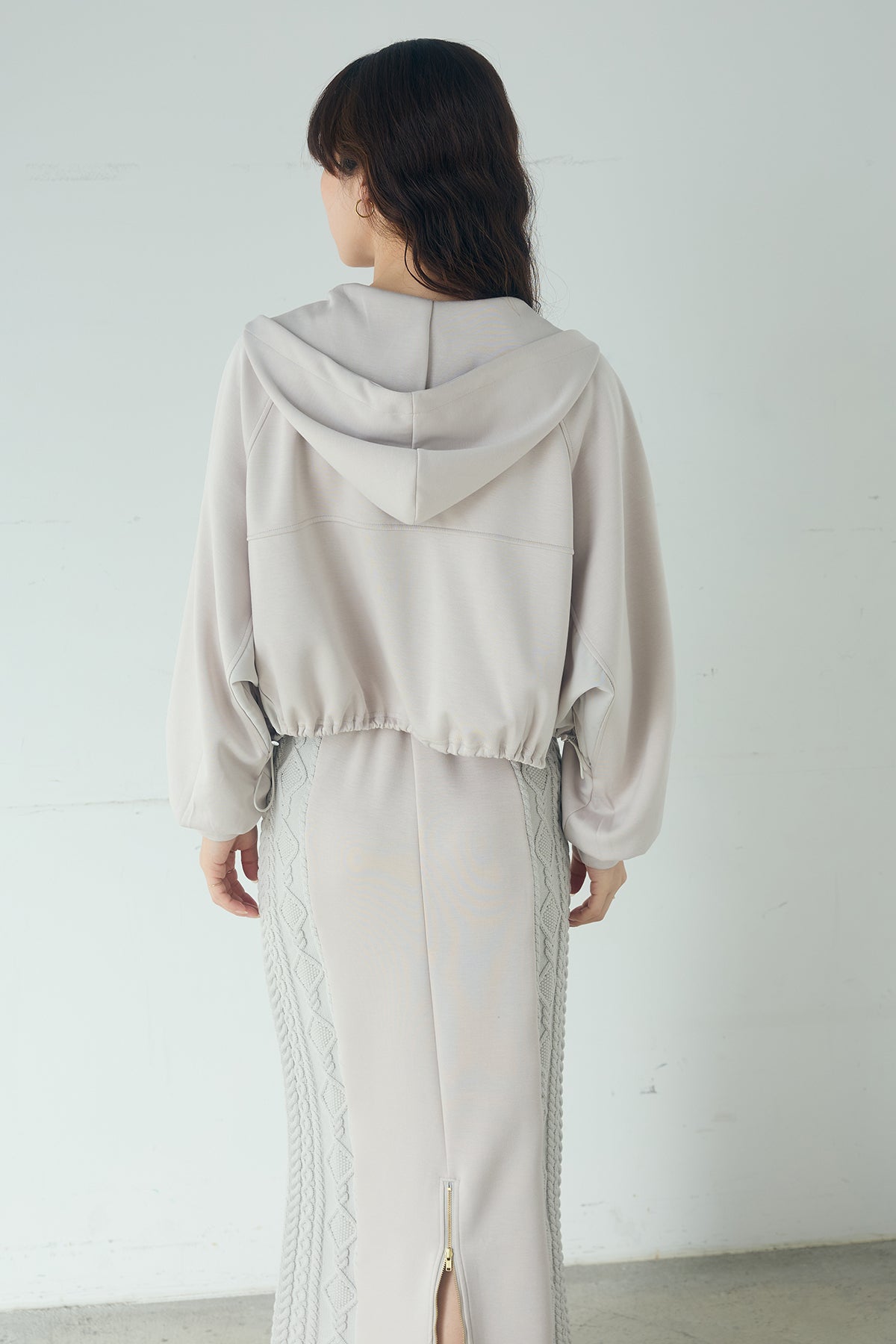 コンパクトな丈感とドルマンスリーブのバランスが、軽やかな印象をつくるフーディー。 ジップ仕様で開け閉めしやすく、インナーとのレイヤードも楽しめるデザインです。 身頃にほどよいゆとりがありつつ、裾はすっきりとまとまるシルエットで、ワイドパンツやスカートとも好相性。 アウター感覚でも使いやすく、日常のスタイリングに取り入れやすい一枚です。