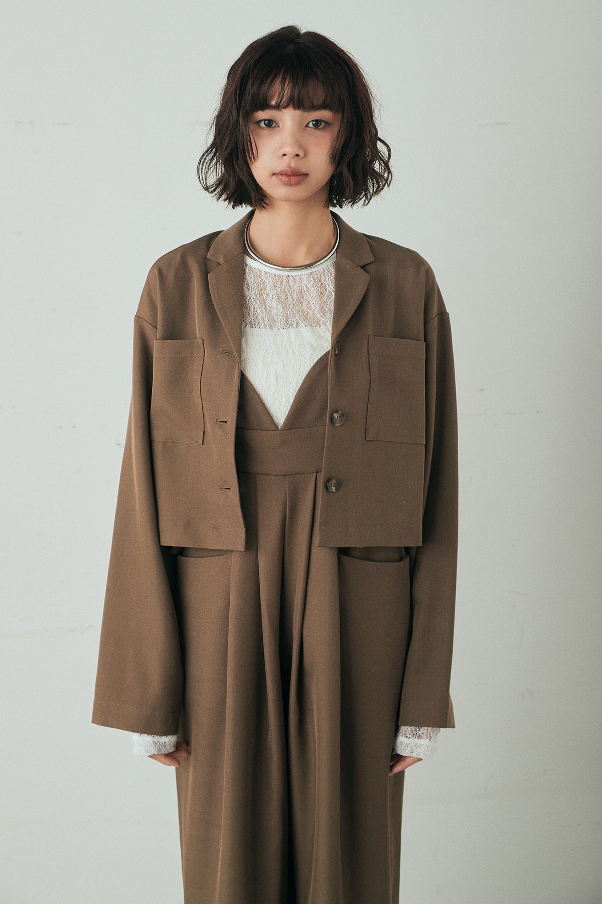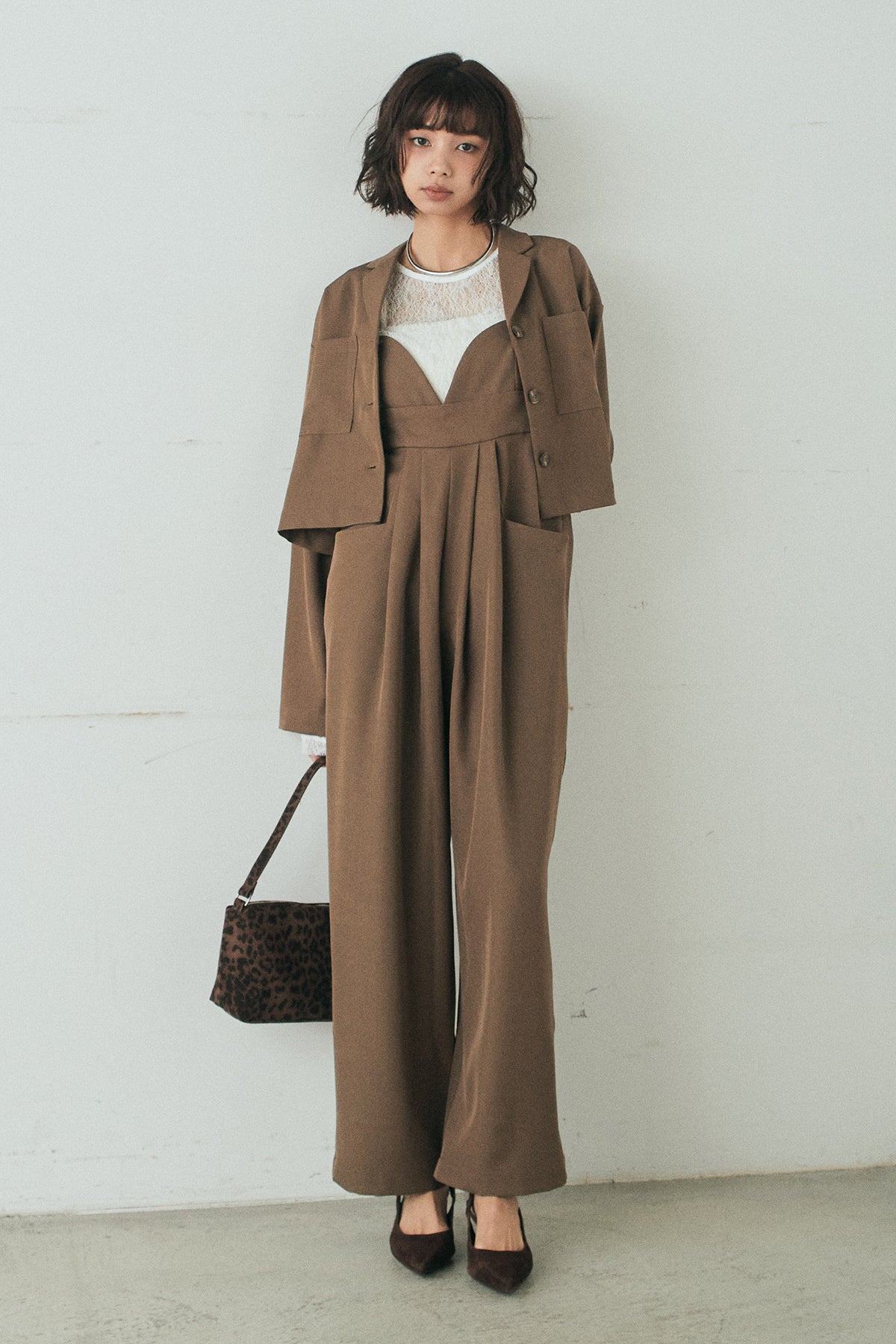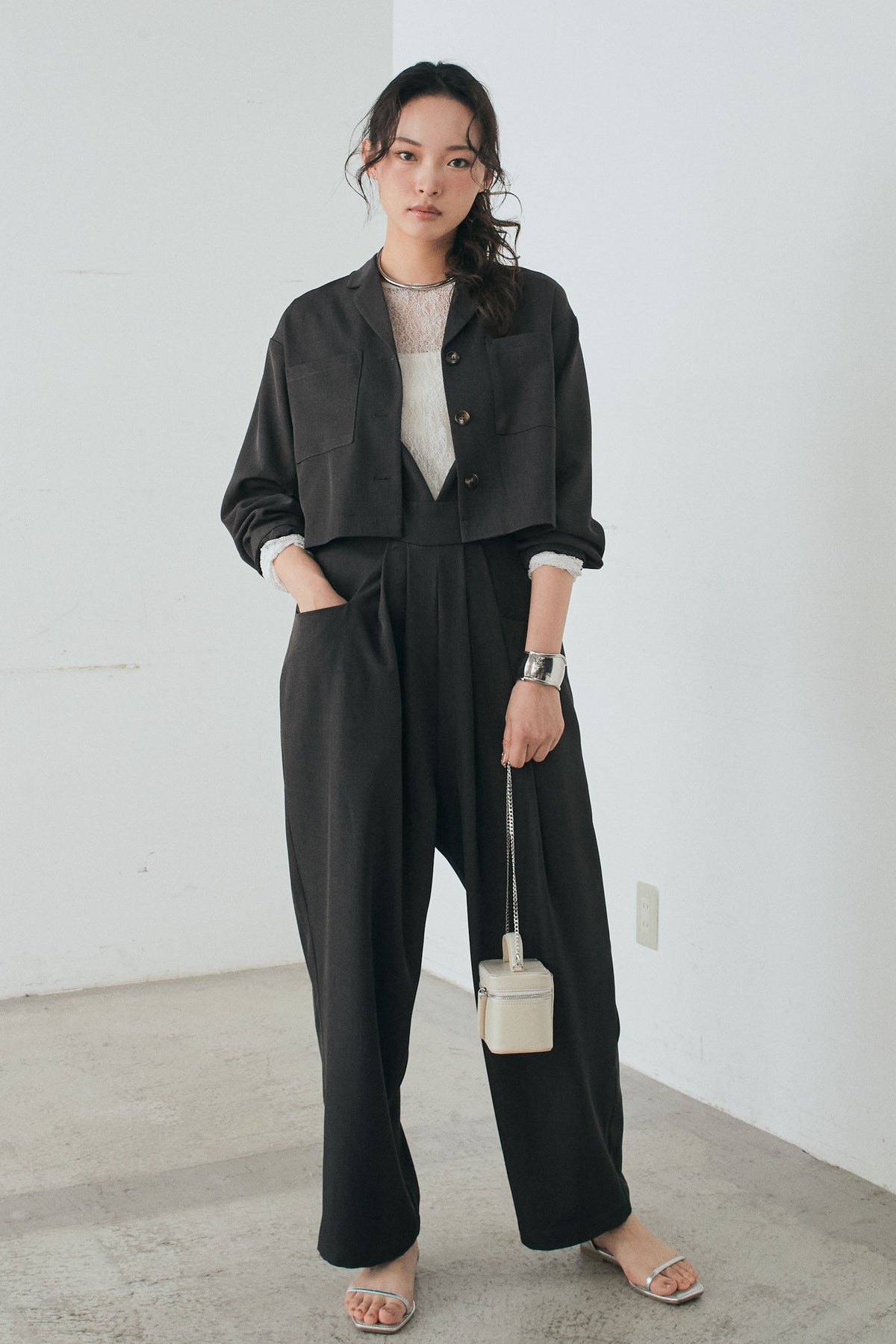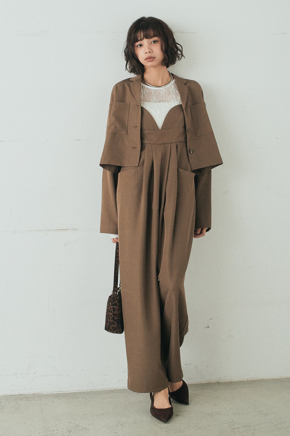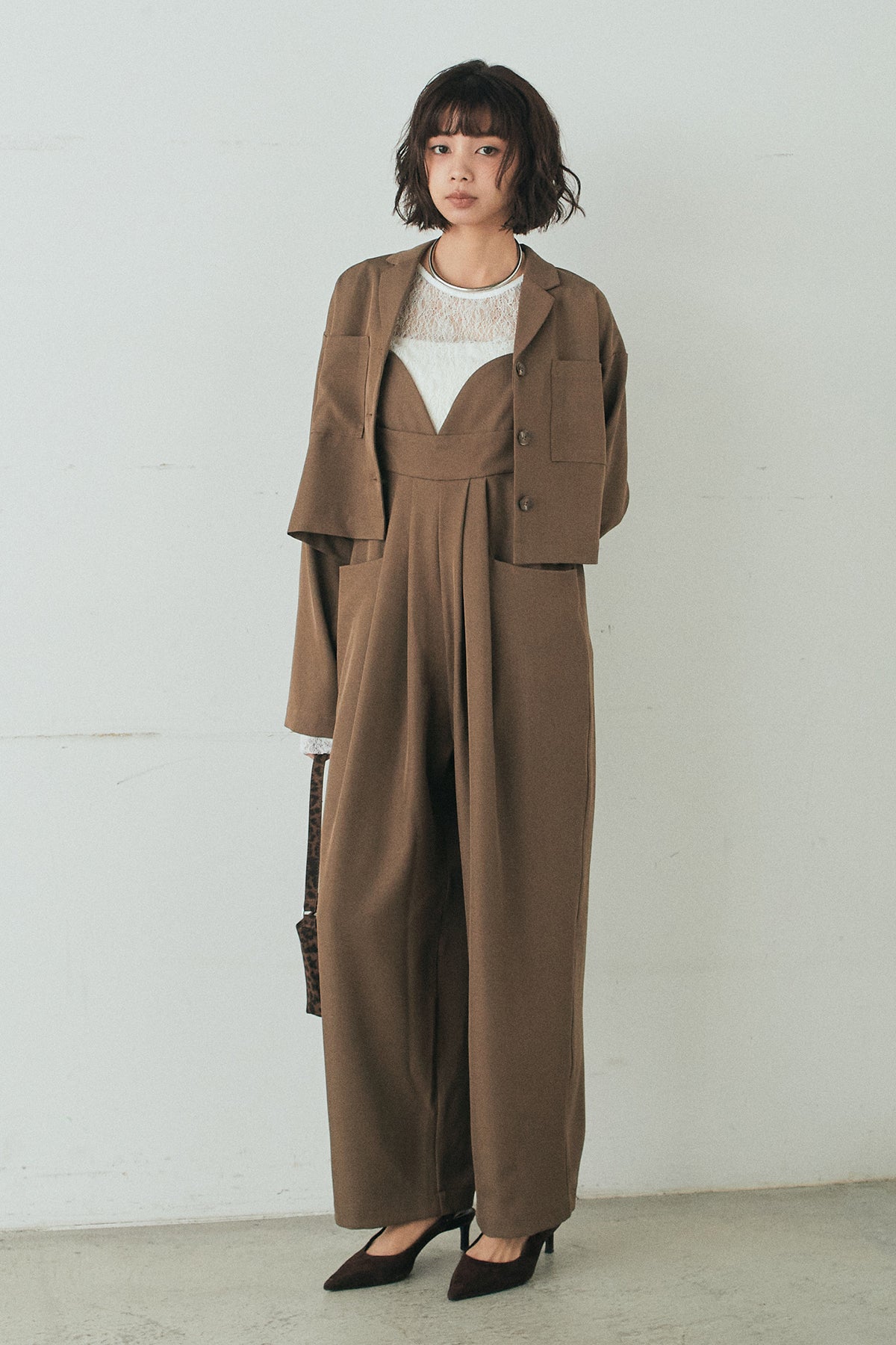 [SET]バックジップデザインショートツイルジャケット+キャミロングオールインワン+ストレッチレースクルーネックインナー(3set)