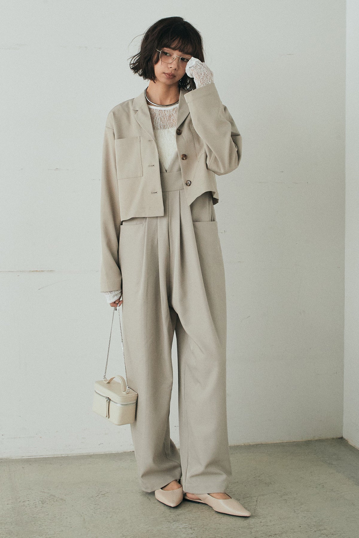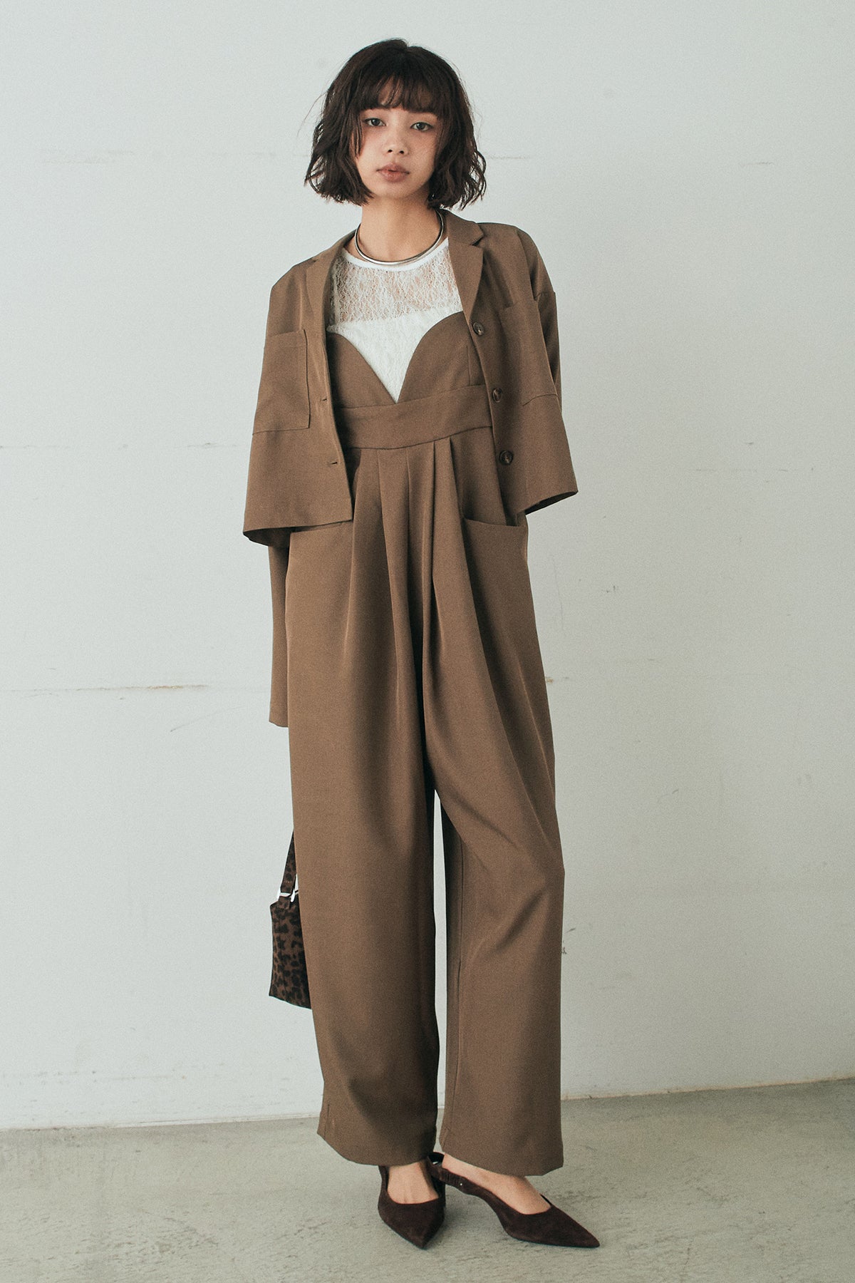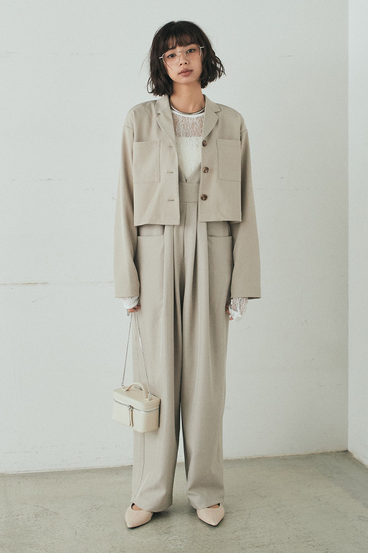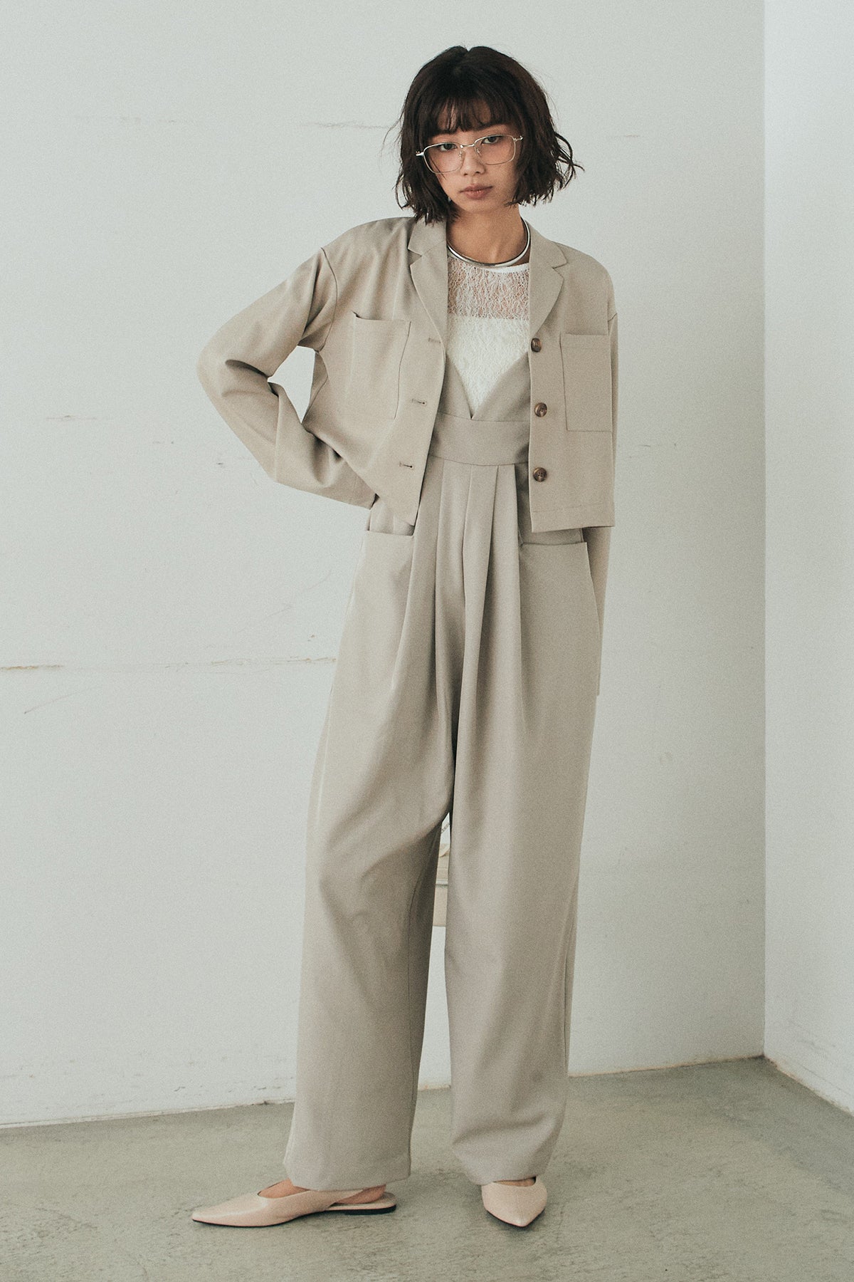 [SET]バックジップデザインショートツイルジャケット+キャミロングオールインワン+ストレッチレースクルーネックインナー(3set)
