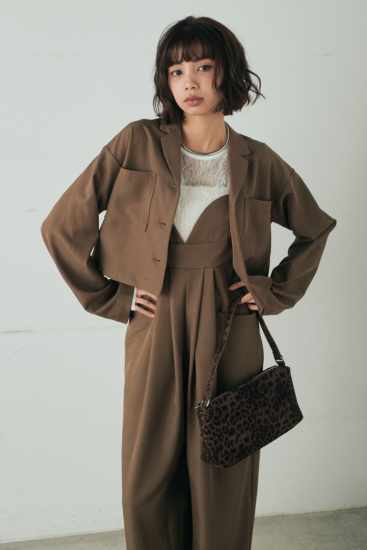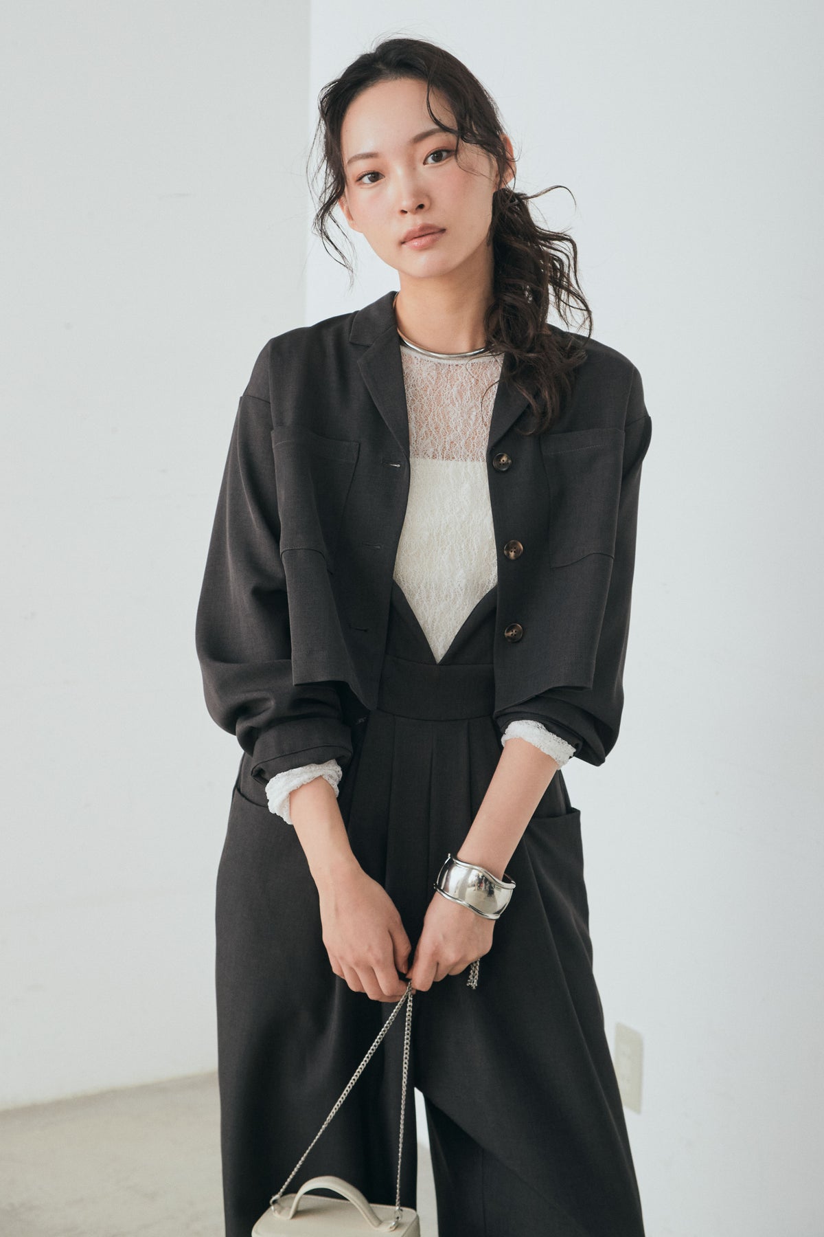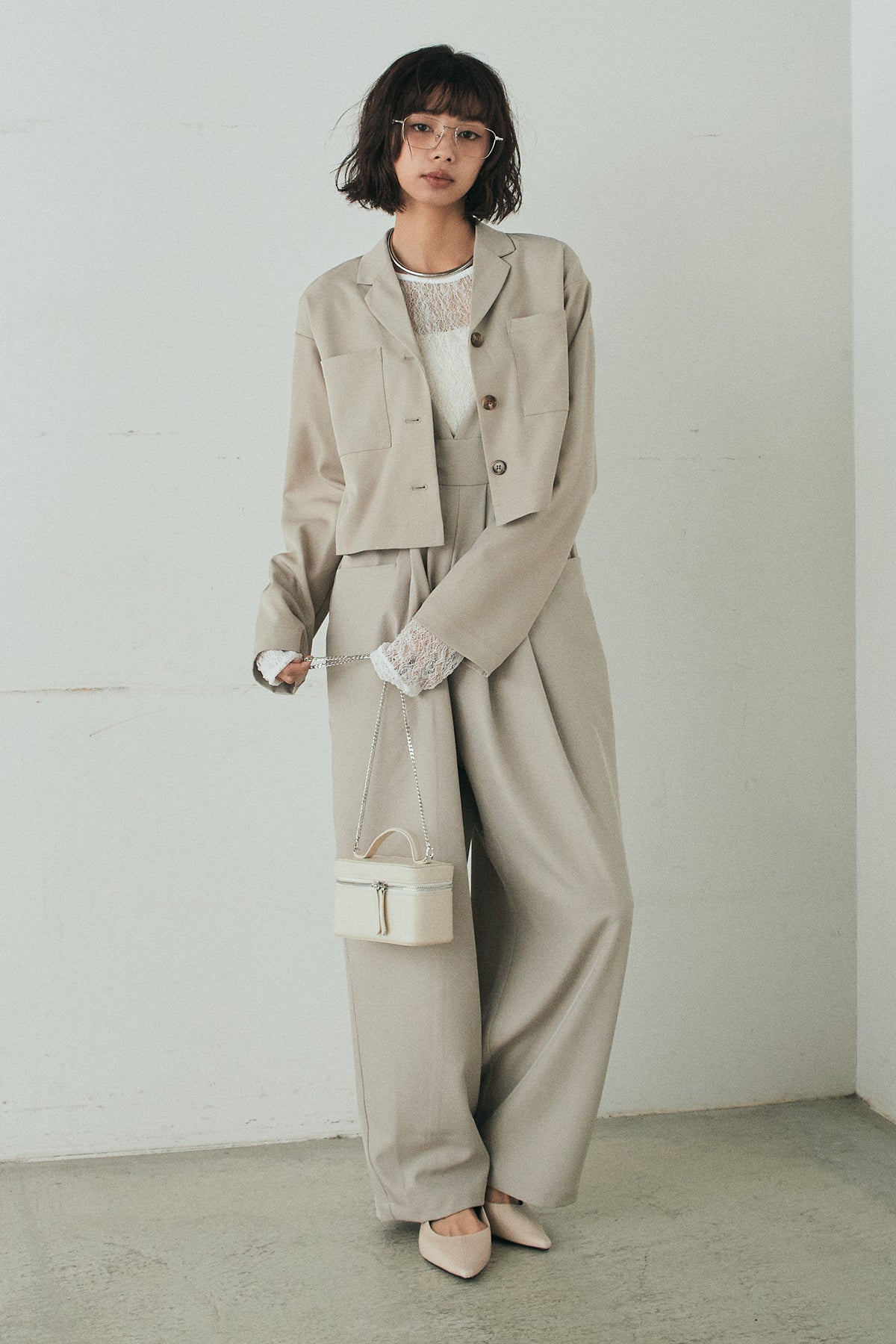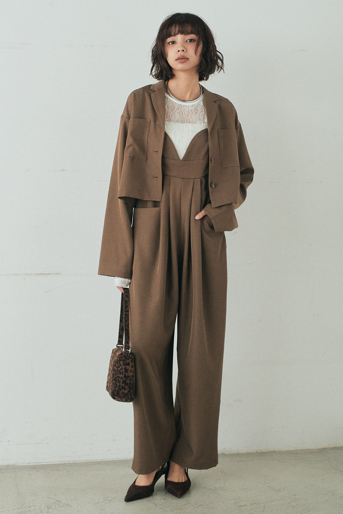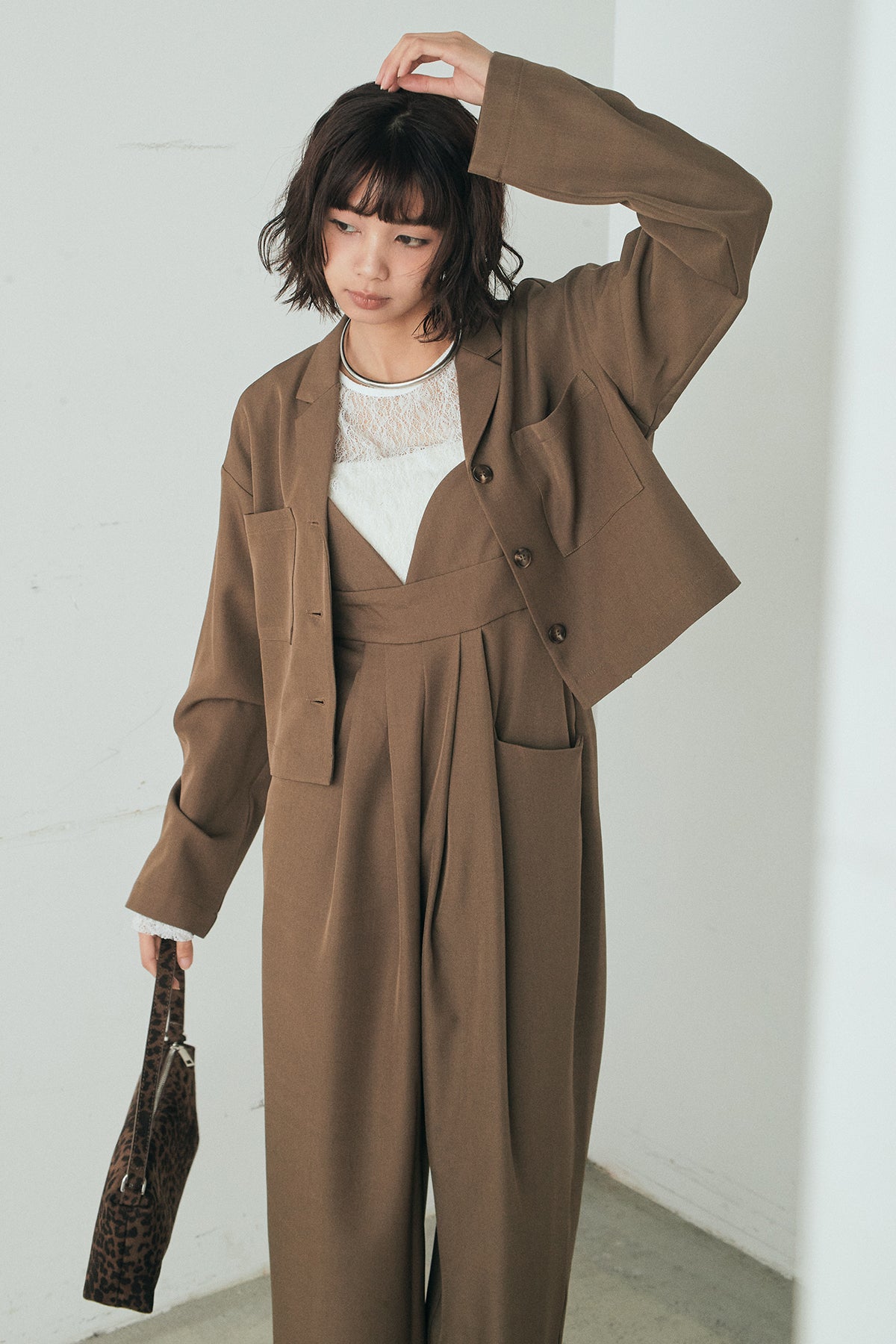 [SET]バックジップデザインショートツイルジャケット+キャミロングオールインワン+ストレッチレースクルーネックインナー(3set)