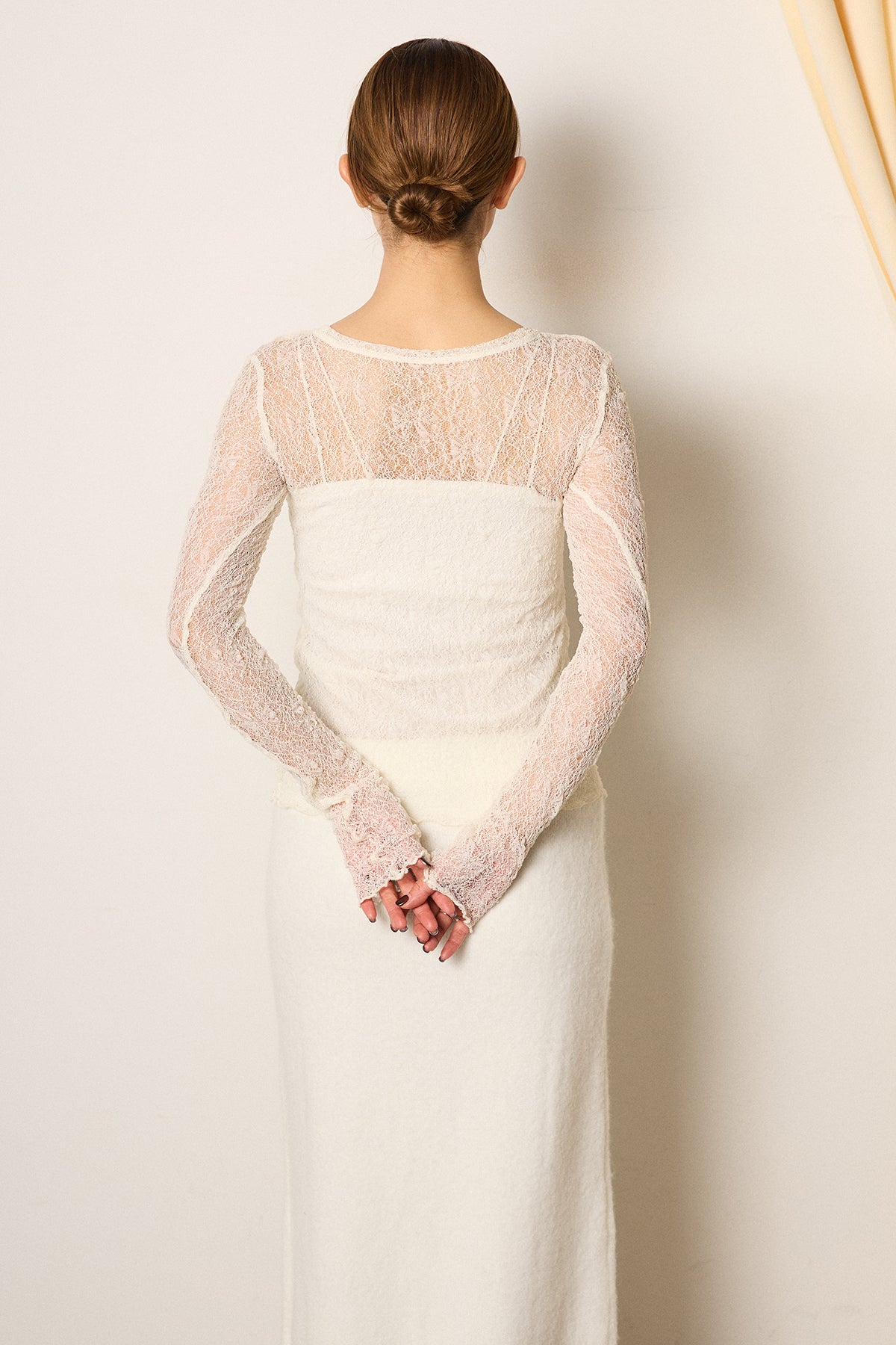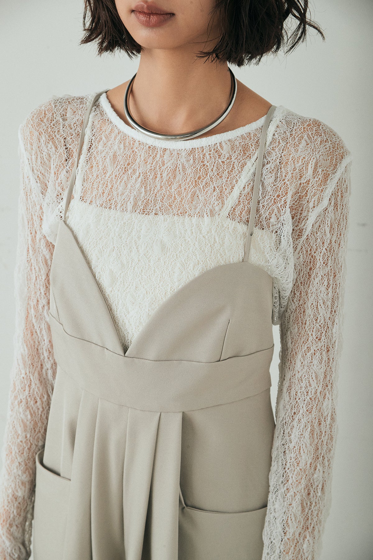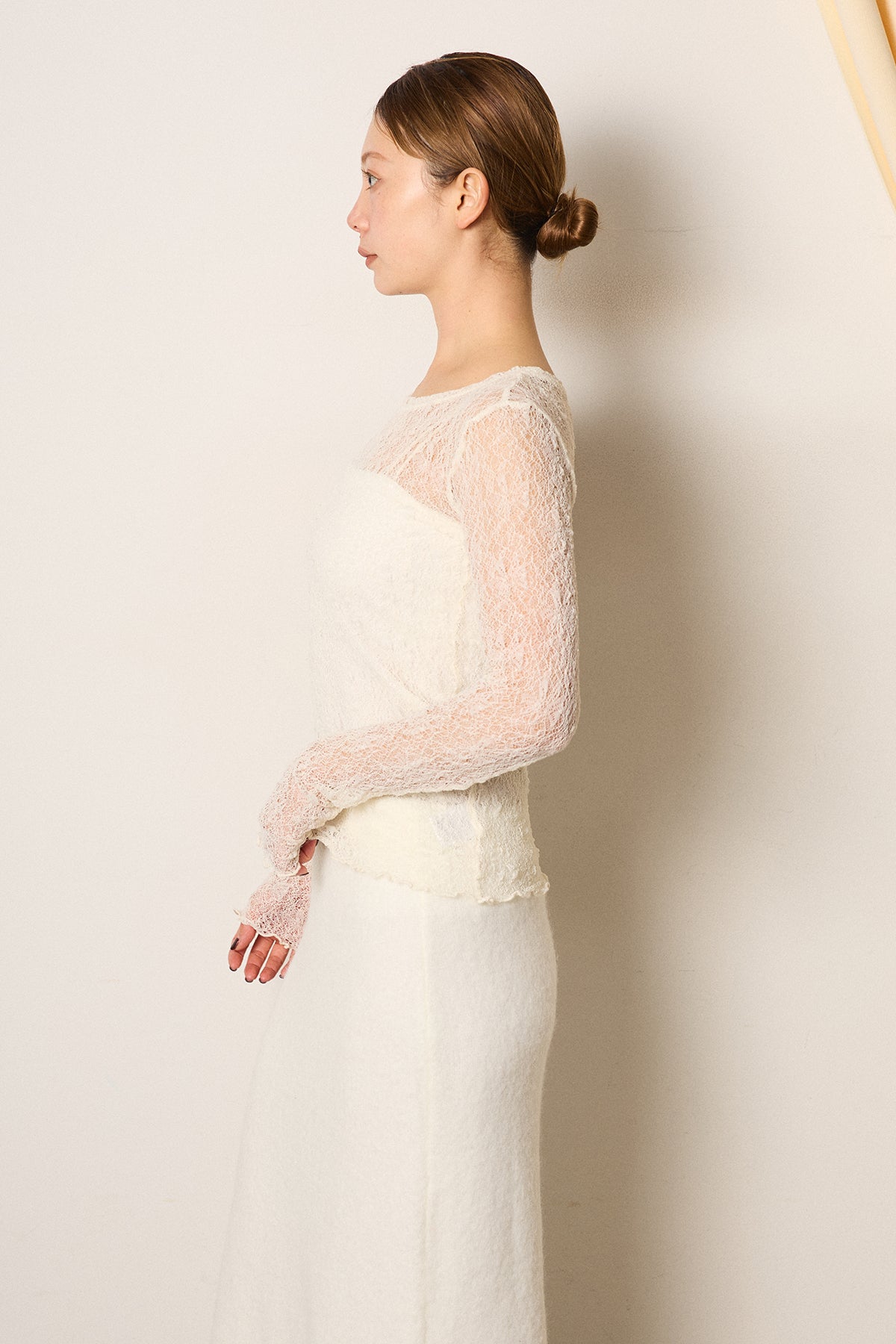 繊細なレース素材を使用した、クルーネックデザインのストレッチインナー。程よい透け感がスタイリングに奥行きを与え、レイヤードに取り入れるだけで女性らしいニュアンスを演出します。ストレッチ性があり、身体に優しくフィットしながらも動きやすい着心地。ニットやジャケットのインナーとして活躍し、コーディネートの幅を広げてくれる一枚です。