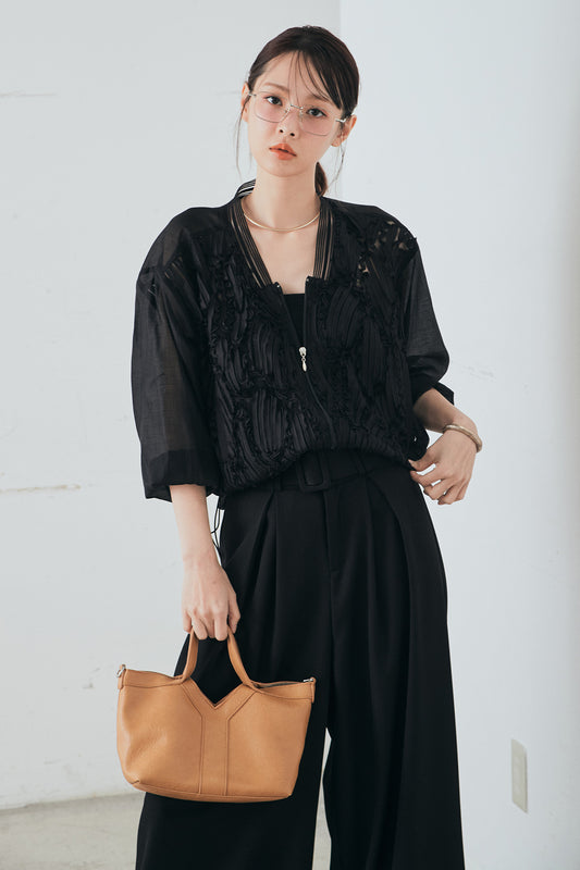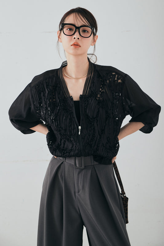 立体感のあるモチーフデザインが印象的なシアーブルゾン。 軽やかな透け感素材に表情のあるディテールを重ね、シンプルなスタイリングにも自然とアクセントをプラスします。コンパクトな丈感とジップ仕様でバランスよく羽織れ、抜け感のある印象に。 カットソーやワンピースにさらっと重ねるだけで、コーディネートに奥行きを与えてくれるアイテムです。
