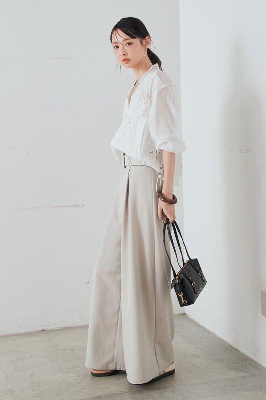 タックデザインと付属ベルトがポイントの、立体感あるワイドパンツ。 フロントのツータックが腰まわりに程よいゆとりを持たせつつ、縦のラインを強調し、すっきりとした印象に仕上げてくれます。 落ち感のある素材で広がりすぎず、カジュアルにもきれいめにも取り入れやすい一本。 トップスをインしてベルトを見せたスタイリングはもちろん、短丈トップスとの相性も良く、バランスよくまとまります。