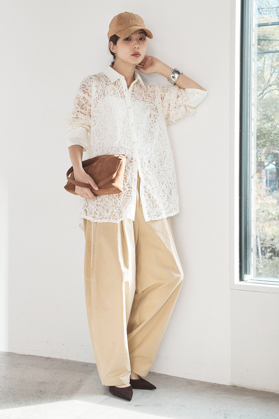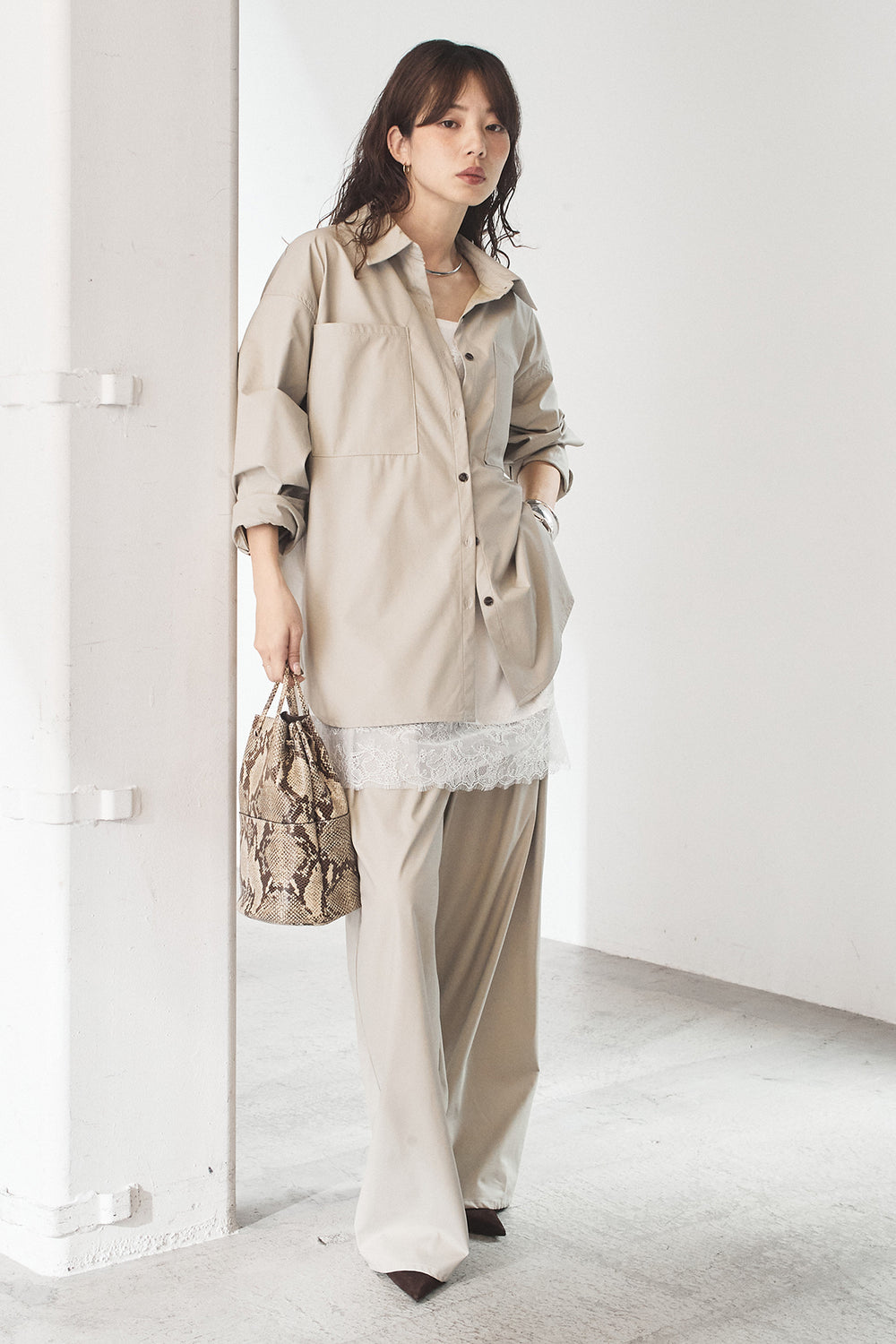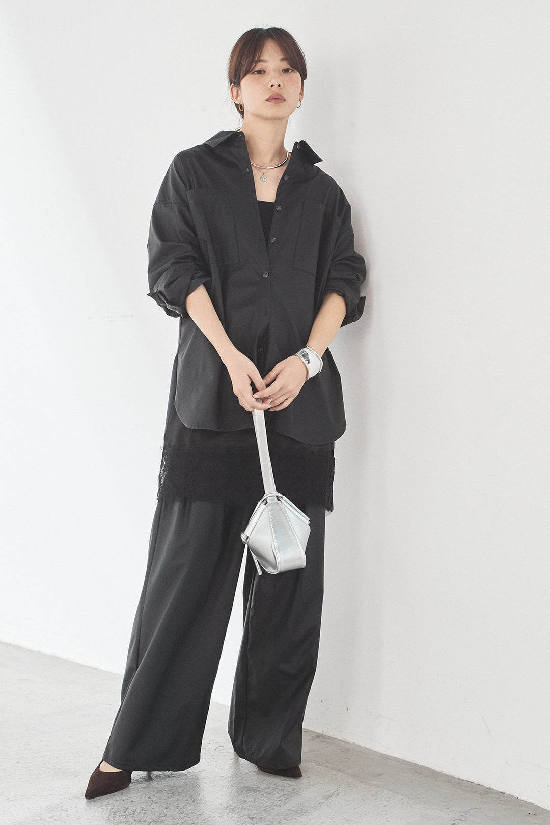 [SET]刺繍レースオーバーサイズシャツ+合繊ツイルパイピングタックカーブパンツ(2set)