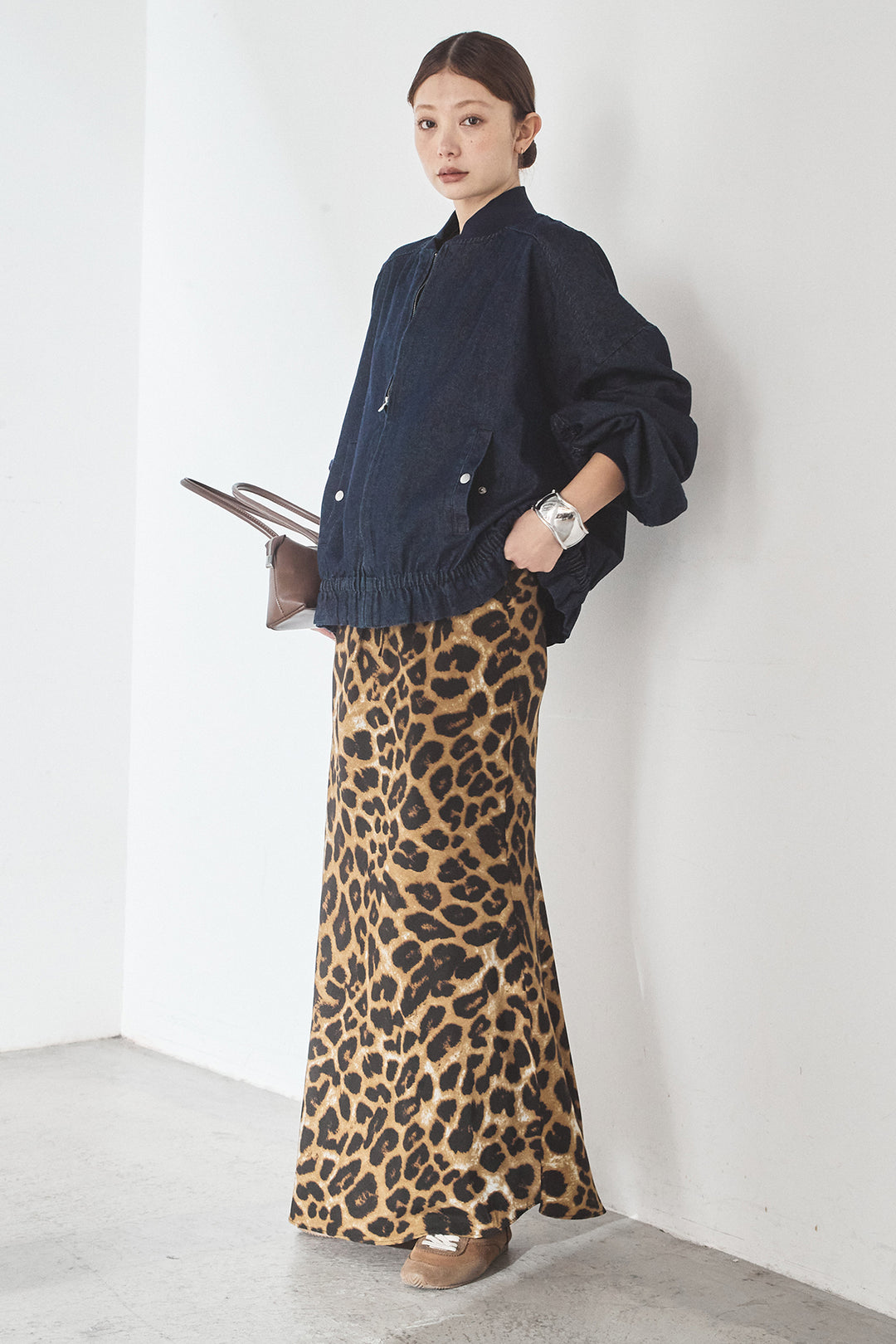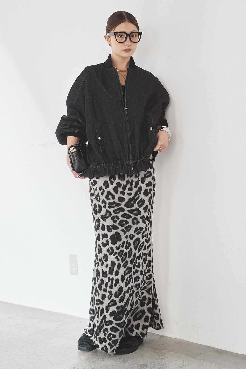 [SET]袖シャーリング裾フリルデニムブルゾン+レオパードサテンナロースカート(2set)