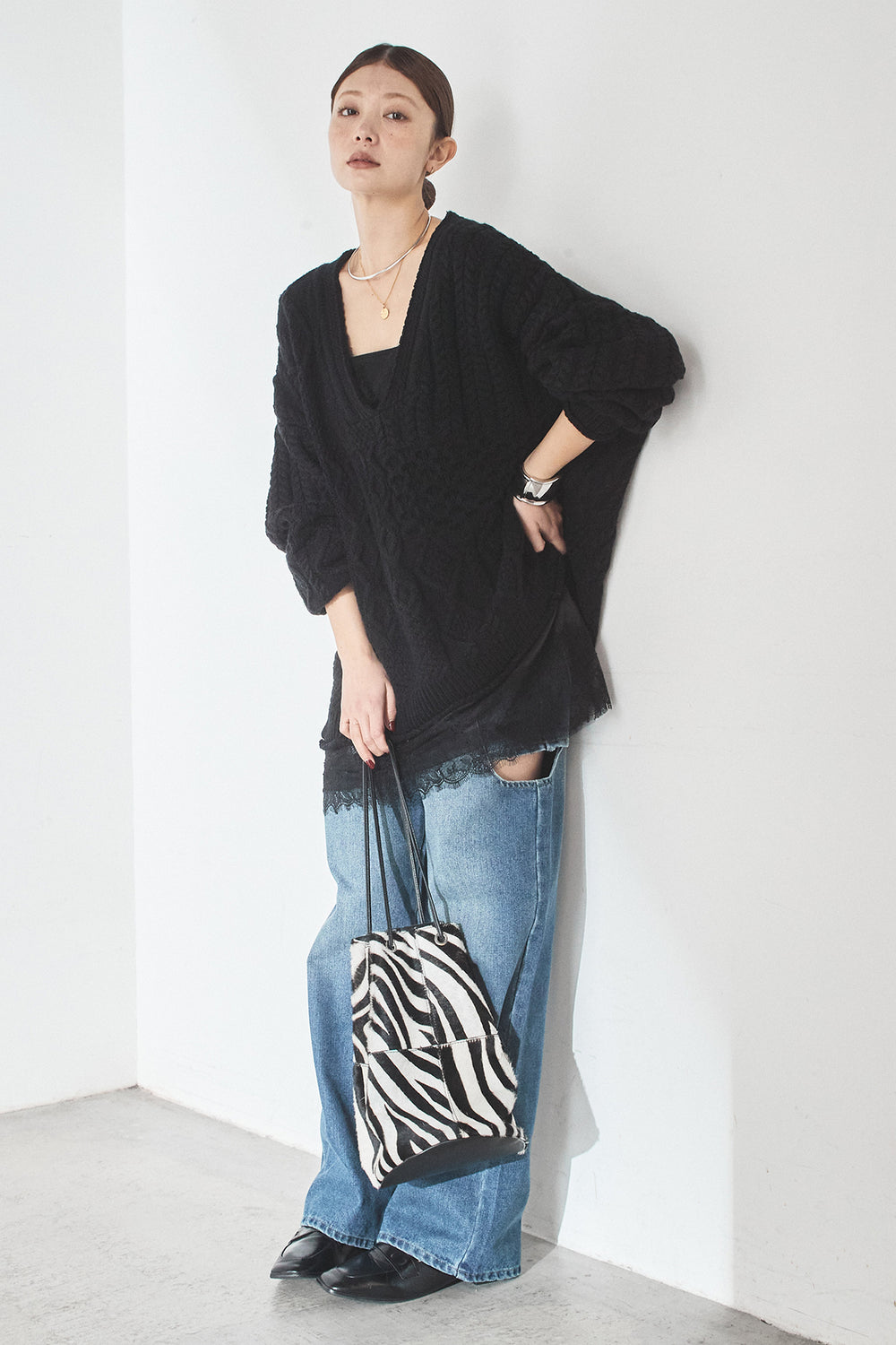 [SET]ケーブルVニットセーター+デニムサイドカットパンツ(2set)