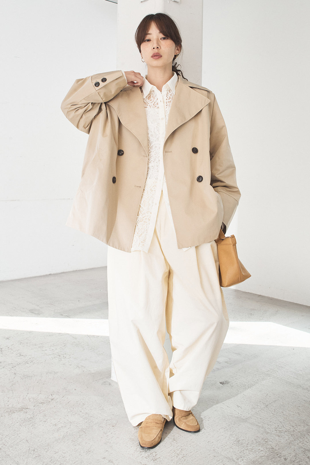 [SET]ナイロントレンチコート+合繊ツイルパイピングタックカーブパンツ+刺繍レースオーバーサイズシャツ(3set)