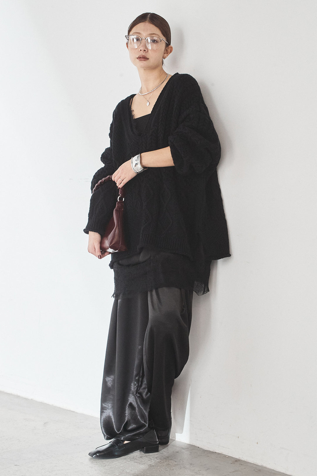 [SET]ケーブルVニットセーター+サテンタックワイドパンツ(2set)