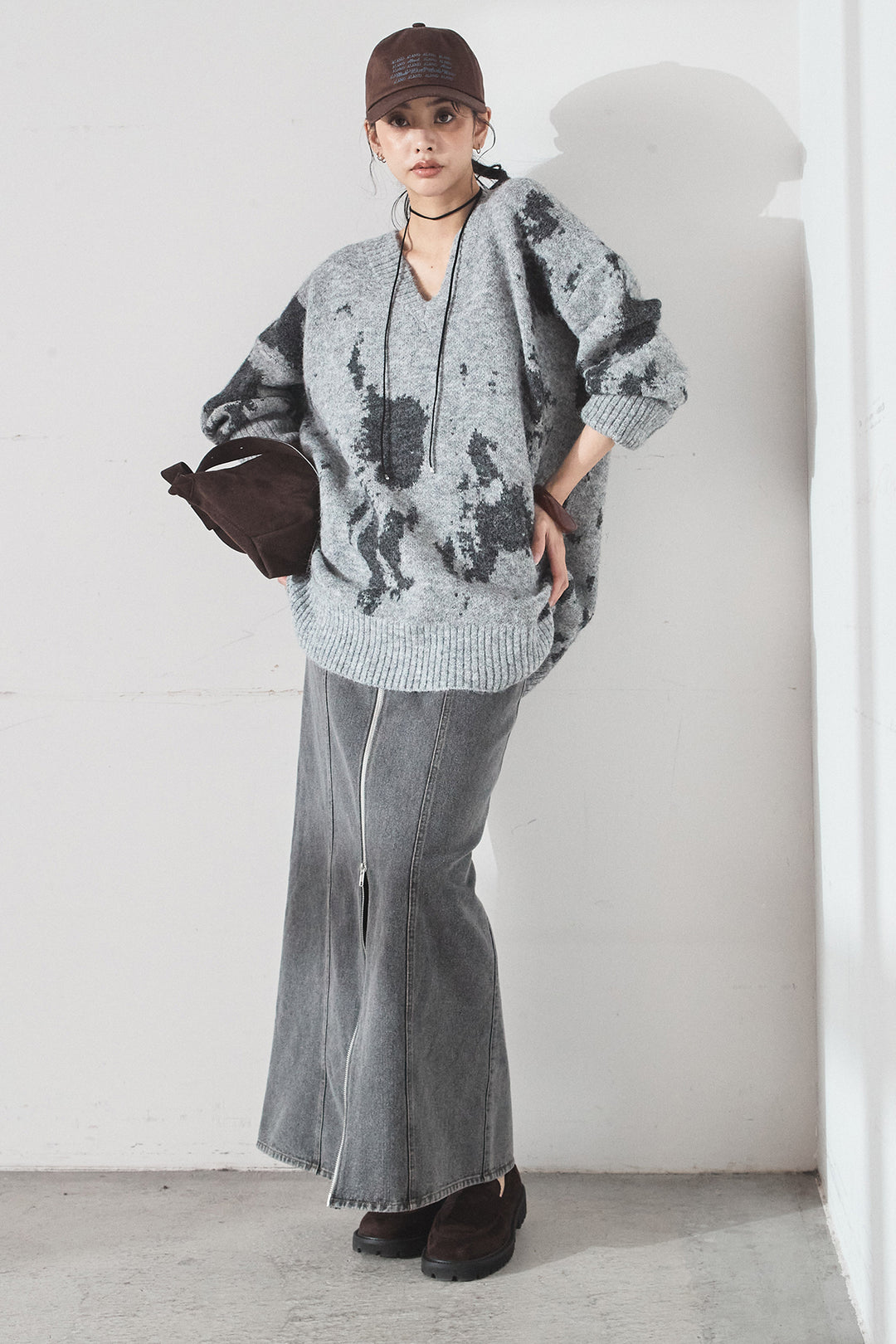 [SET]アブストラクト柄ニットプルオーバー+フロントジップデニムスカート(2set)