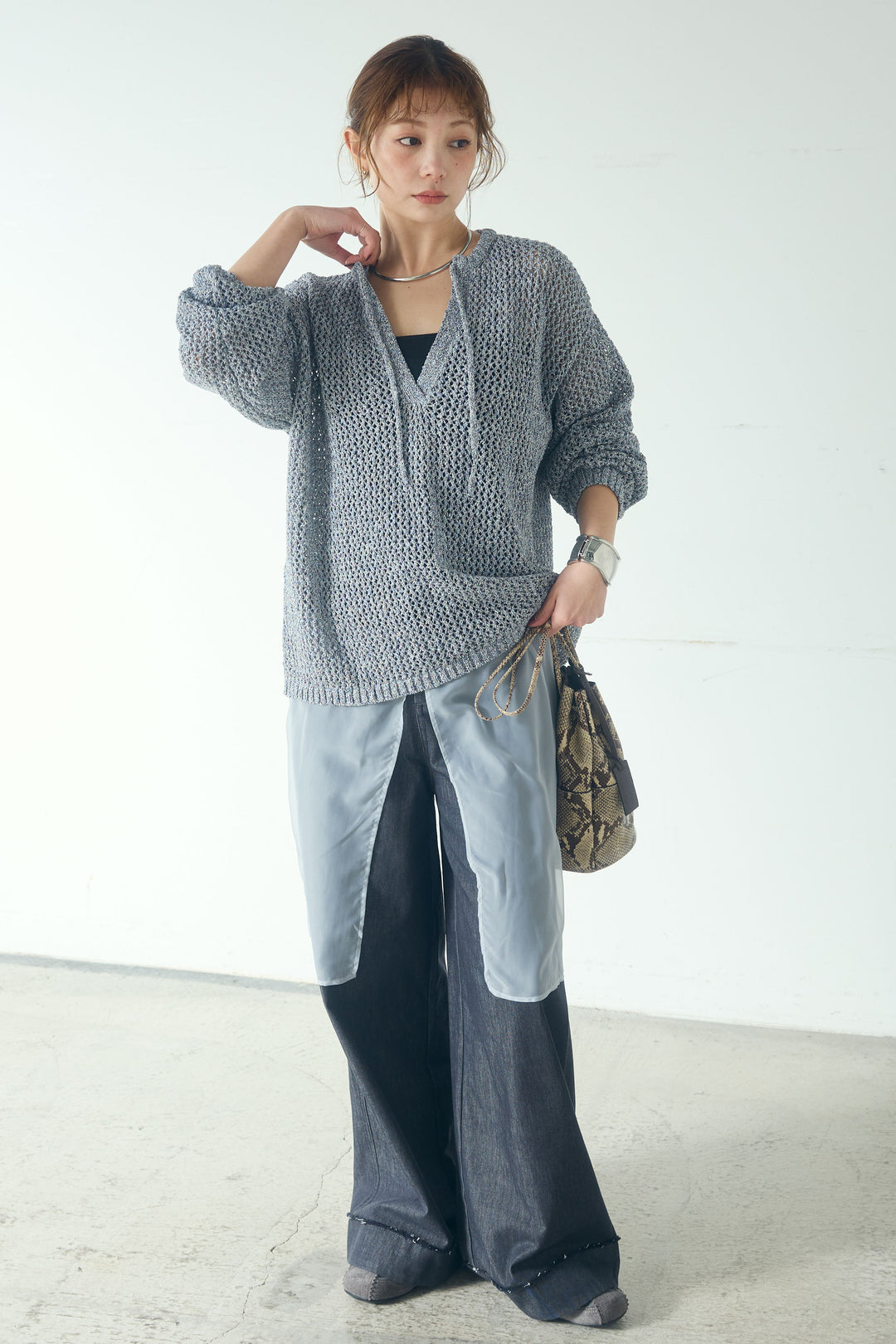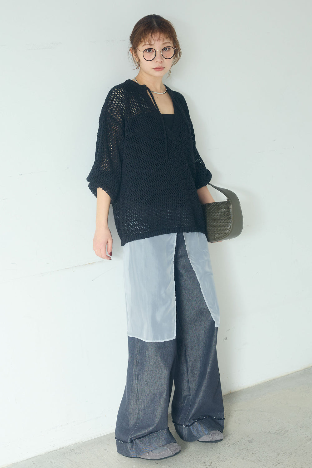 [SET]ミックスメッシュキーネックプルオーバー+シアーチュールレイヤードワイドパンツ(2set)