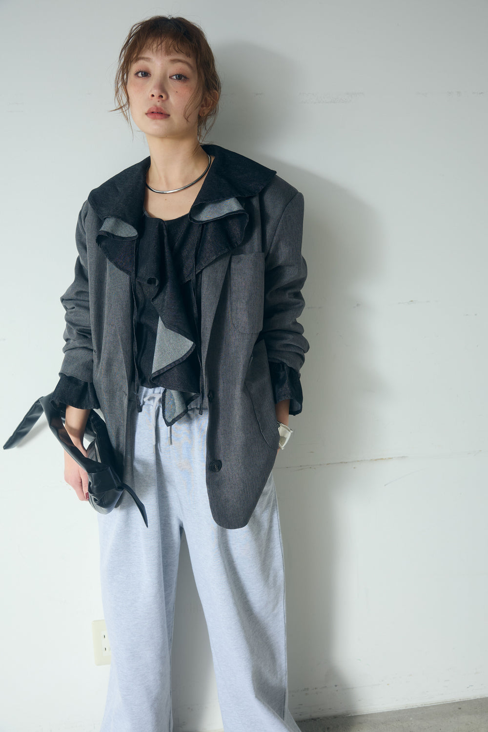 [SET]リネンライクテーラードジャケット+デニムフリルブラウス(2set)